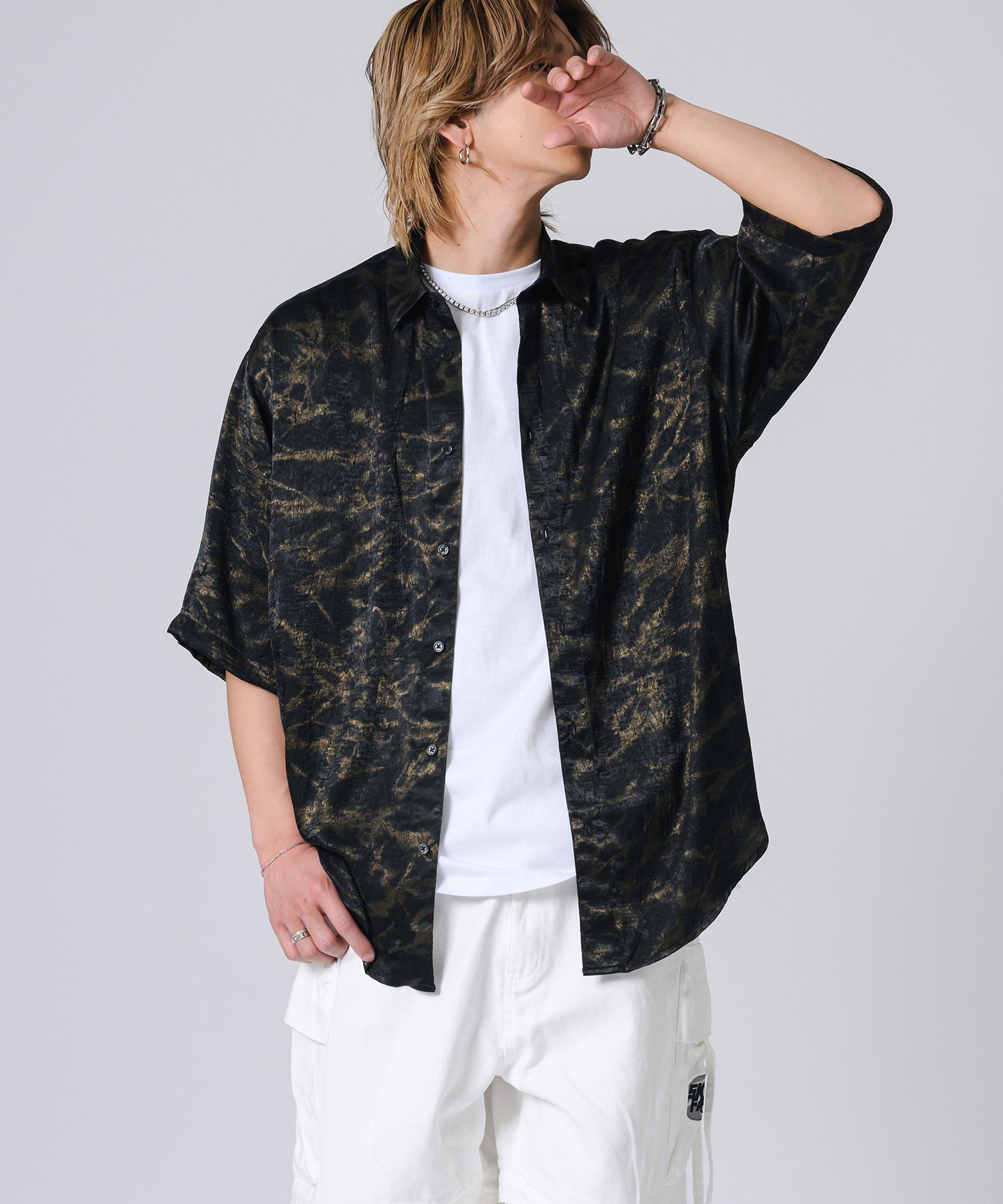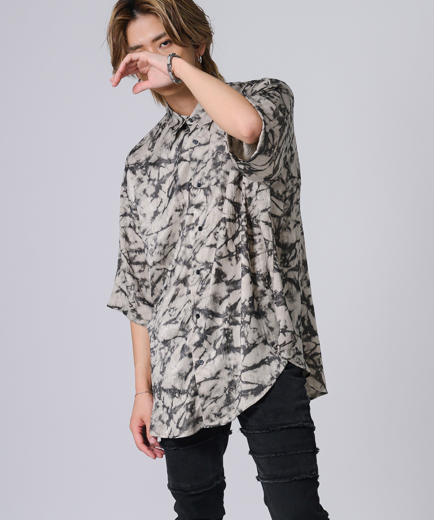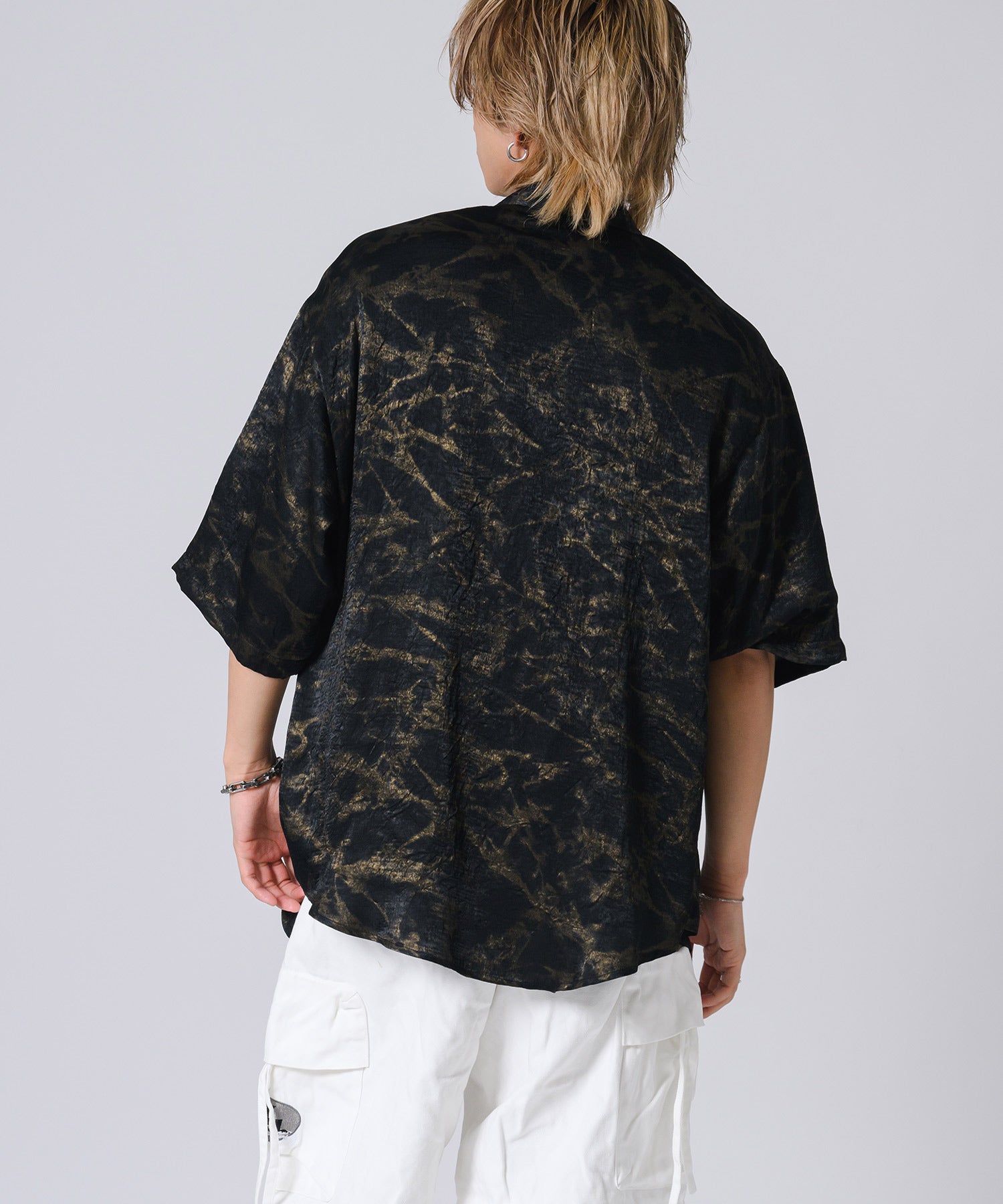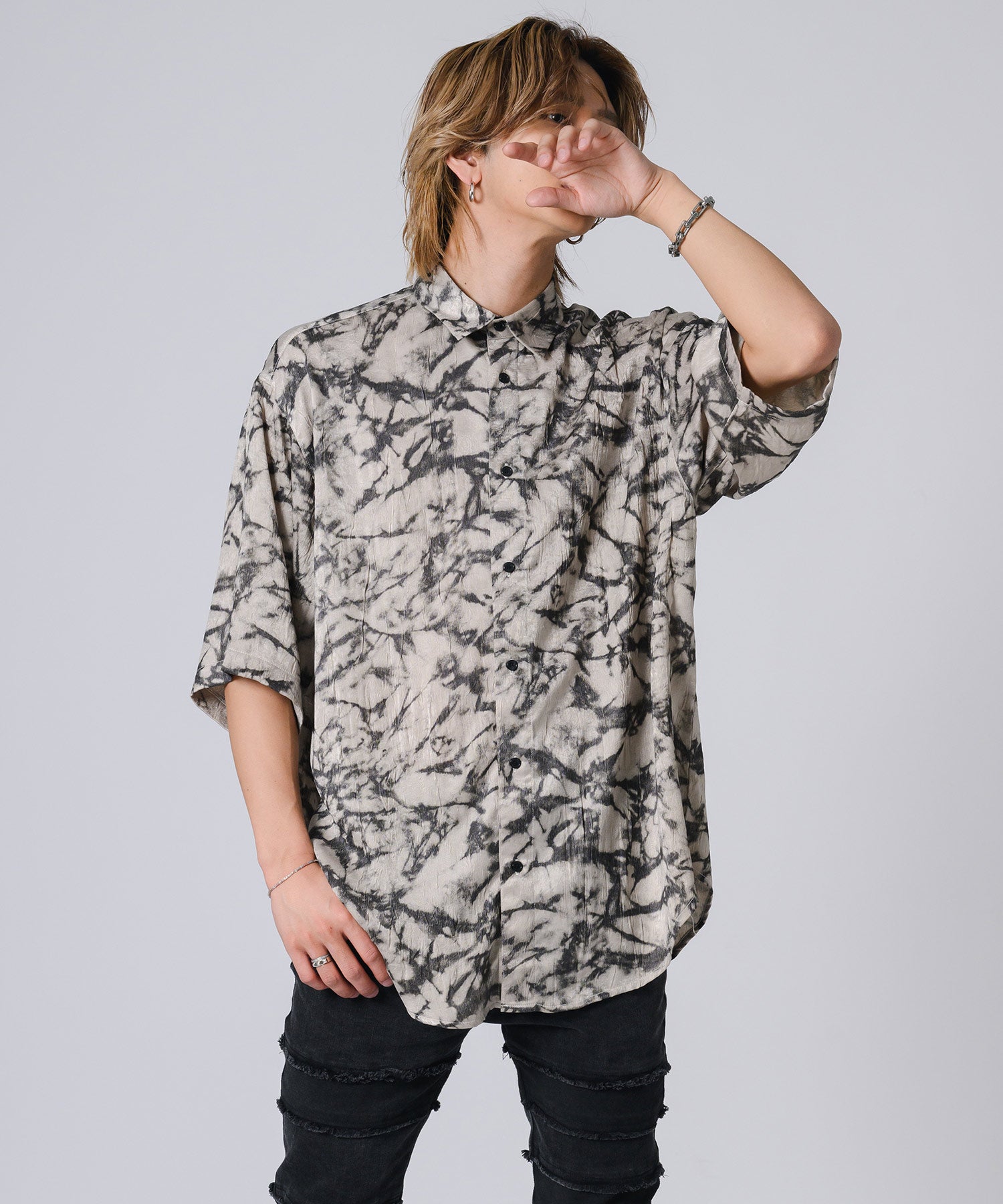ムラ状にプリントした総柄の半袖シャツです。