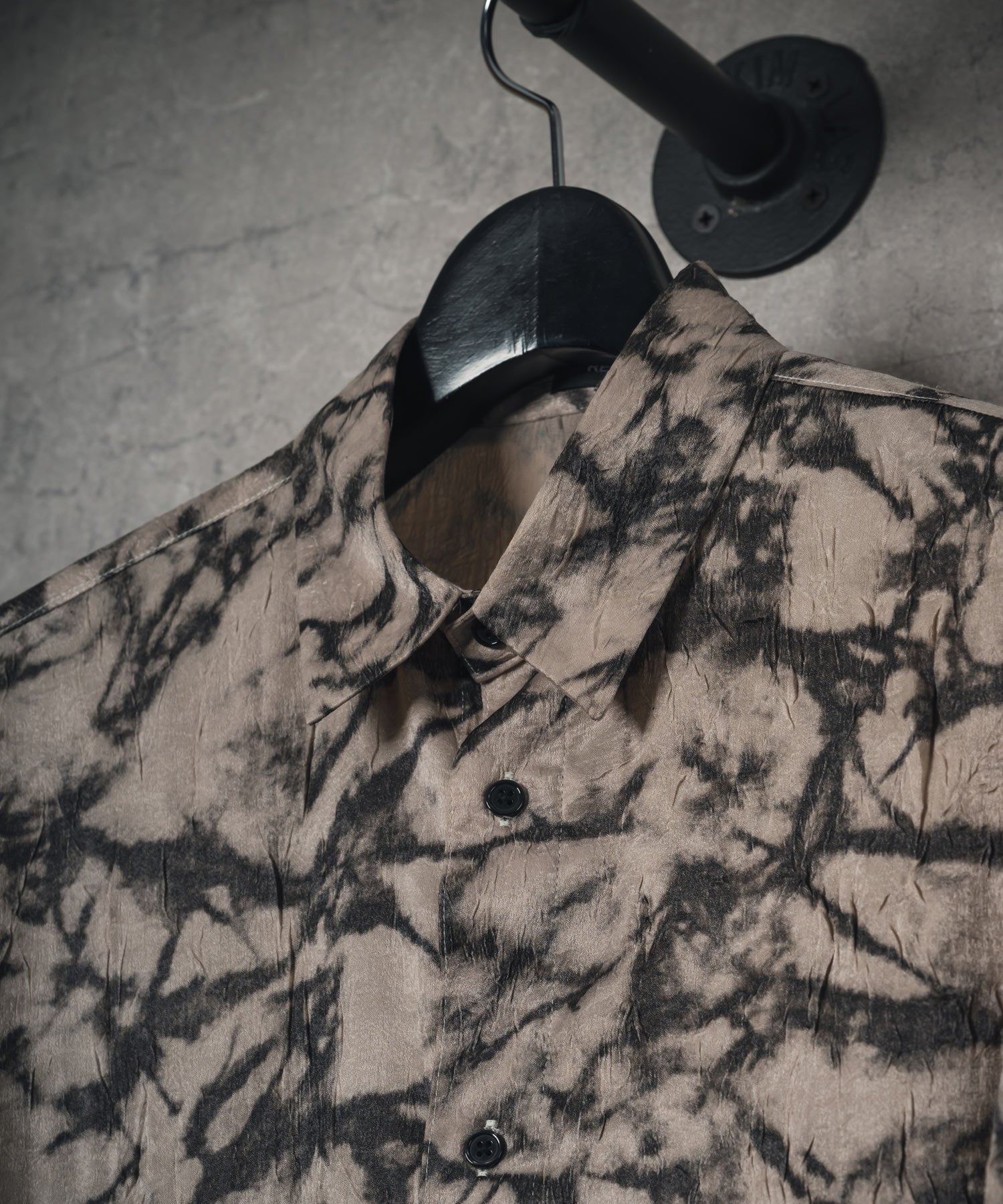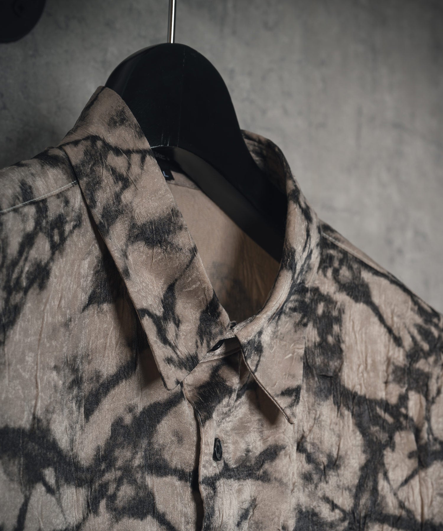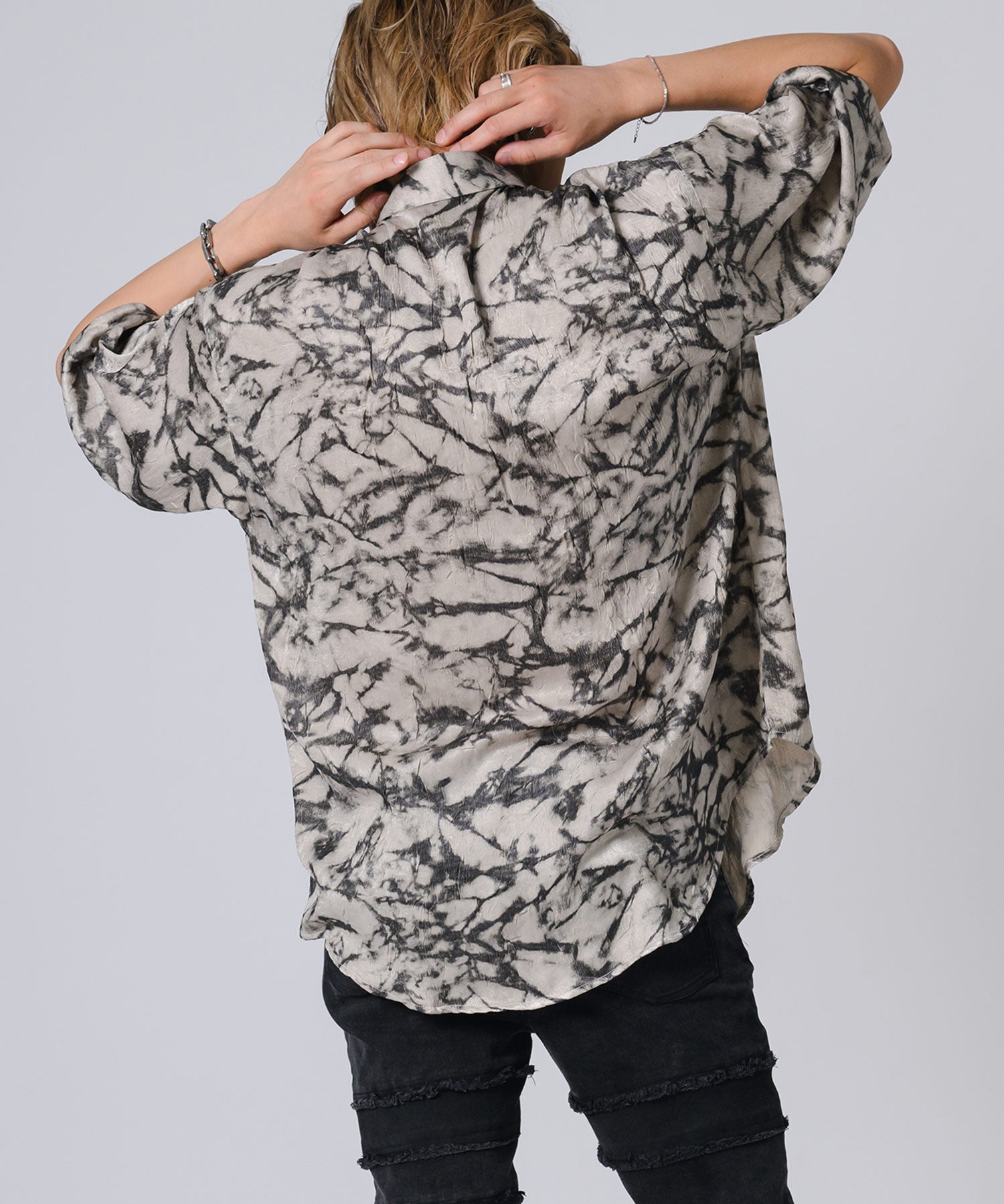 ムラ状にプリントした総柄の半袖シャツです。