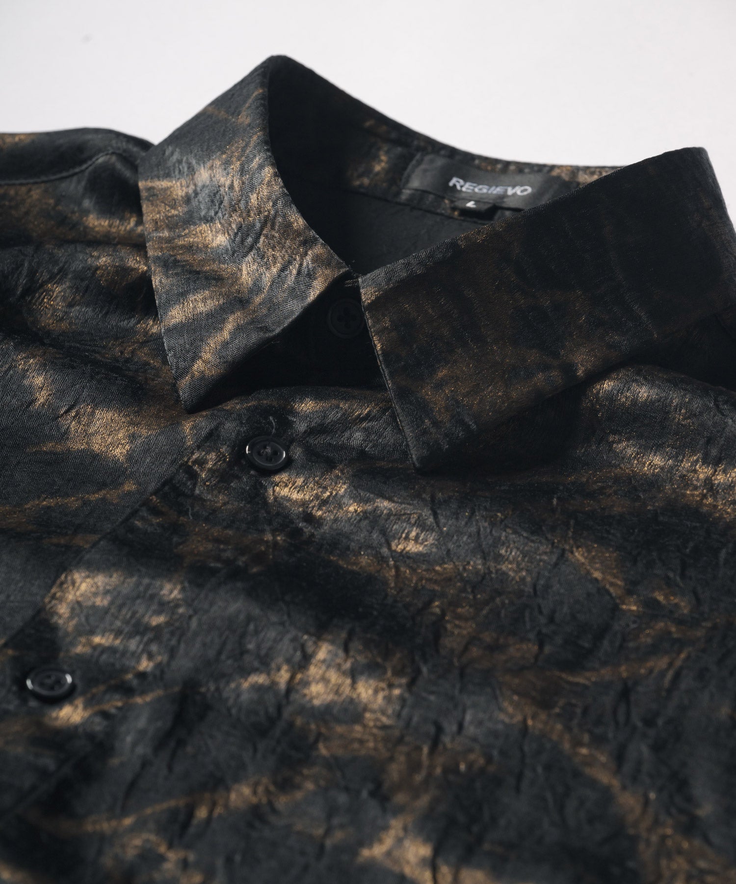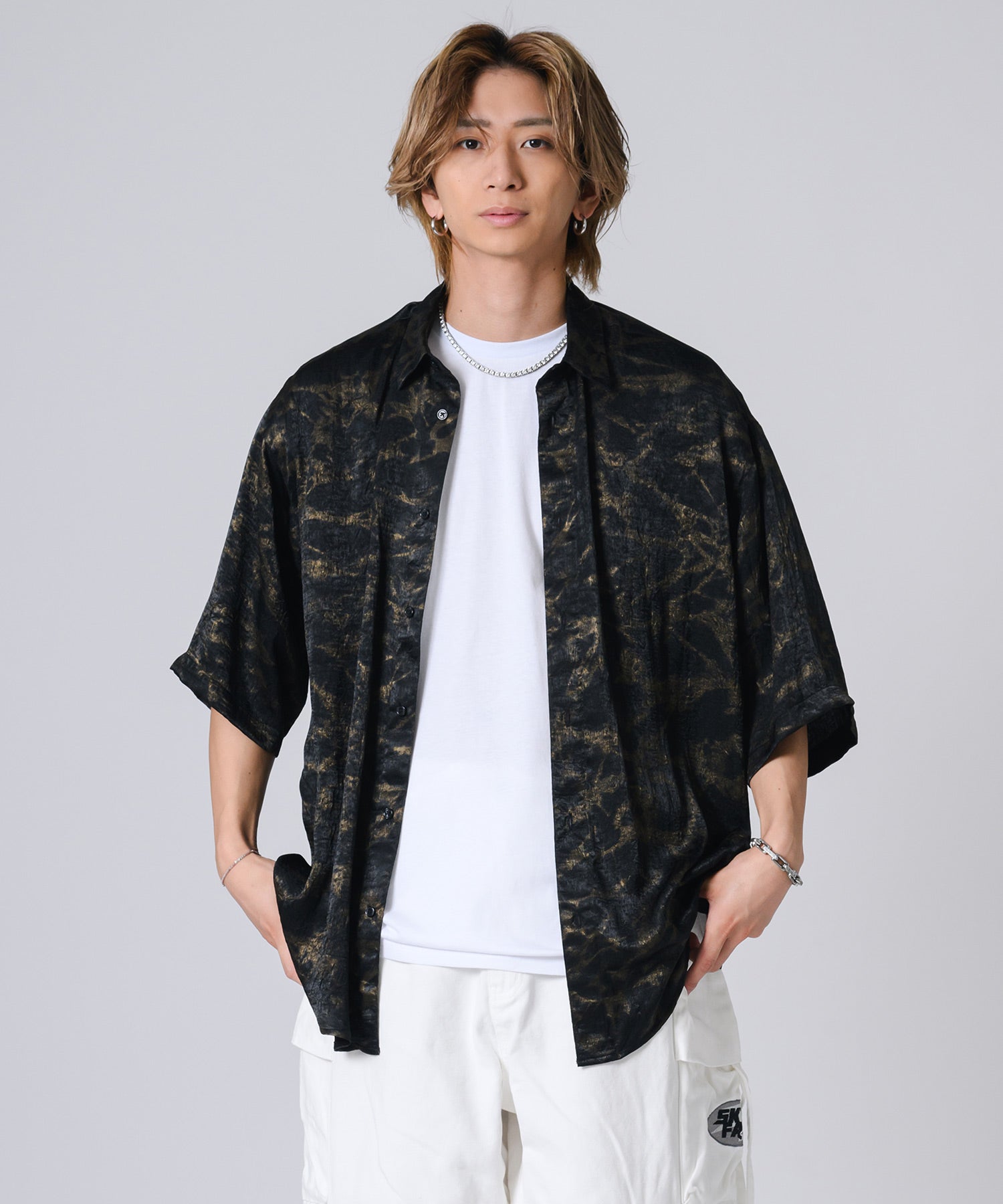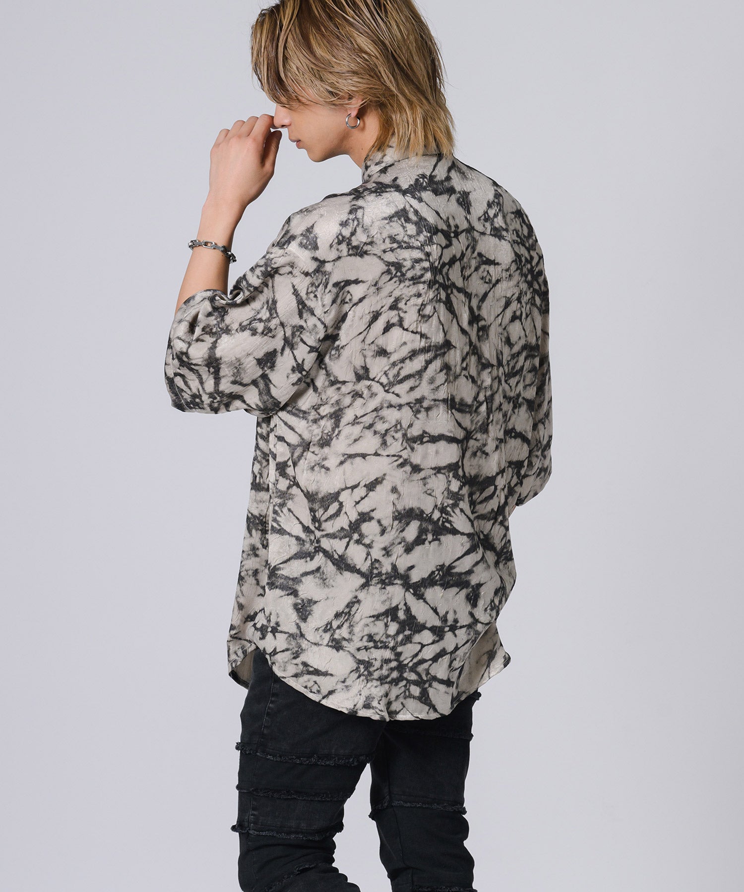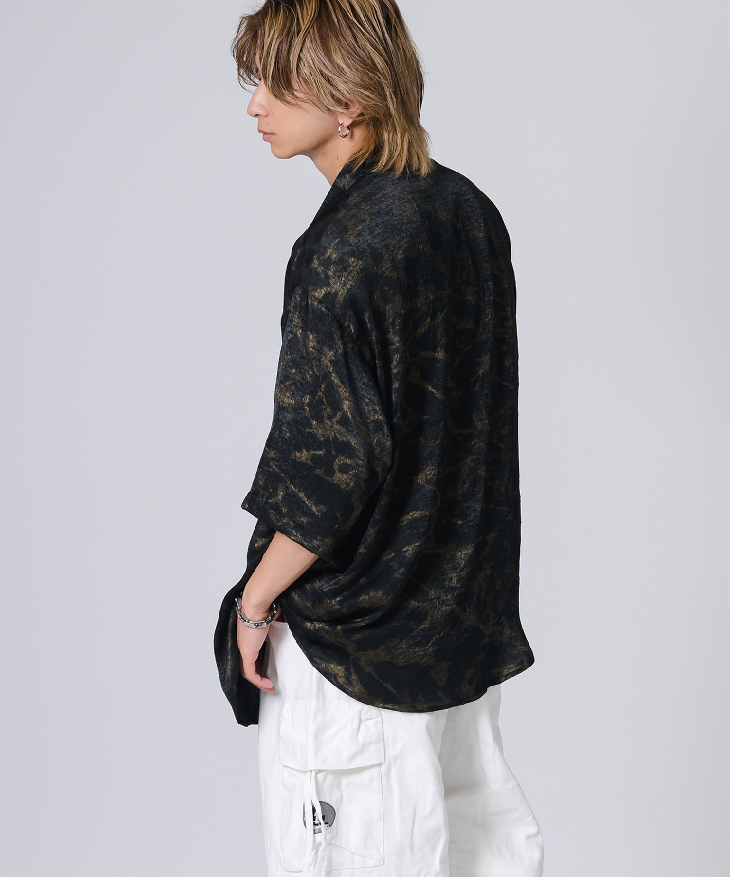 ムラ状にプリントした総柄の半袖シャツです。