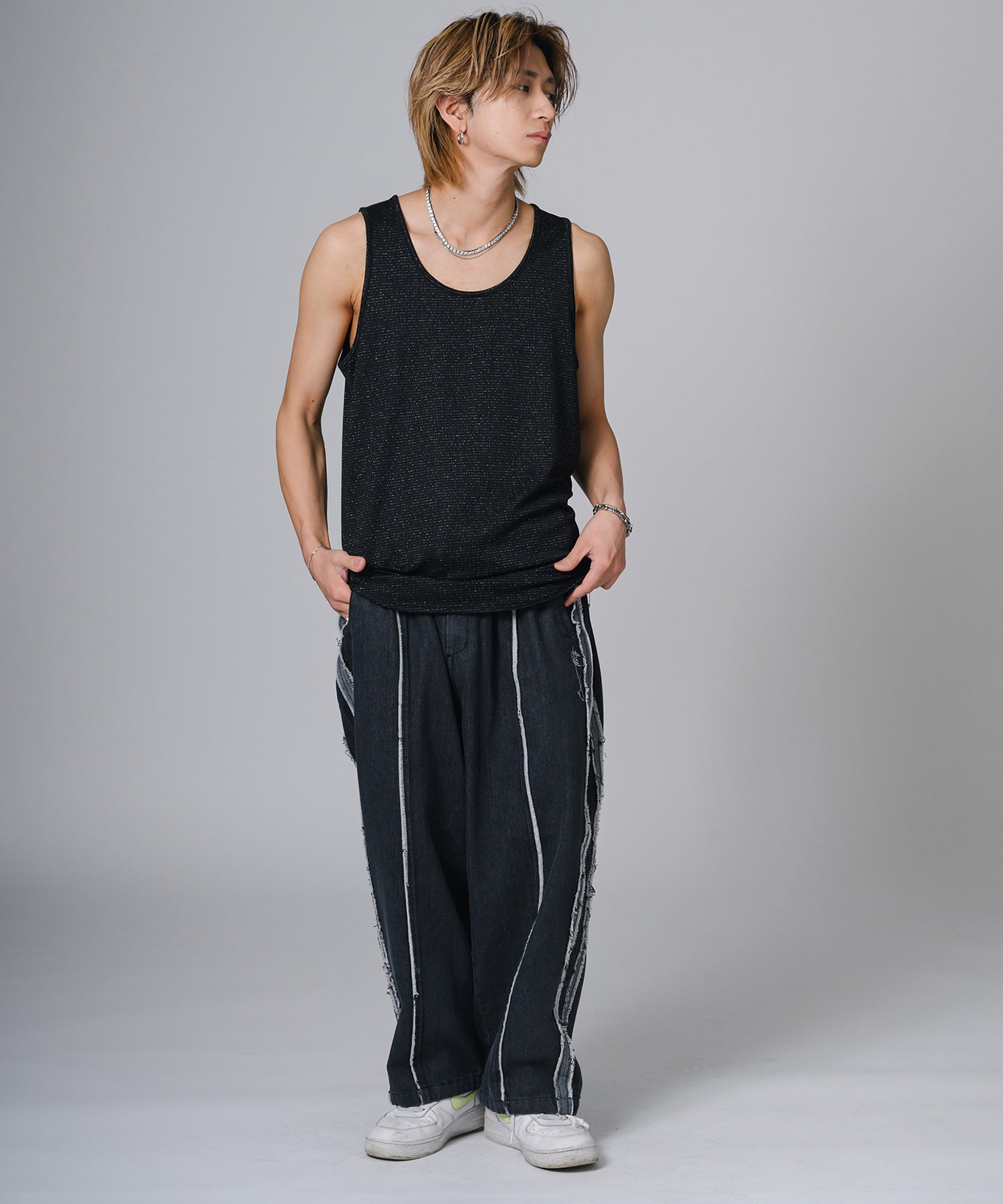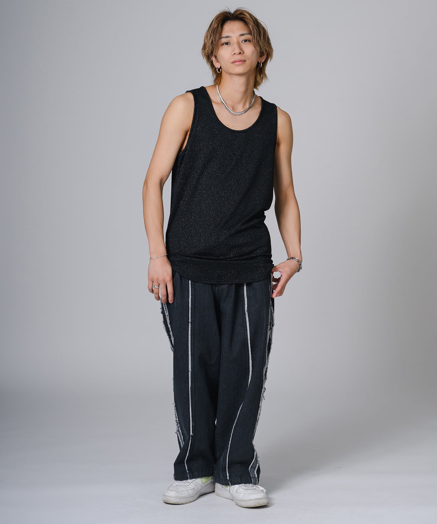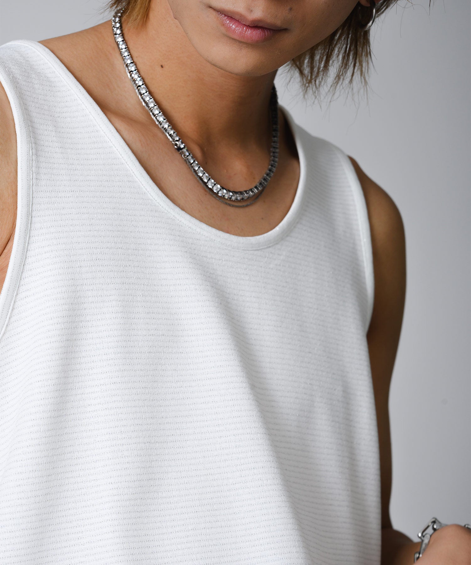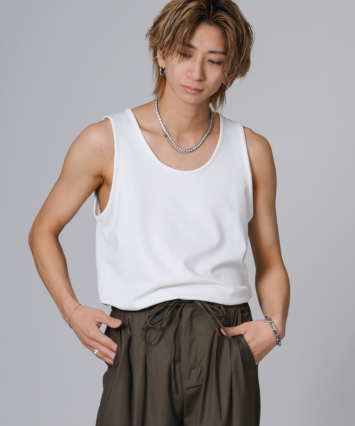 ロング丈のタンクトップは、オーバーサイズのTシャツのインナーとして合わせると裾がはみ出て丁度いいレイヤードができます。