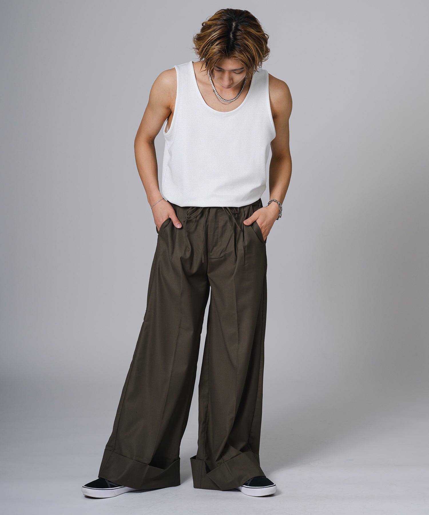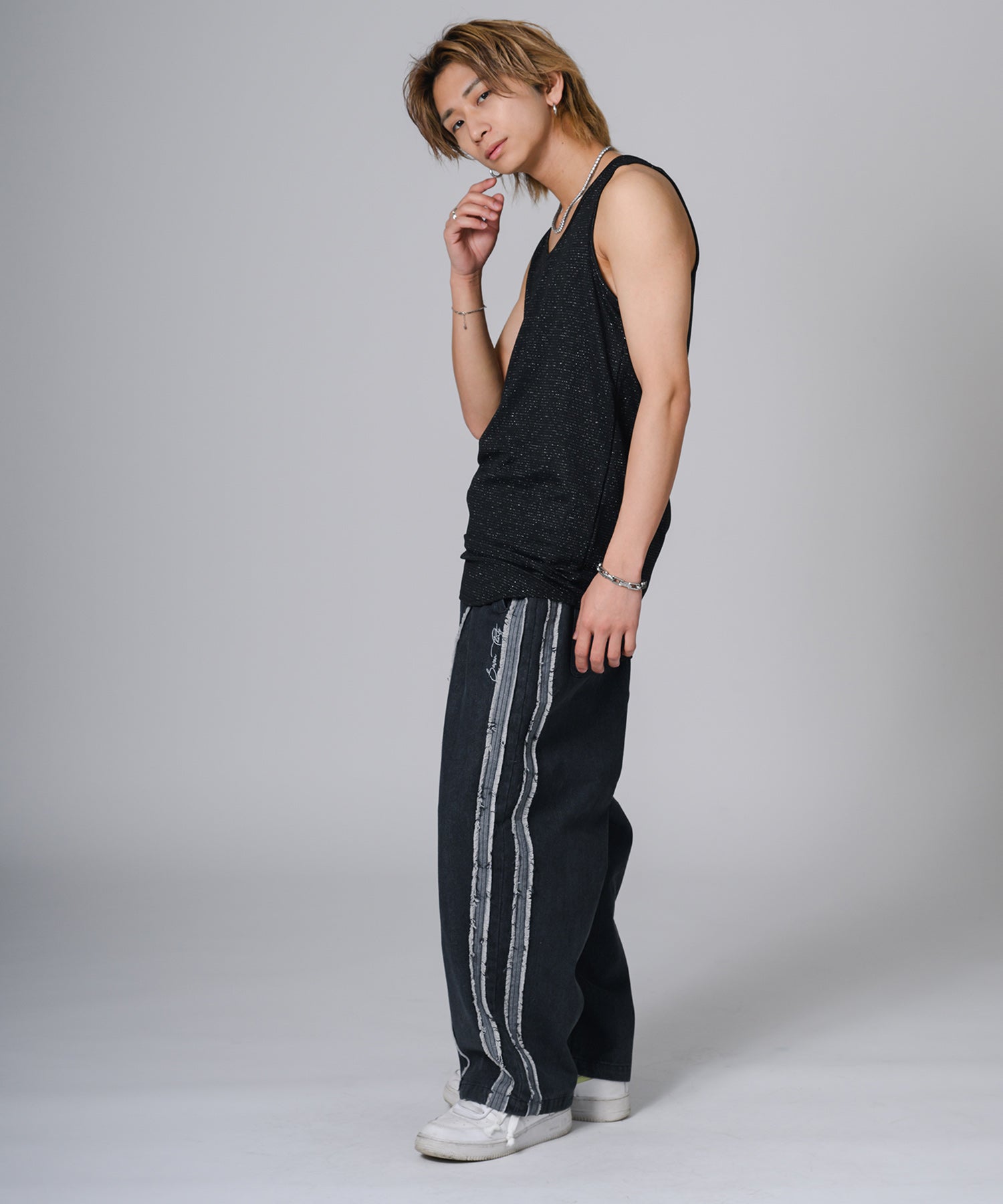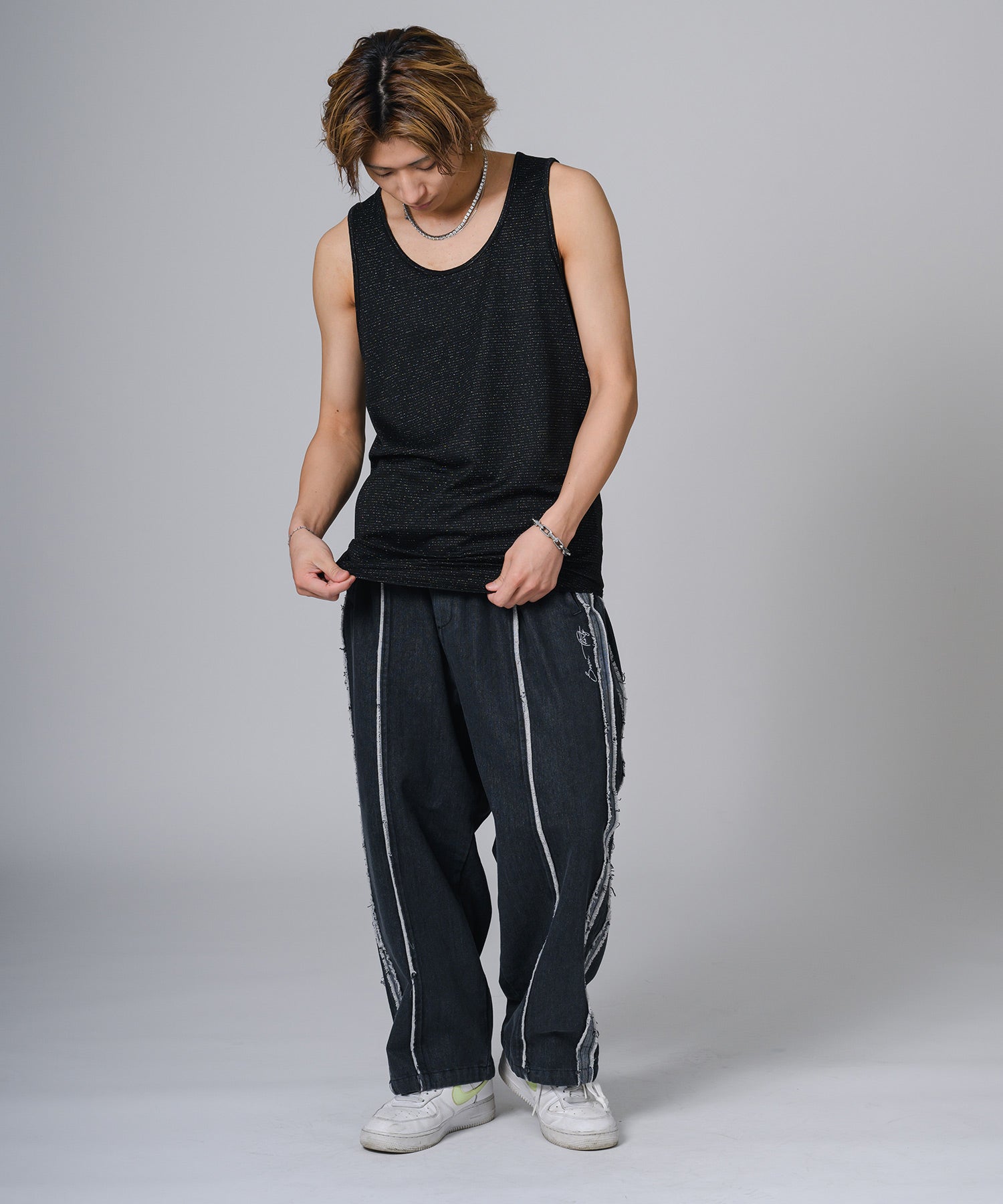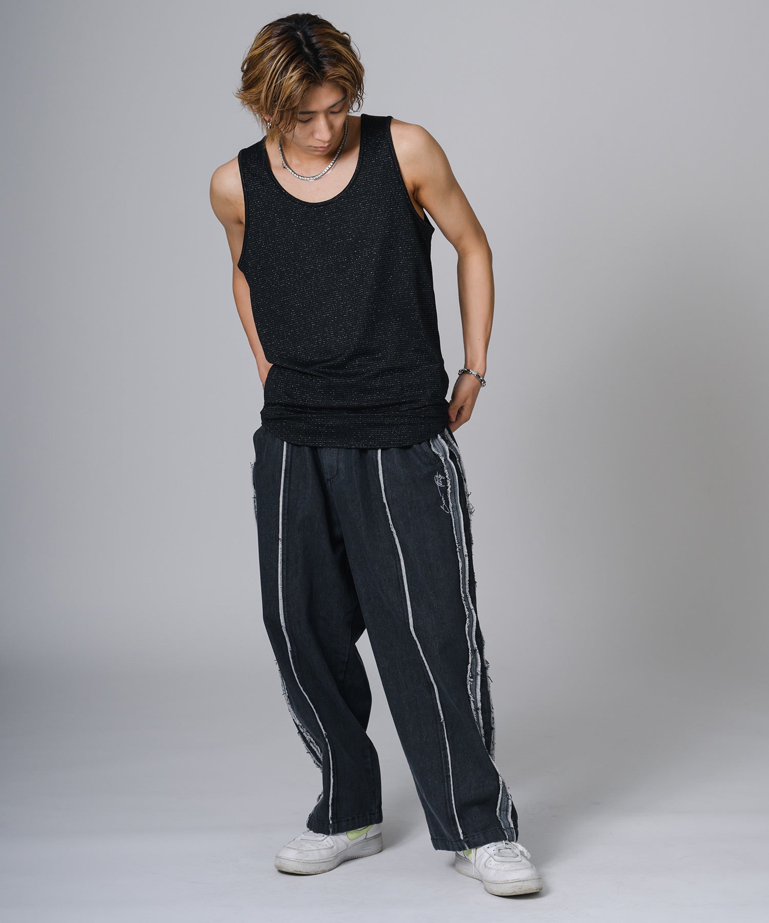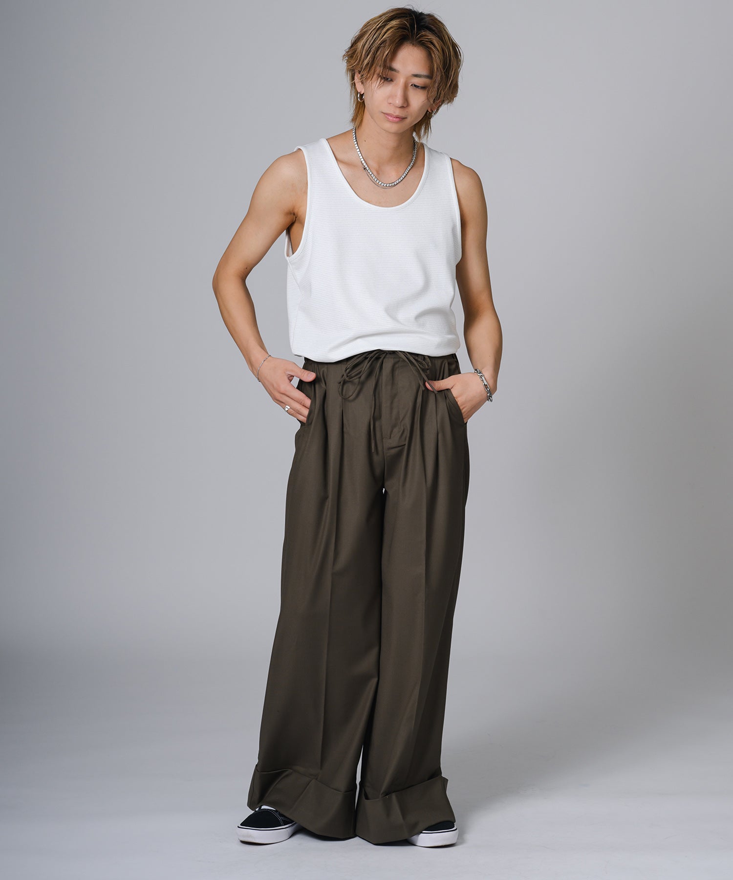 ロング丈のタンクトップは、オーバーサイズのTシャツのインナーとして合わせると裾がはみ出て丁度いいレイヤードができます。
