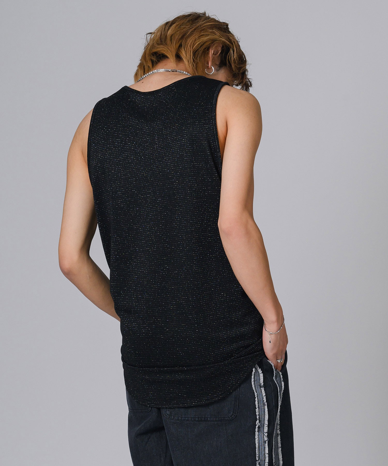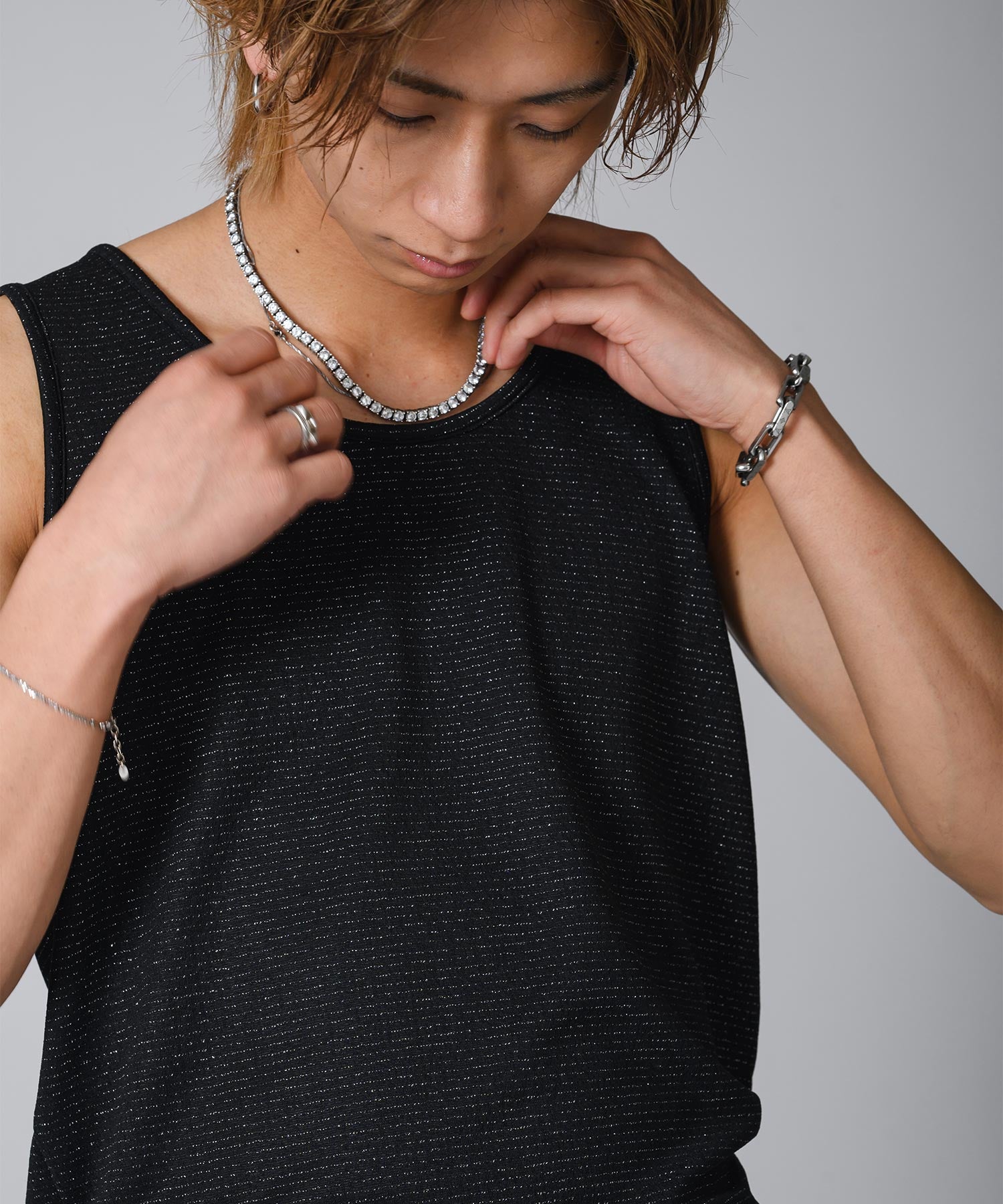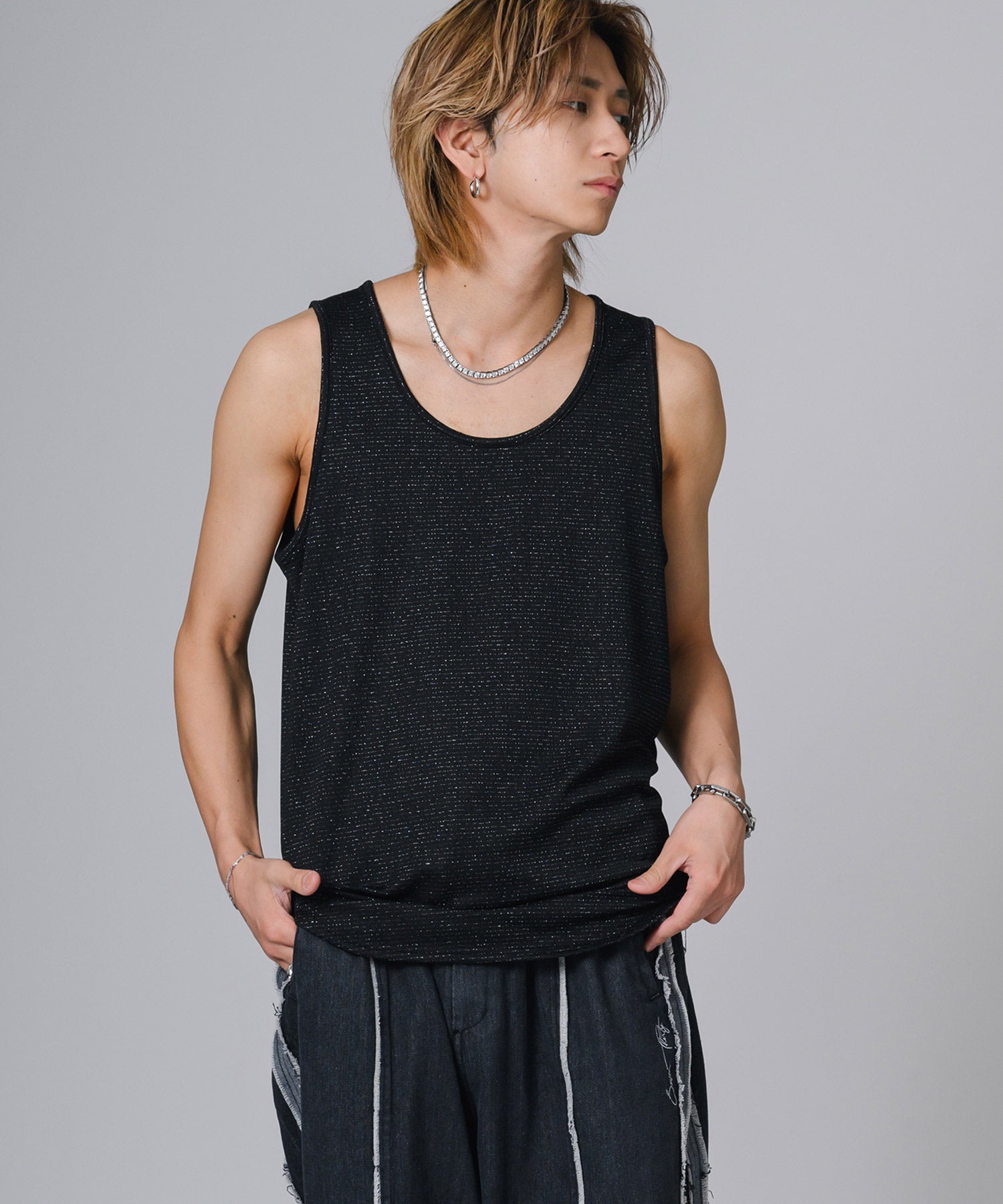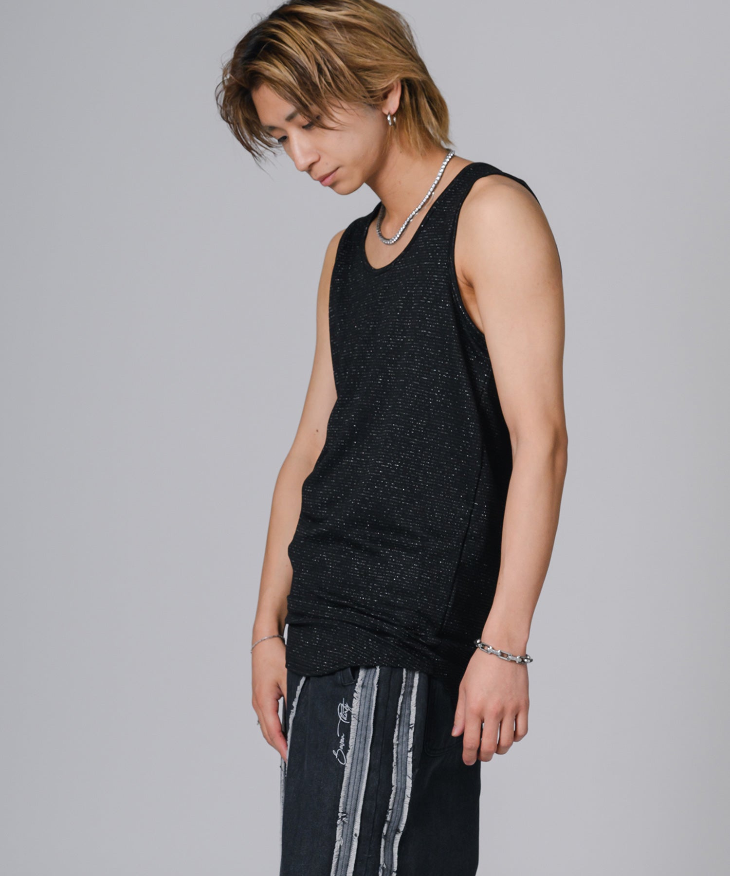 細いラメの糸をボーダー状に編み込んだタンクトップです。