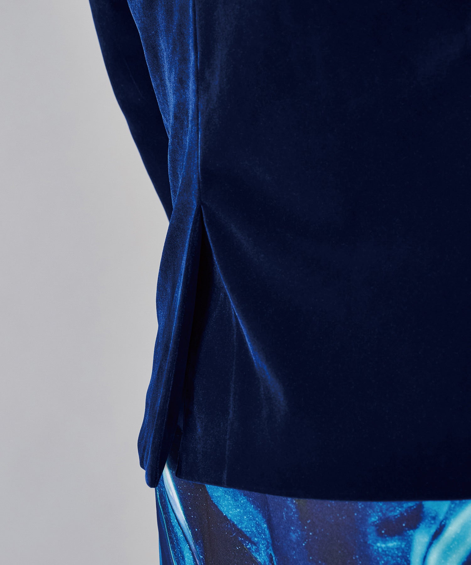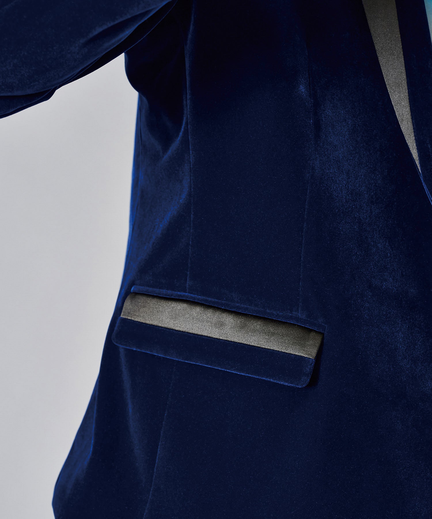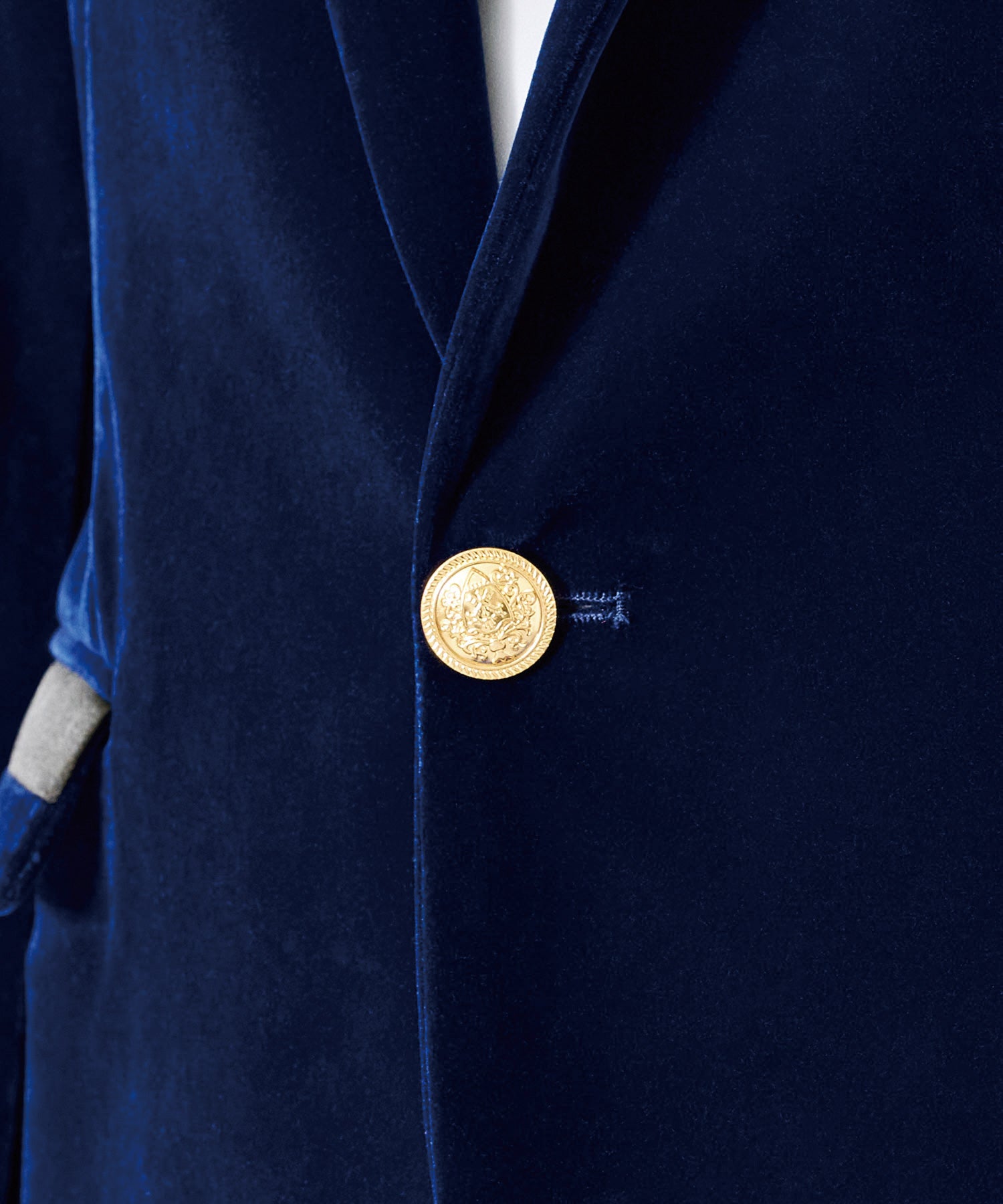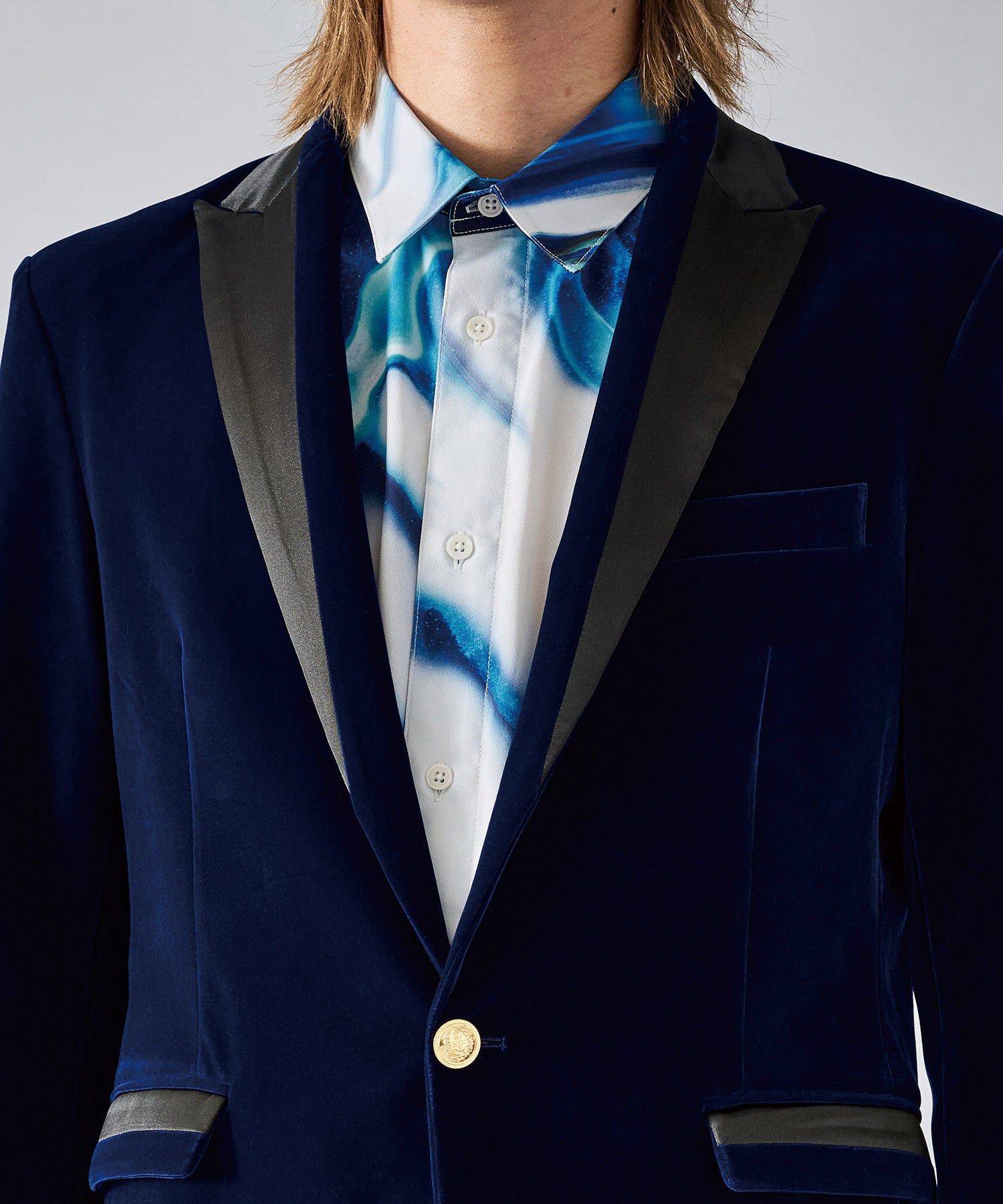 光沢のあるサテン素材のピークドラペルと金の1つ釦はタキシード風な雰囲気を感じさせつつ、短めの着丈が着回しをカジュアルで自由なものにしてくれます