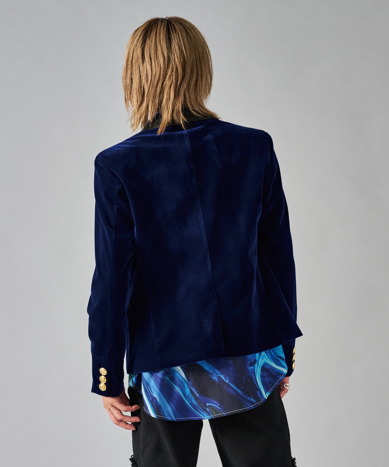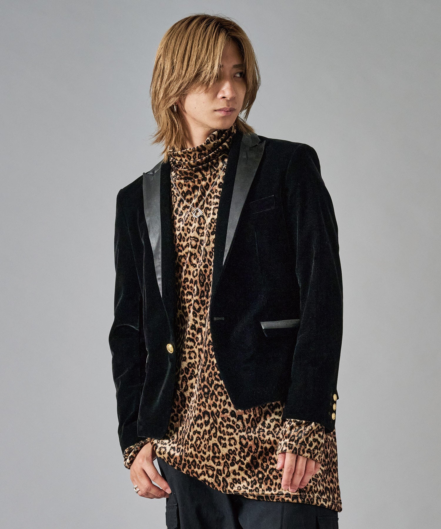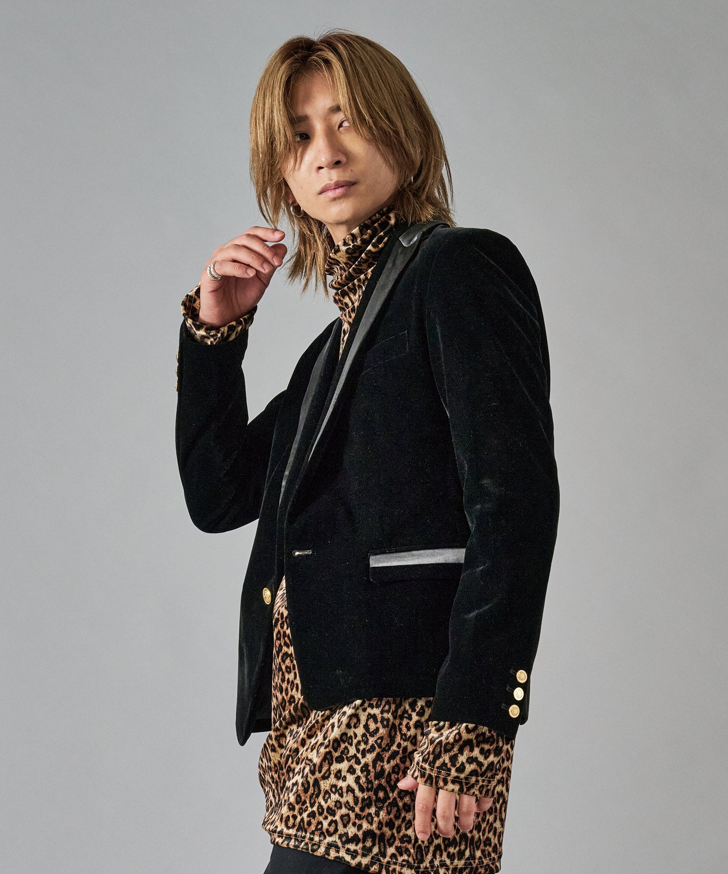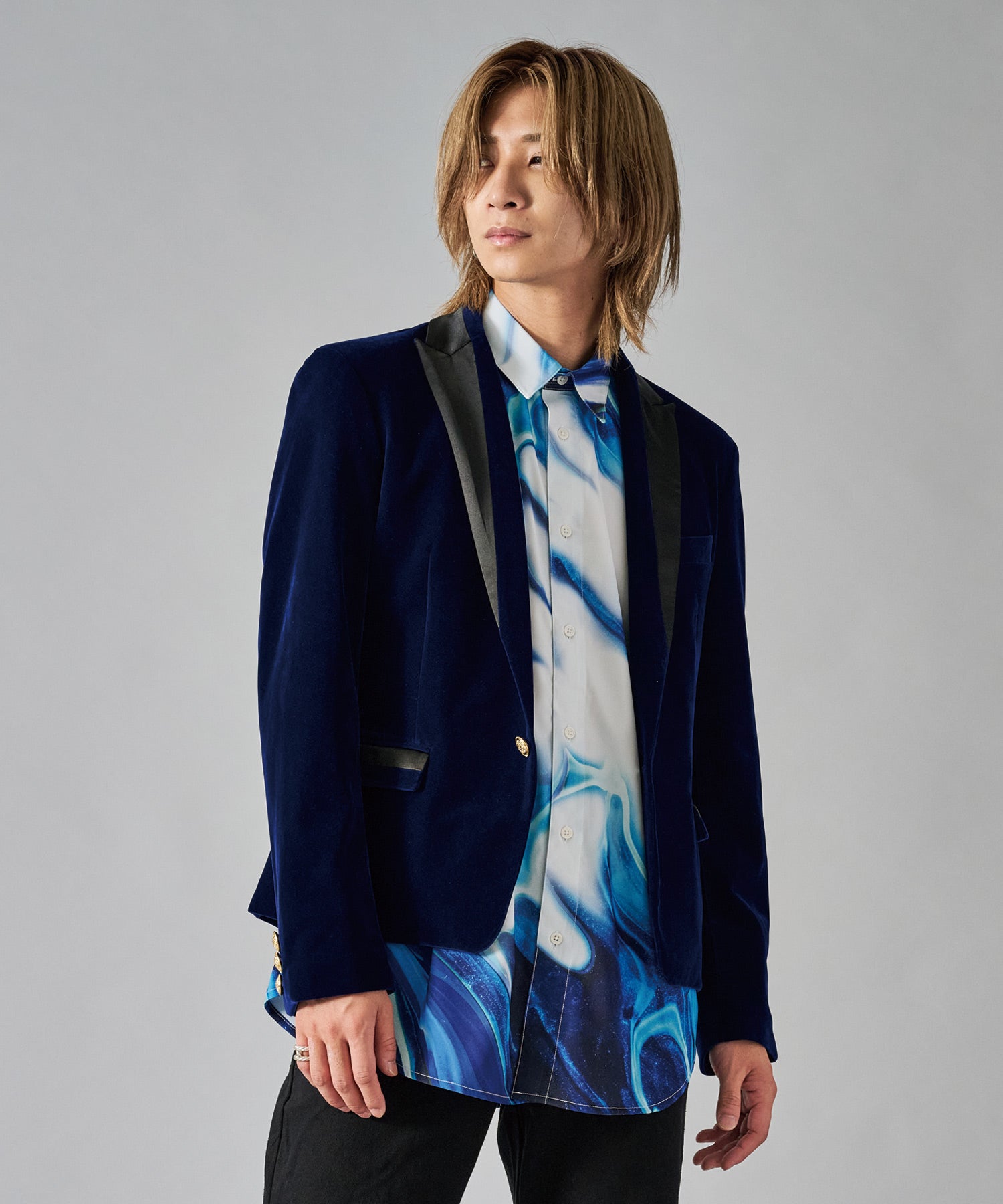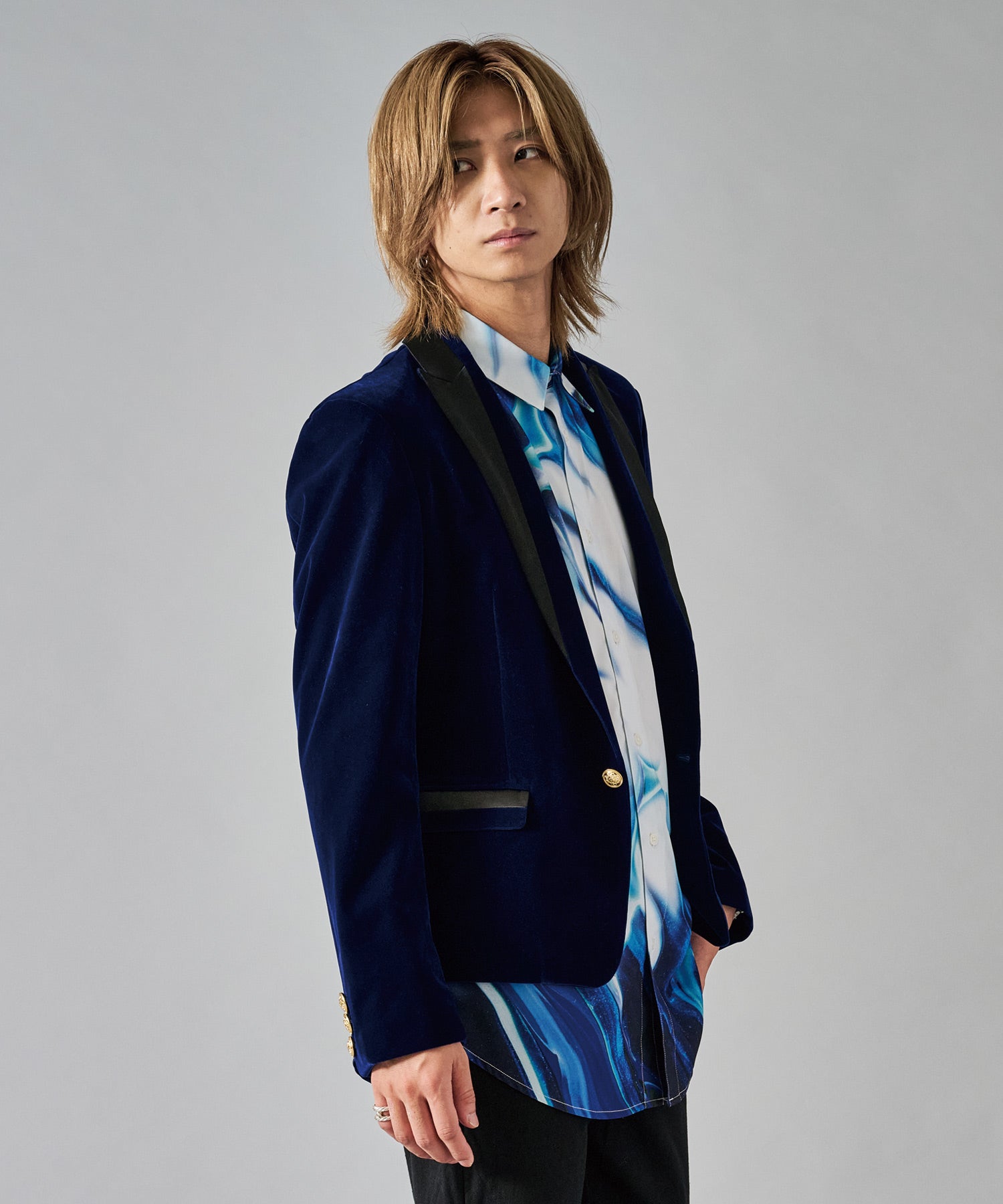 光沢のあるサテン素材のピークドラペルと金の1つ釦はタキシード風な雰囲気を感じさせつつ、短めの着丈が着回しをカジュアルで自由なものにしてくれます