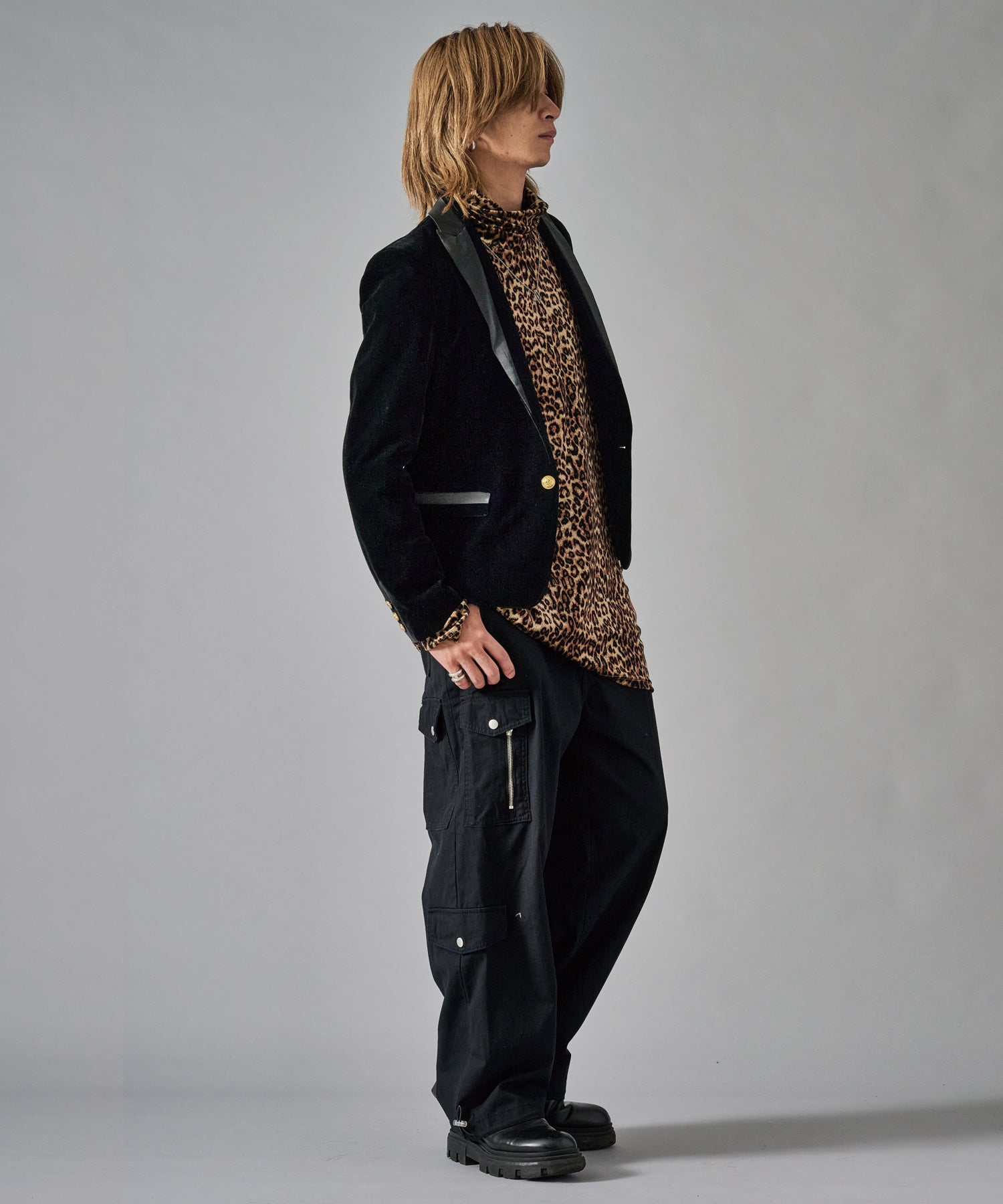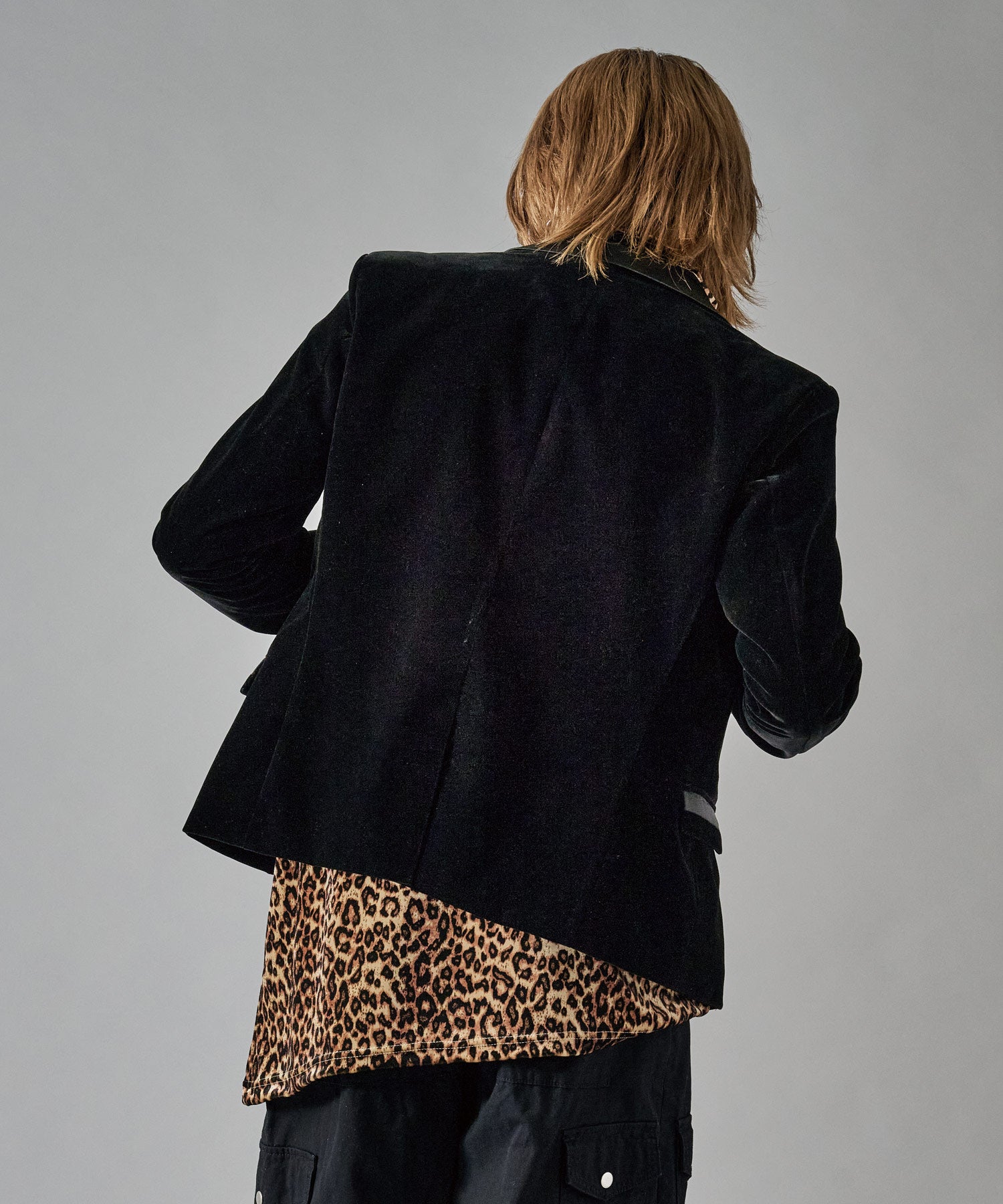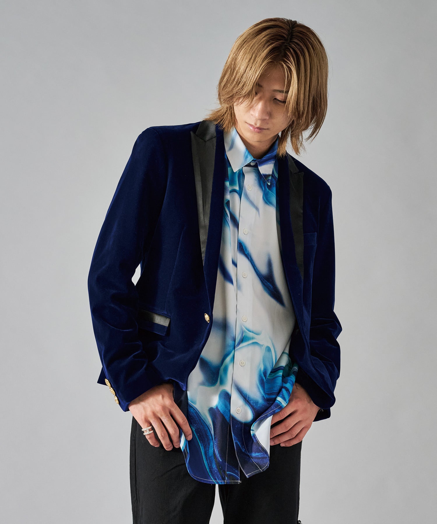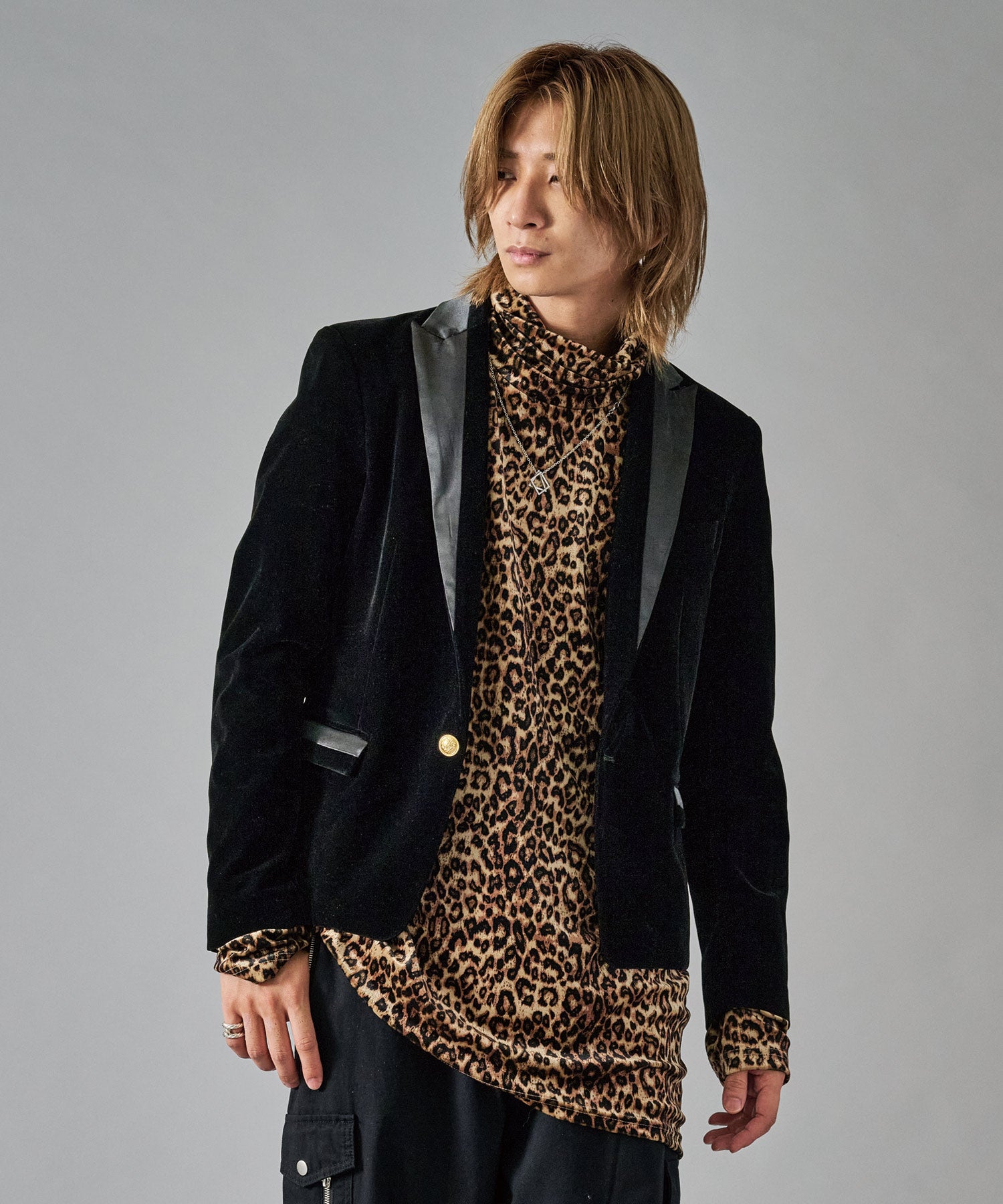 光沢のあるサテン素材のピークドラペルと金の1つ釦はタキシード風な雰囲気を感じさせつつ、短めの着丈が着回しをカジュアルで自由なものにしてくれます