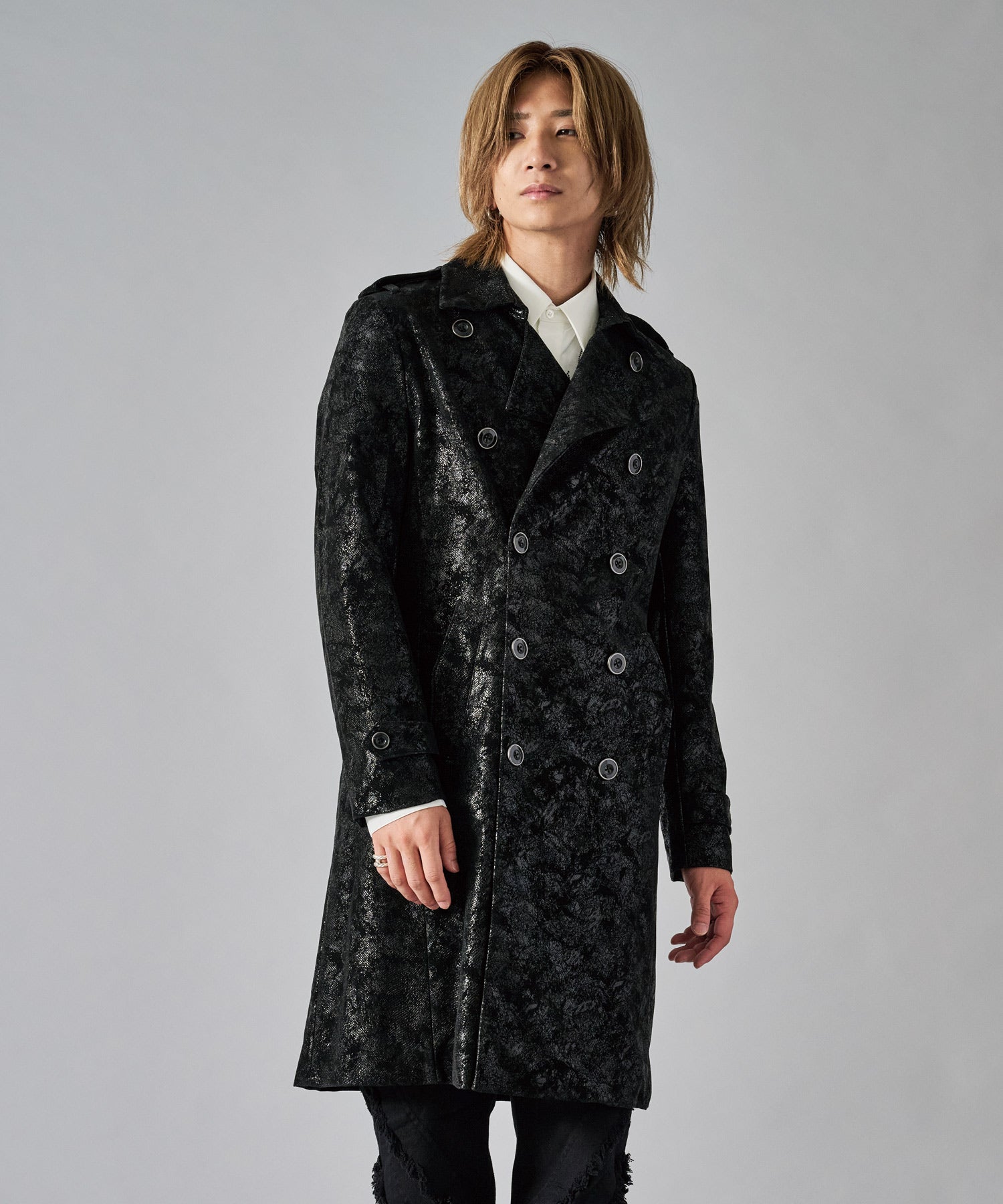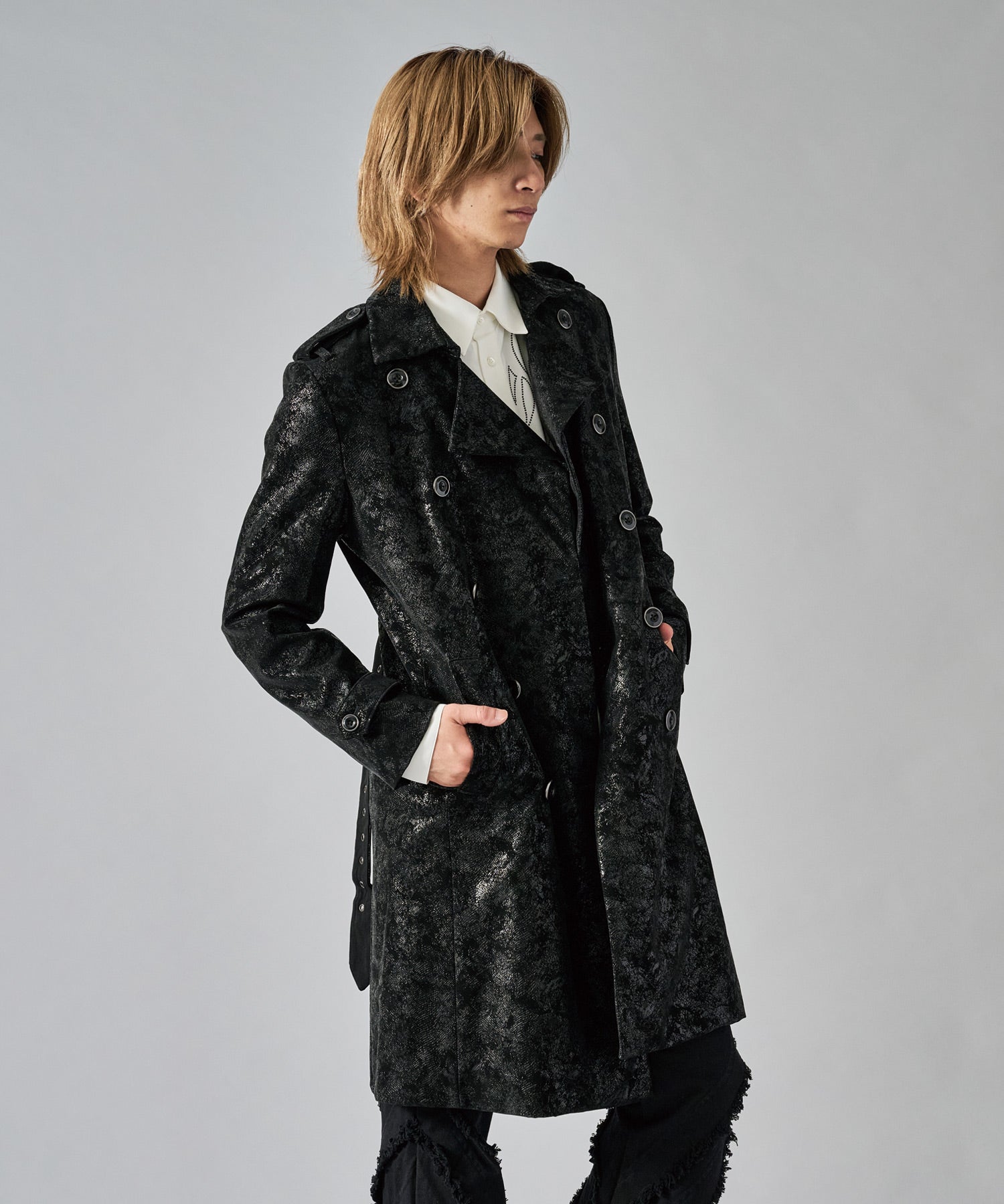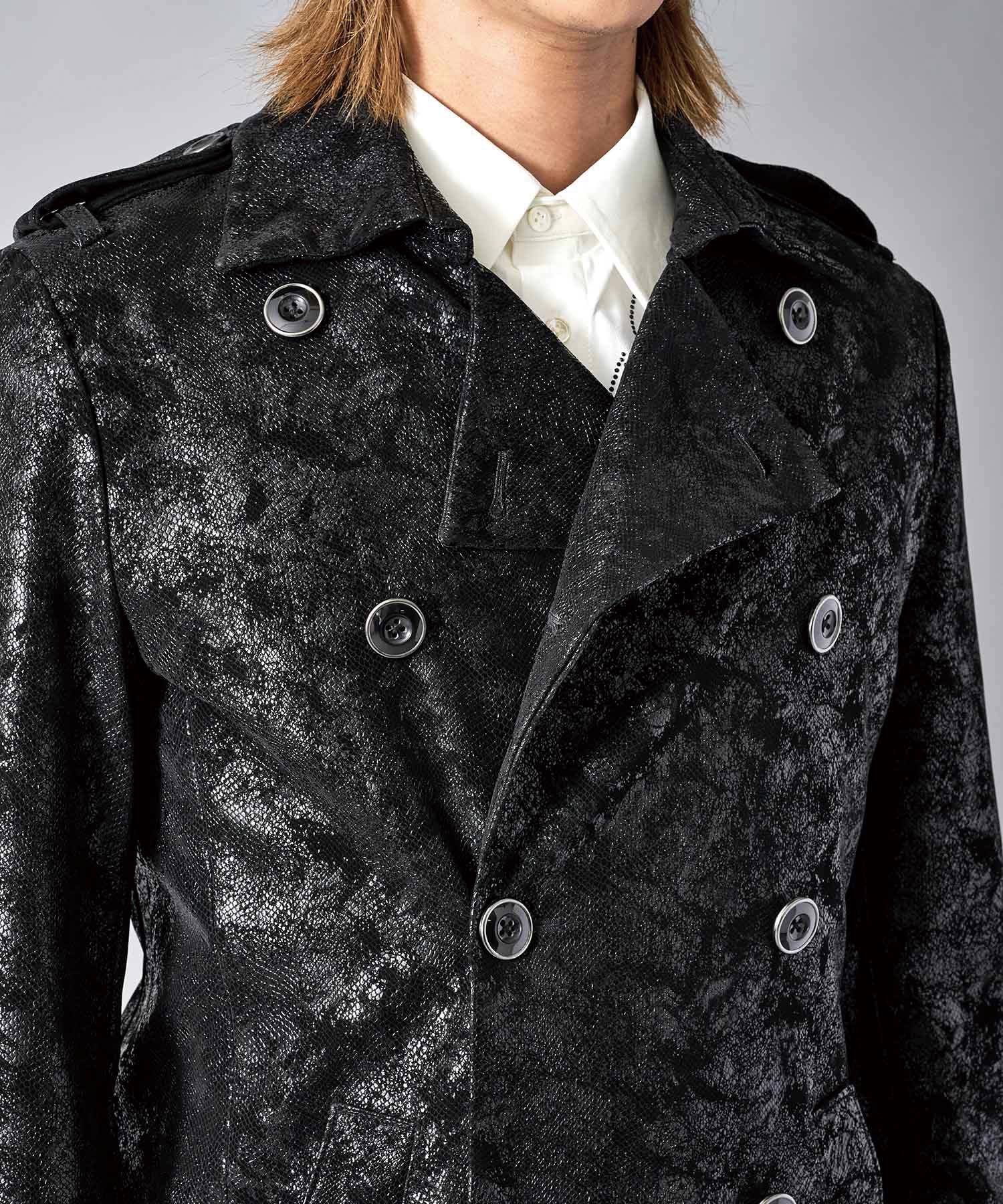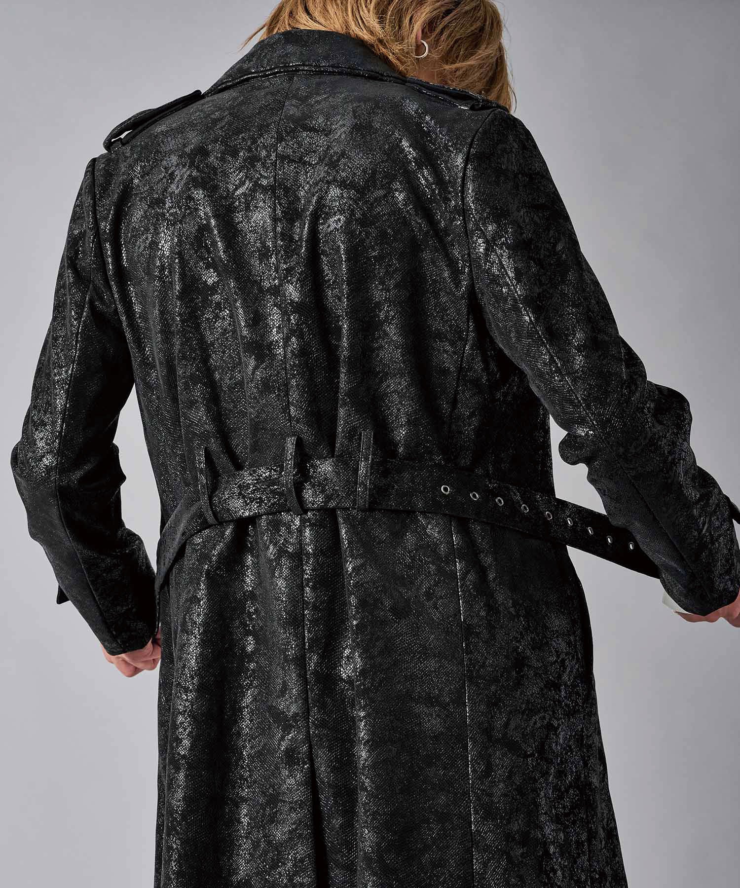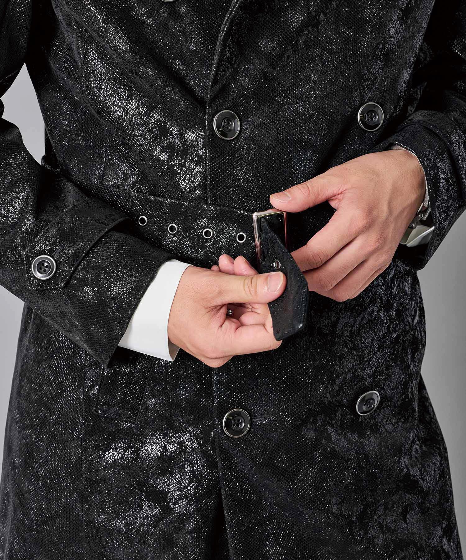 スクエアなショルダーが男らしいダブルのトレンチコートです