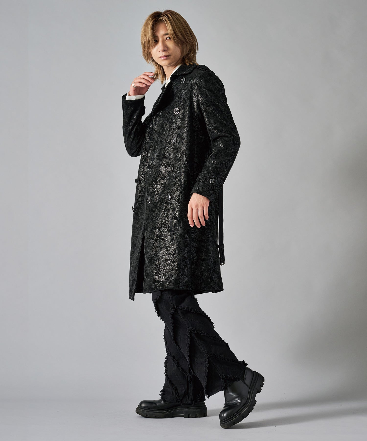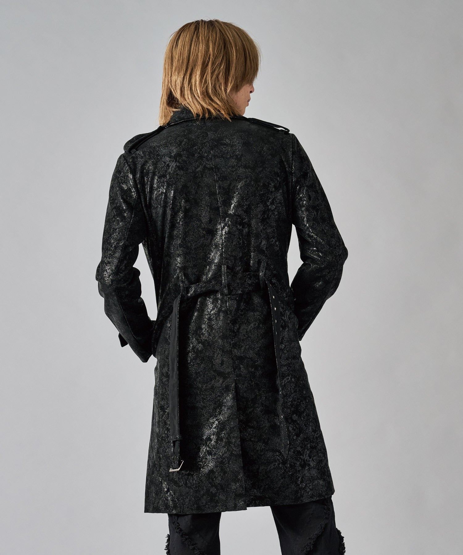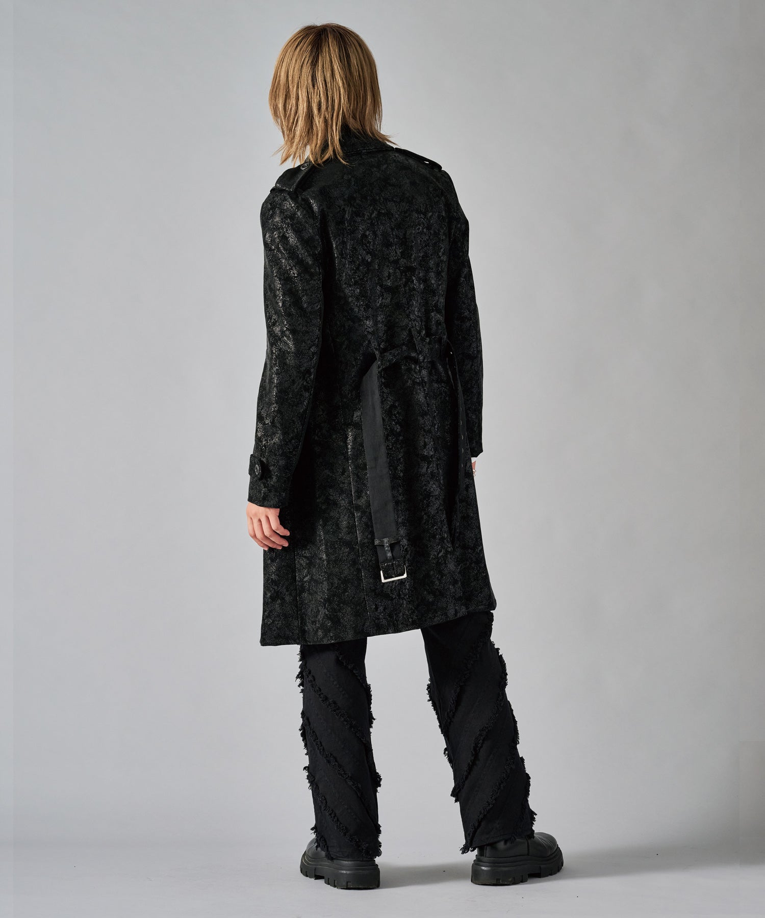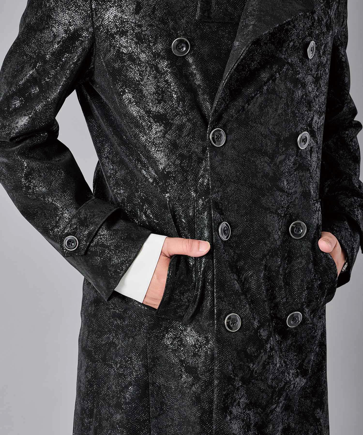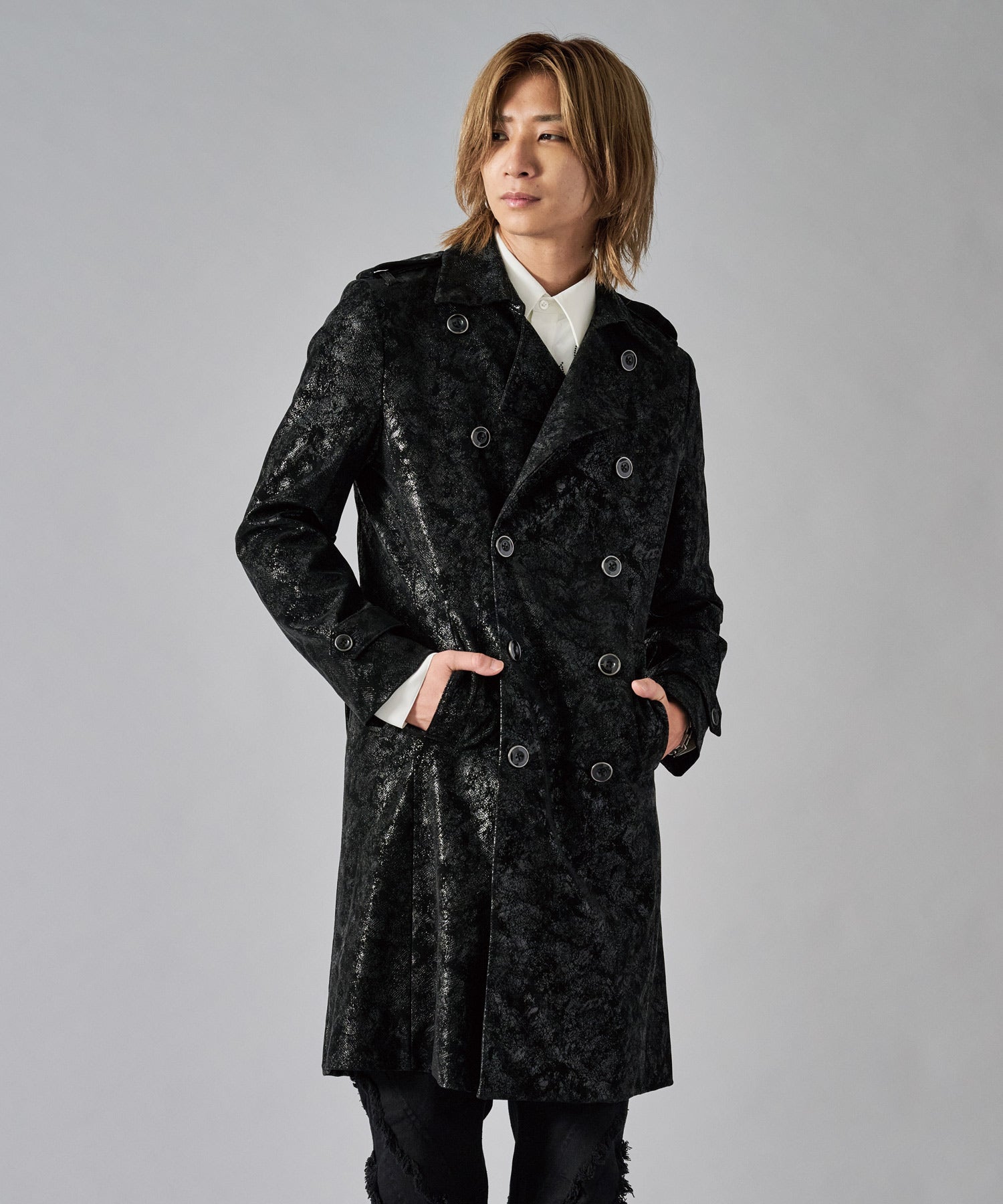 スクエアなショルダーが男らしいダブルのトレンチコートです