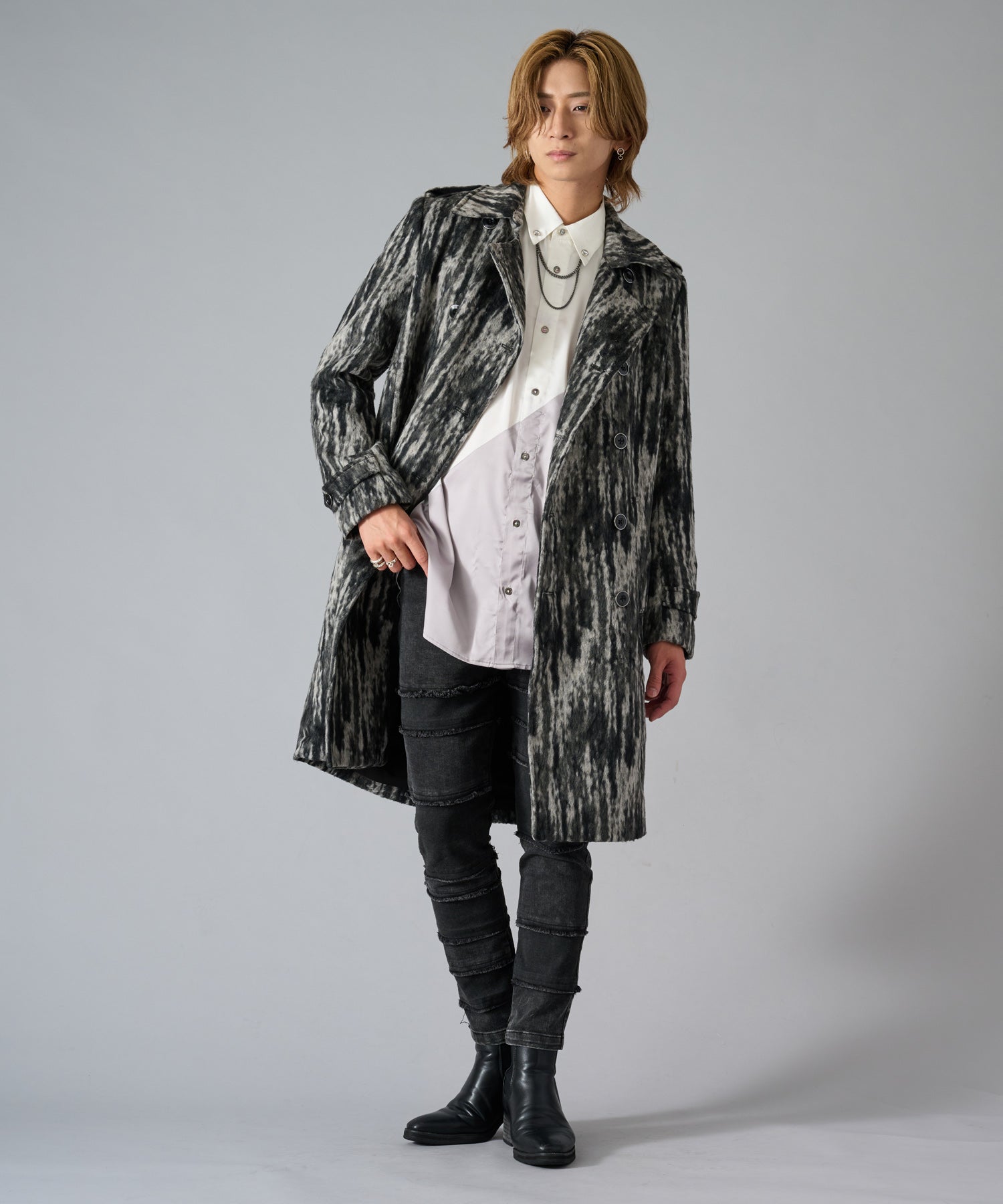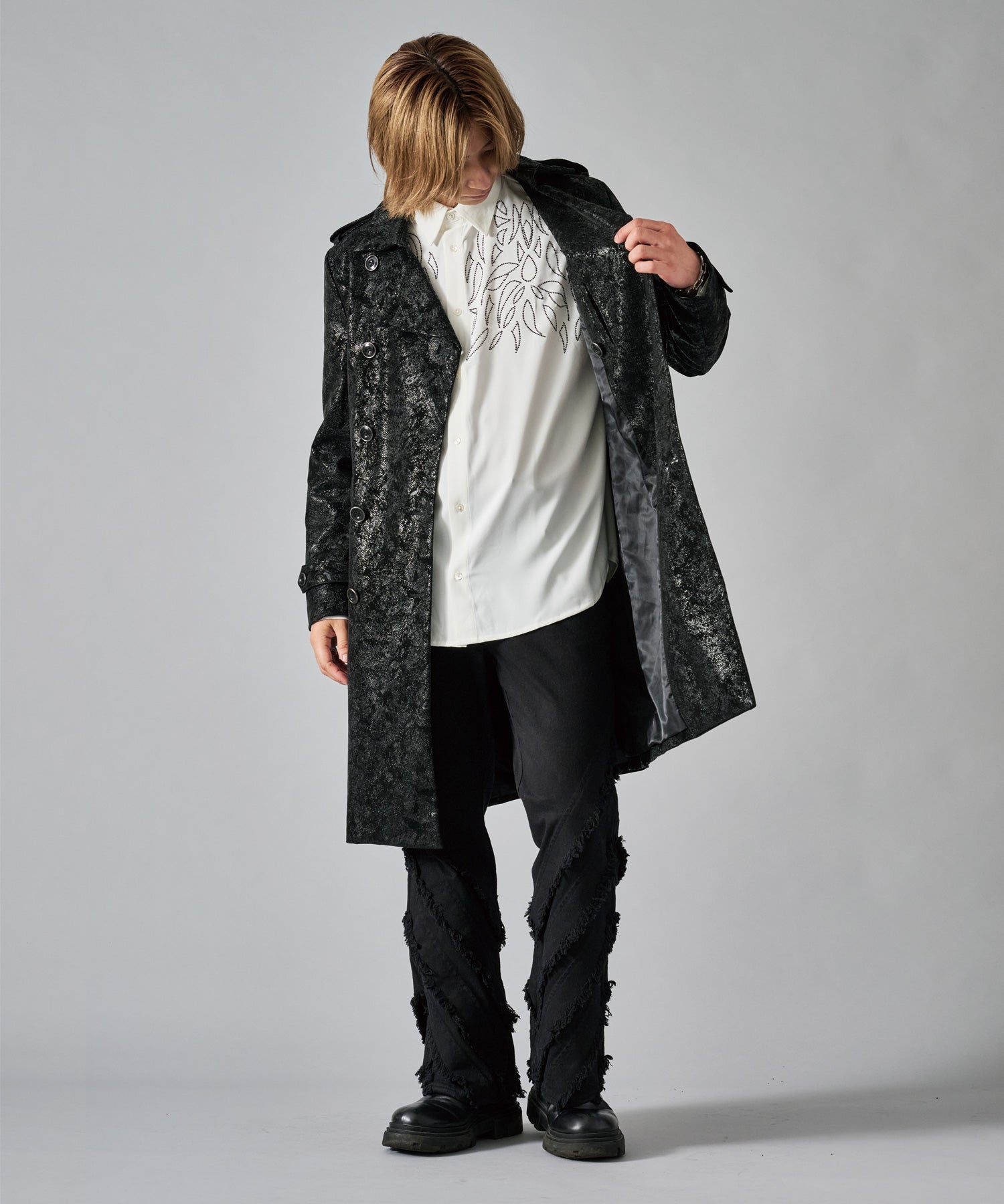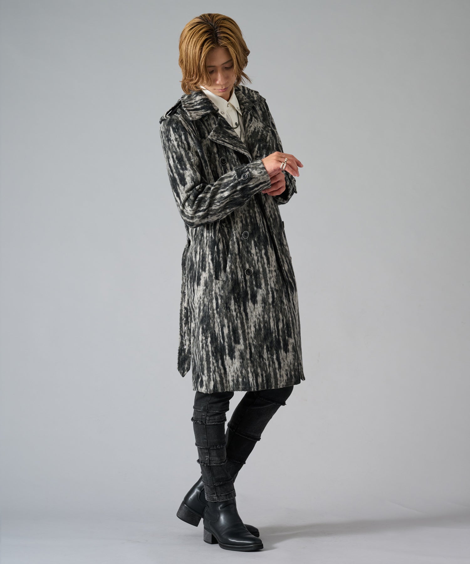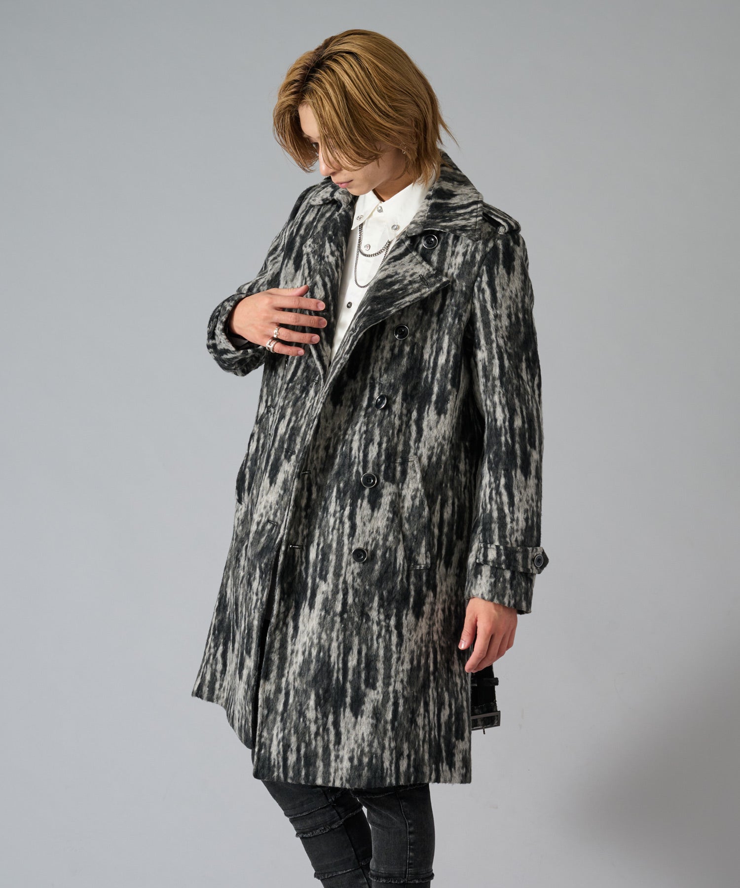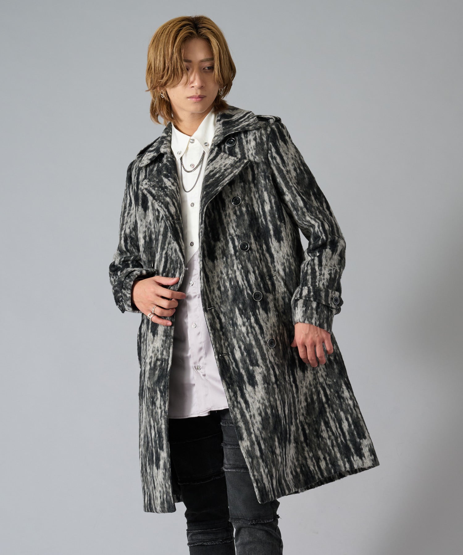 スクエアなショルダーが男らしいダブルのトレンチコートです