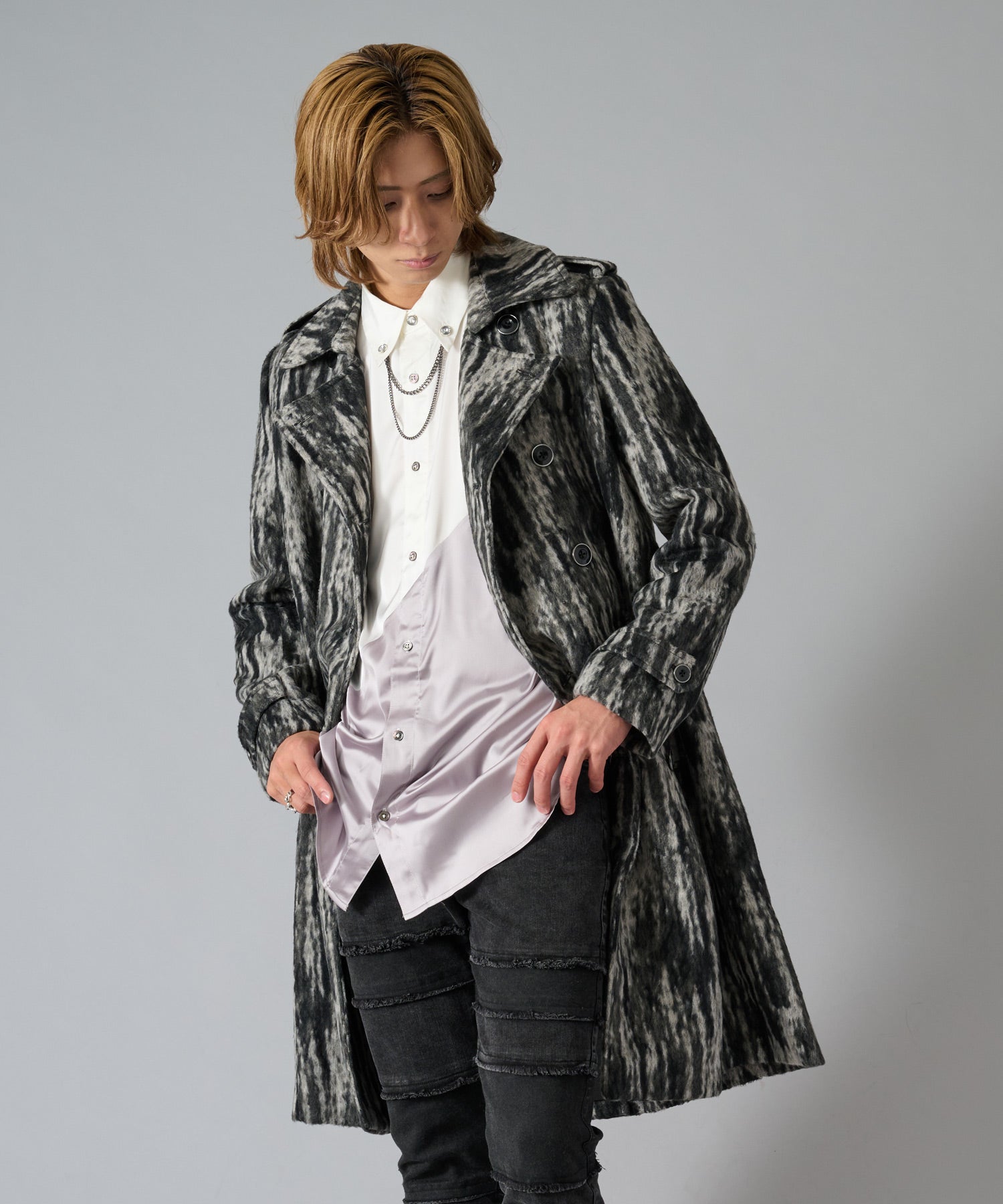 重厚なイメージから単品でも十分な存在感があるので、コーデはシンプルにした方がコートが引き立ちます。シャツやロンTなどの上に羽織れますからシーズン長く着られます