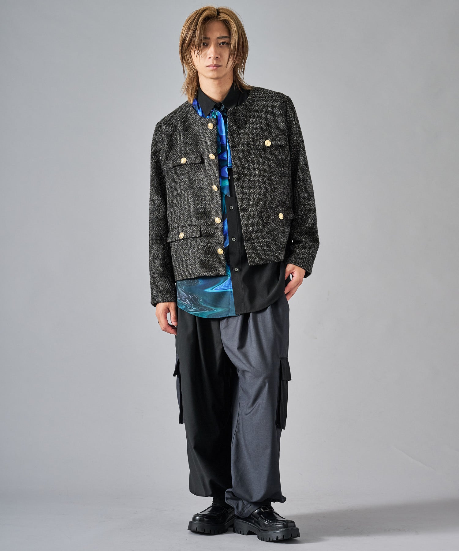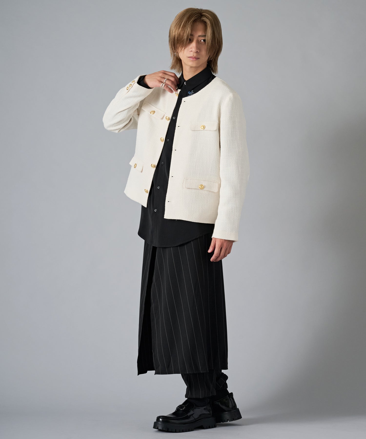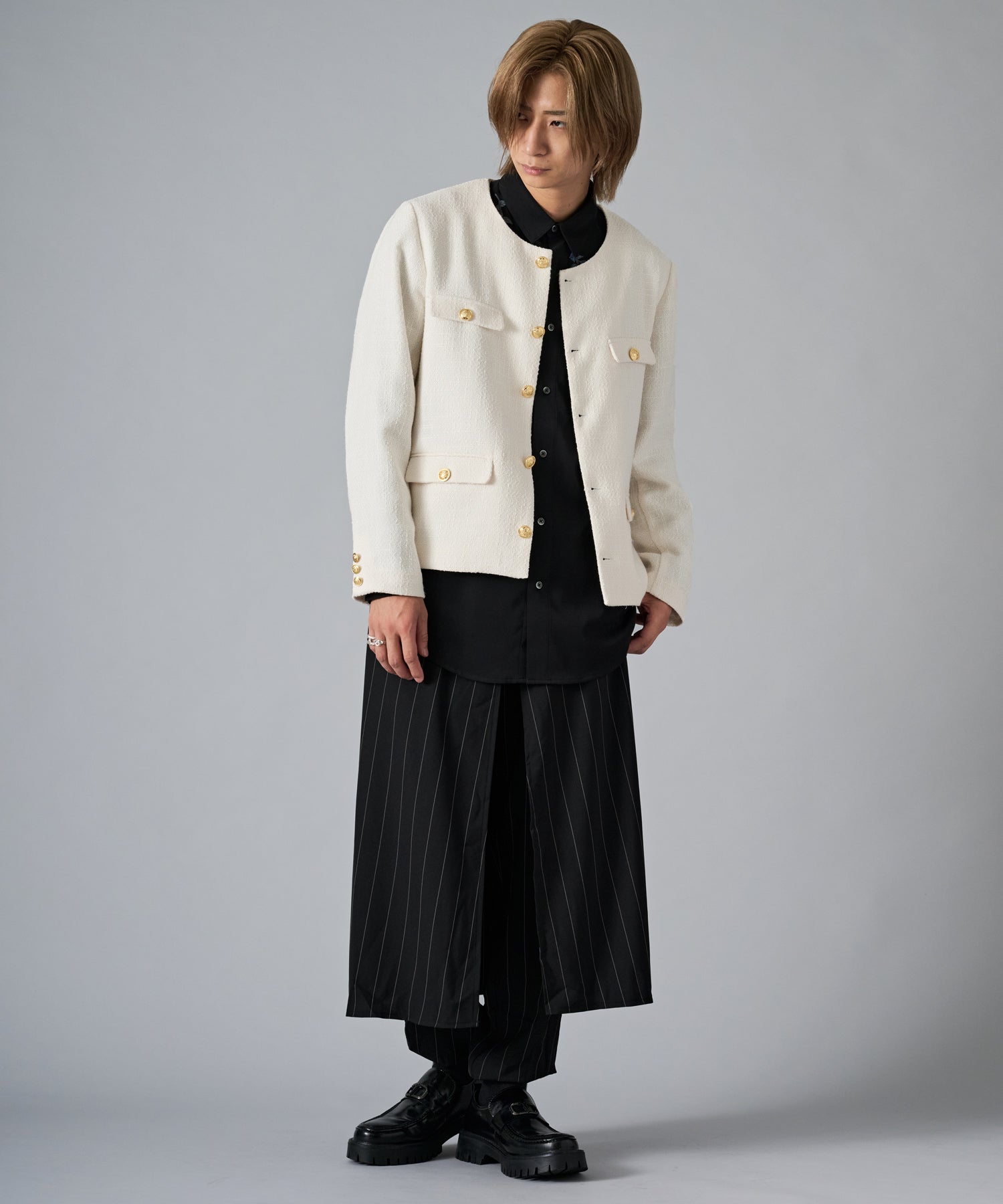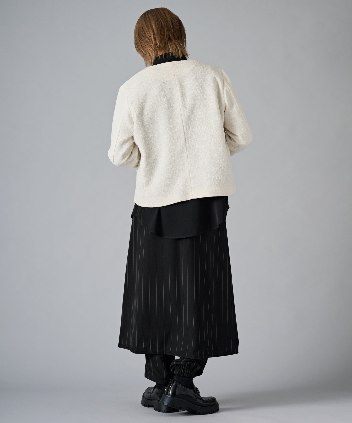 カラーレス故のデザイン性が、襟に特徴のあるシャツやタートルネックと相性がよく、ショート丈によってはみ出すインナーとの縦のレイヤードが楽しめます