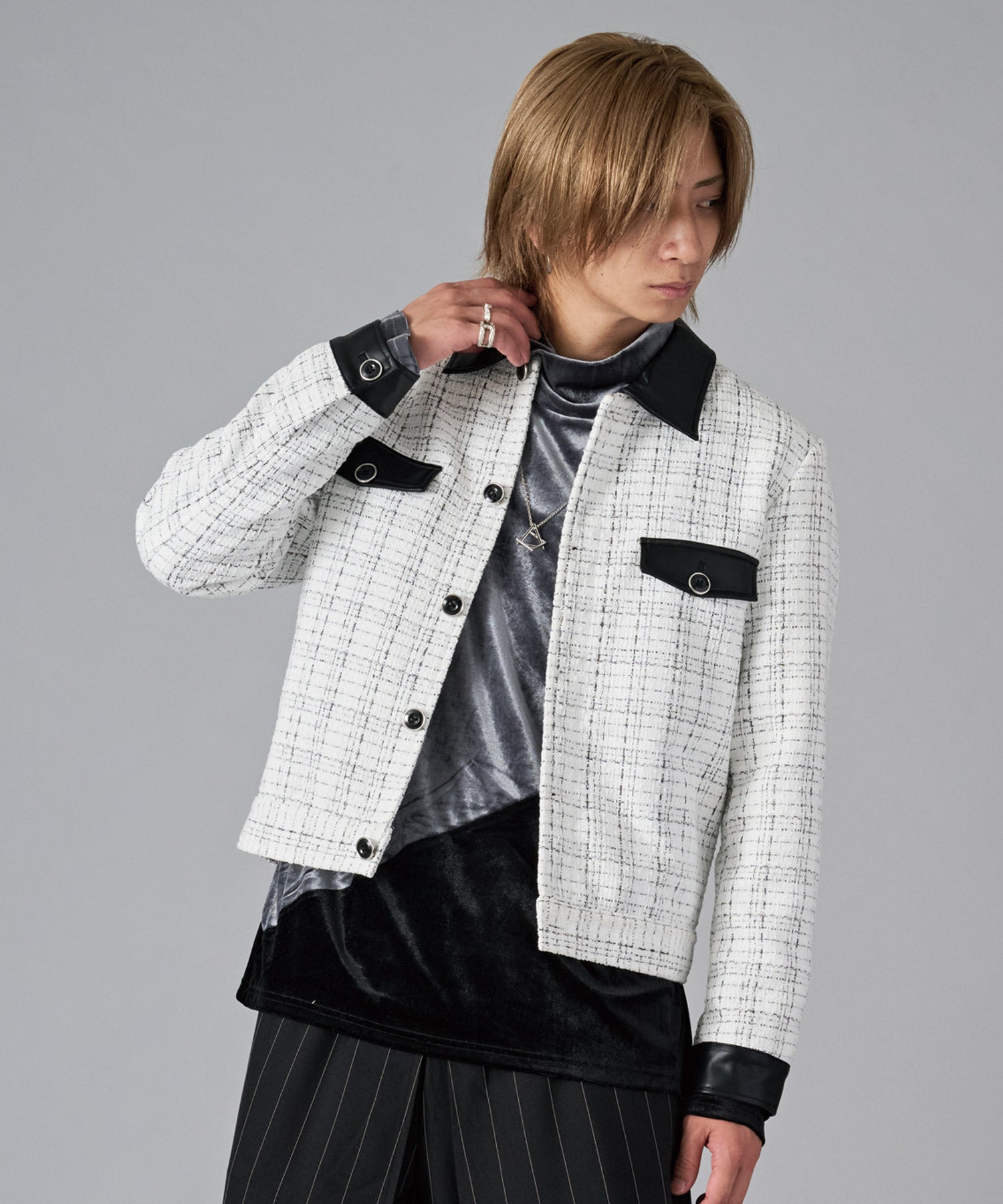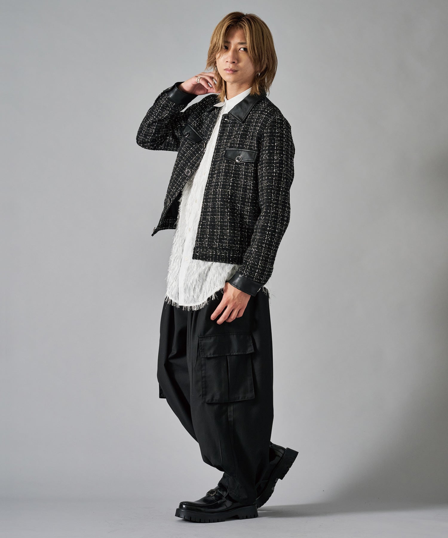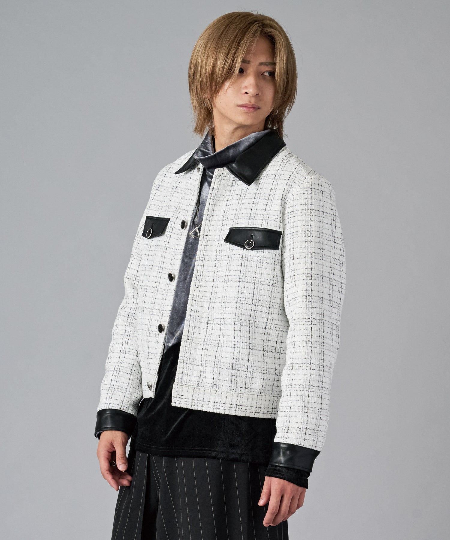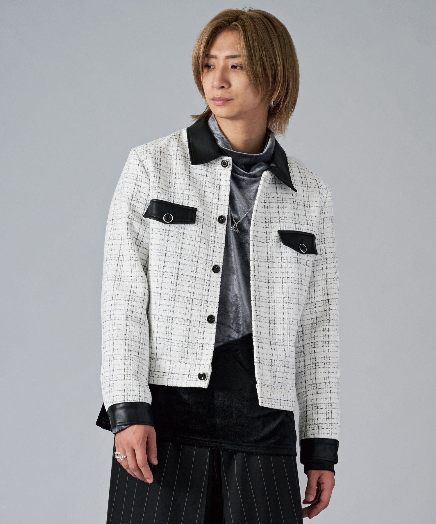 フロントが釦のGジャン風のデザインで、襟、カフス、胸フラップのフェイクレザーがアクセントになっています