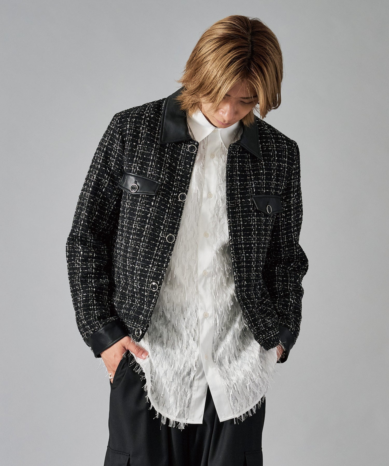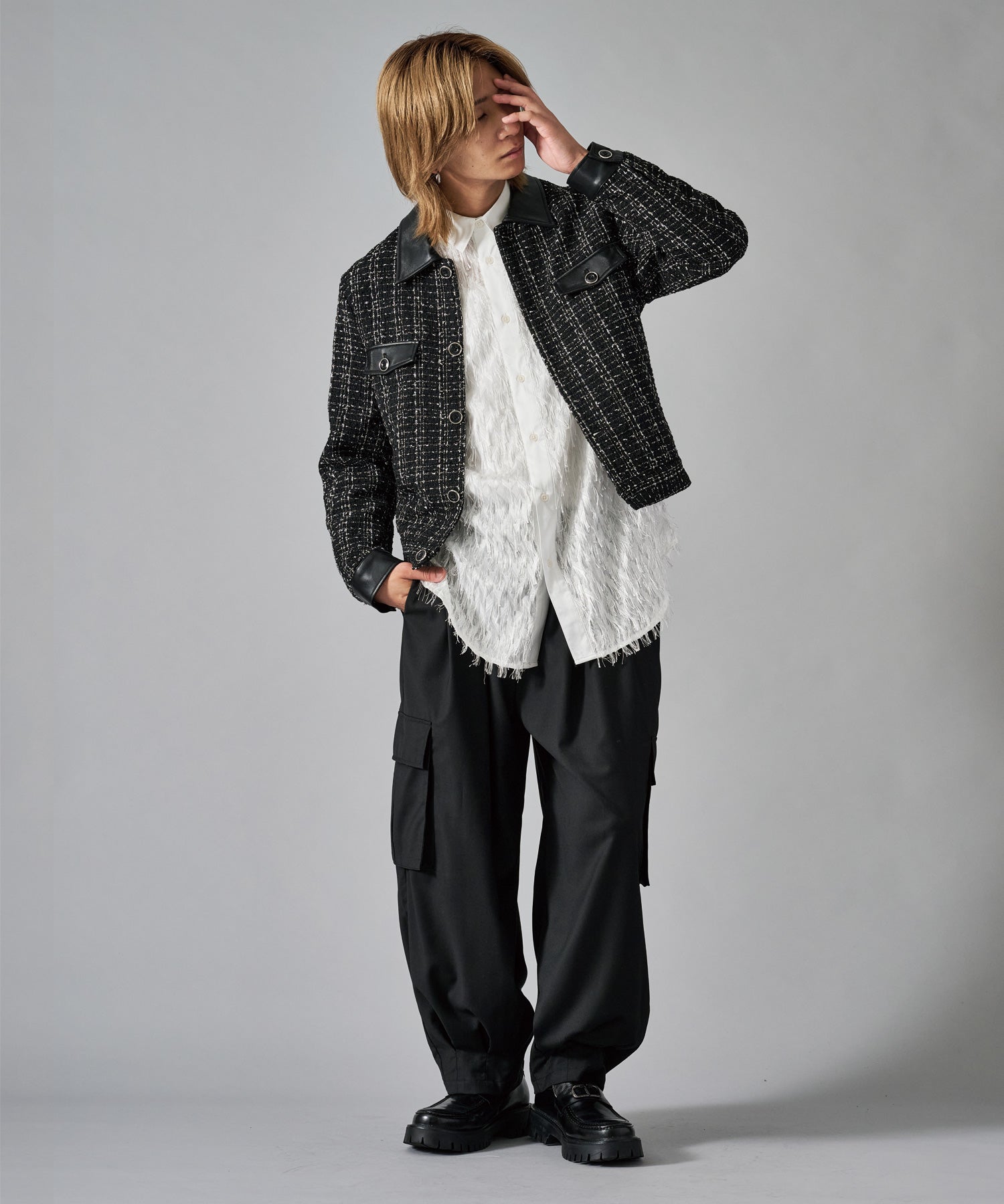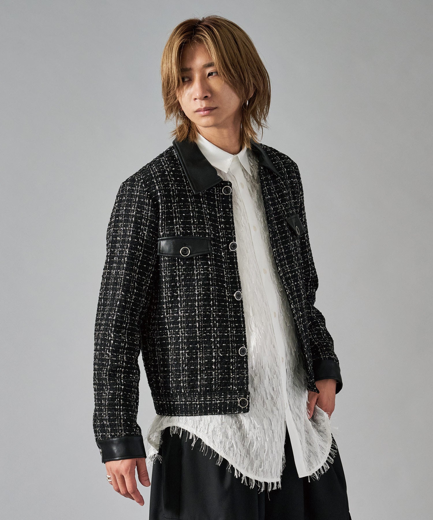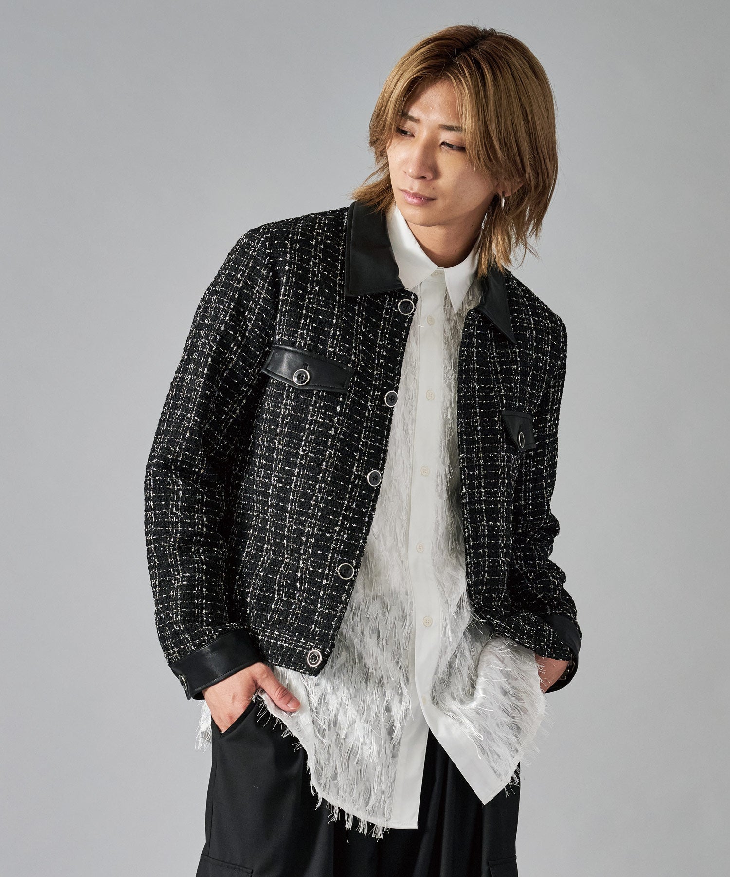 フロントが釦のGジャン風のデザインで、襟、カフス、胸フラップのフェイクレザーがアクセントになっています