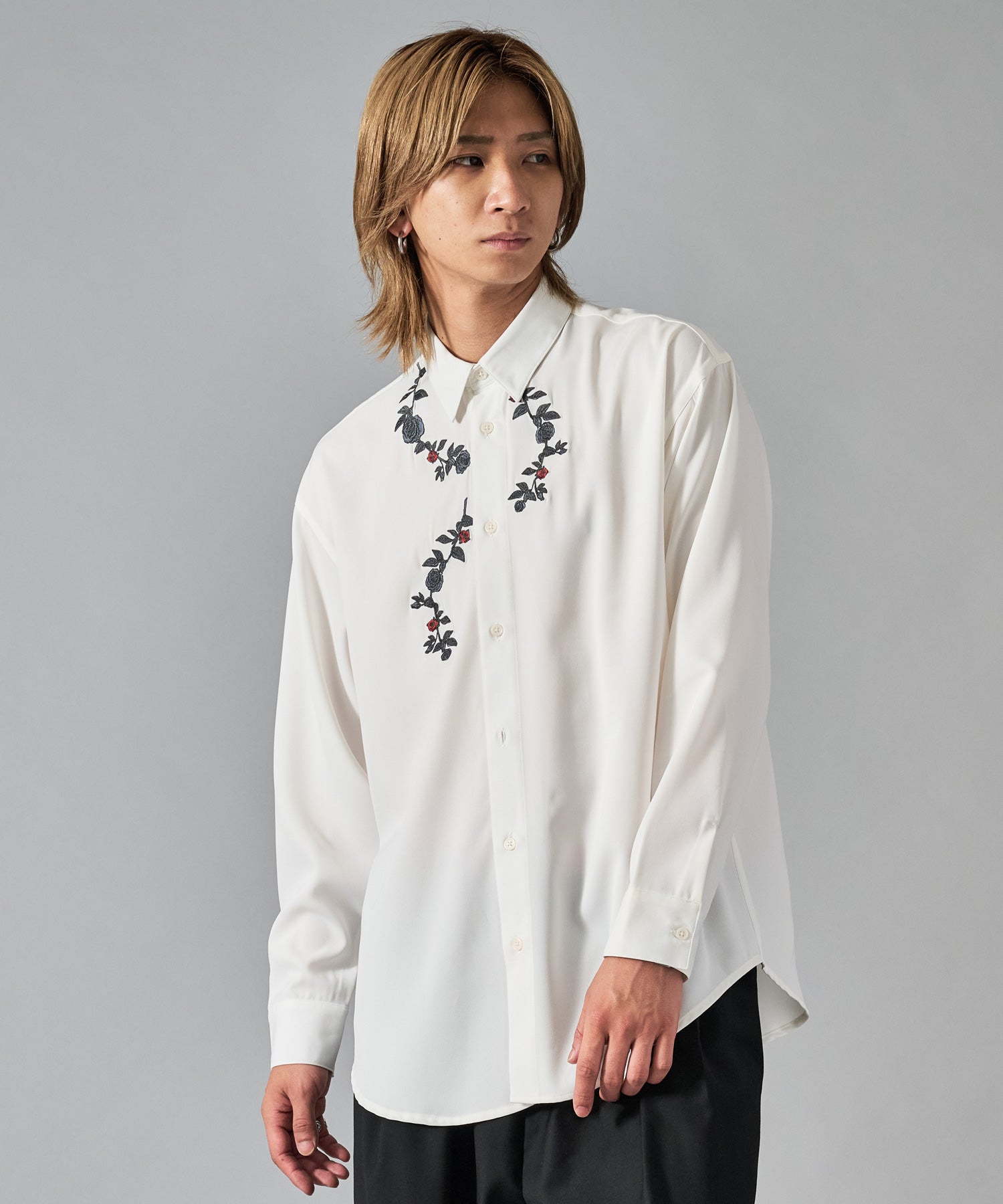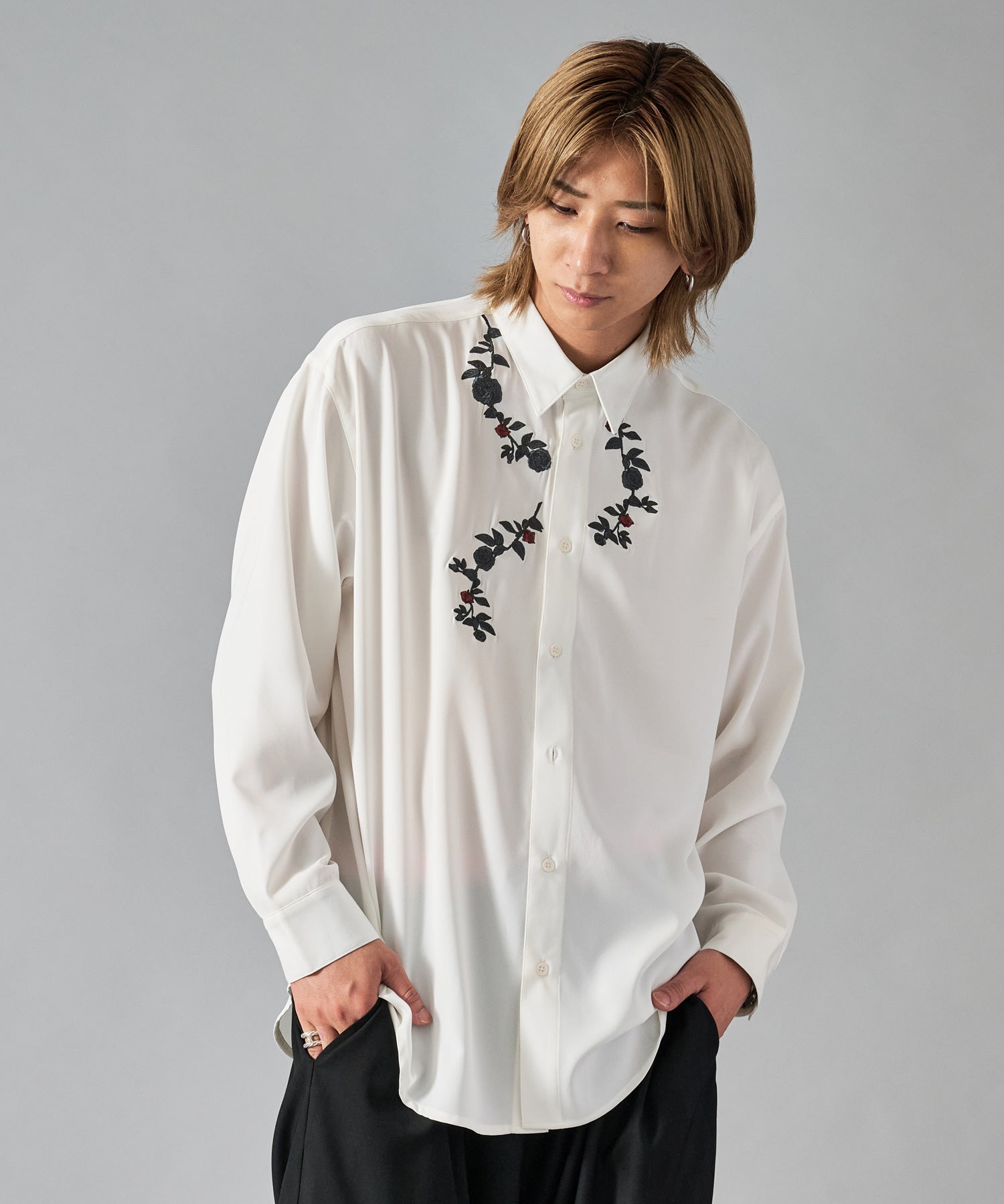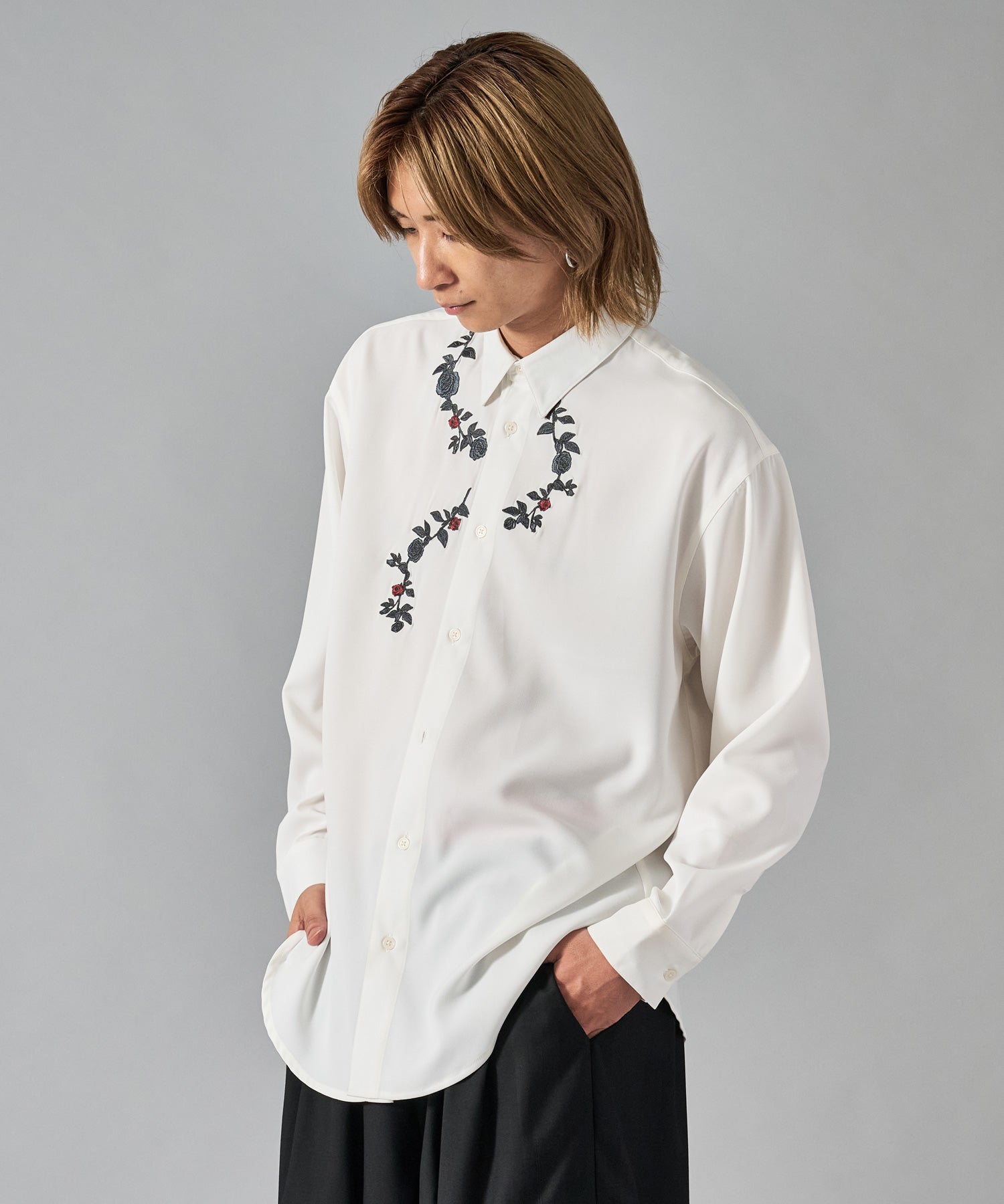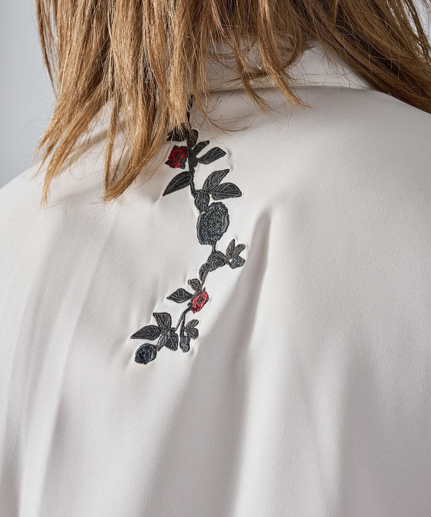 細かな花柄の刺繍がシンプルなシャツのアクセントになっています
