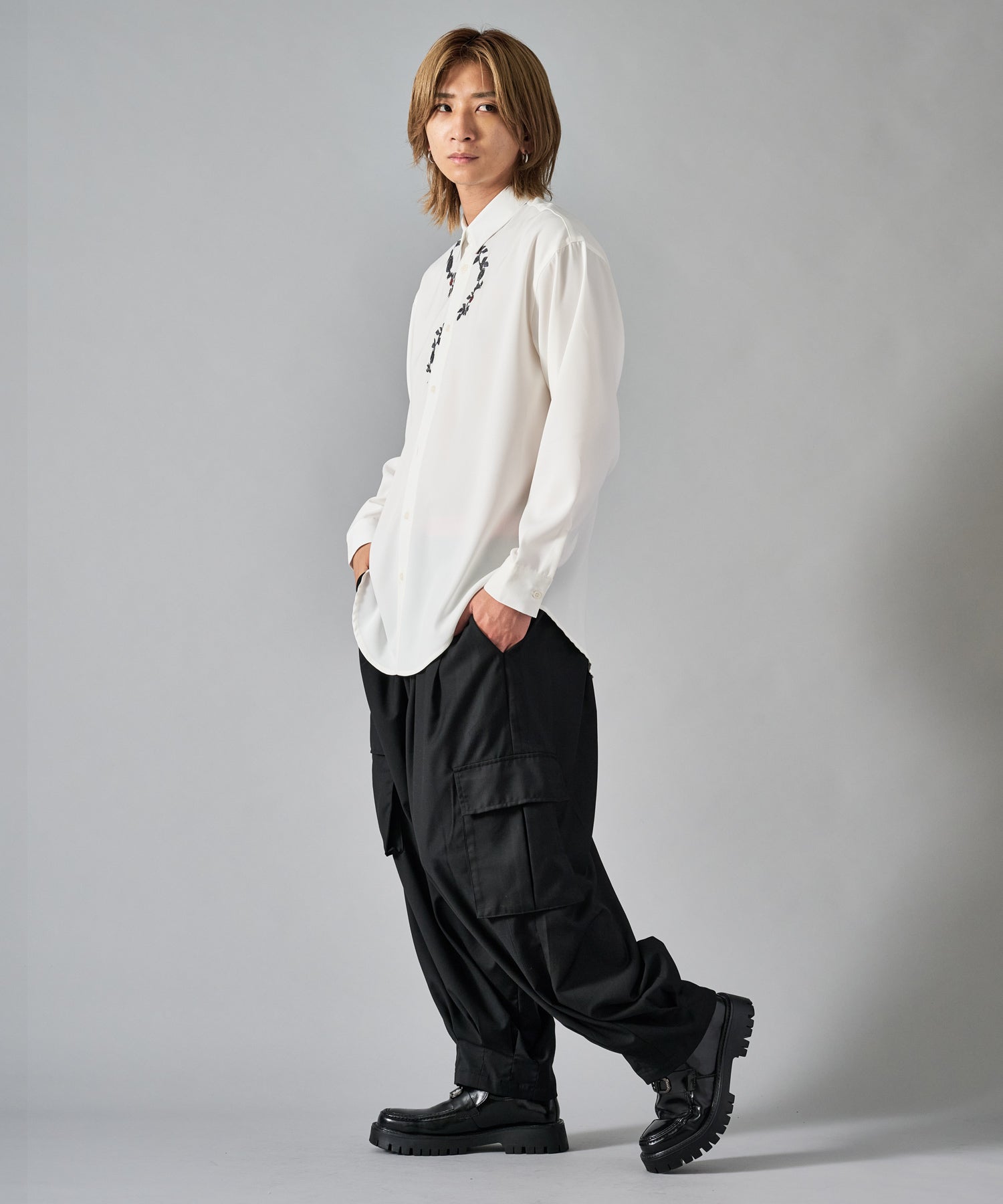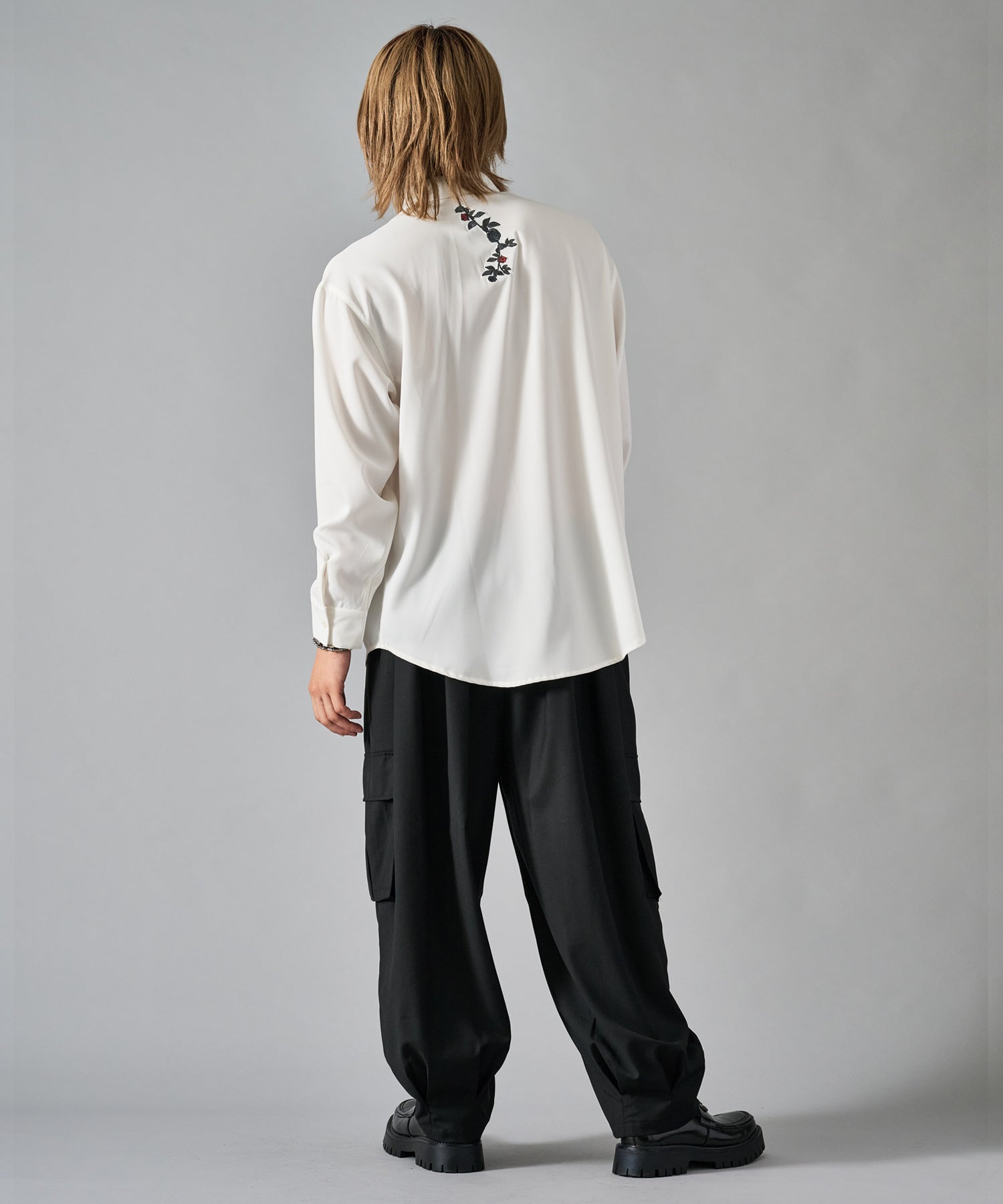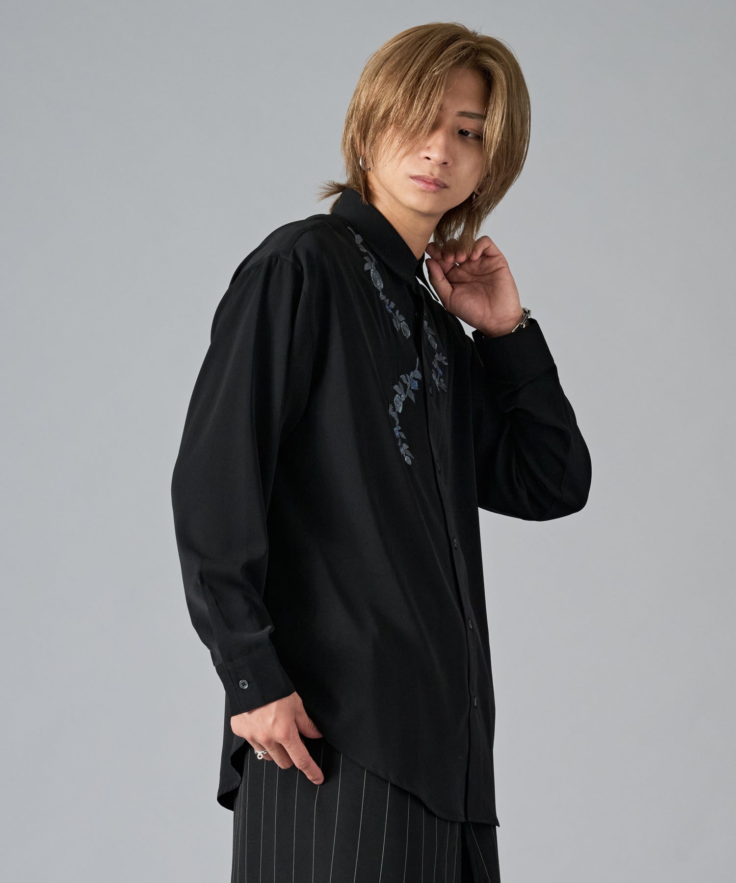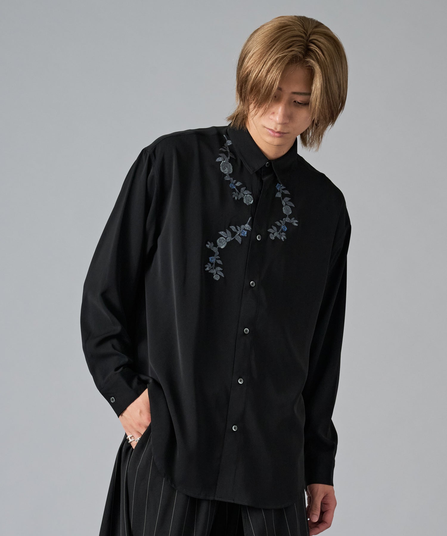 細かな花柄の刺繍がシンプルなシャツのアクセントになっています