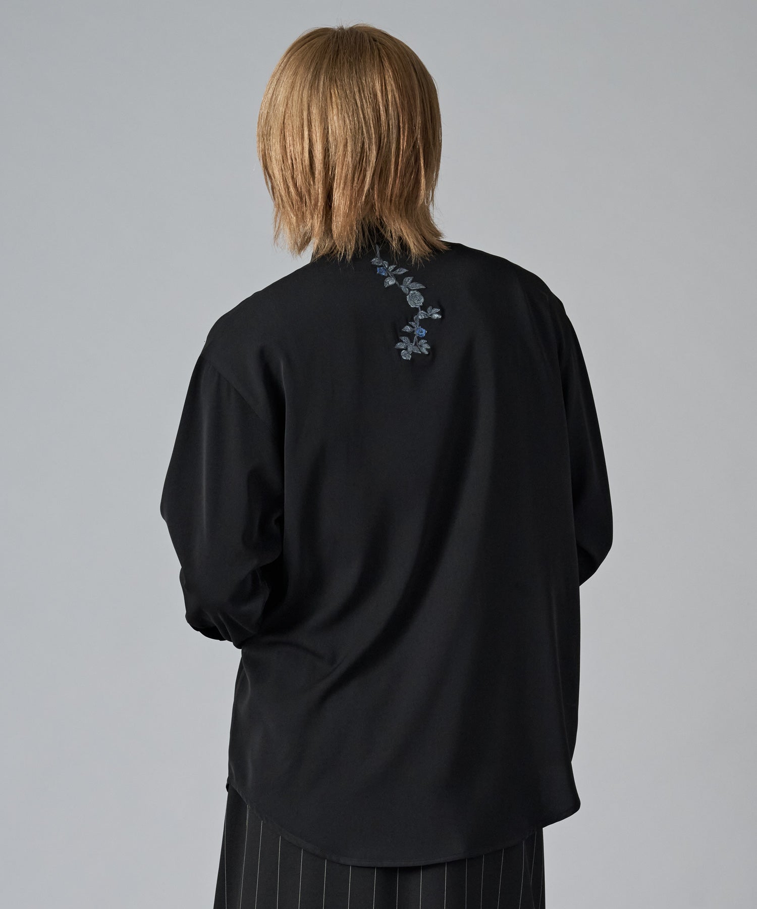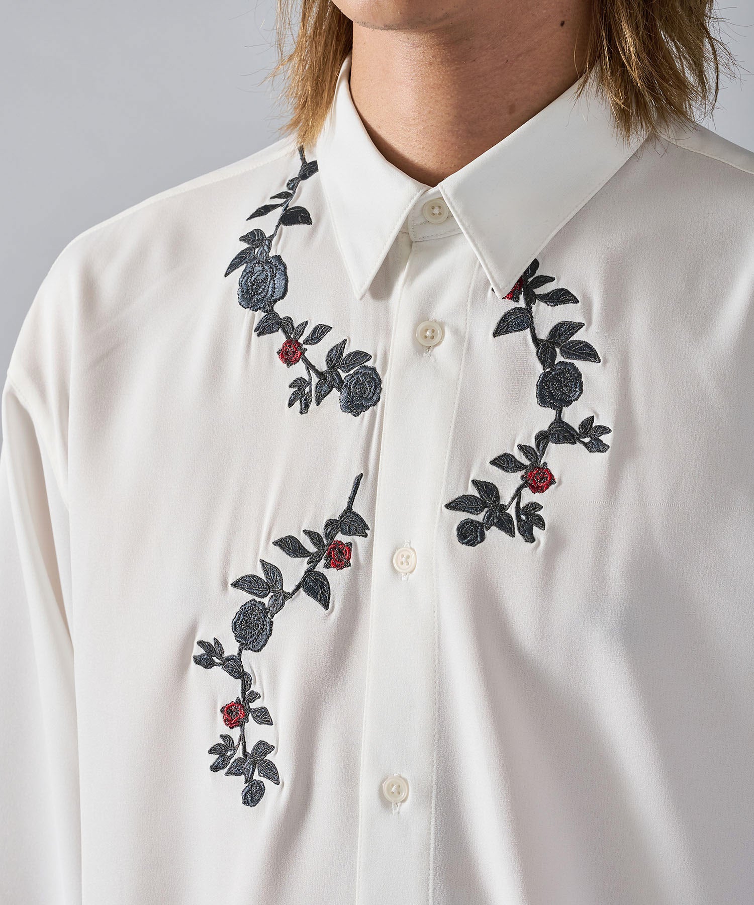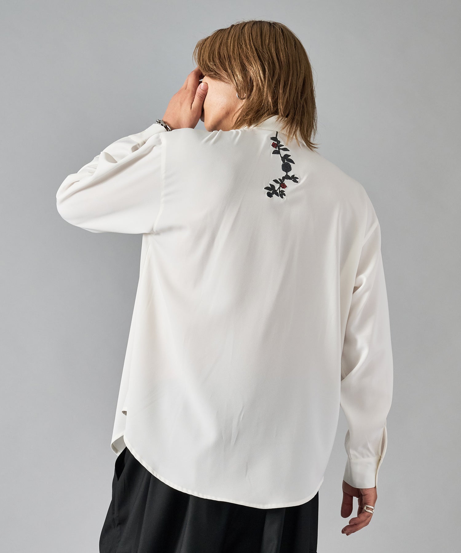 襟元に刺繍を施したオーバーサイズの長袖シャツです