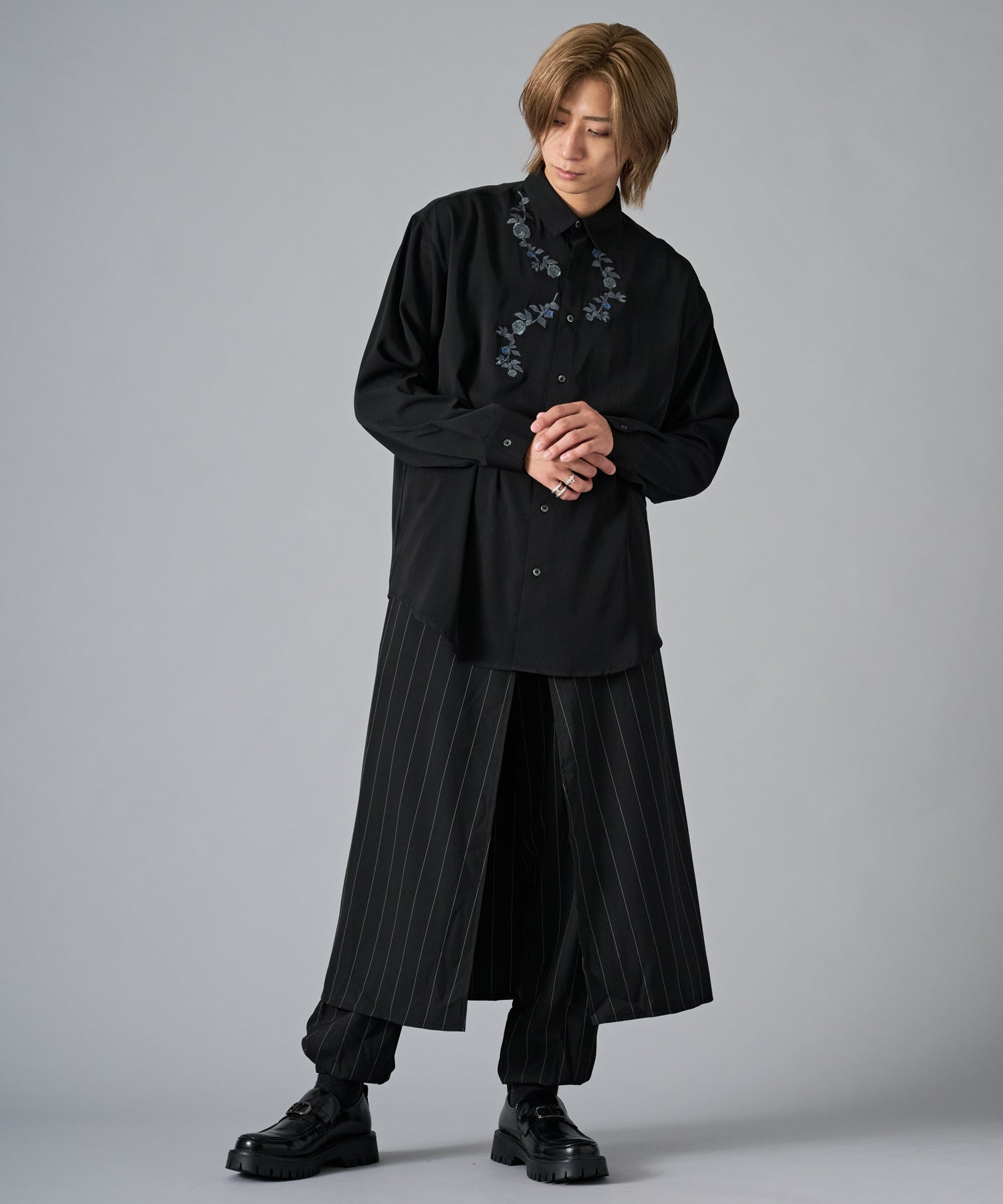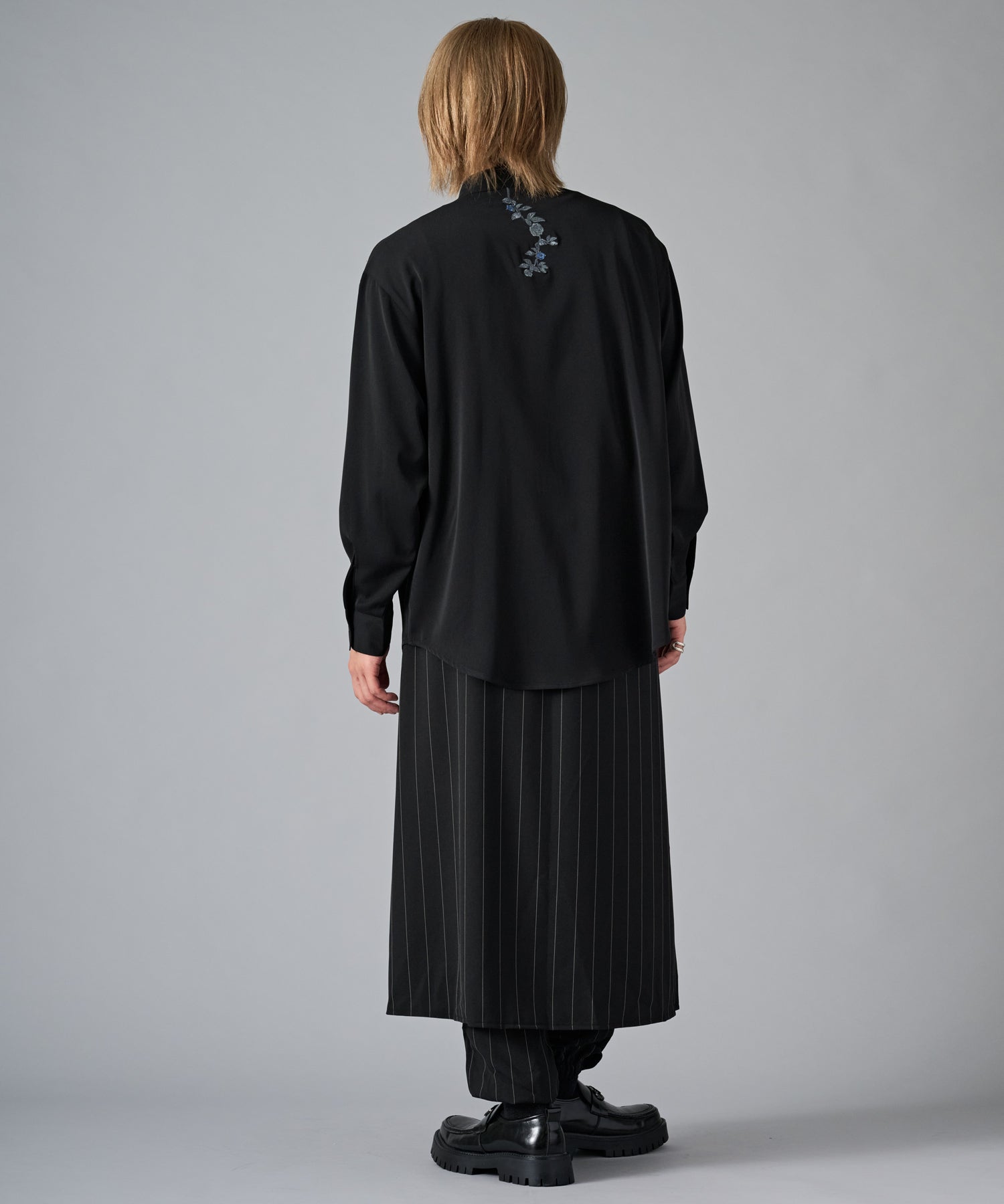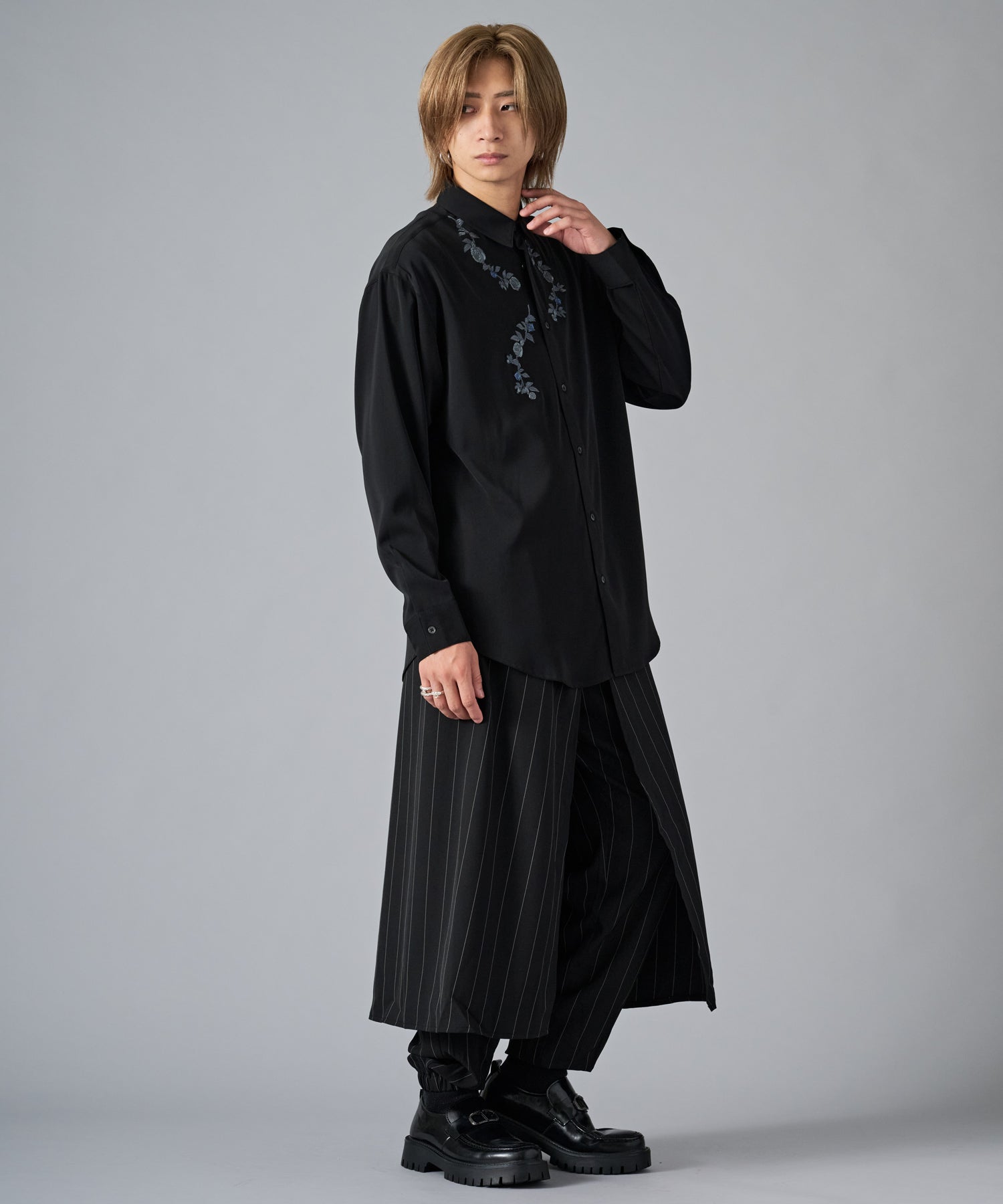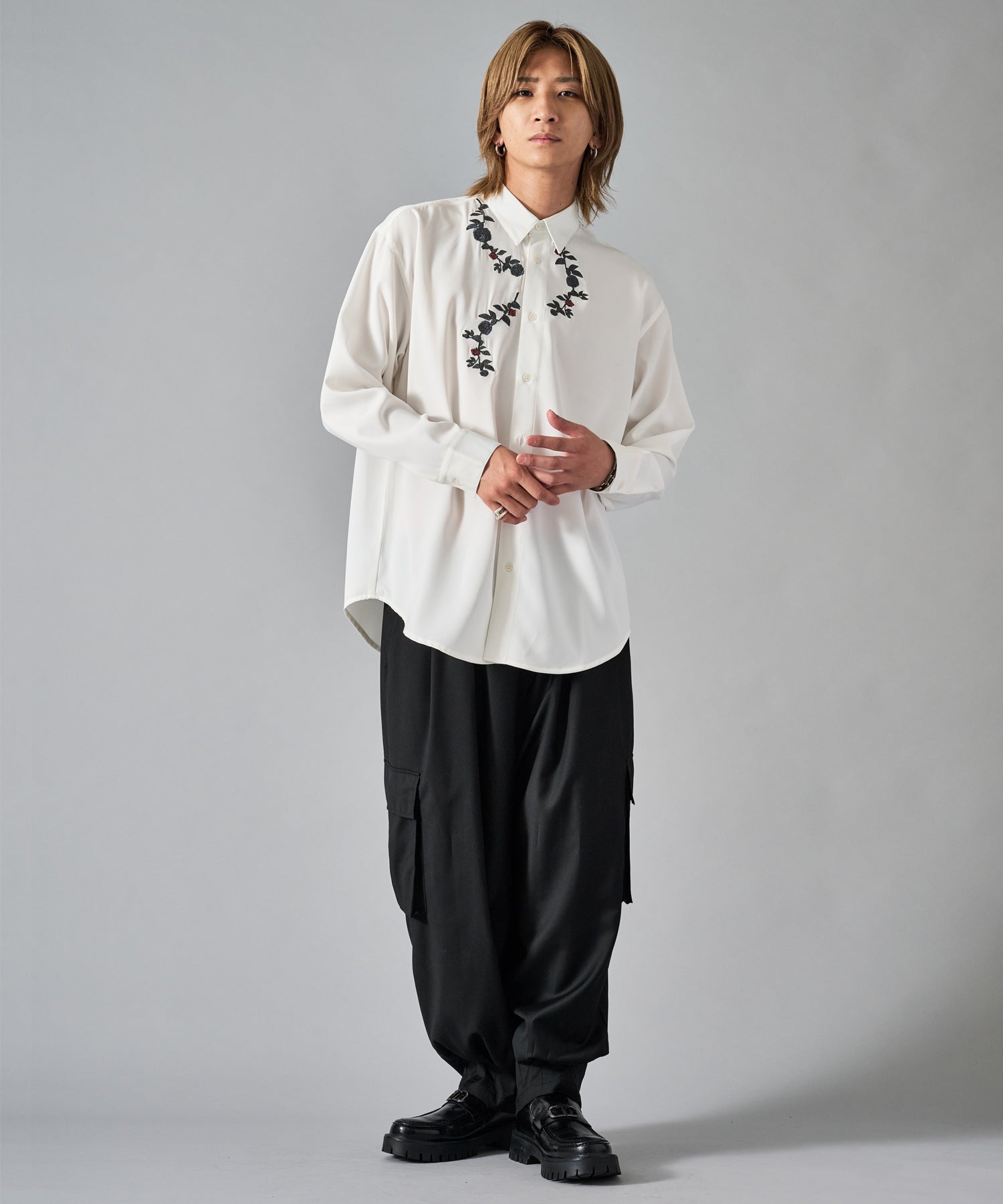 襟元に刺繍を施したオーバーサイズの長袖シャツです