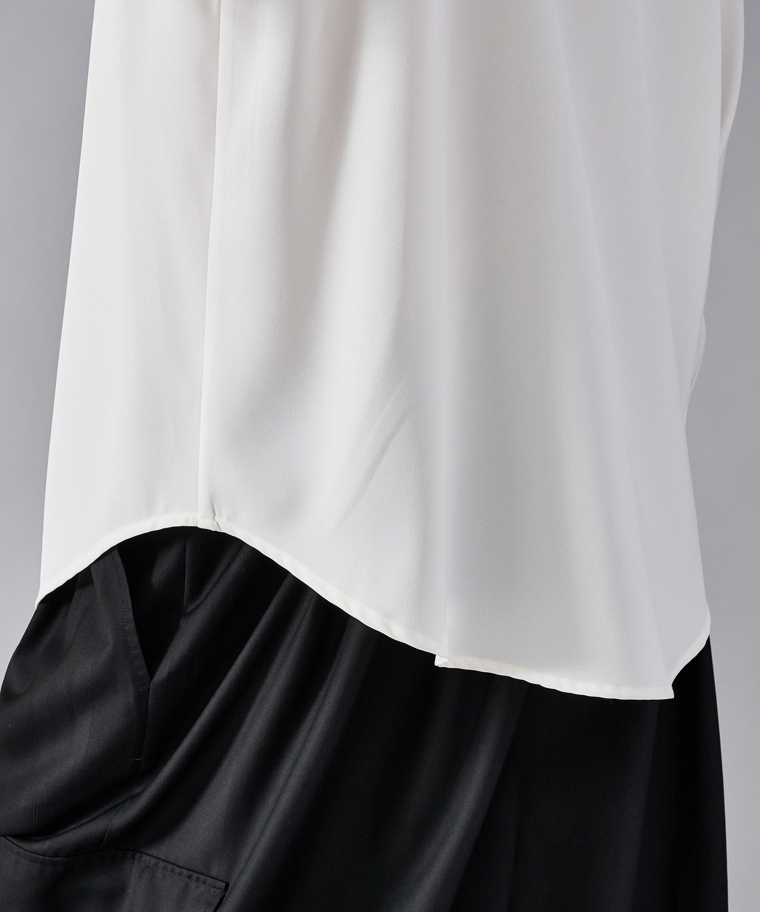 ドレープ感のあるスラックスとの相性が良く、テーラードジャケット、ショートジャケット、ライダースなどのインナーとして裾を出して着るとレイヤード感がクールです