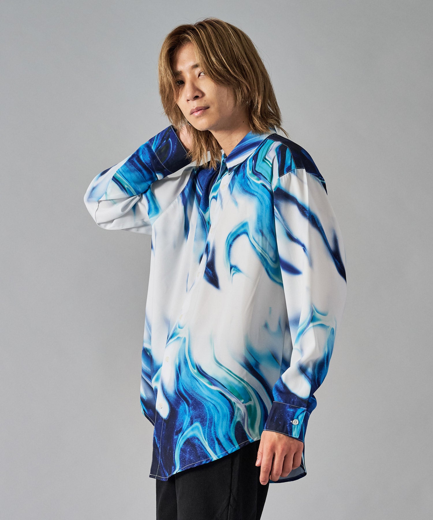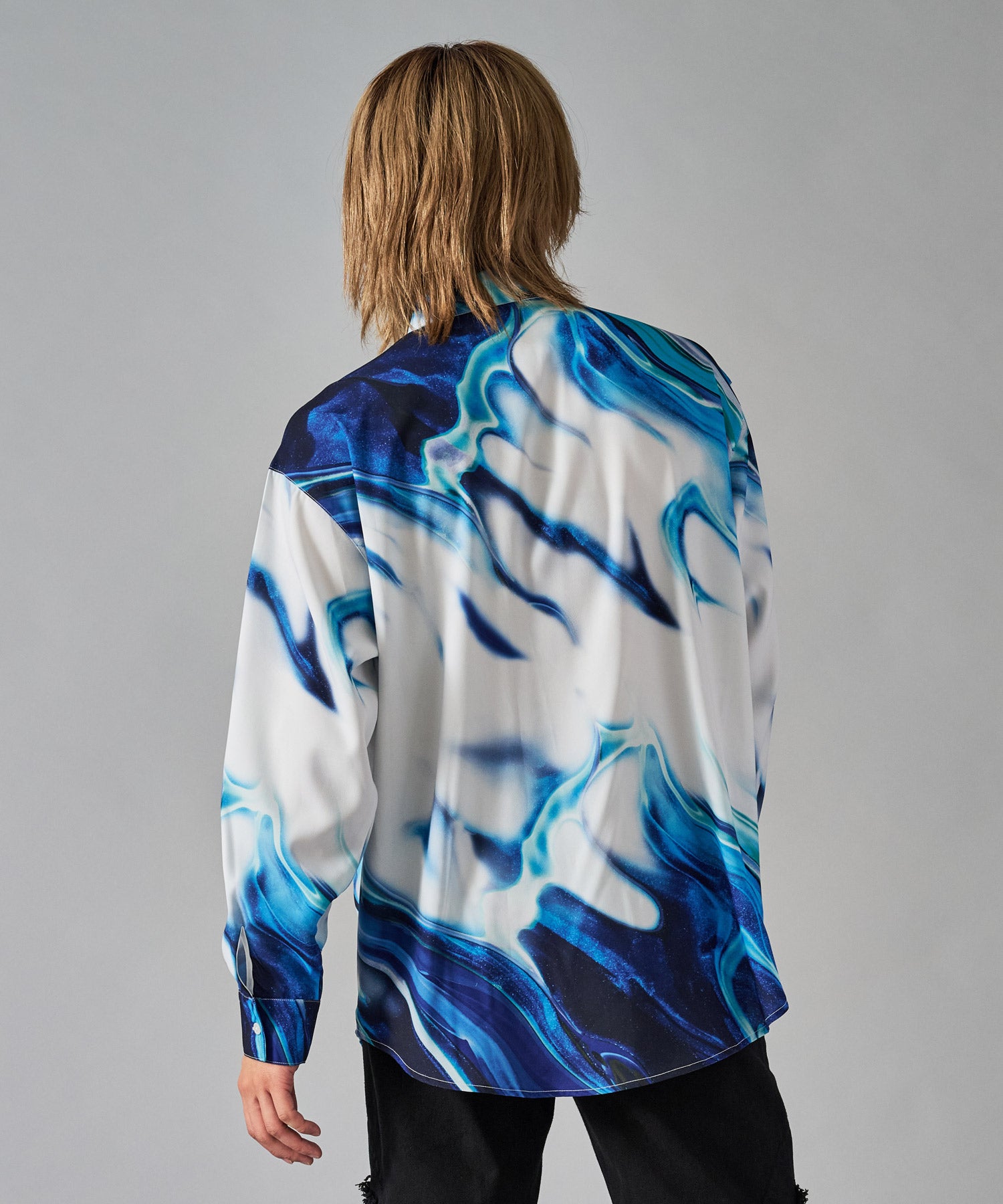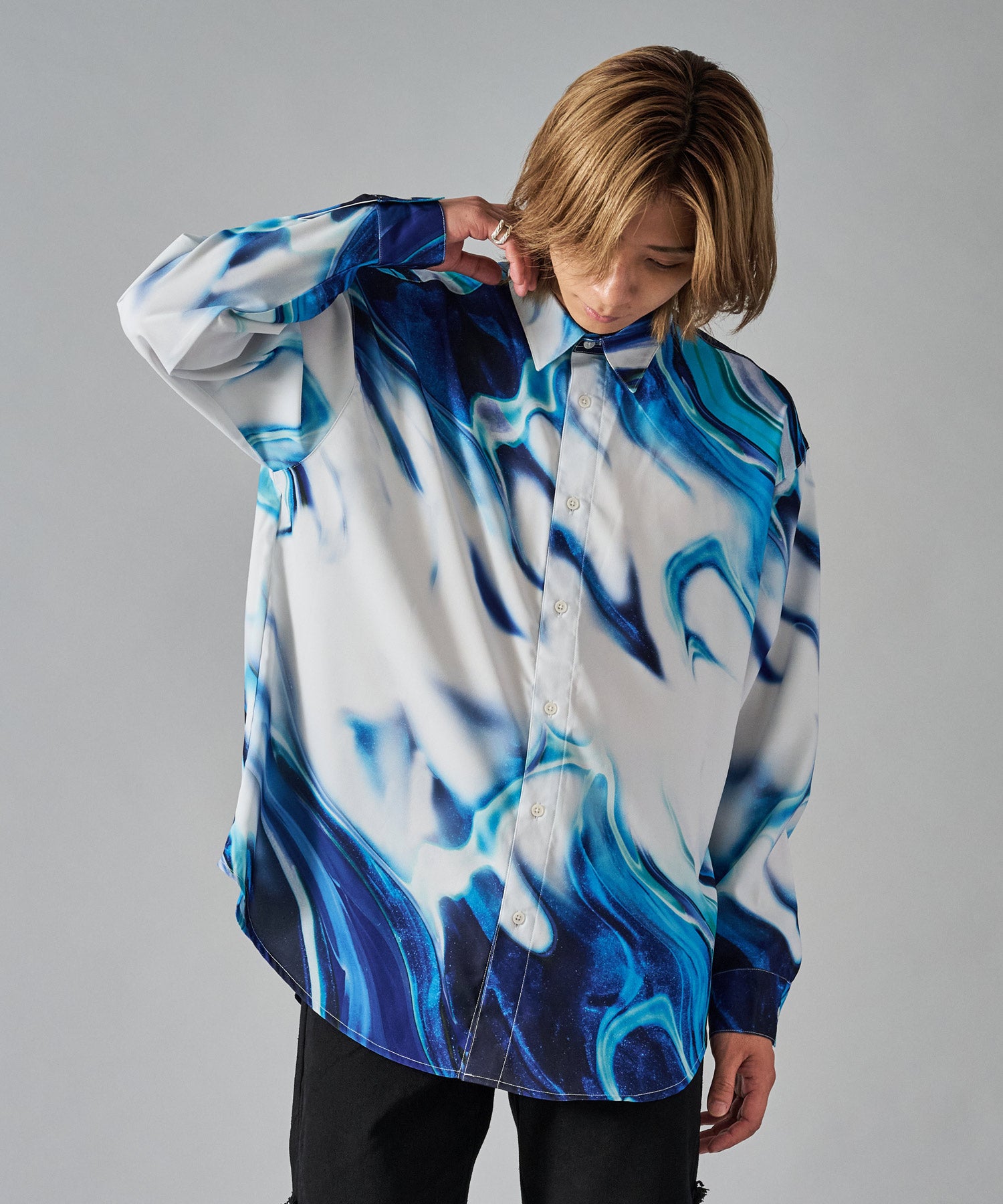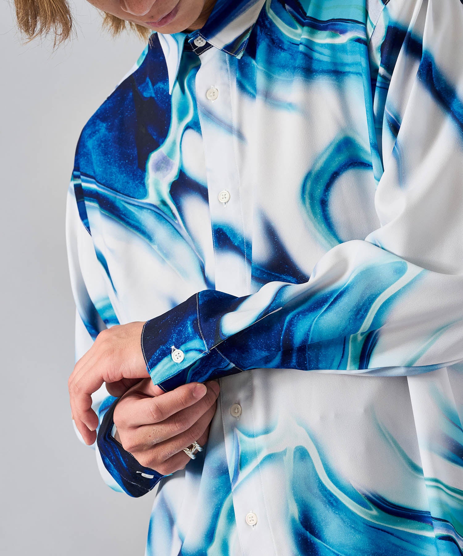 マーブル柄をプリントしたオーバーサイズの長袖シャツです