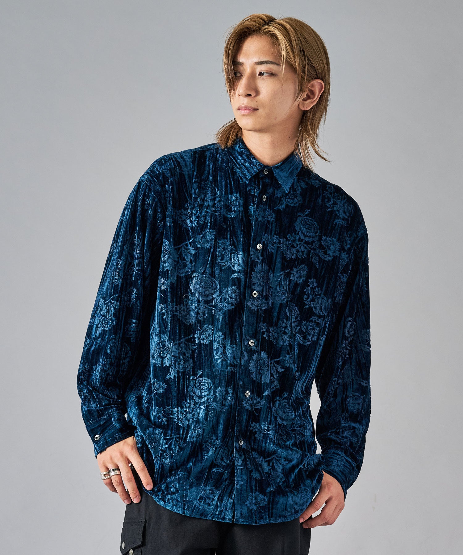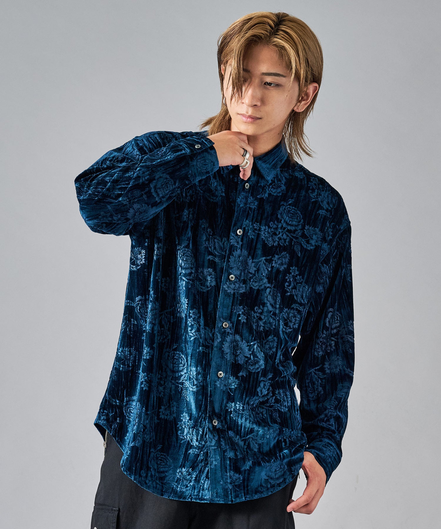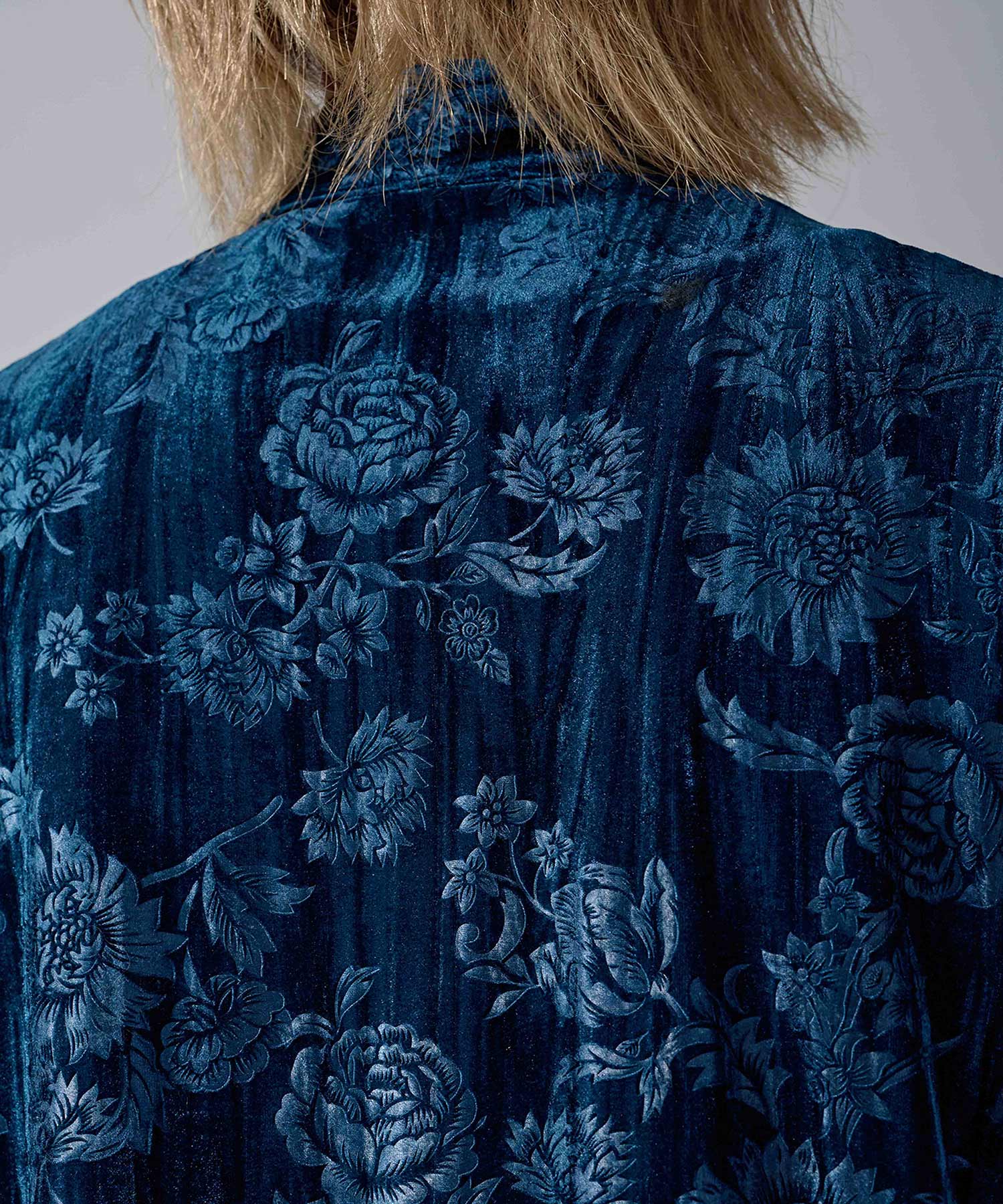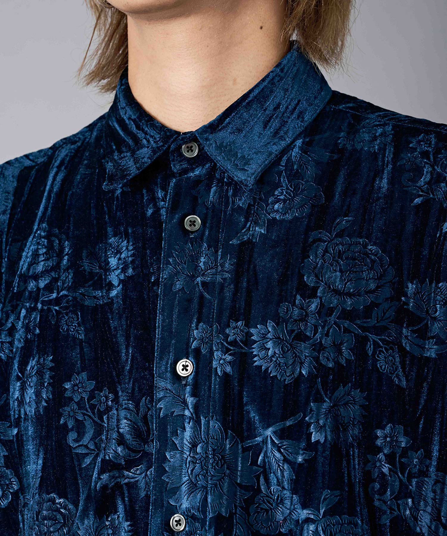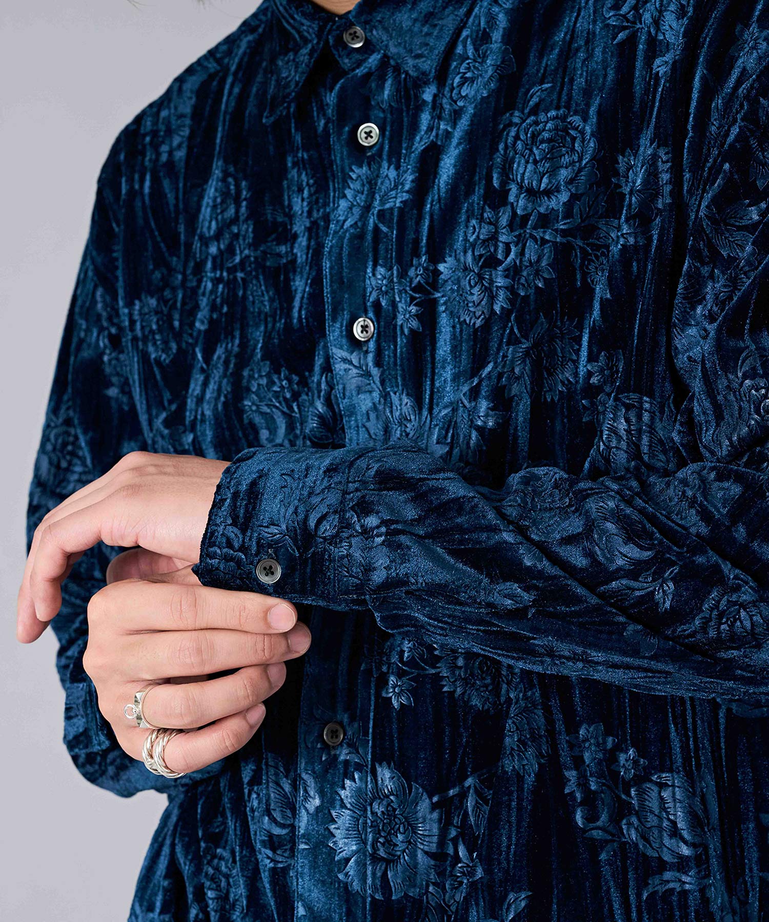 ベロアに花柄を型押しした長袖シャツです ■detail型押しした花柄が、光の角度によって浮かび上がる雰囲気がクールなデザインです ■fabricベロアはその起毛だった表面が独特の光沢を放ち、ソフトなタッチと温もりを感じる代表的な季節感ある素材です ■stylingスラックスタイプで合わせてモードな雰囲気も楽しめ、ワークパンツでカジュアルな着回しもでき、この素材一つコーデに加えるだけでシーズンを先取りできるアイテムです |