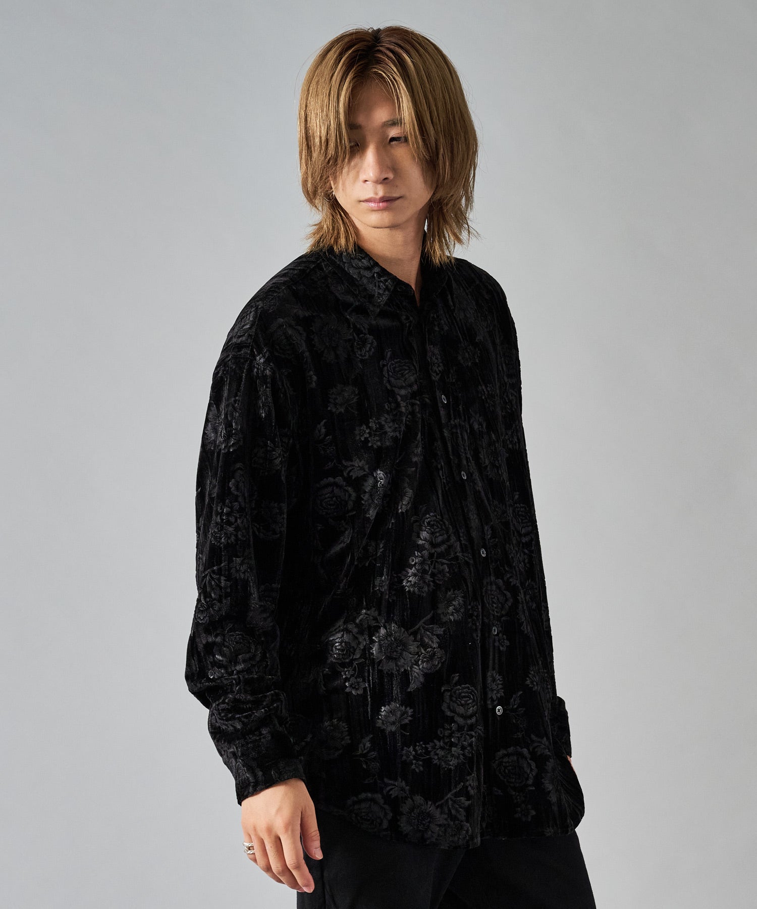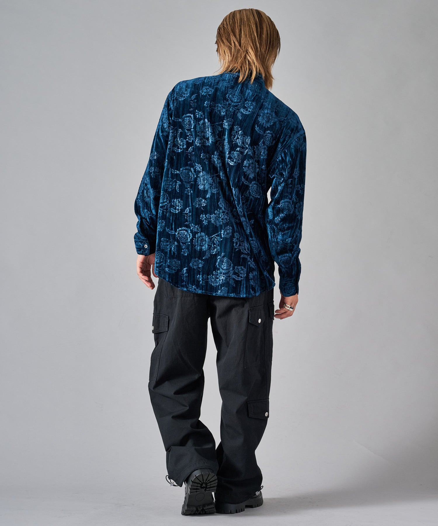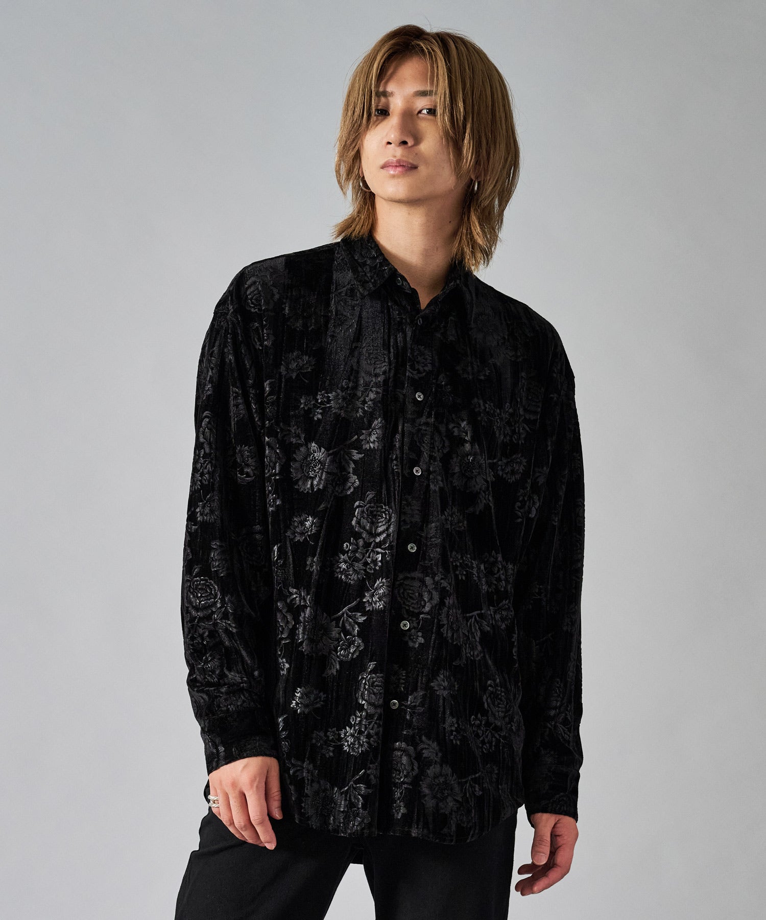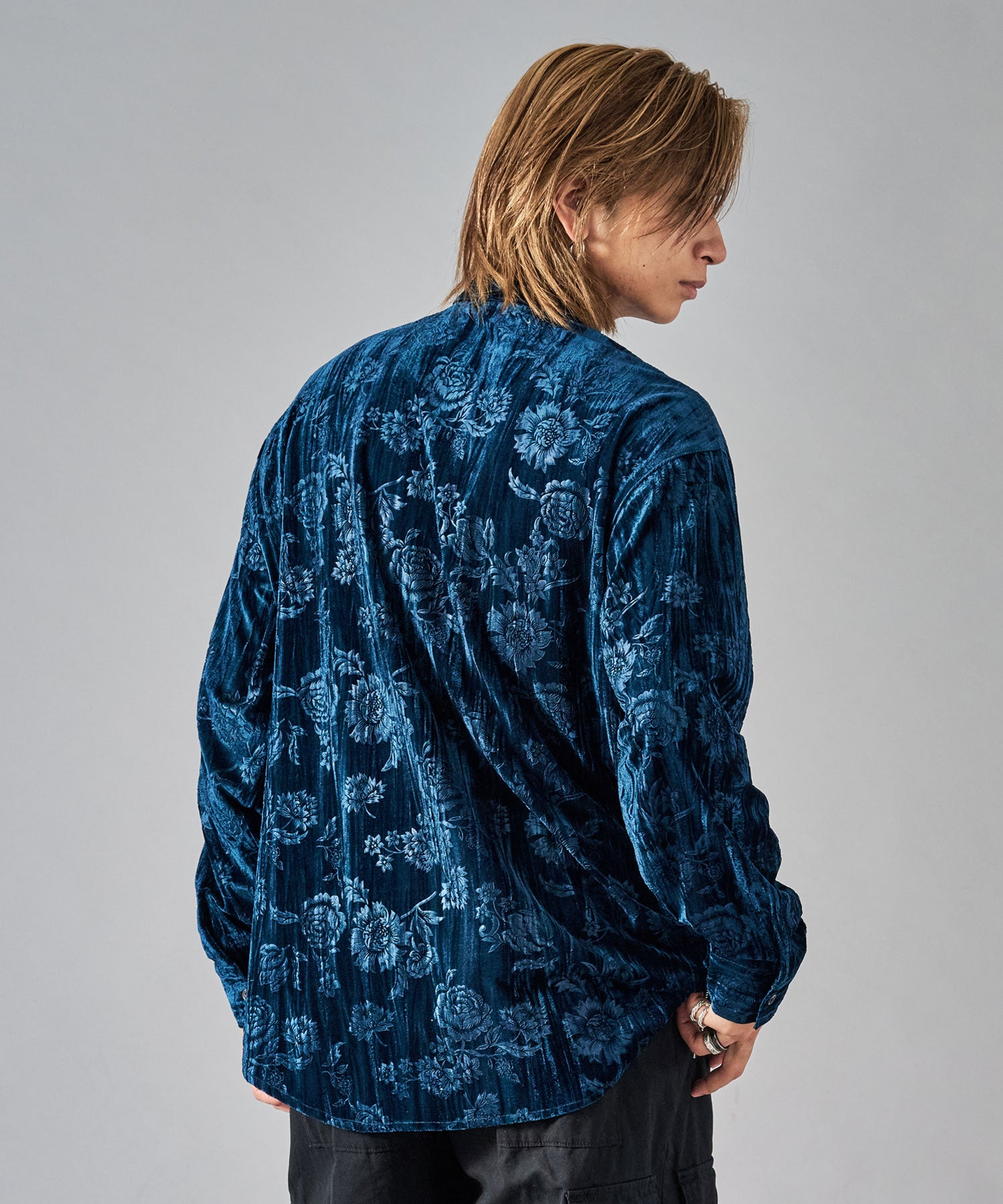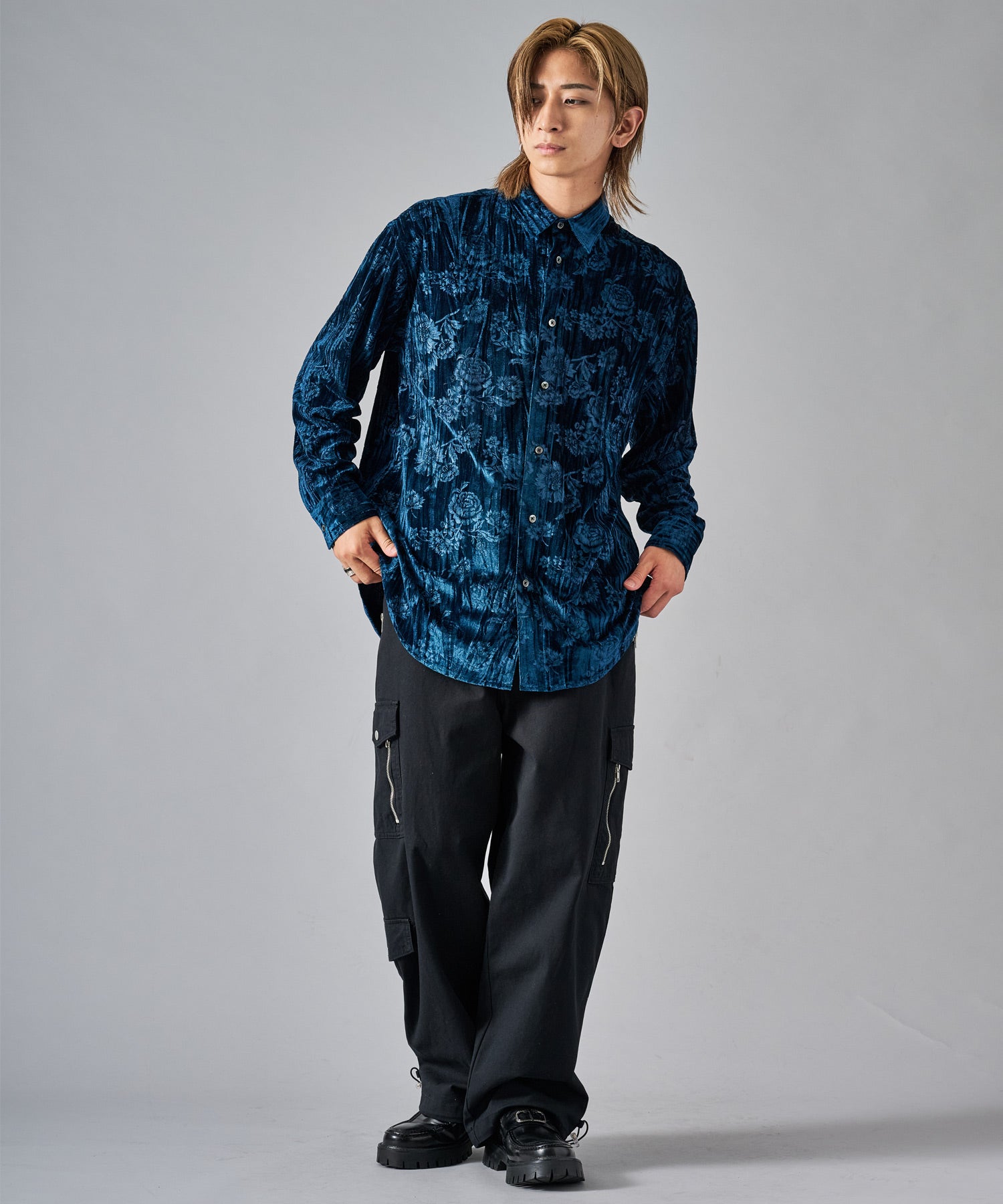 ベロアに花柄を型押しした長袖シャツです ■detail型押しした花柄が、光の角度によって浮かび上がる雰囲気がクールなデザインです ■fabricベロアはその起毛だった表面が独特の光沢を放ち、ソフトなタッチと温もりを感じる代表的な季節感ある素材です ■stylingスラックスタイプで合わせてモードな雰囲気も楽しめ、ワークパンツでカジュアルな着回しもでき、この素材一つコーデに加えるだけでシーズンを先取りできるアイテムです |