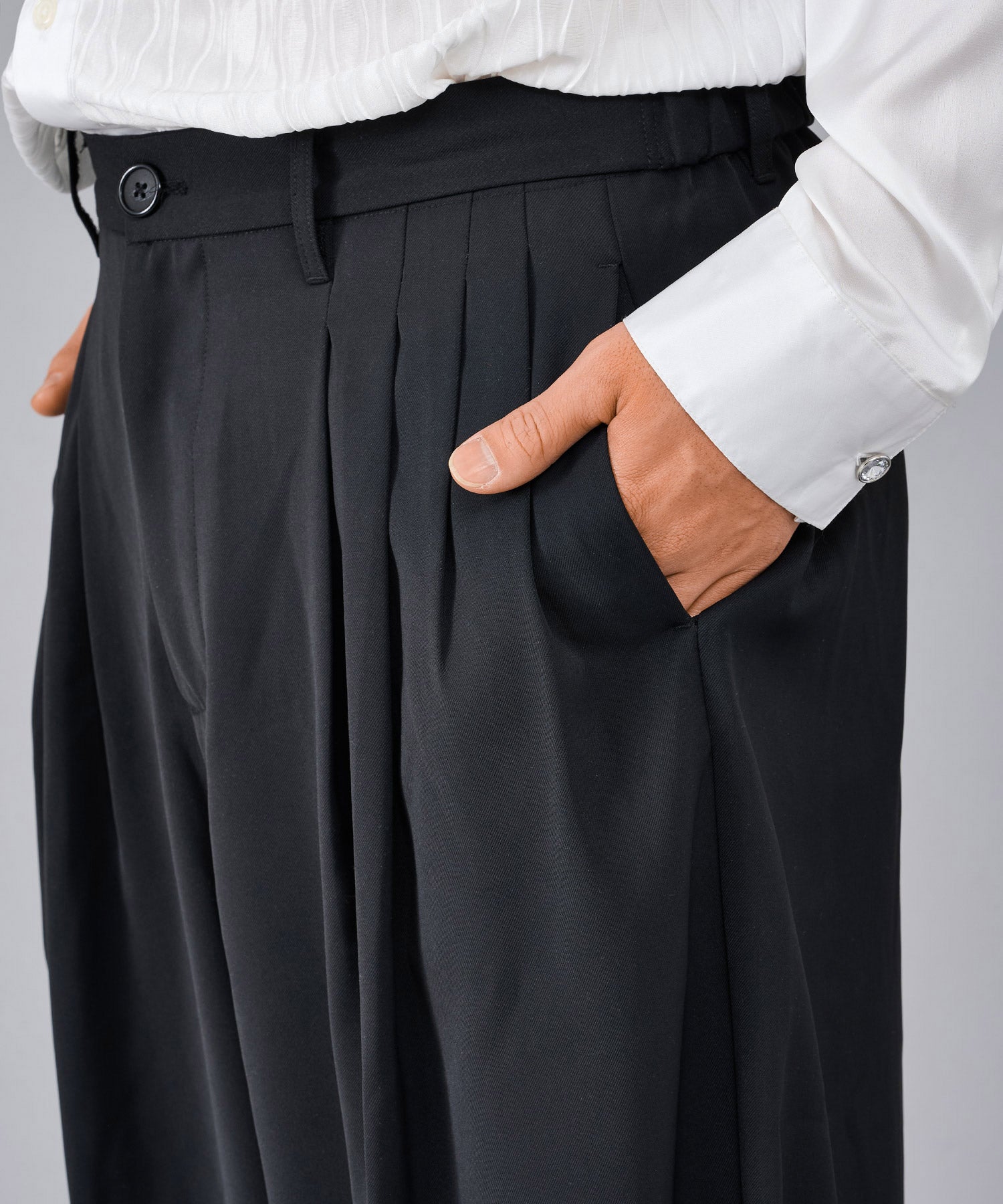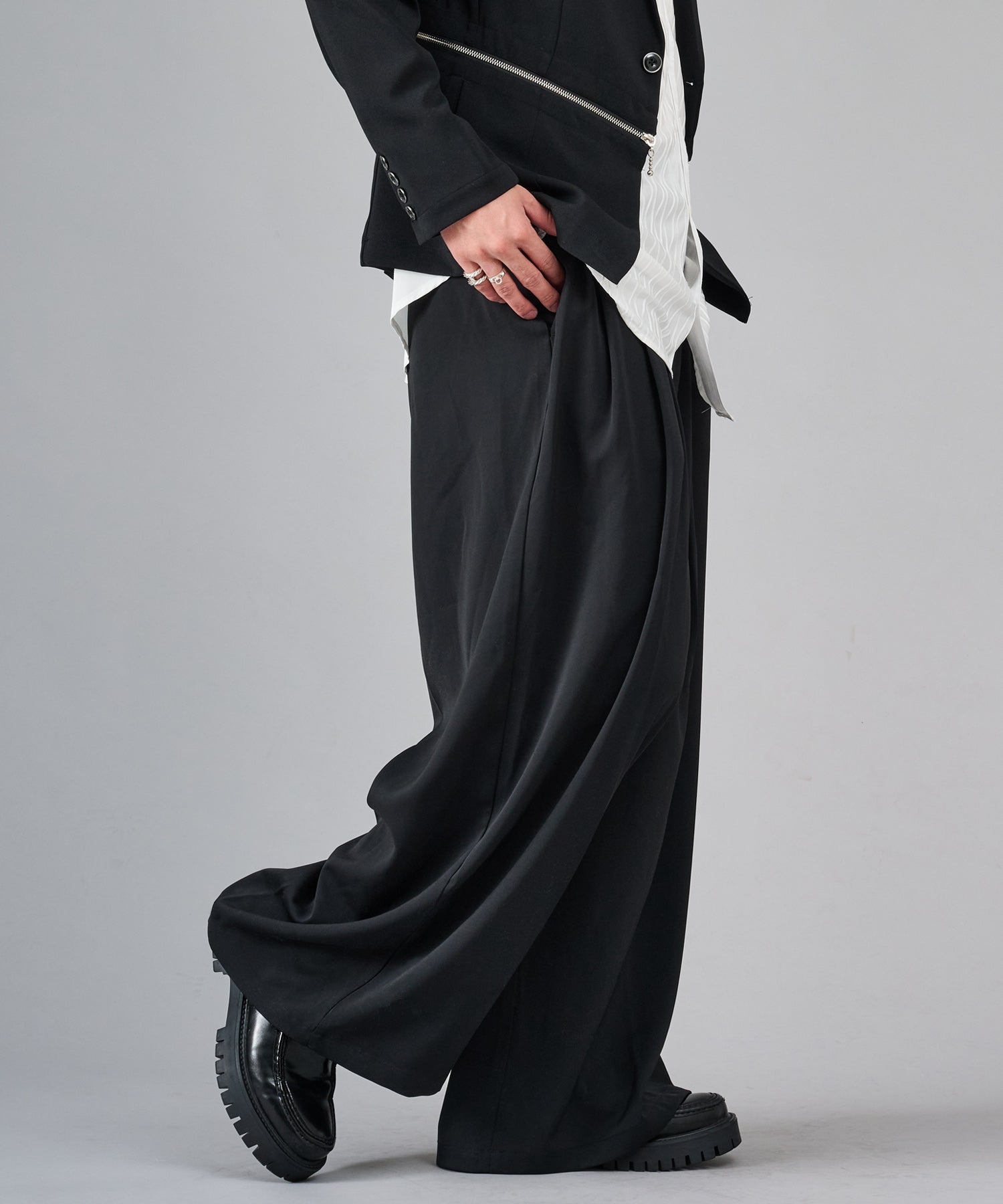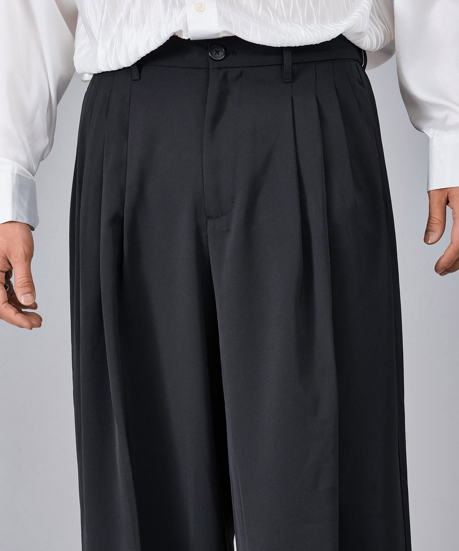履き心地もリラックスできるワイドシルエットは、4タックにすることでウエスト周りをスッキリ見せ、ハイウエストな仕様が脚長効果を高めるデザインです