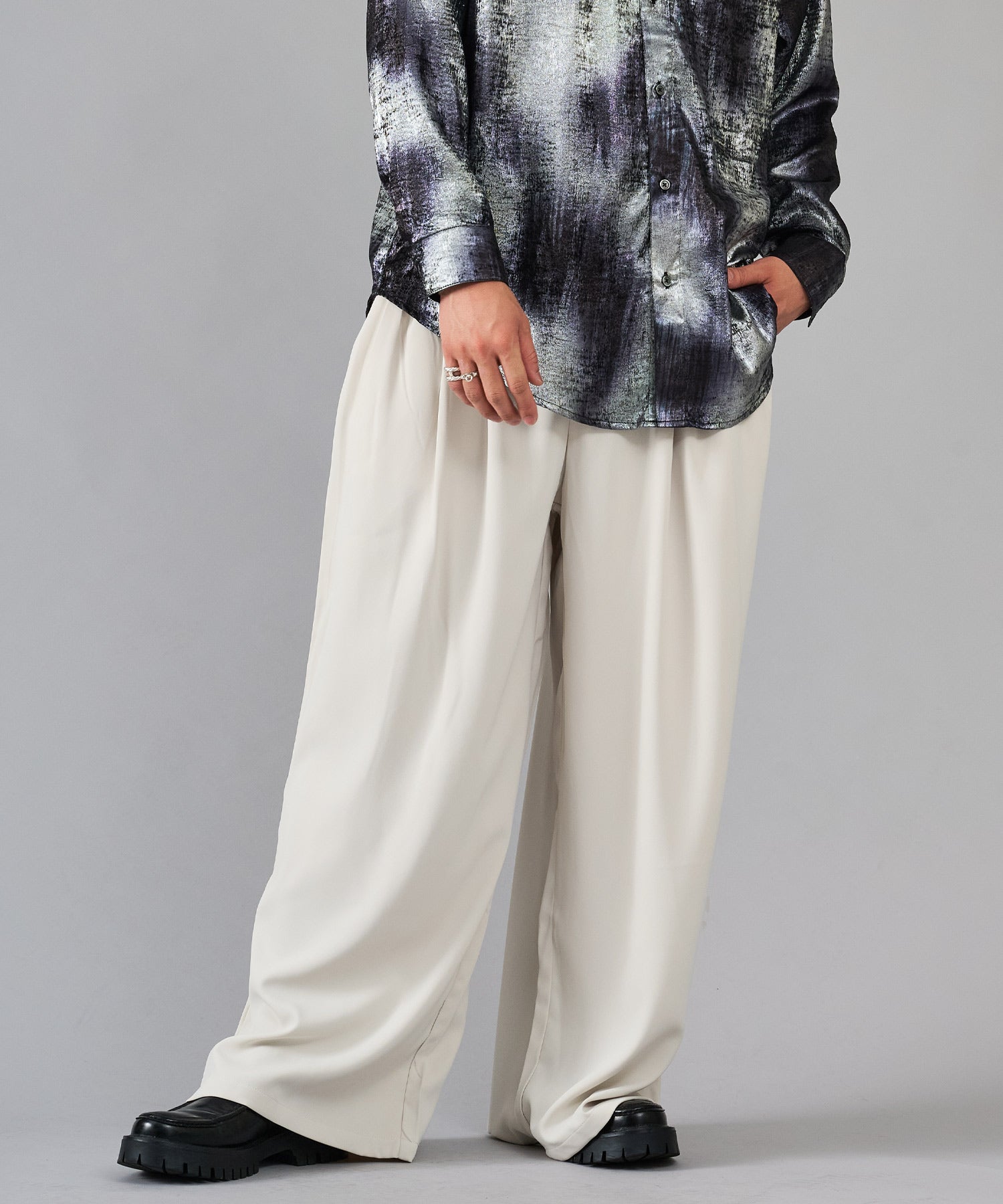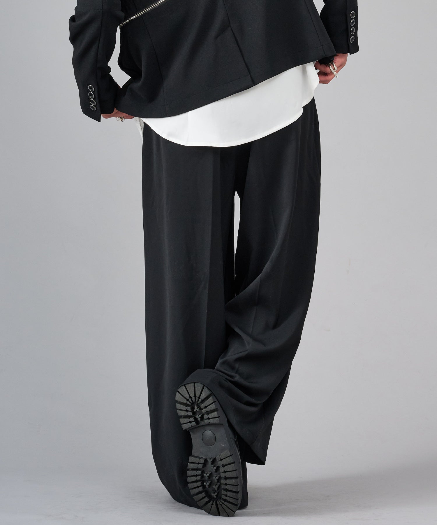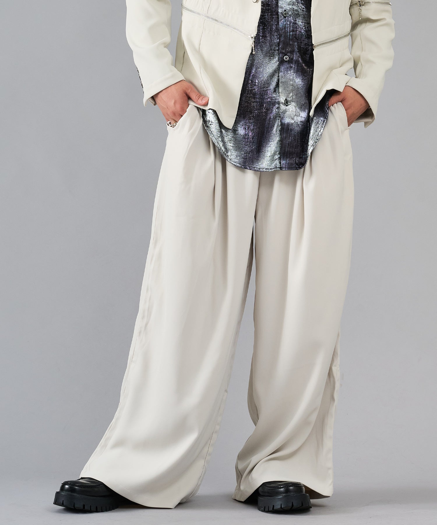 履き心地もリラックスできるワイドシルエットは、4タックにすることでウエスト周りをスッキリ見せ、ハイウエストな仕様が脚長効果を高めるデザインです
