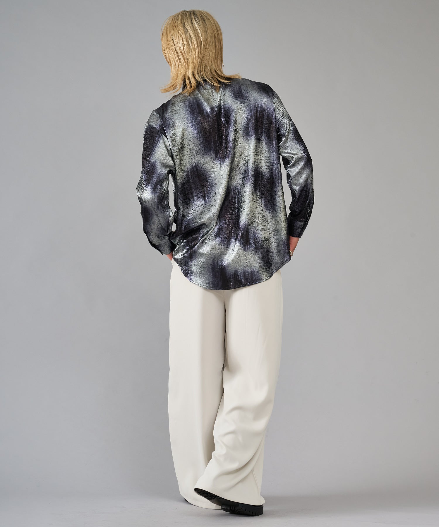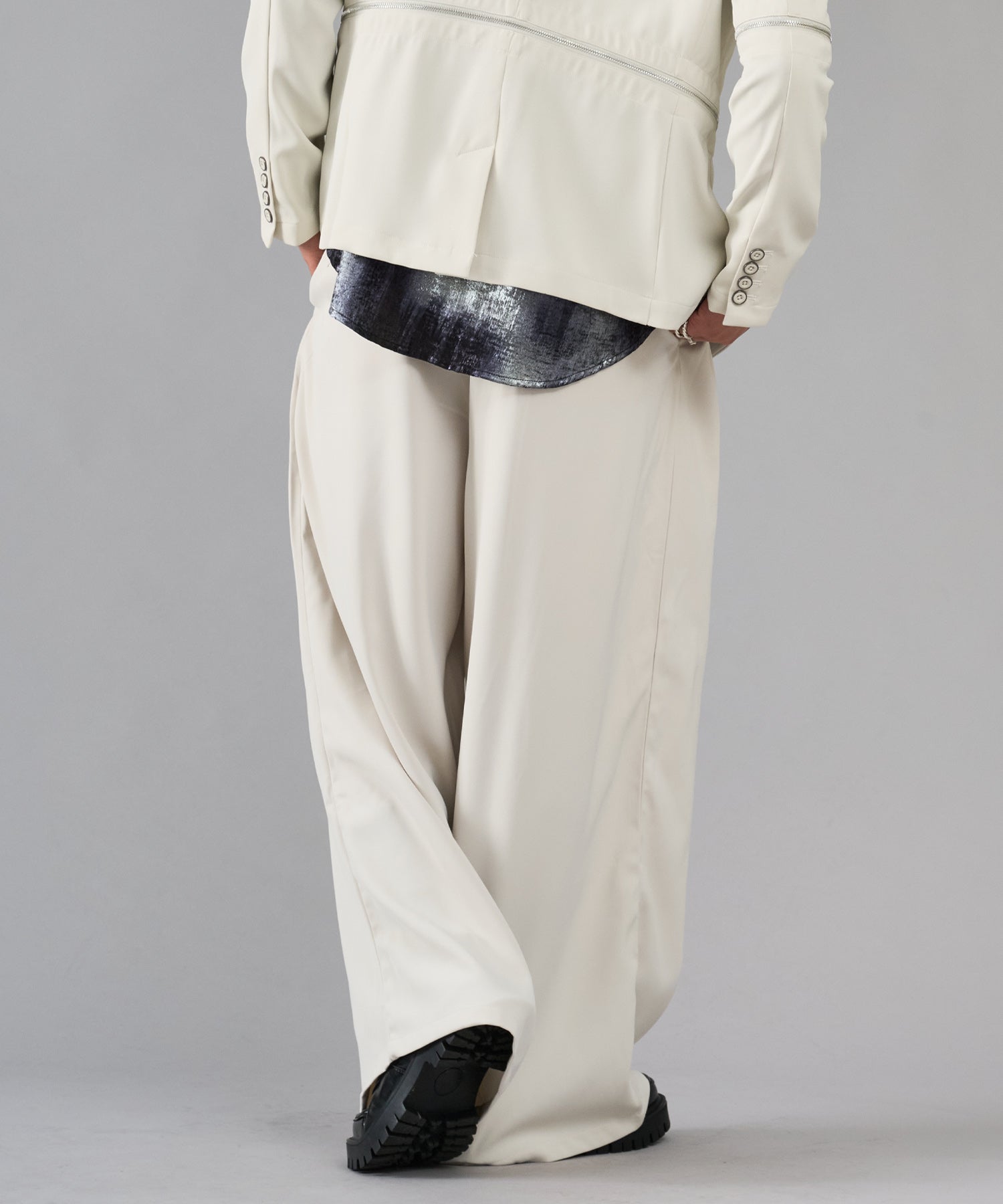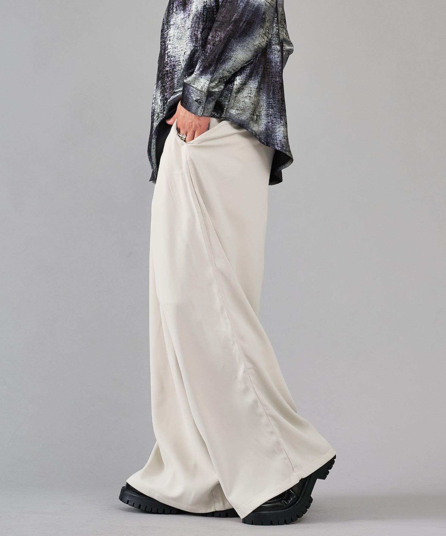 ドレープ性のあるポリエステル素材を使用しワイドなシルエットがよりエレガントに表現されるとともに、イージーケアで扱いやすい素材です