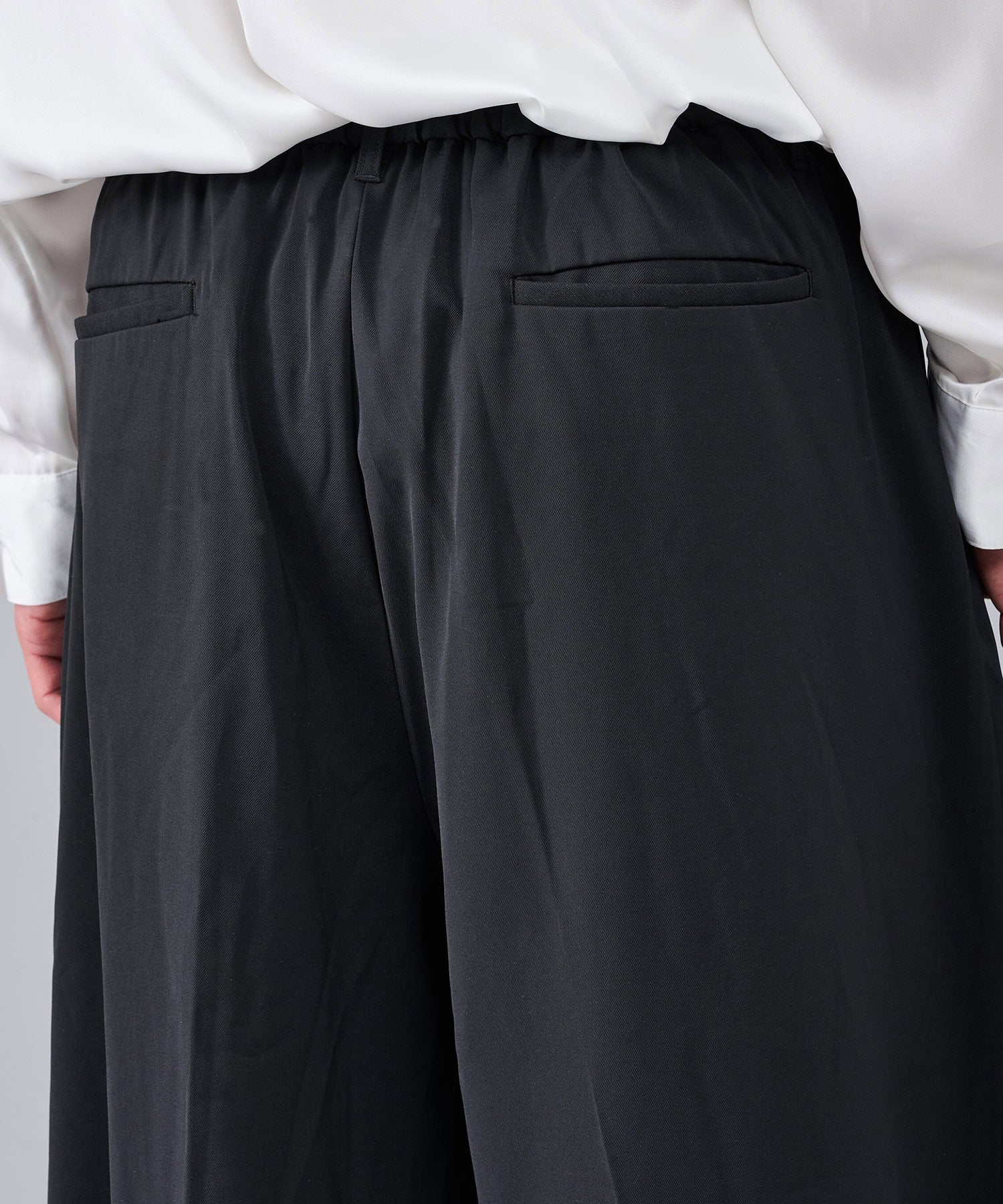ベルトループもあるスラックス仕様ながら、ウエストバックはシャーリングによってリラックスして穿けます