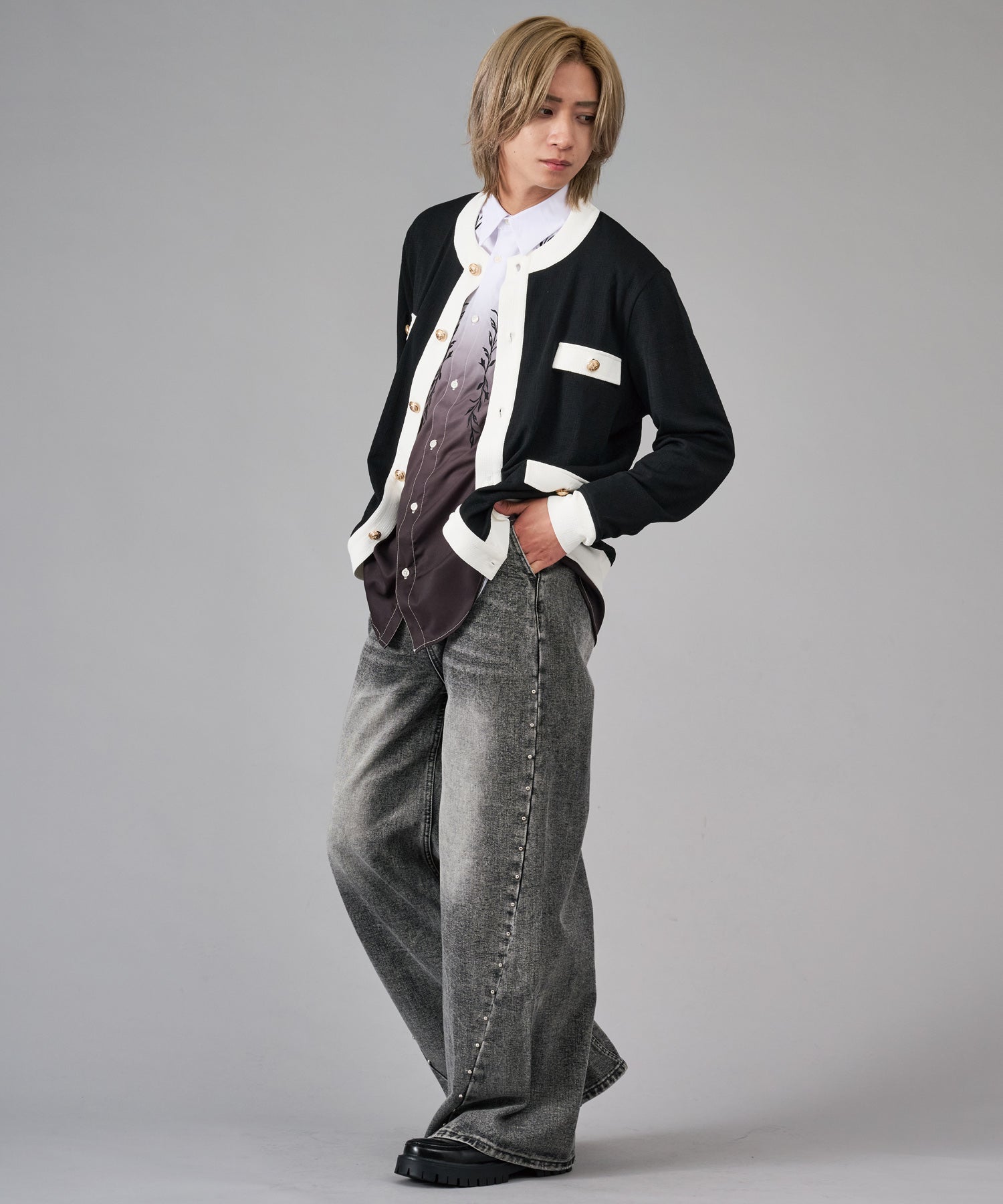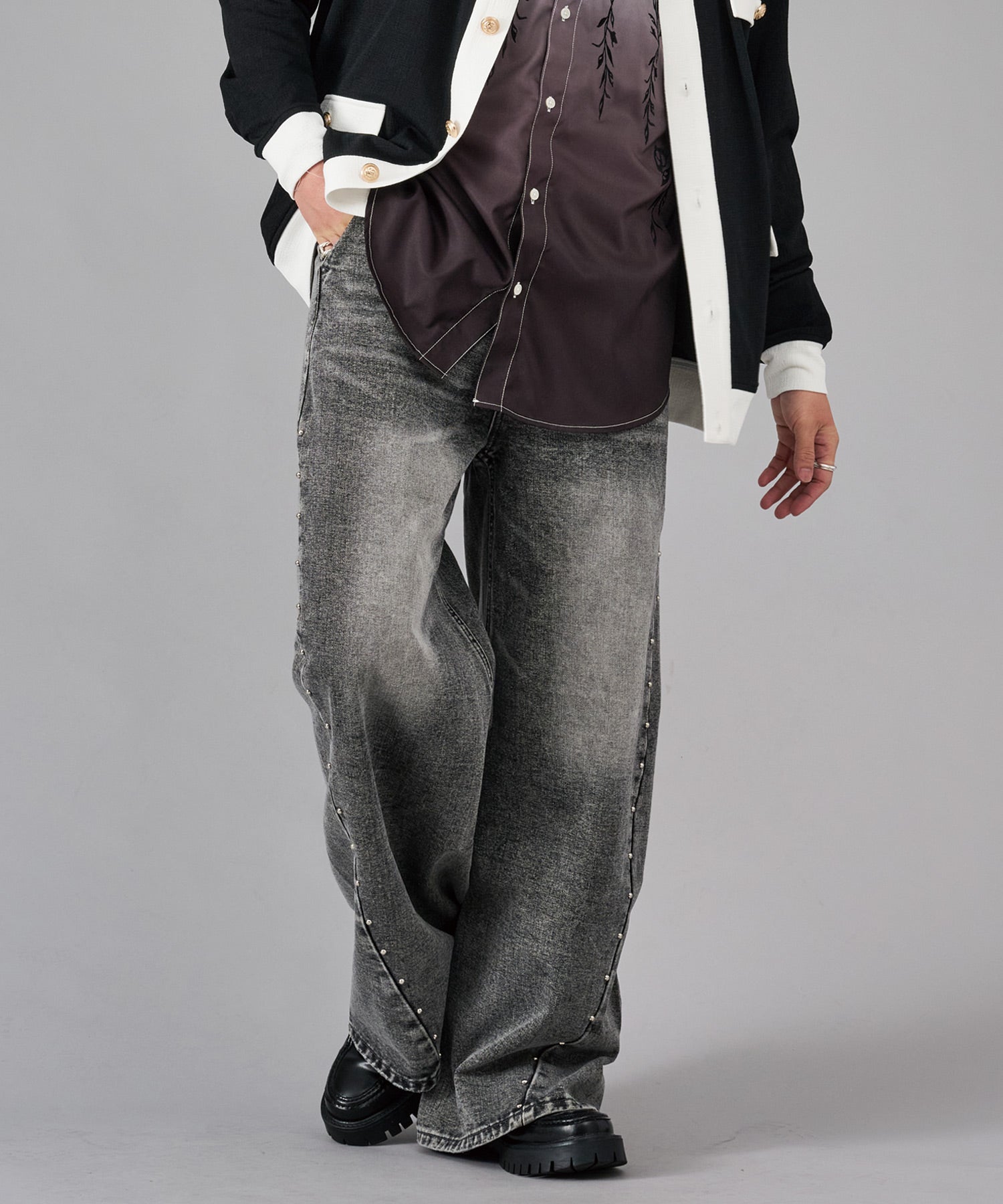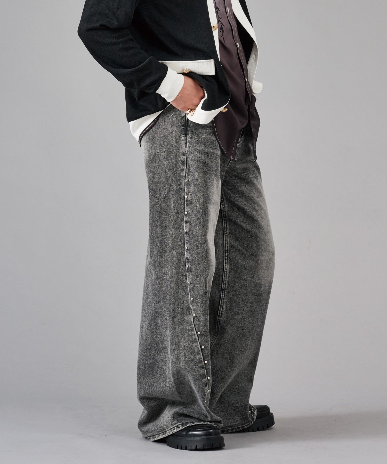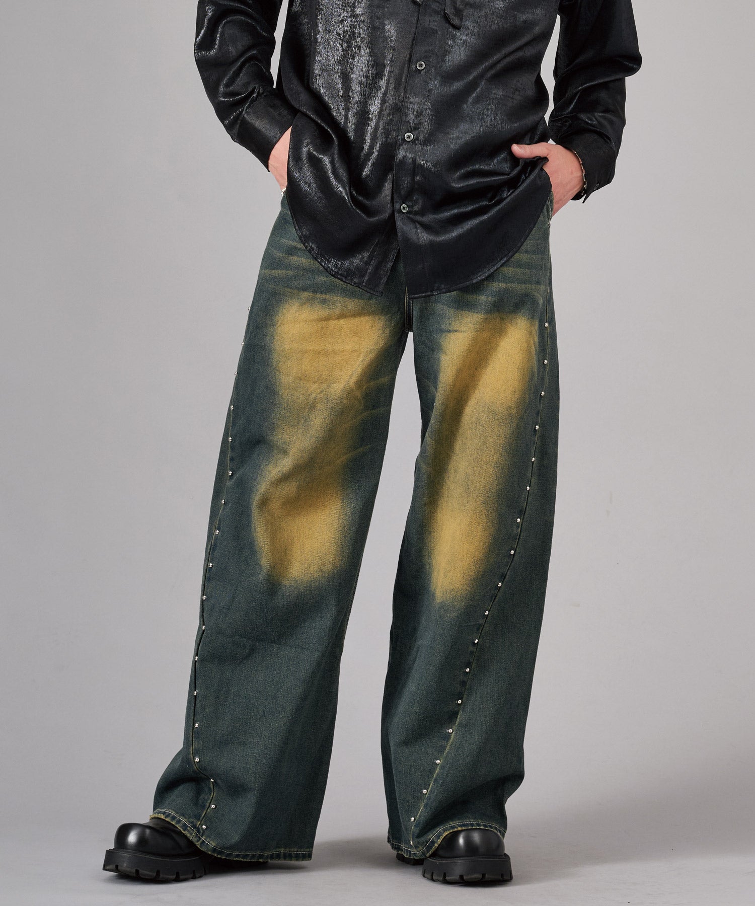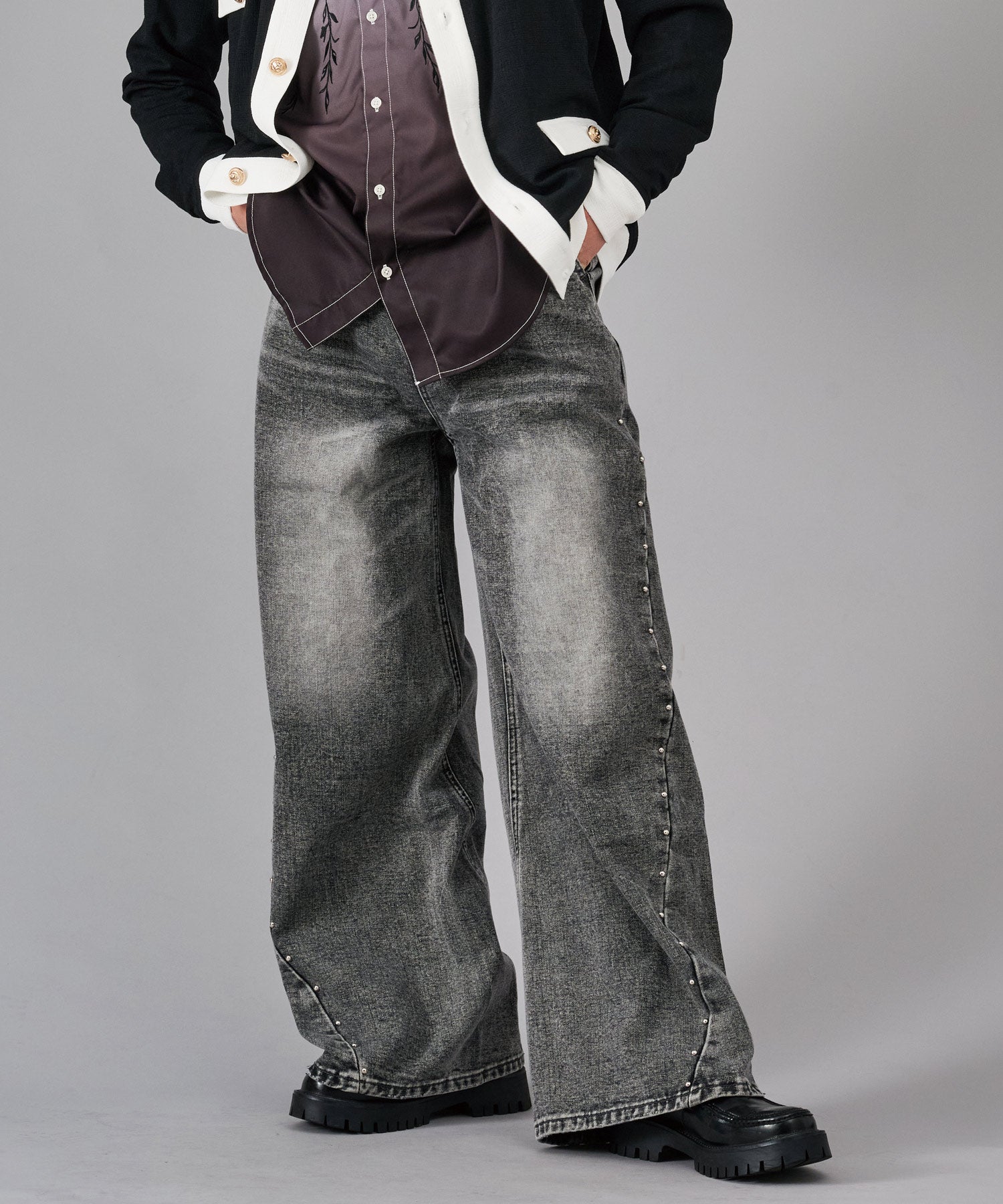 スタッズがクールなワイドバギーデニムです