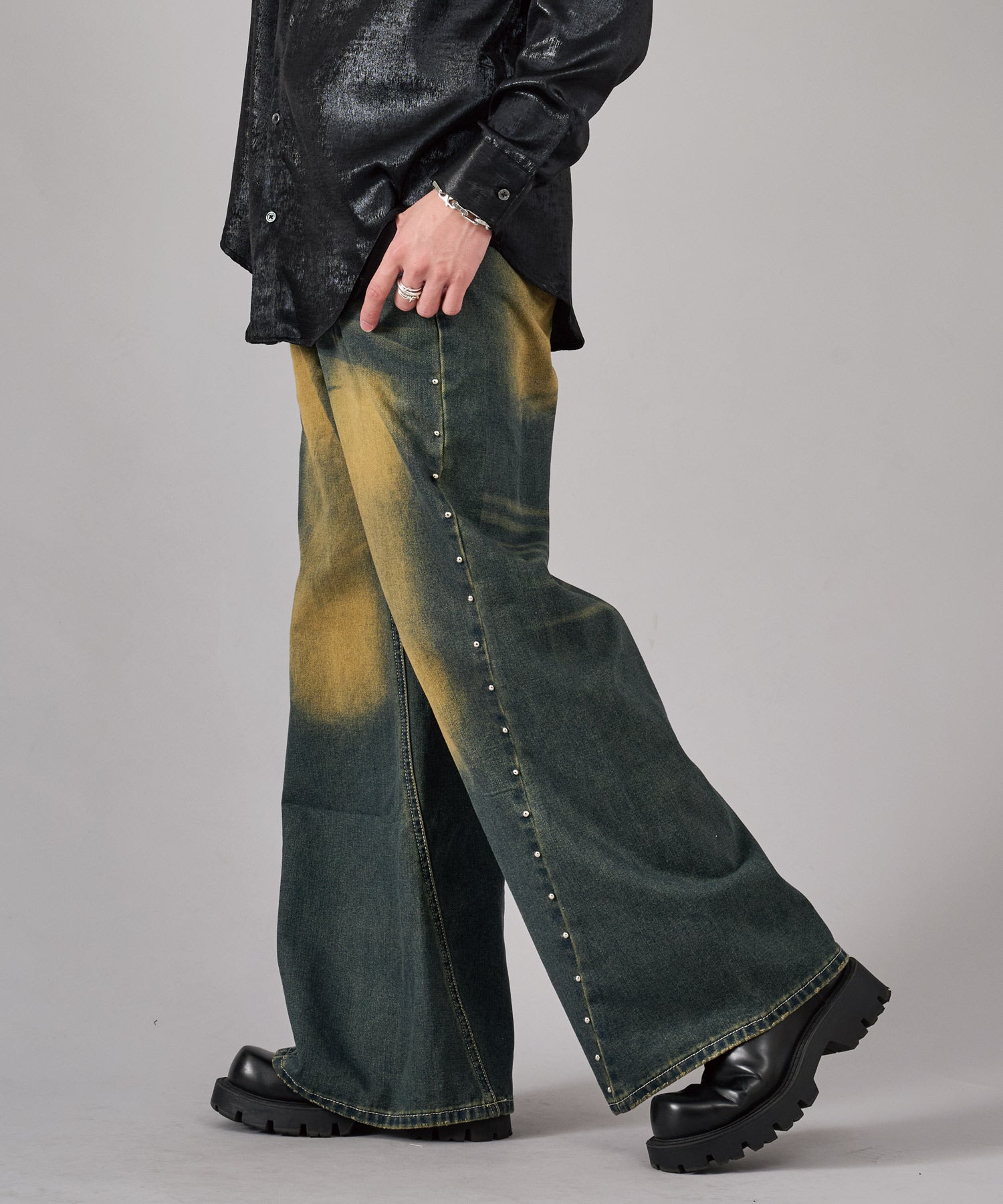 サイドポケットから裾まで繋がったスタッズがデニムの雰囲気をより高めてくれます
