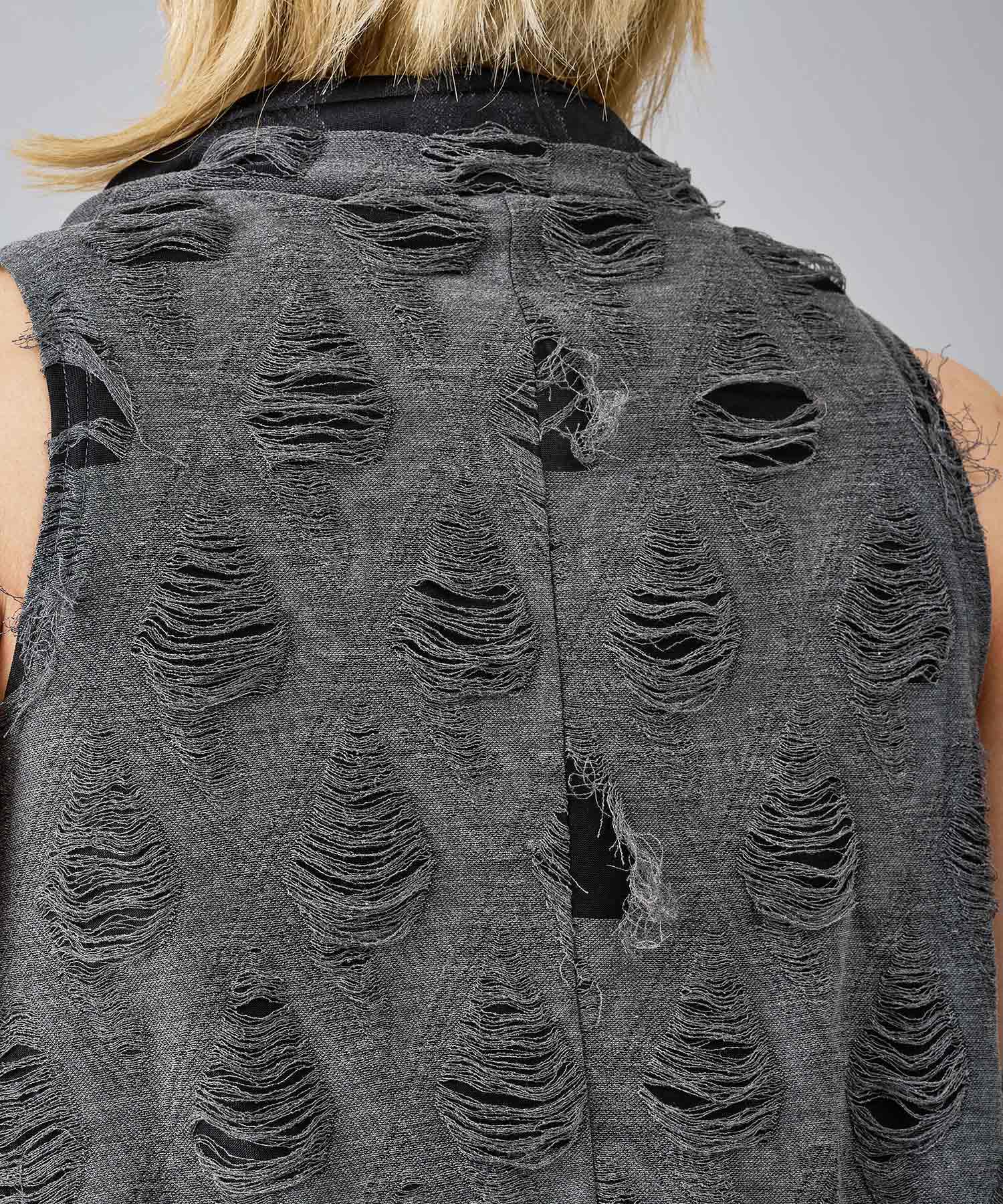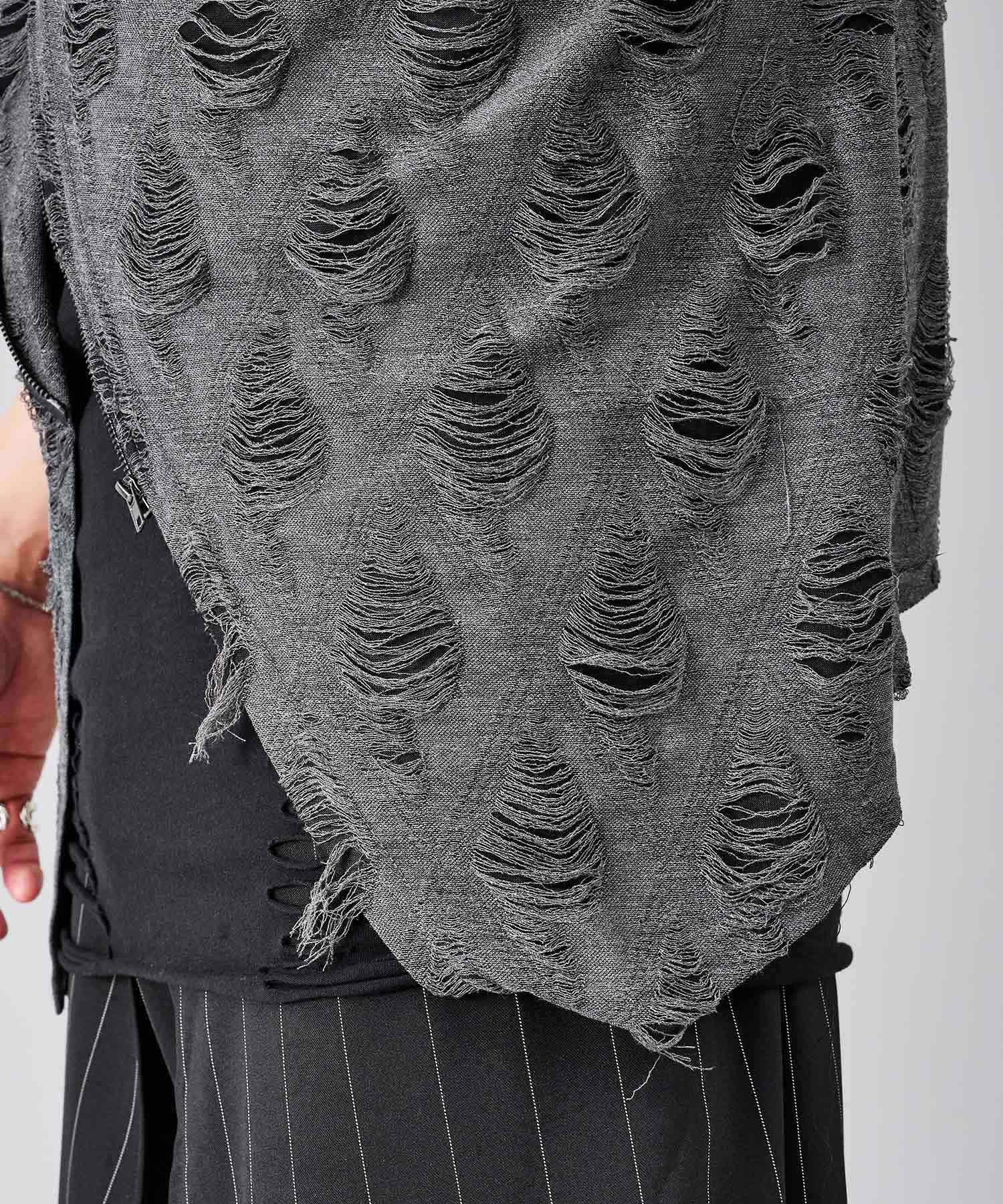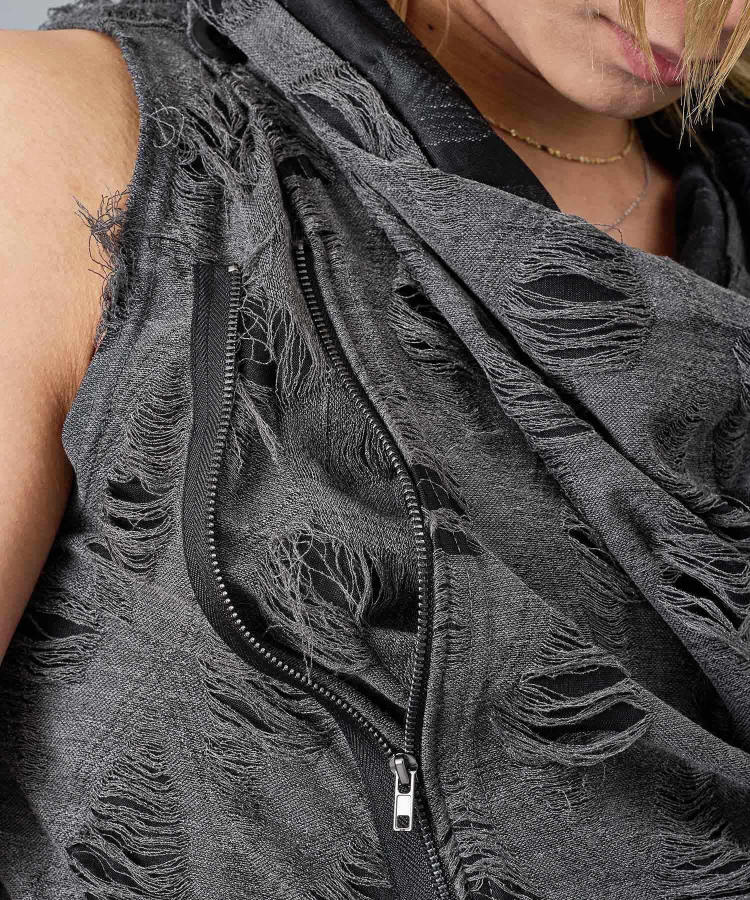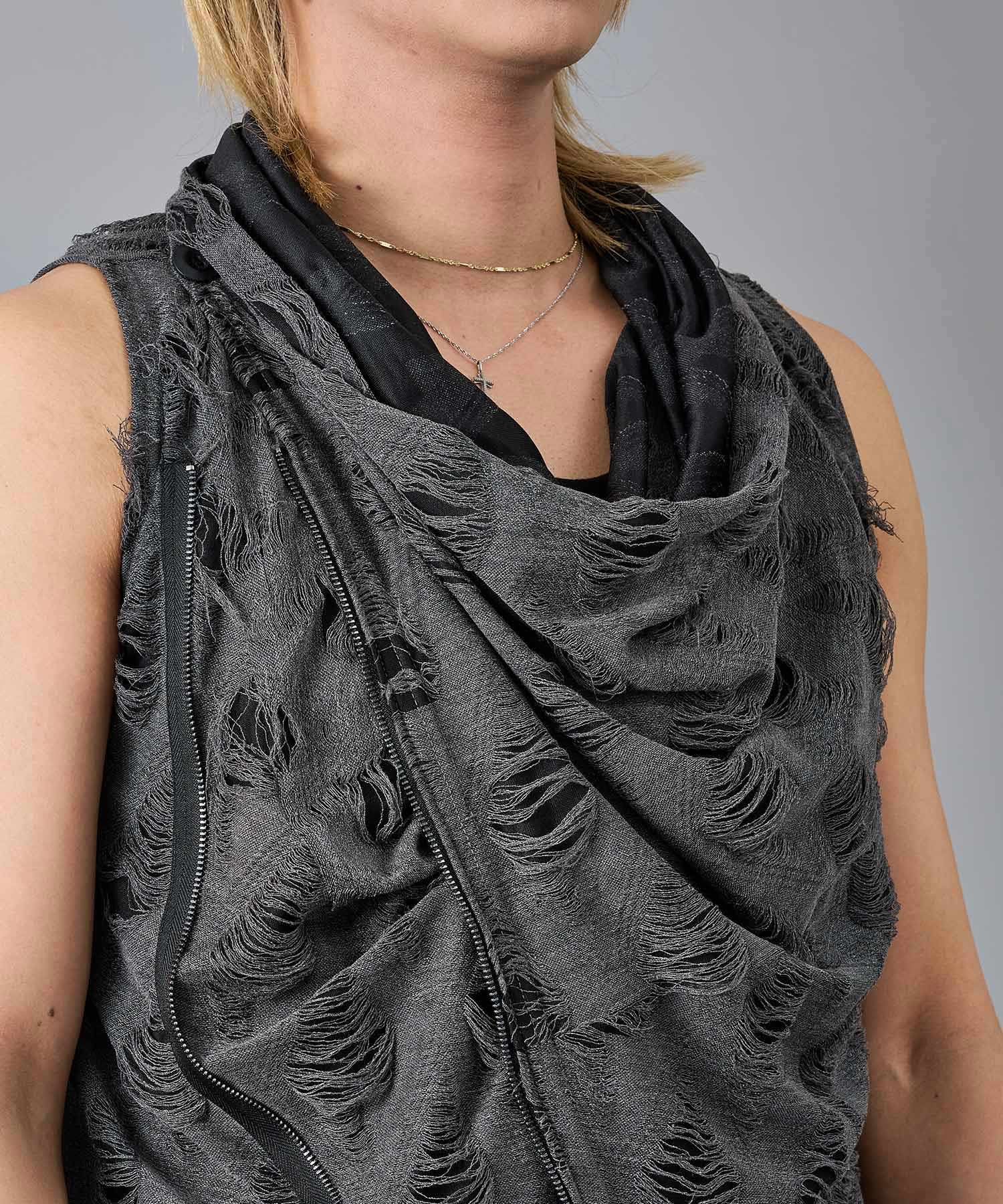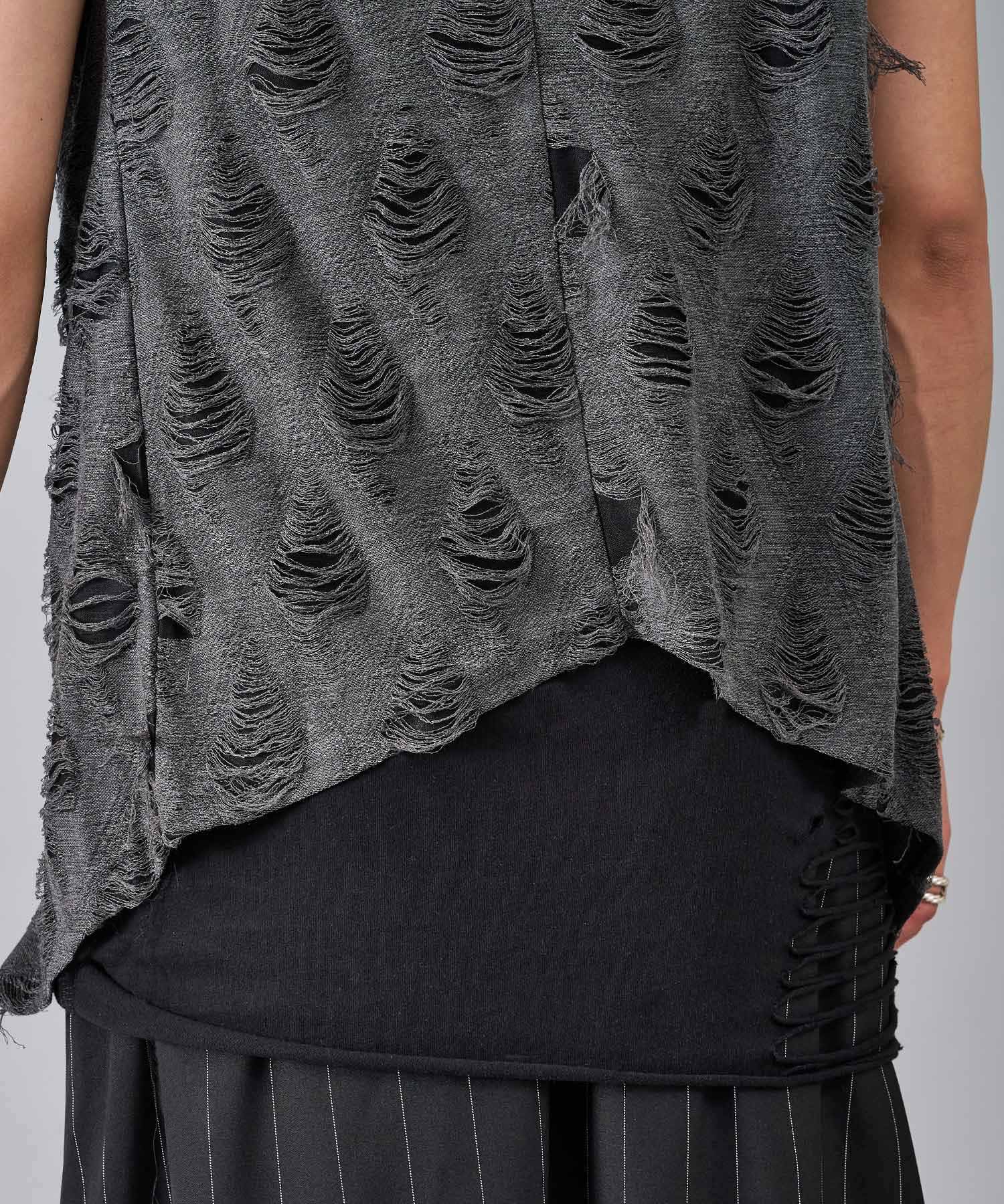 レーヨン素材によって柔らかなタッチとドレープを演出し、グランジ風のダメージ加工がアクセント