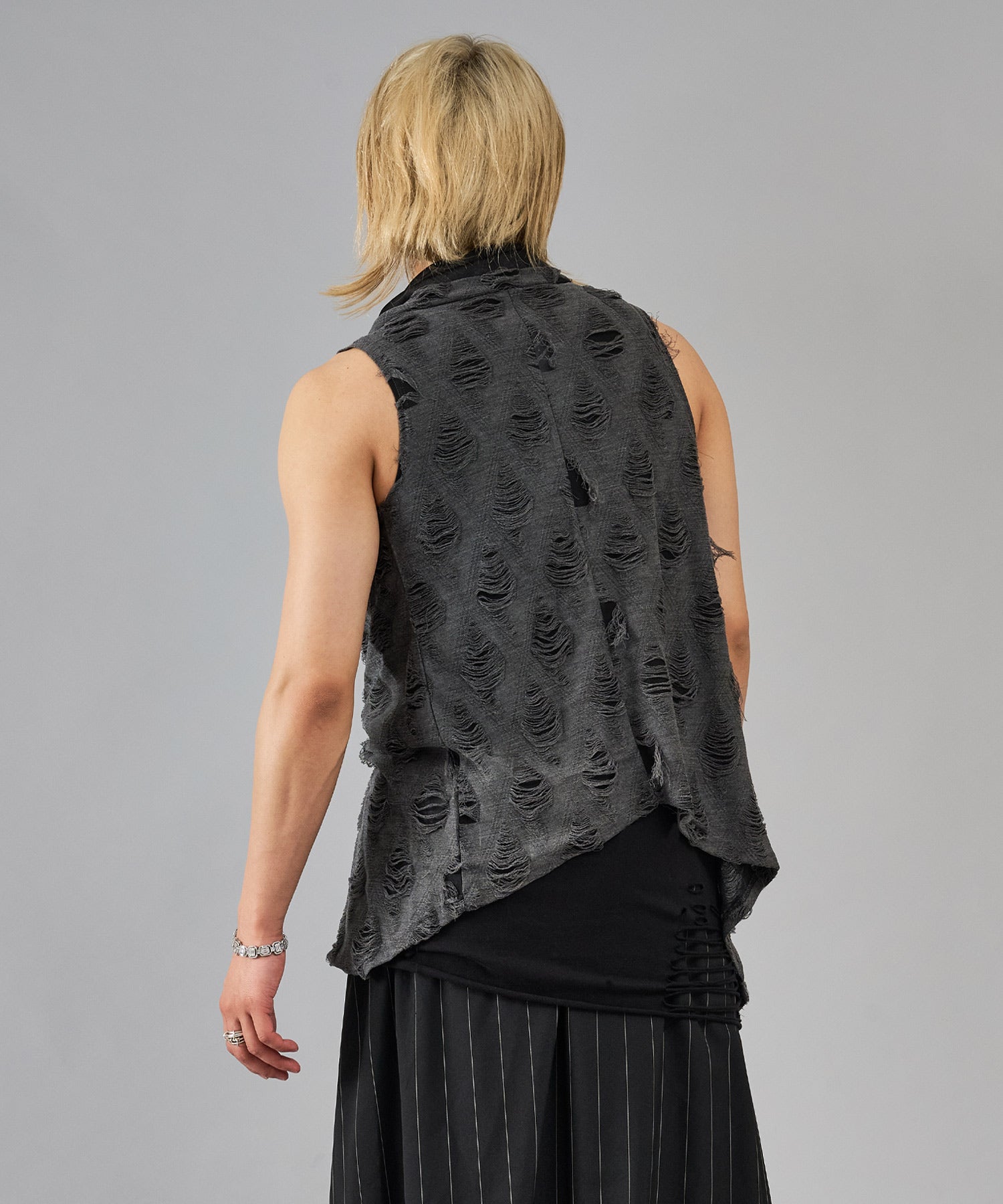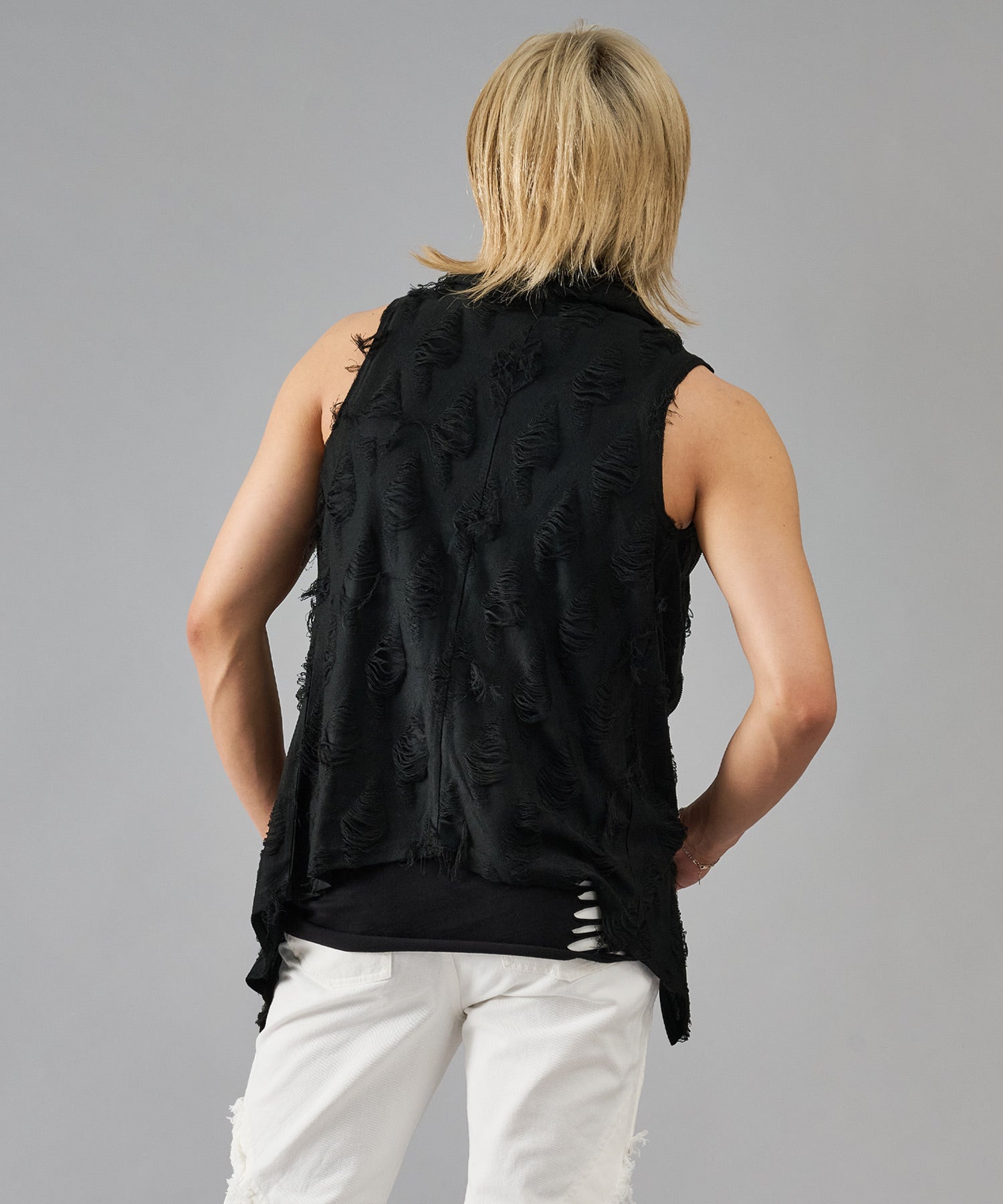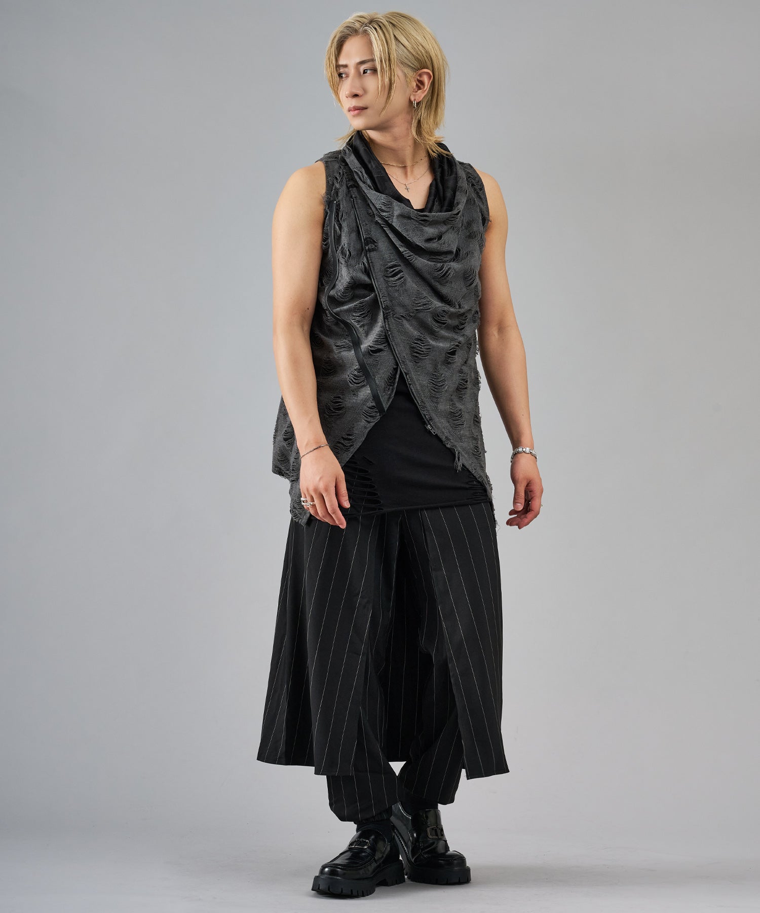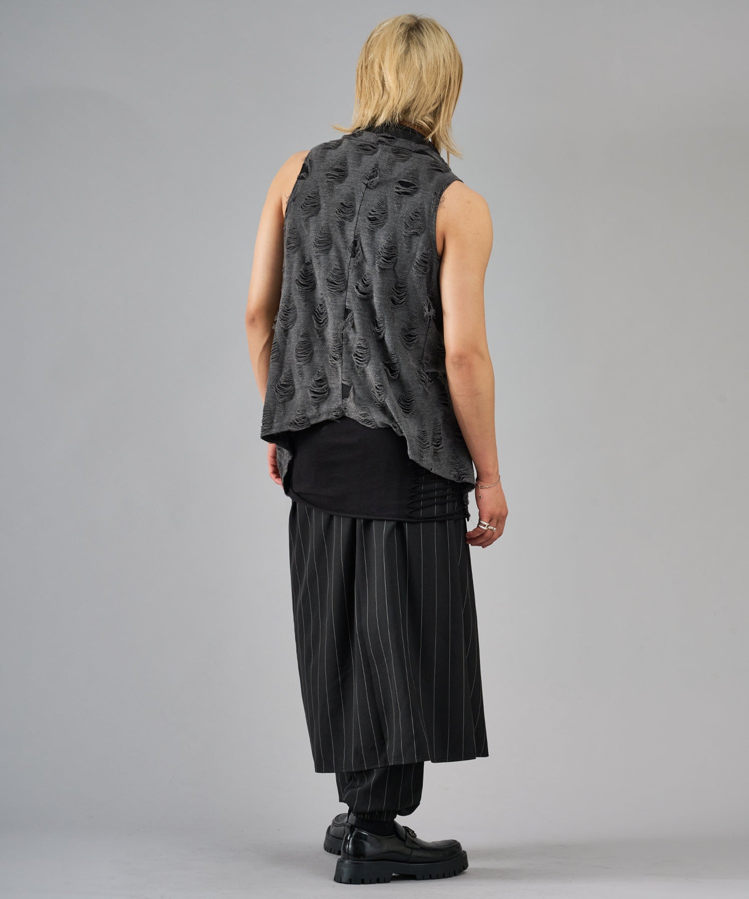 レーヨン素材によって柔らかなタッチとドレープを演出し、グランジ風のダメージ加工がアクセント