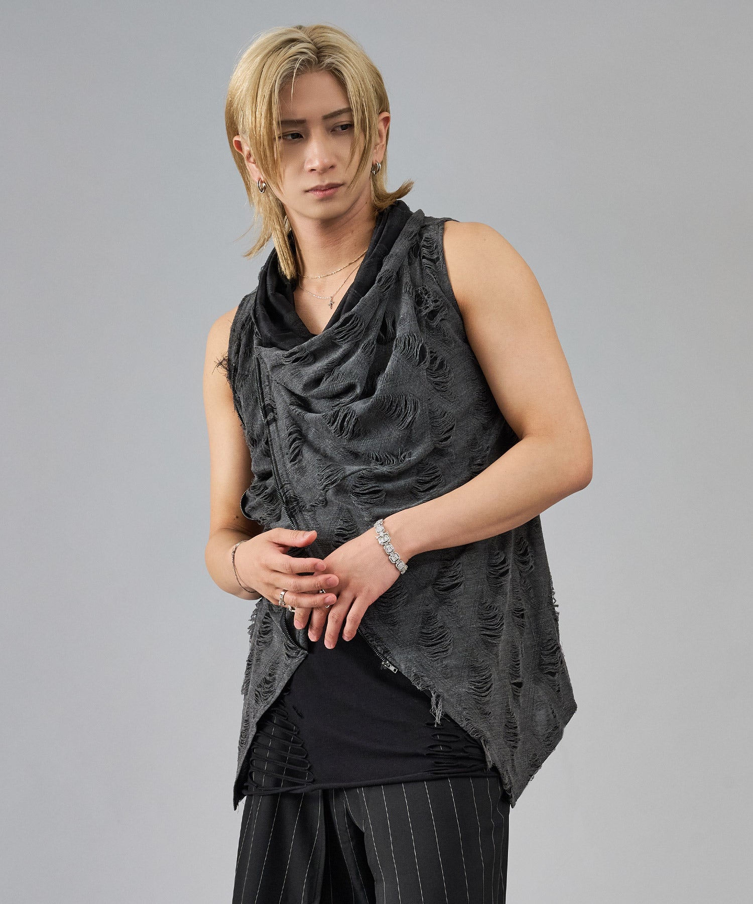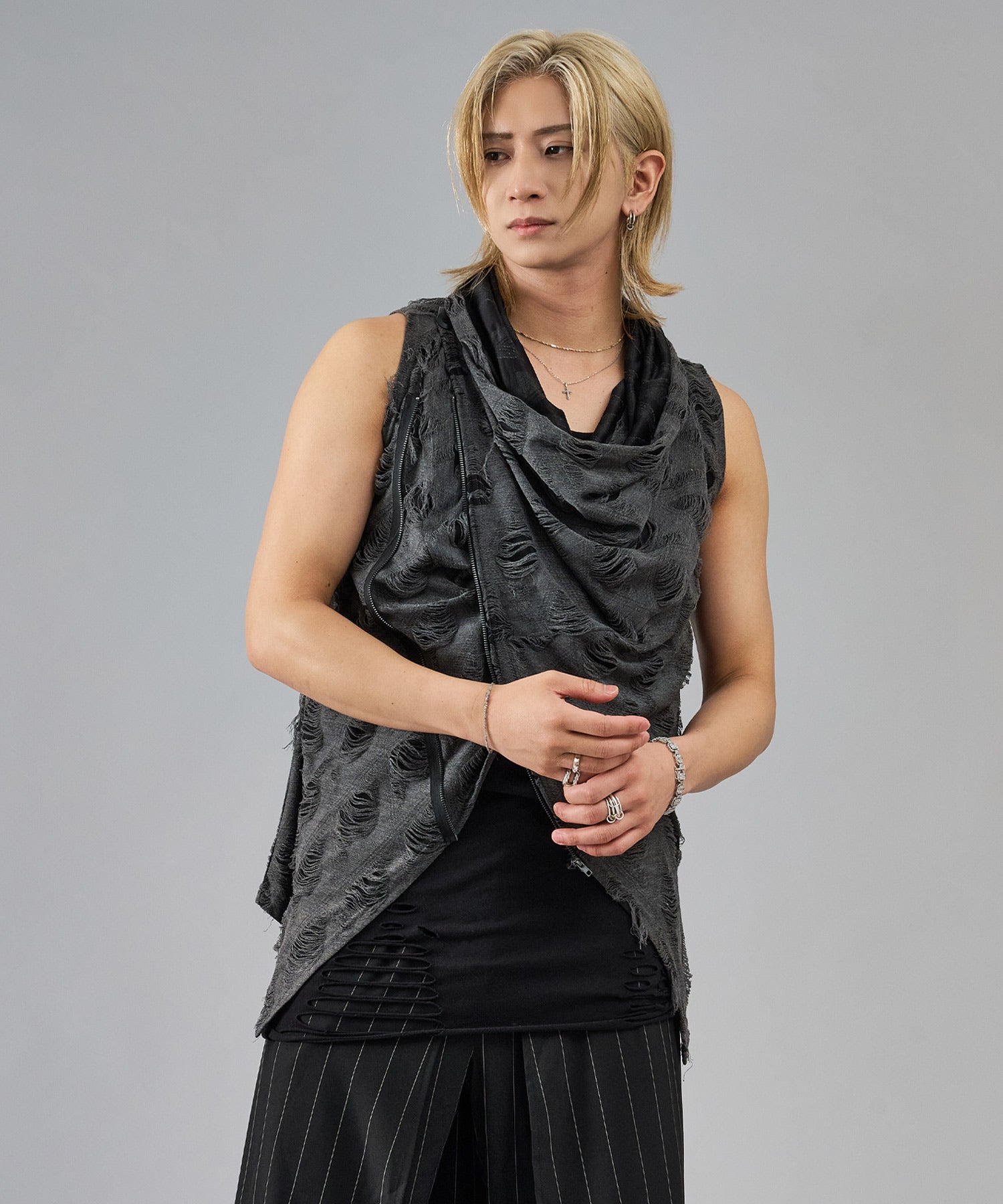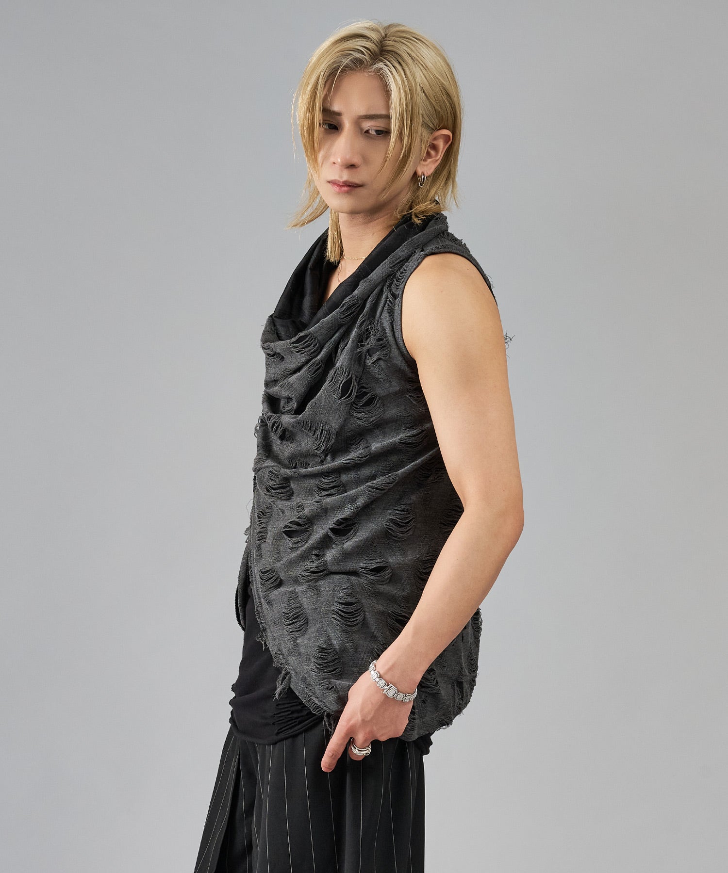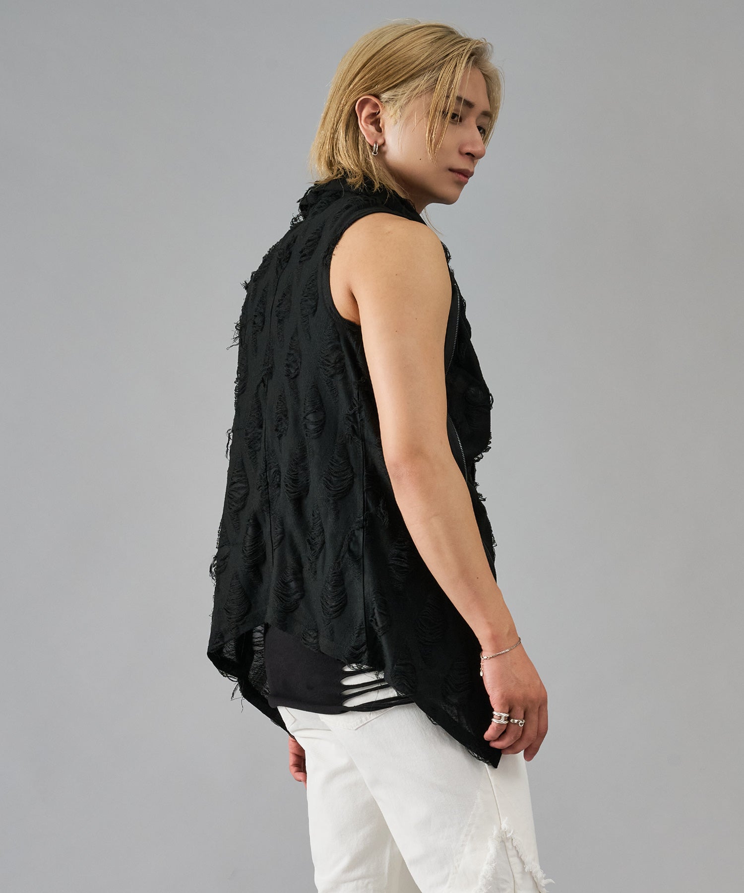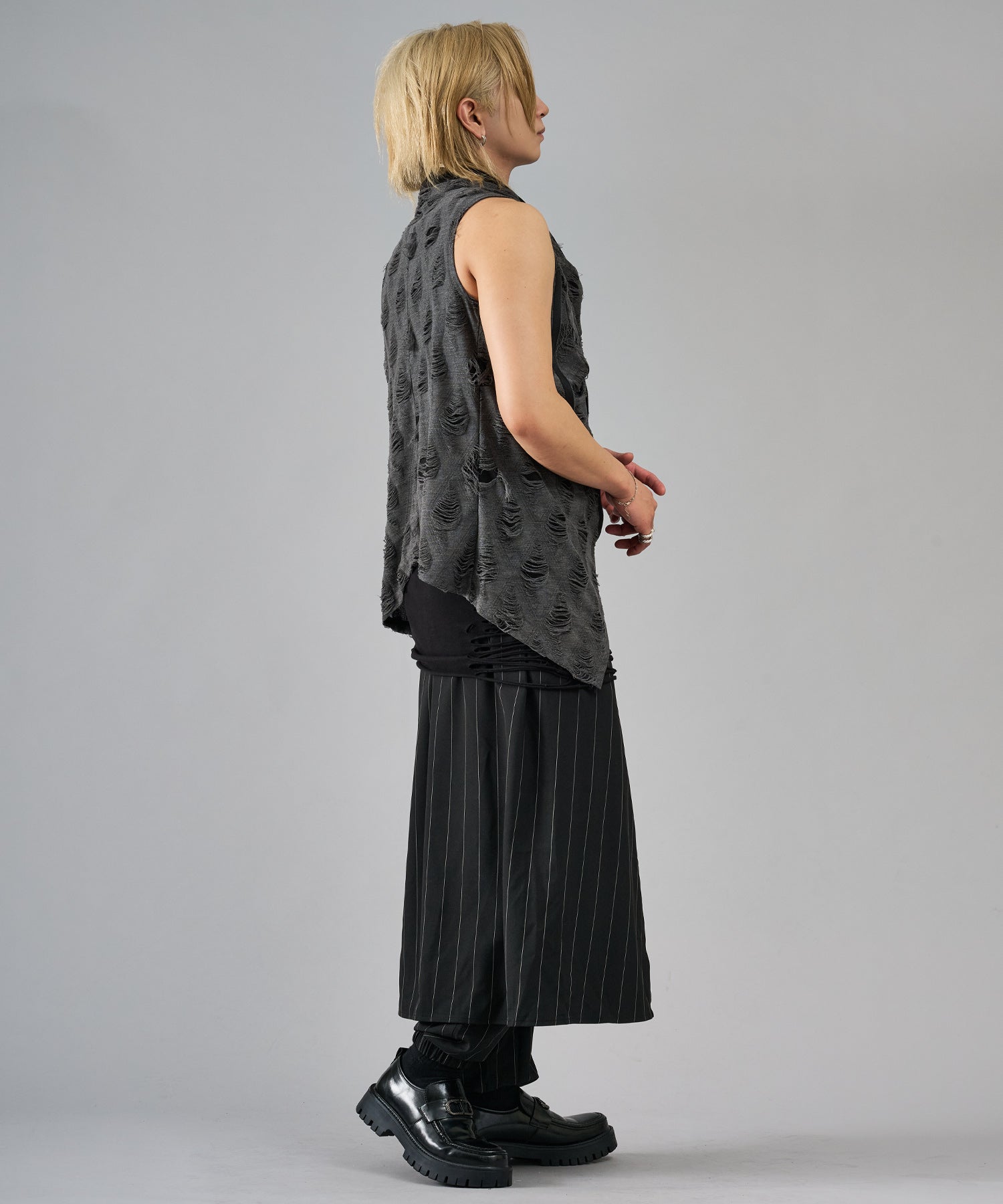 レーヨン素材によって柔らかなタッチとドレープを演出し、グランジ風のダメージ加工がアクセント