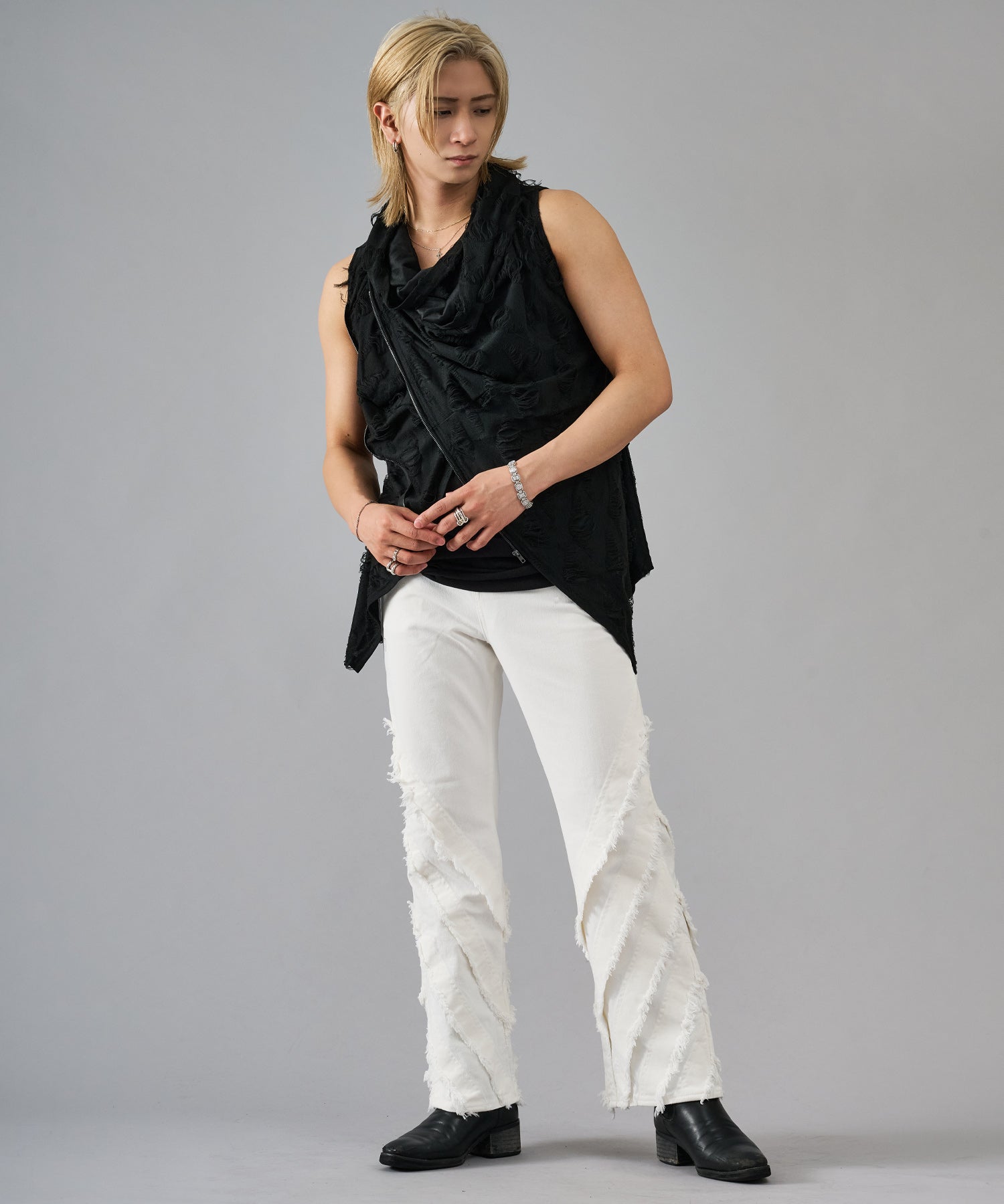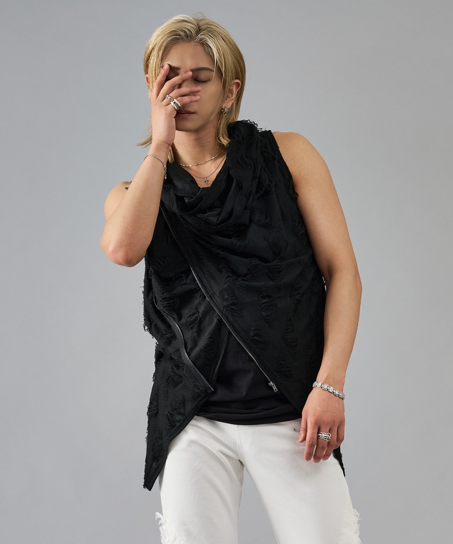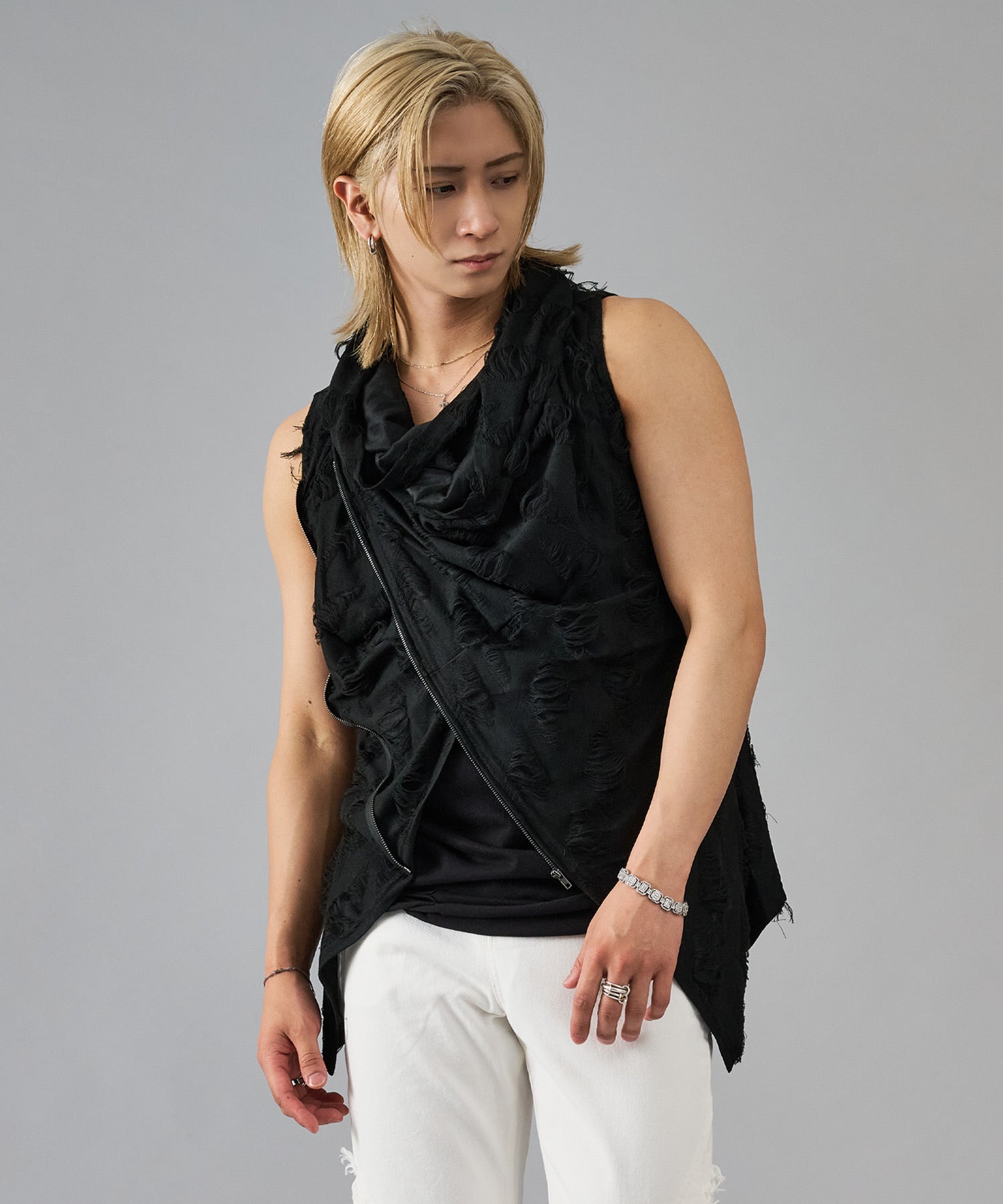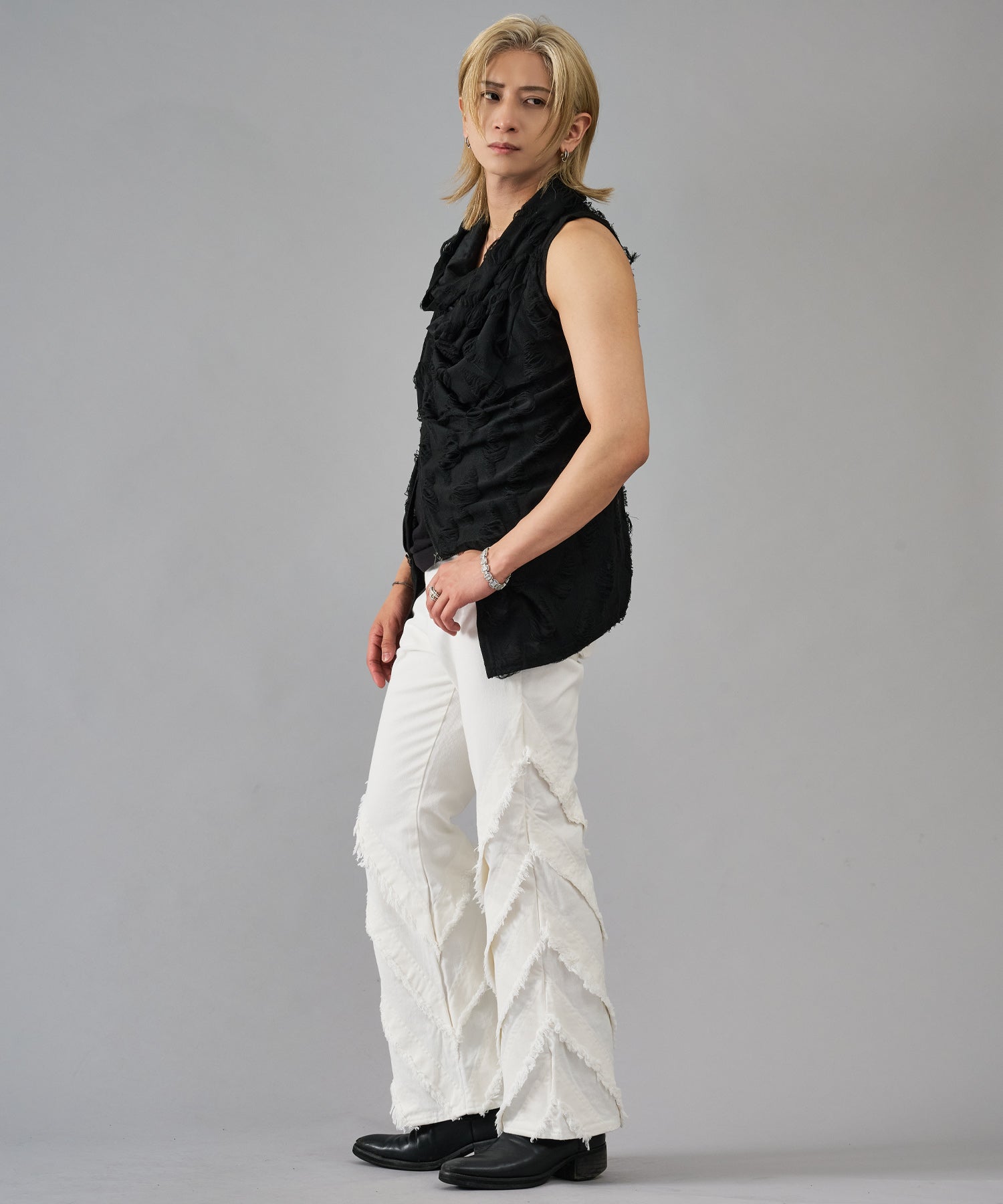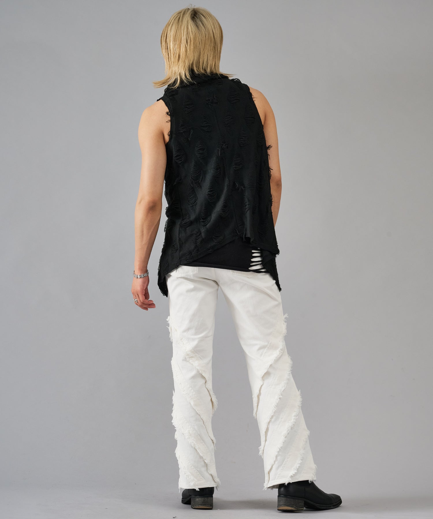 レーヨン素材によって柔らかなタッチとドレープを演出し、グランジ風のダメージ加工がアクセント