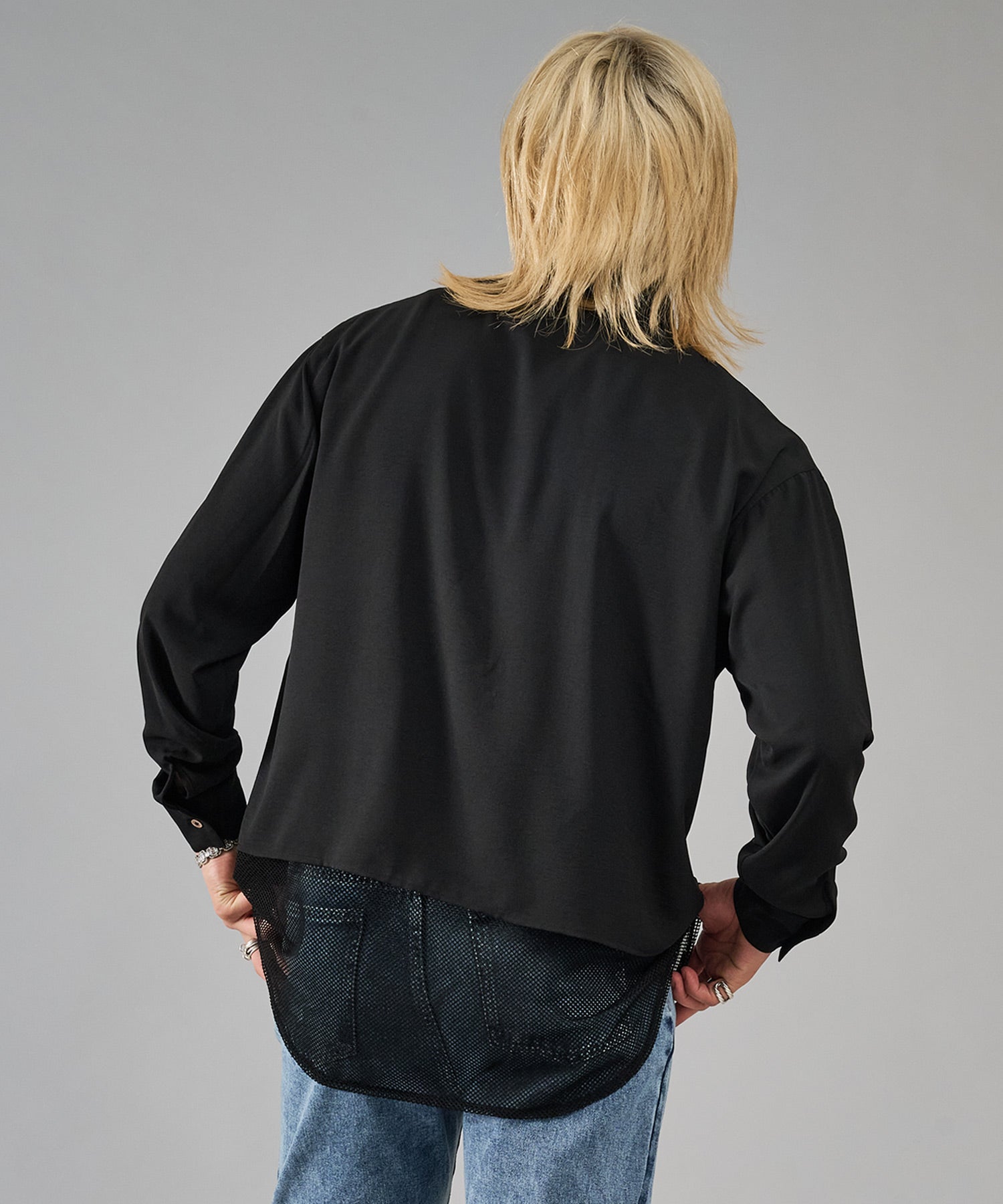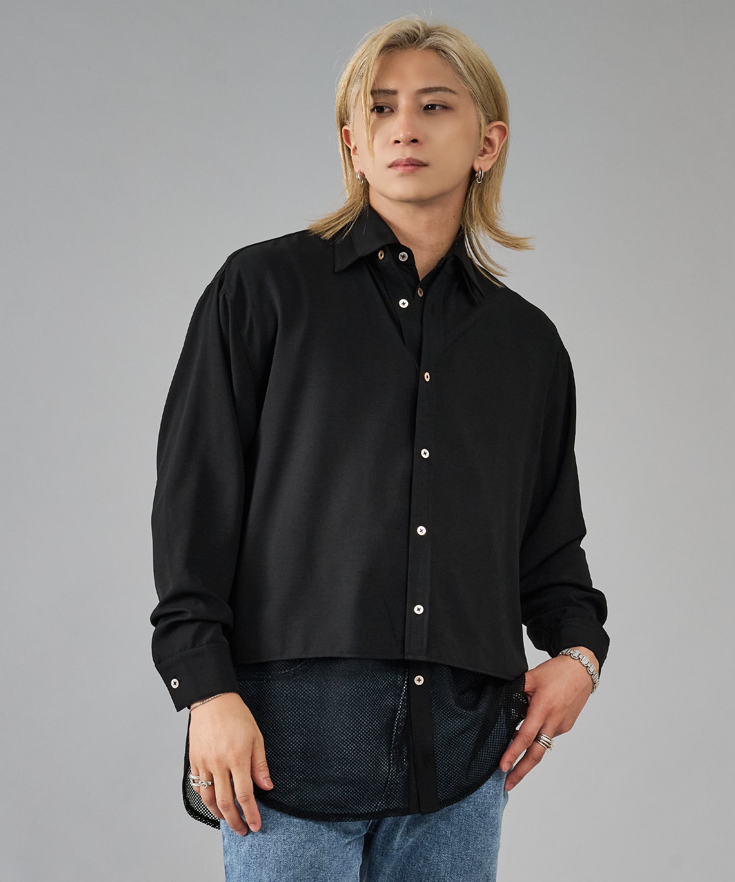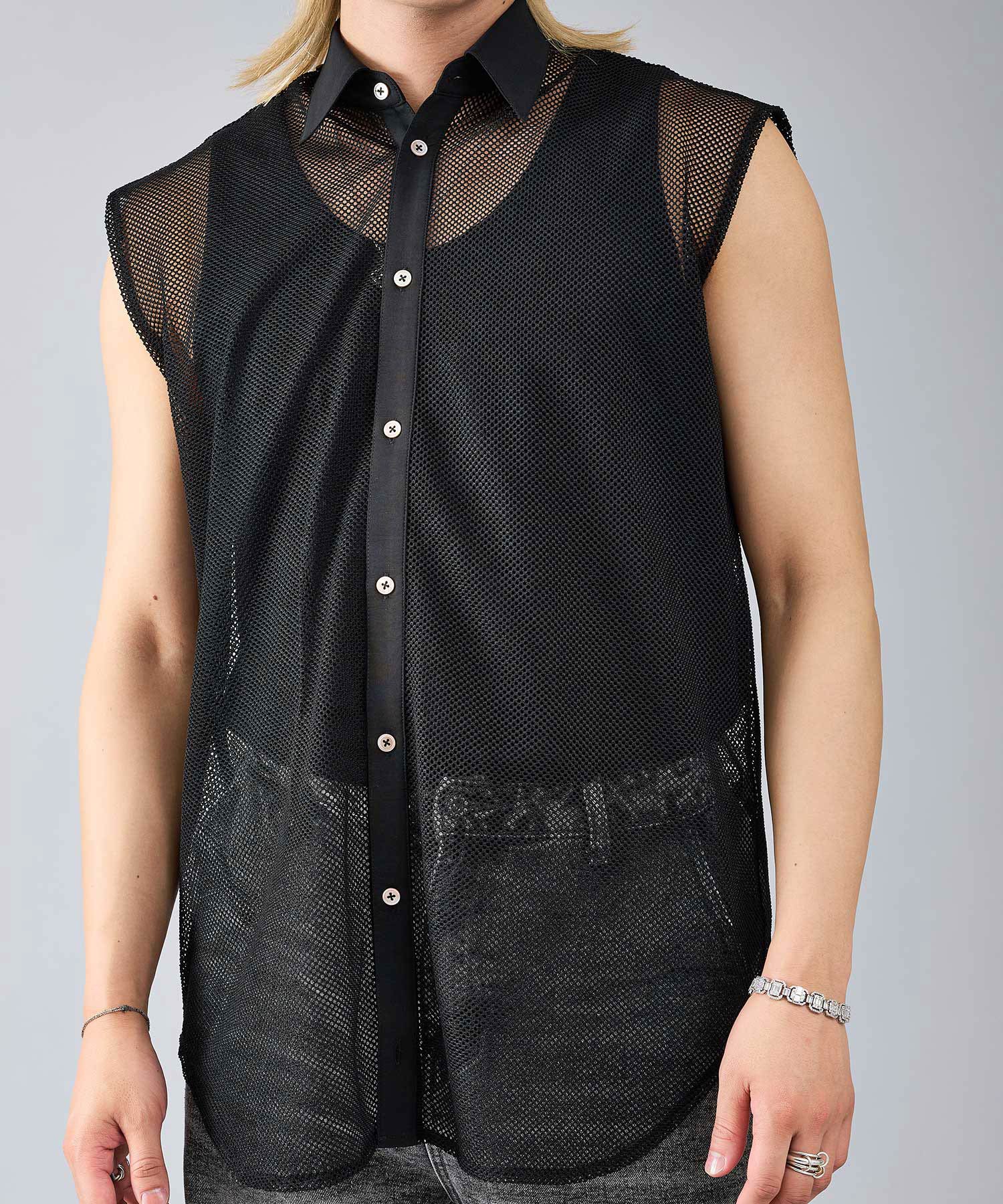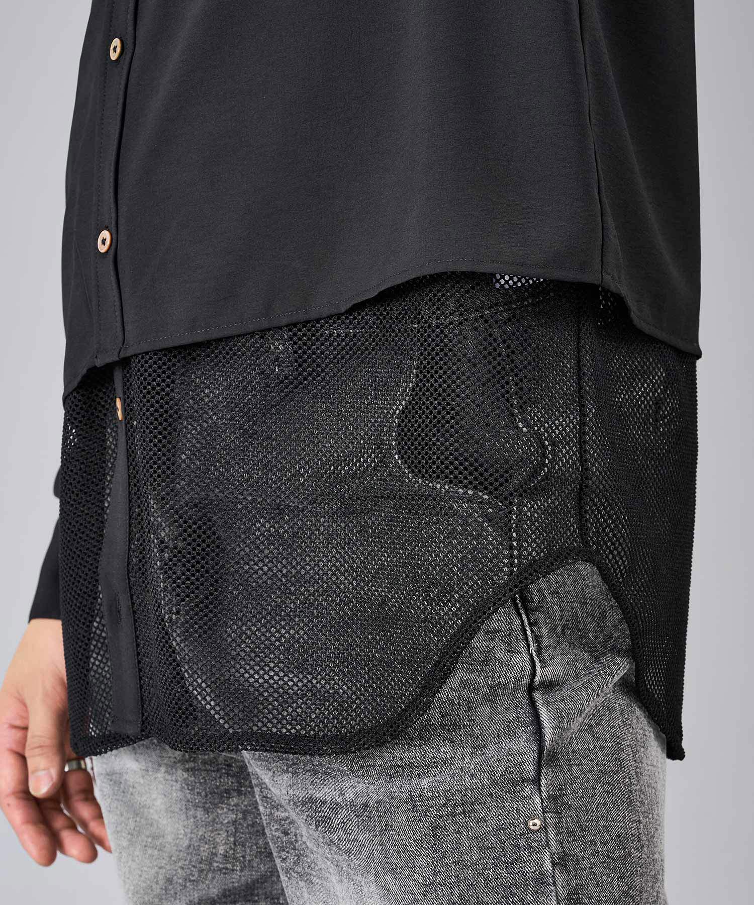 ショート丈のシャツの下に、メッシュのノースリーブの裾が覗くリアルなレイヤードデザイン