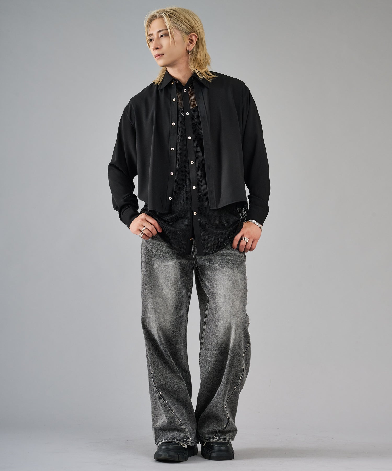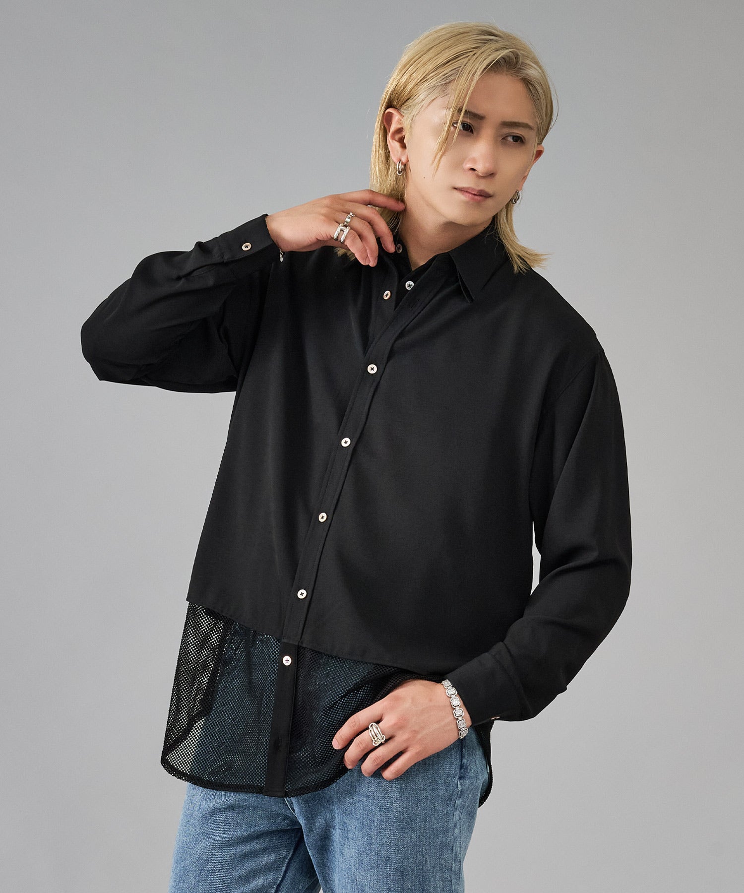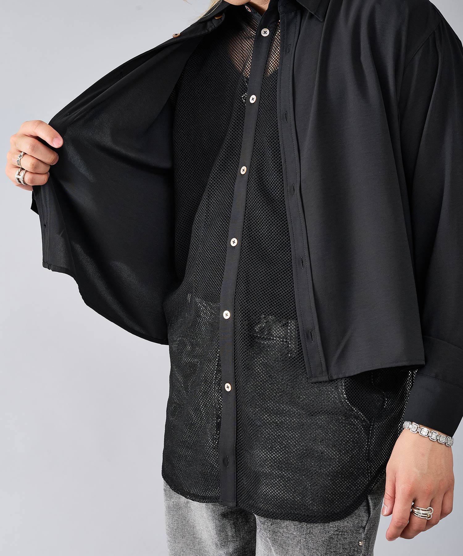 ショート丈のシャツの下に、メッシュのノースリーブの裾が覗くリアルなレイヤードデザイン