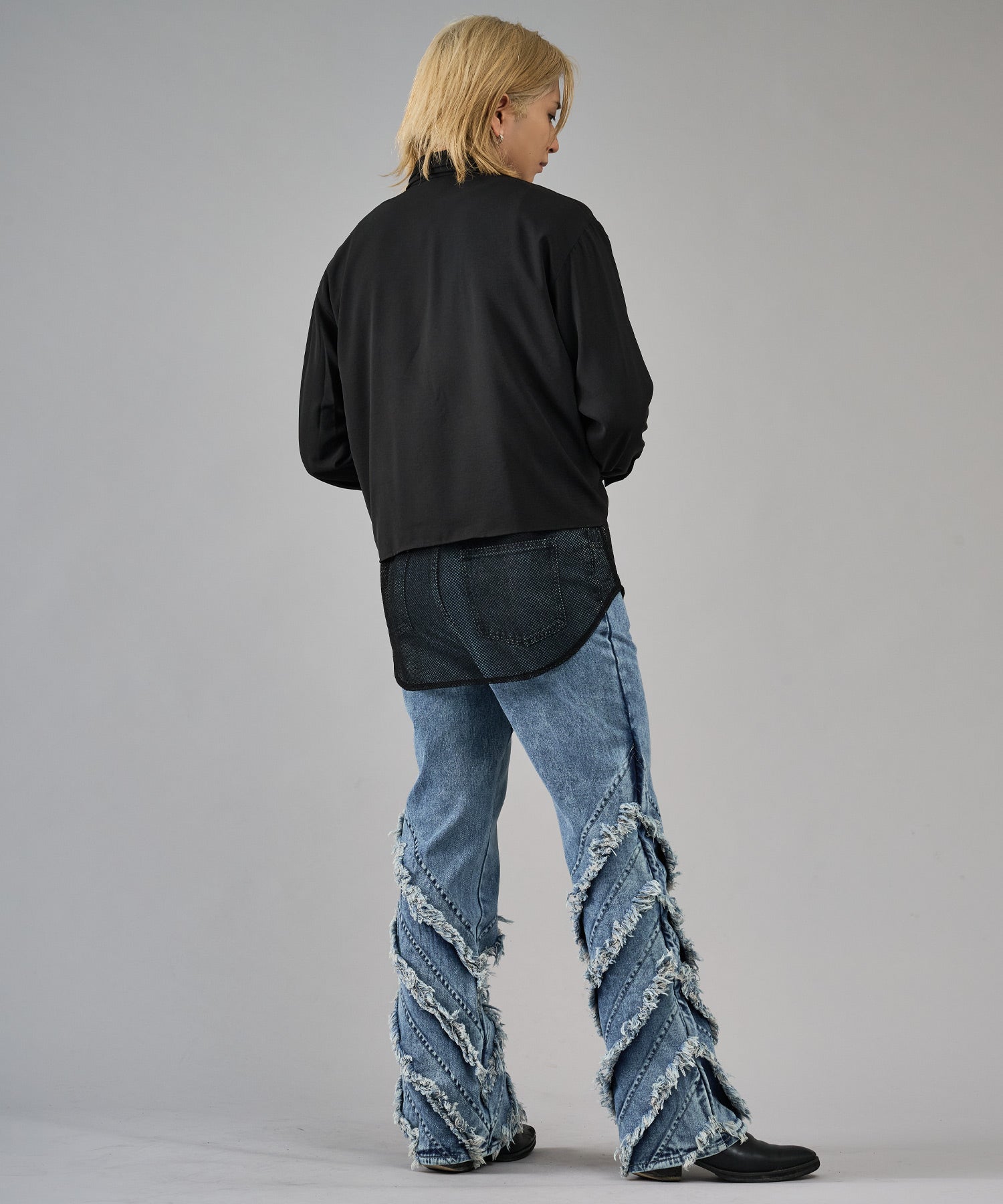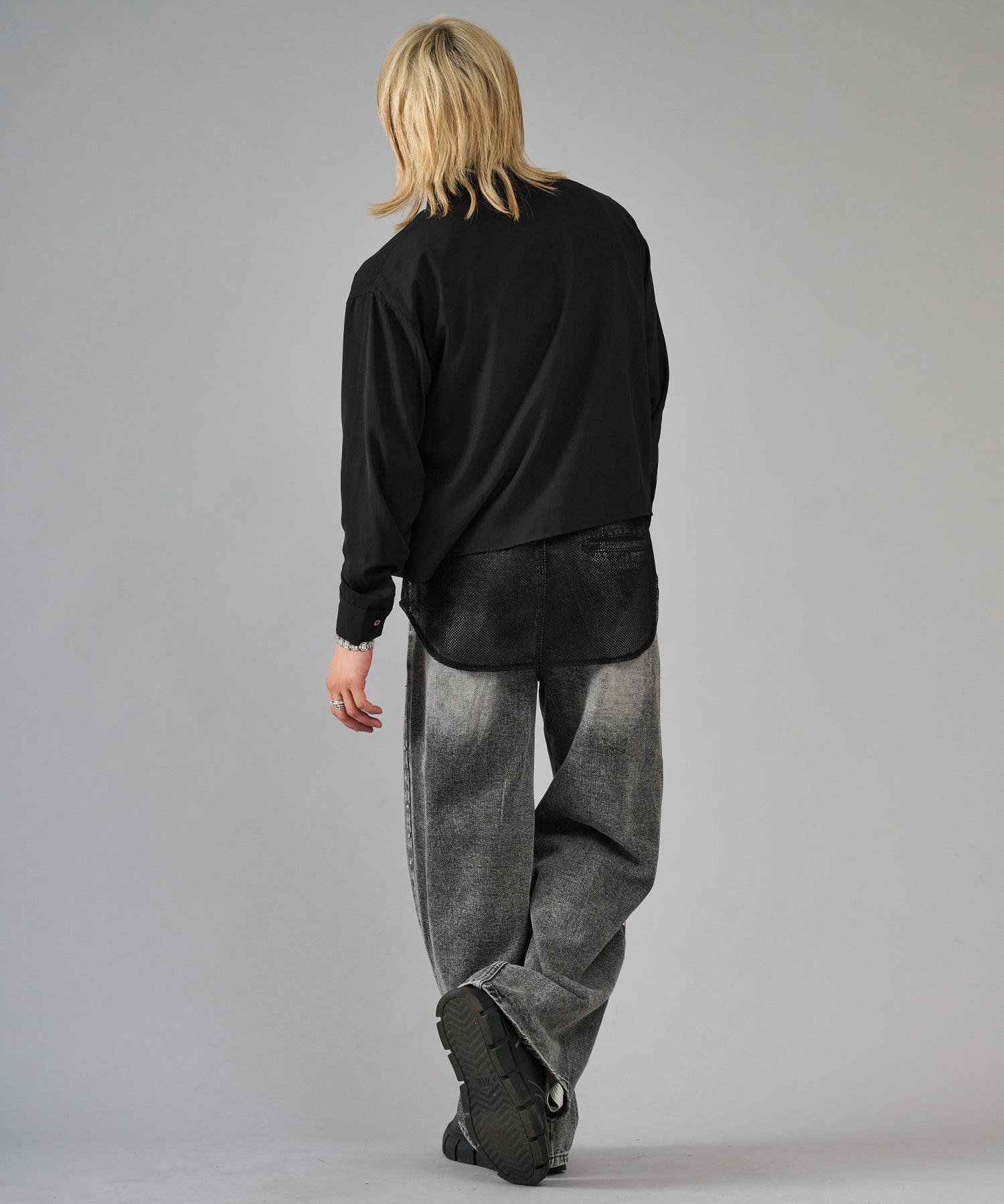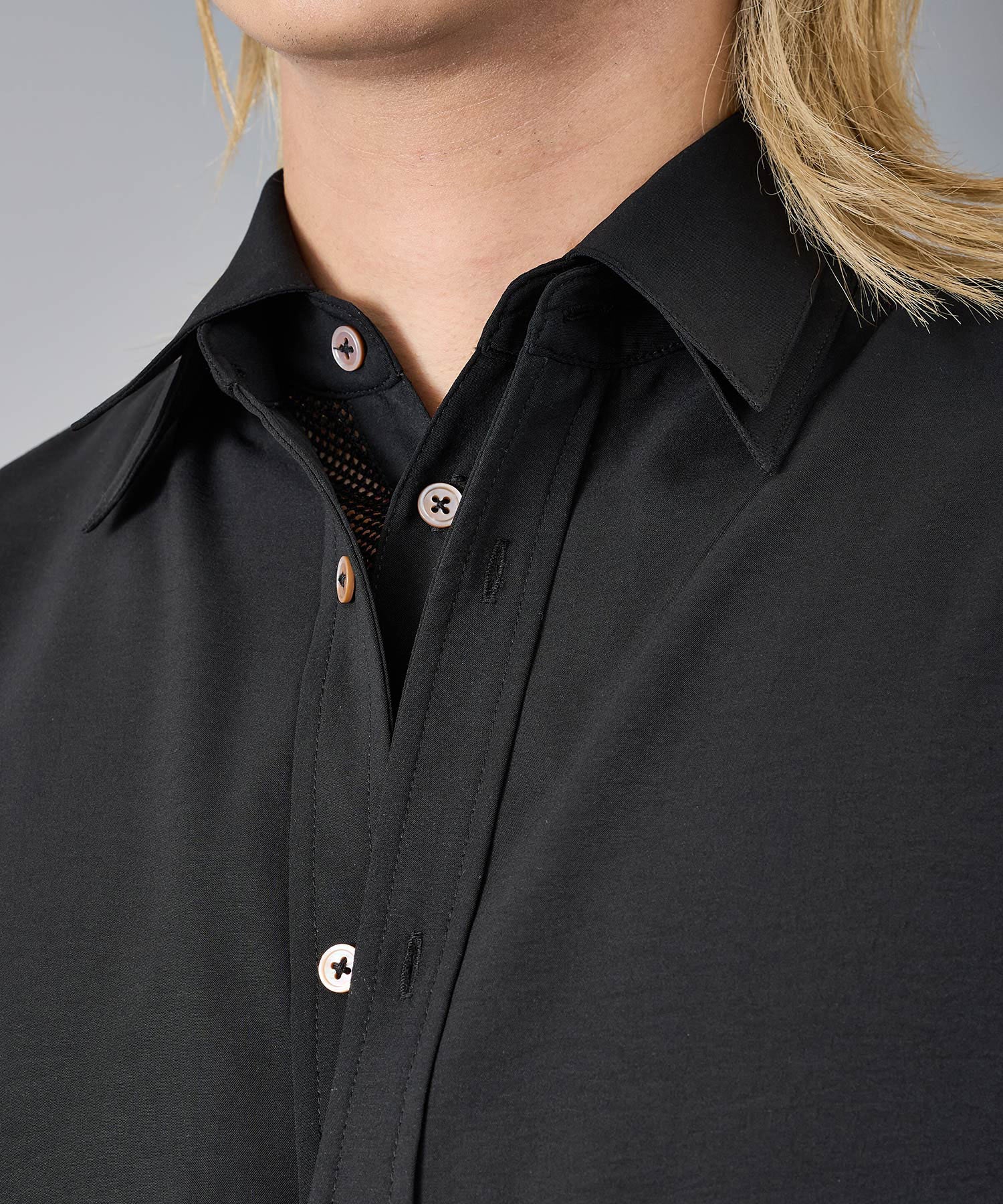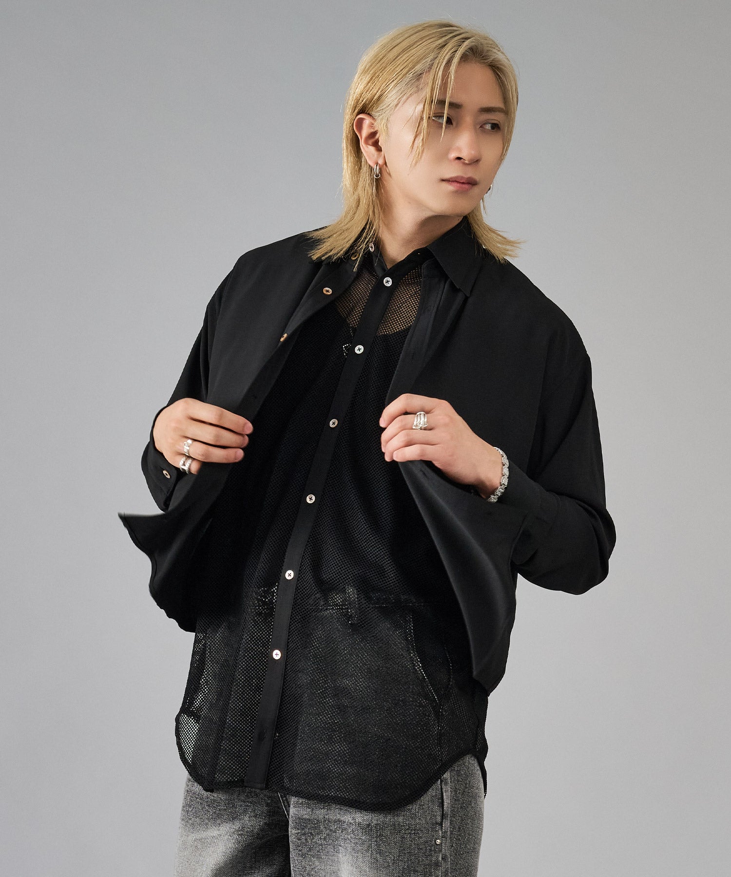ショート丈のシャツの下に、メッシュのノースリーブの裾が覗くリアルなレイヤードデザイン