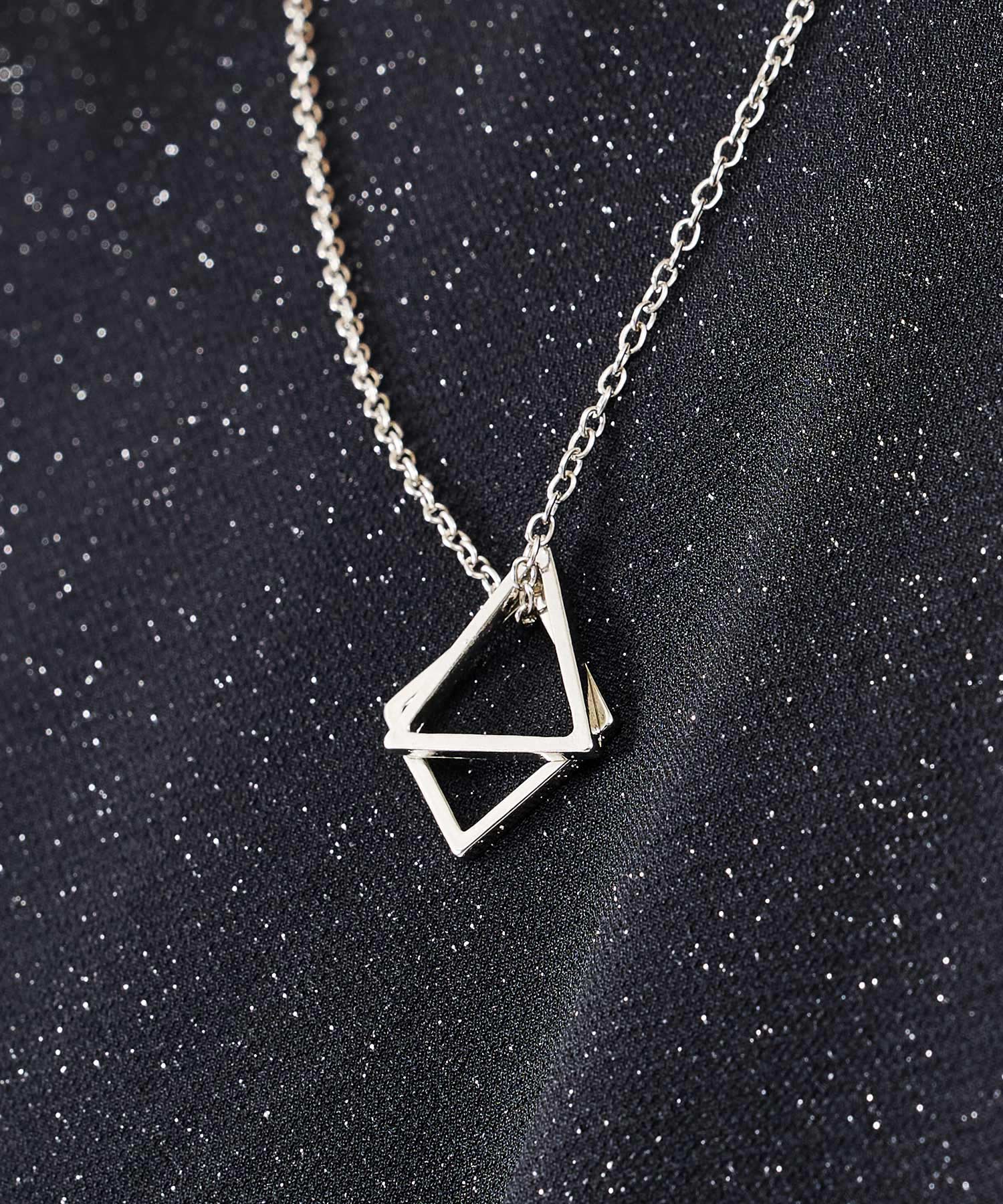 スクエアとトライアングルのダブルリングになったネックレスは襟の裏のループでズレを抑えられます。