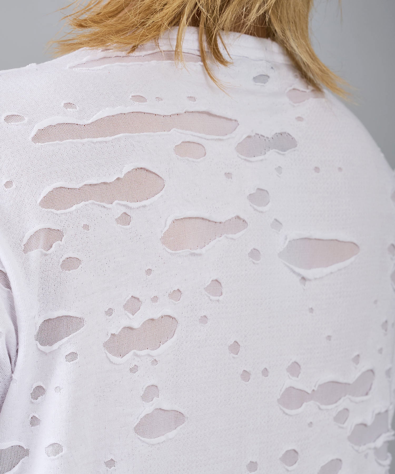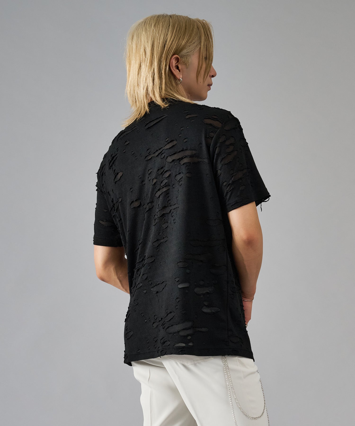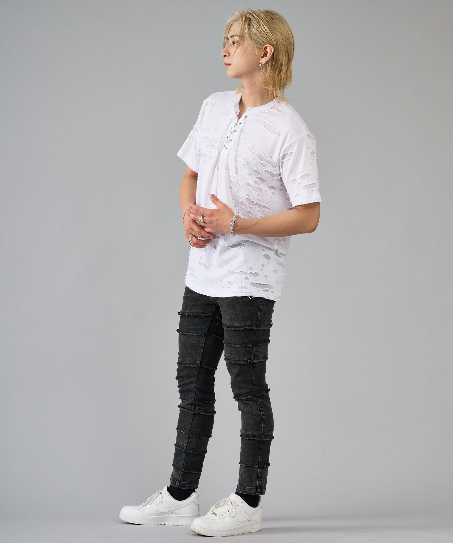 薄い二枚の生地を貼り合わせ、表側にダメージを施してグランジ感を演出しています