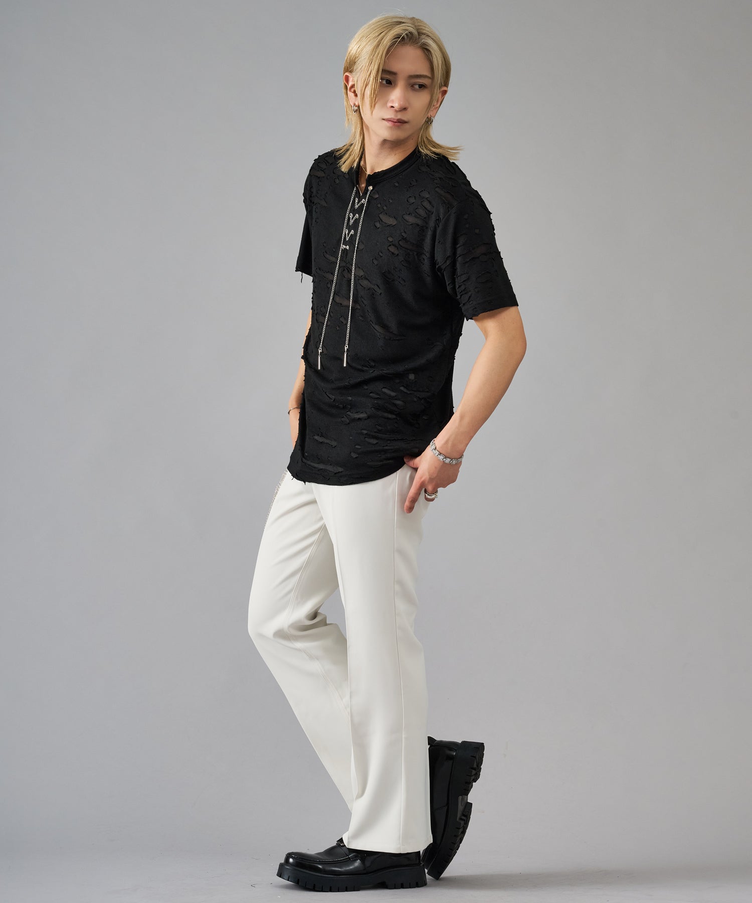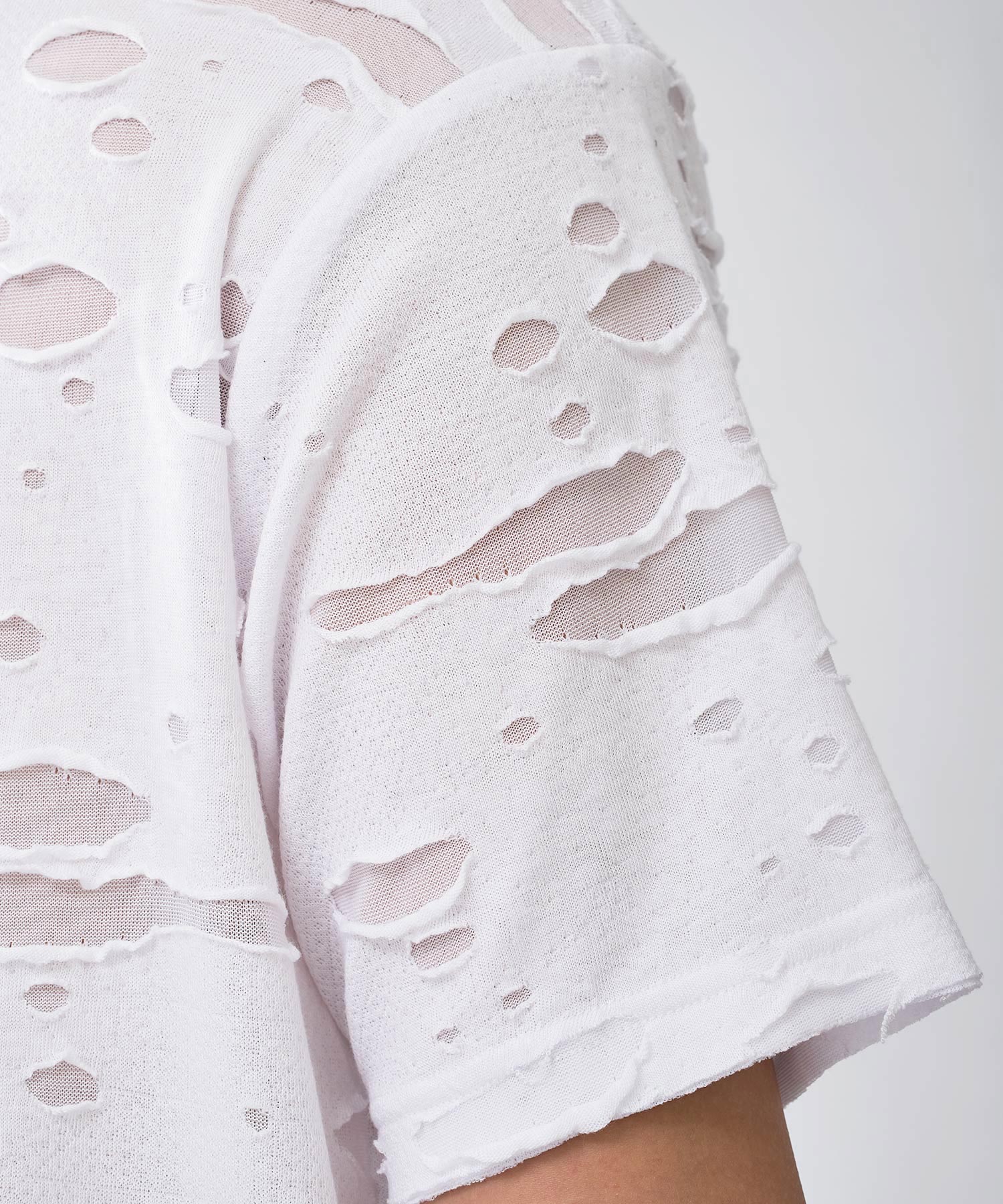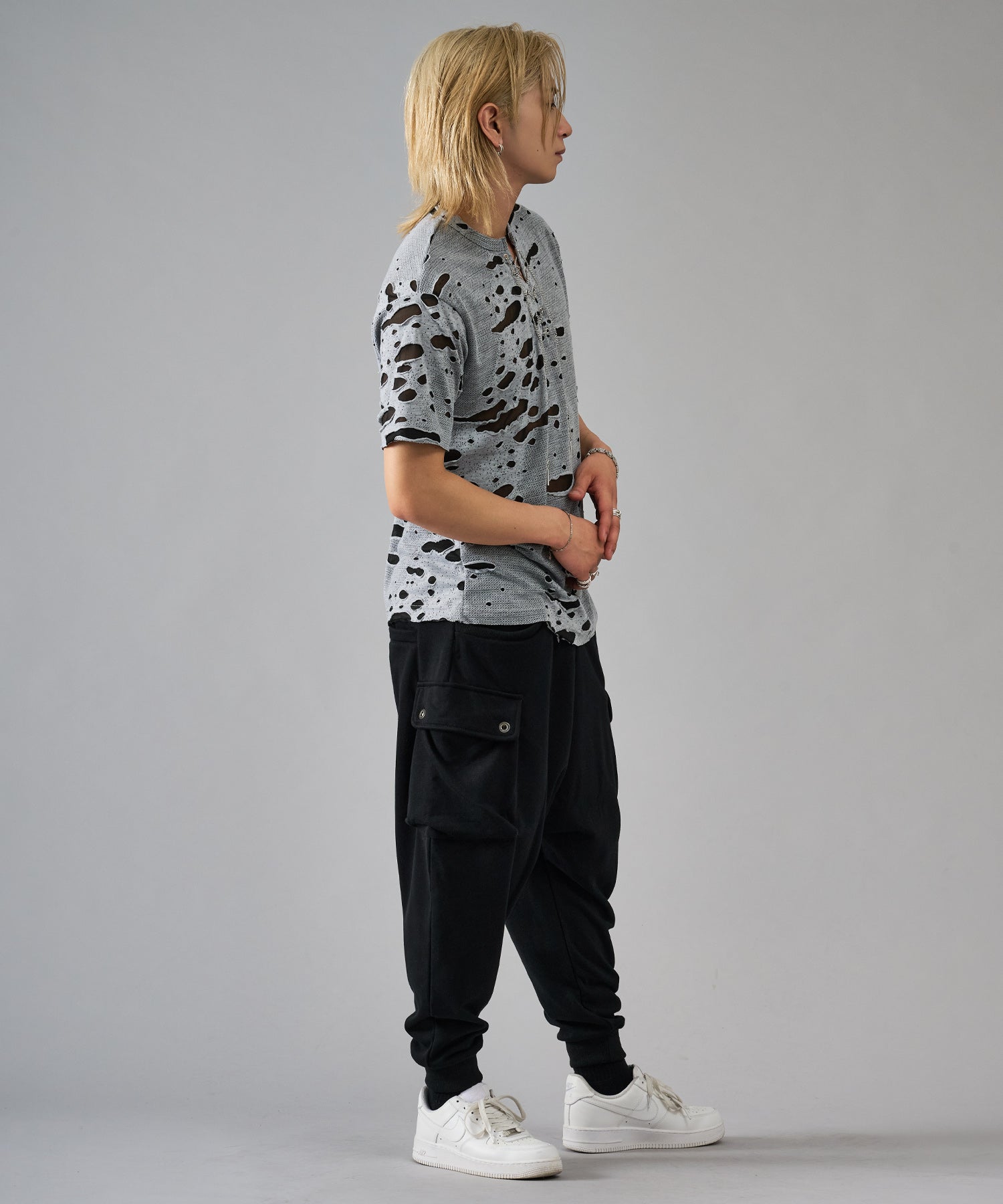 薄い二枚の生地を貼り合わせ、表側にダメージを施してグランジ感を演出しています
