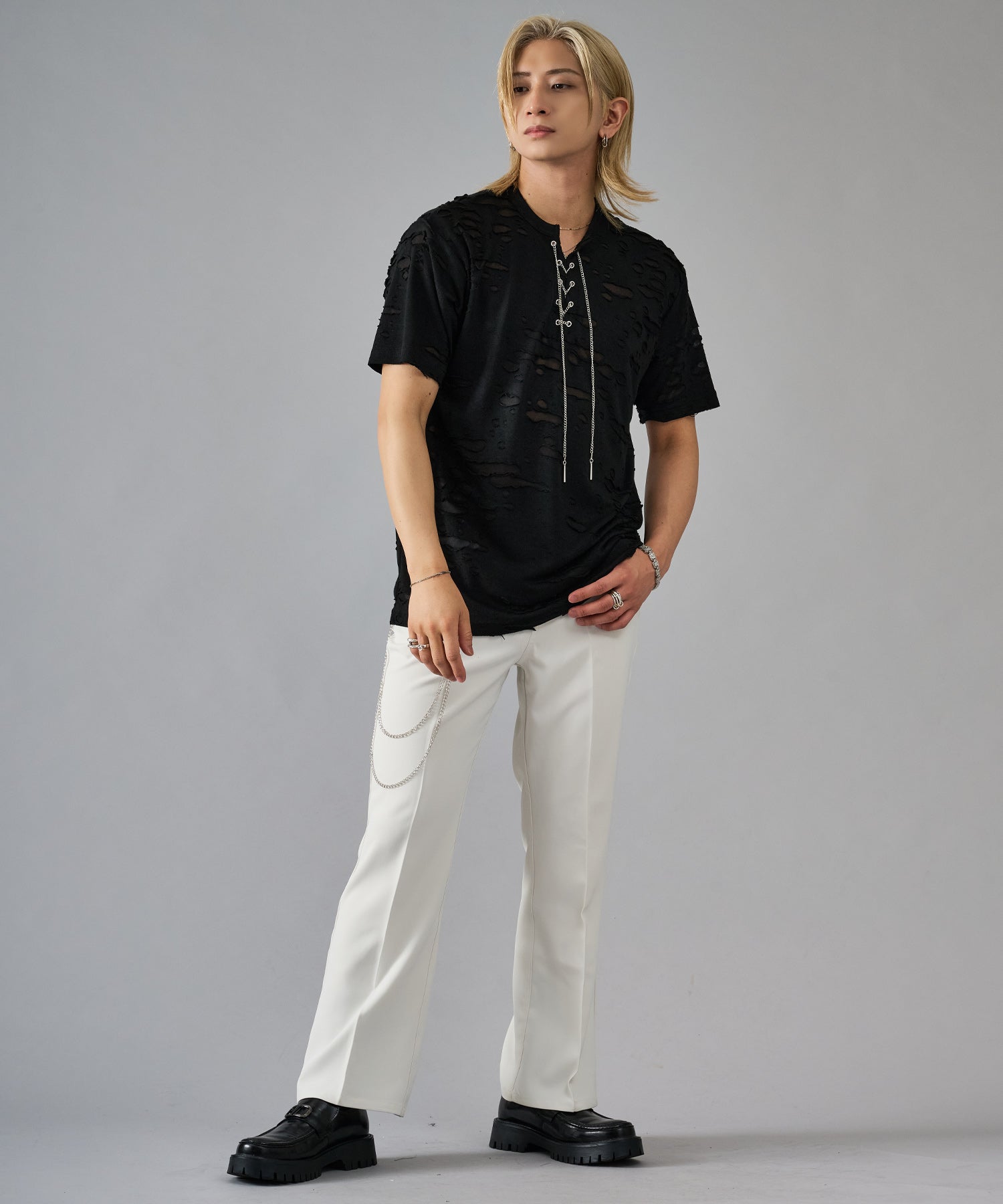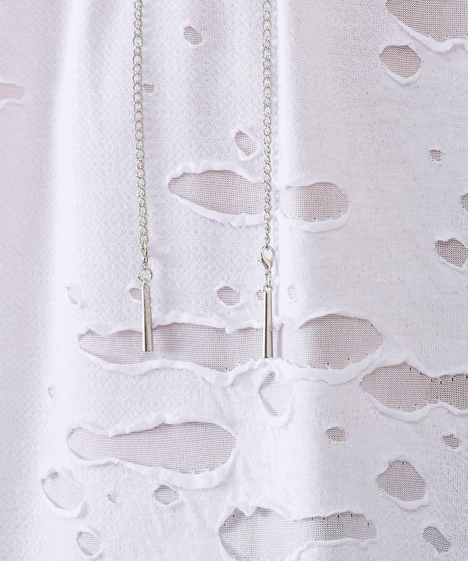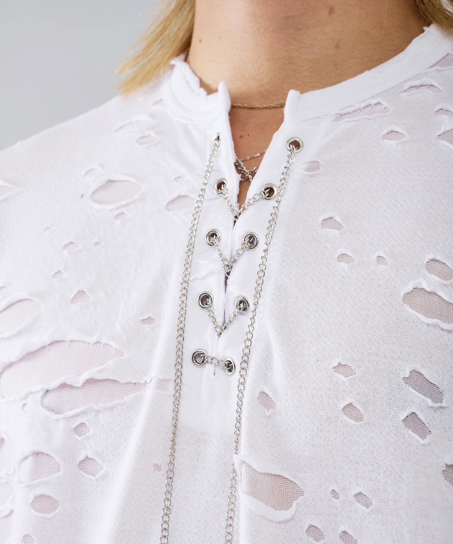 レースアップにした胸元は涼しげで、チェーンのレースがリッチ感ある仕様