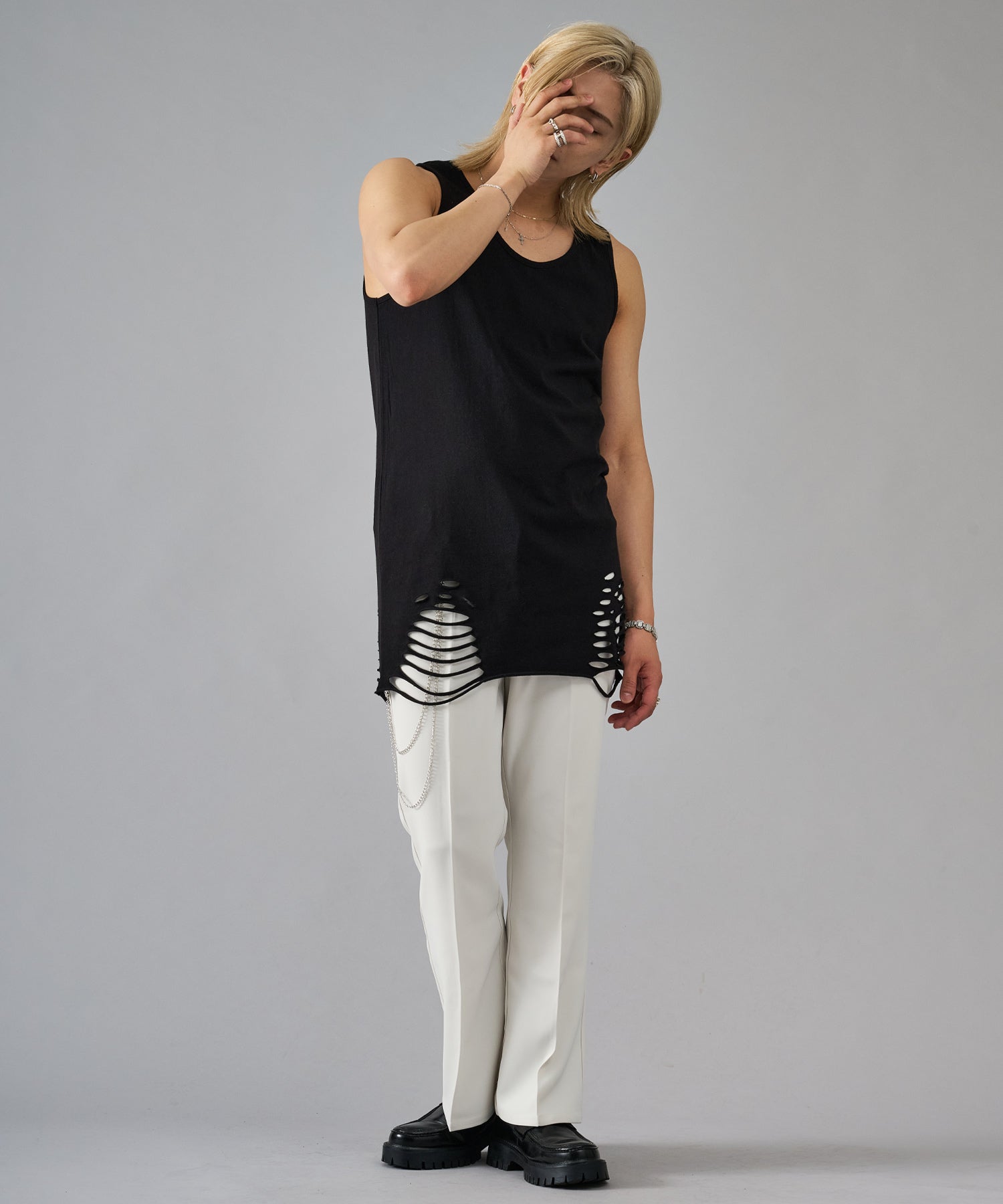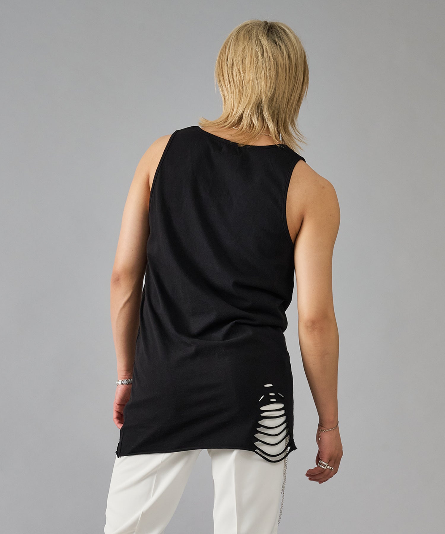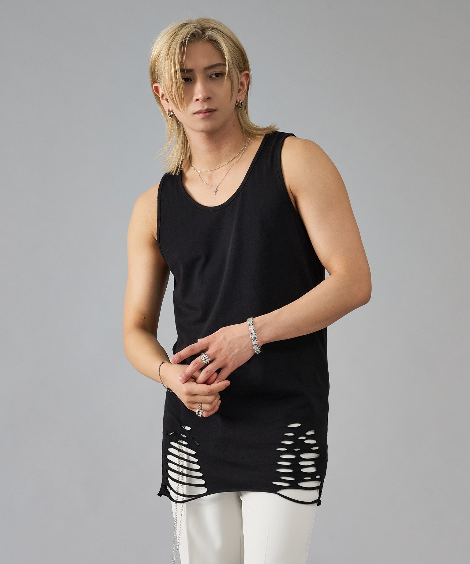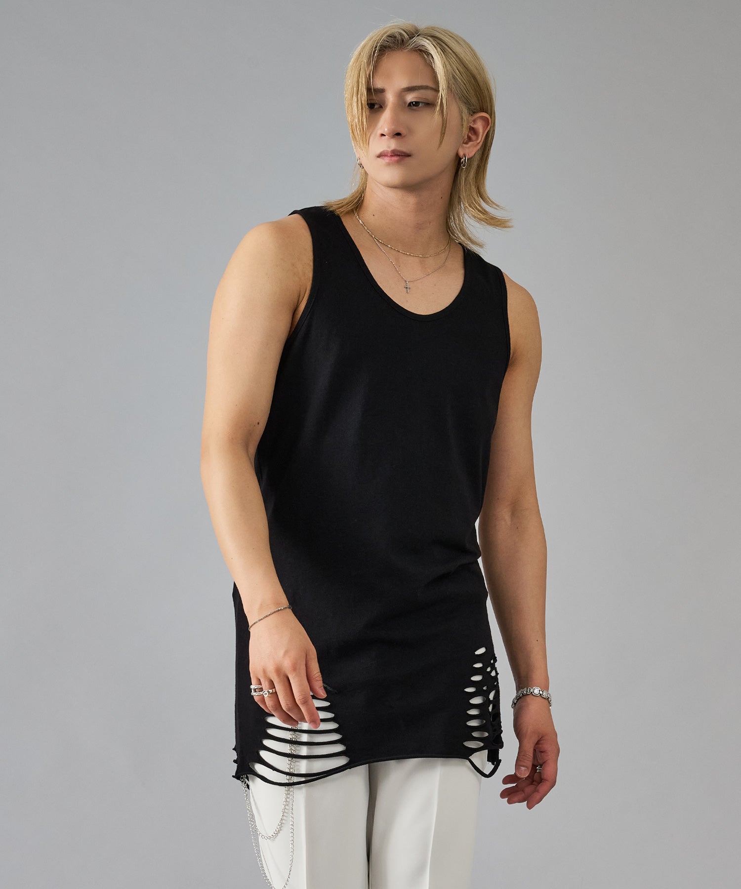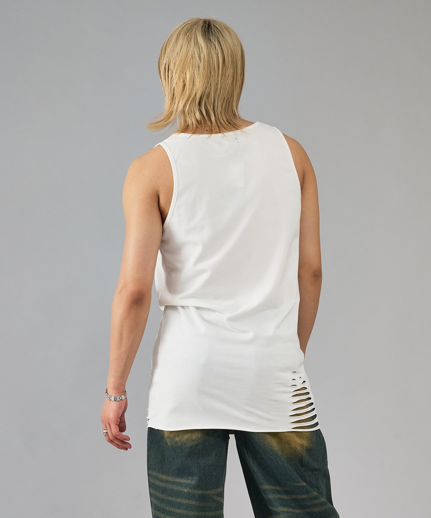 夏に最適のグランジタンクトップ ■detail少し長めのシルエットで、裾にダメージを効かせたグランジ調のタンクトップ ■fabricコットン100%の天竺で着心地も良くイージーケアです ■stylingトレンドのシースルー素材のインナーとして最適です |