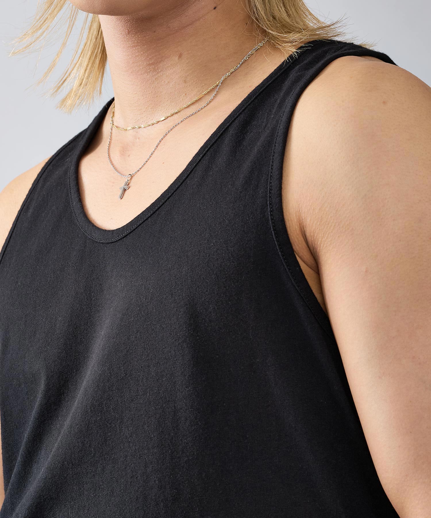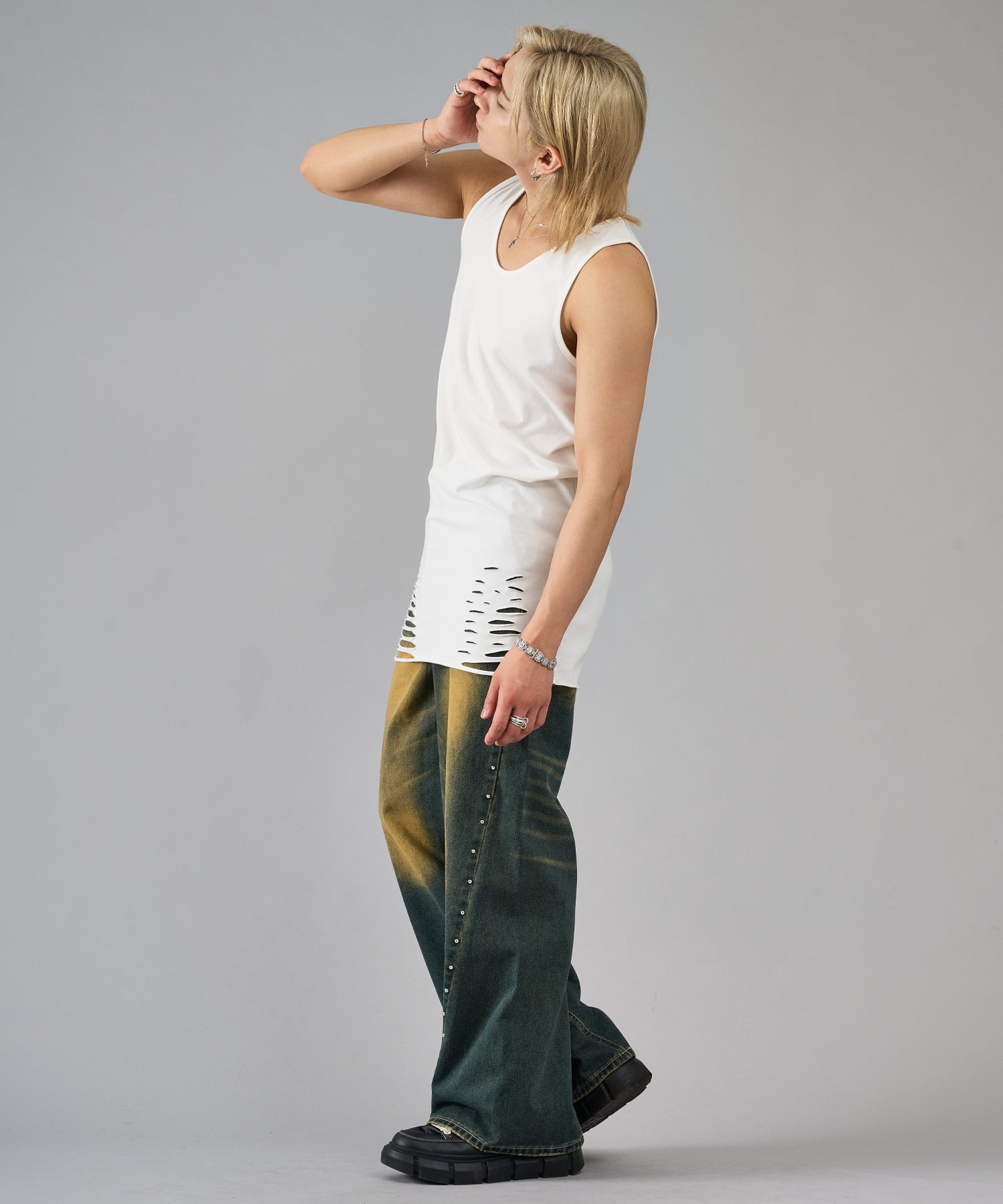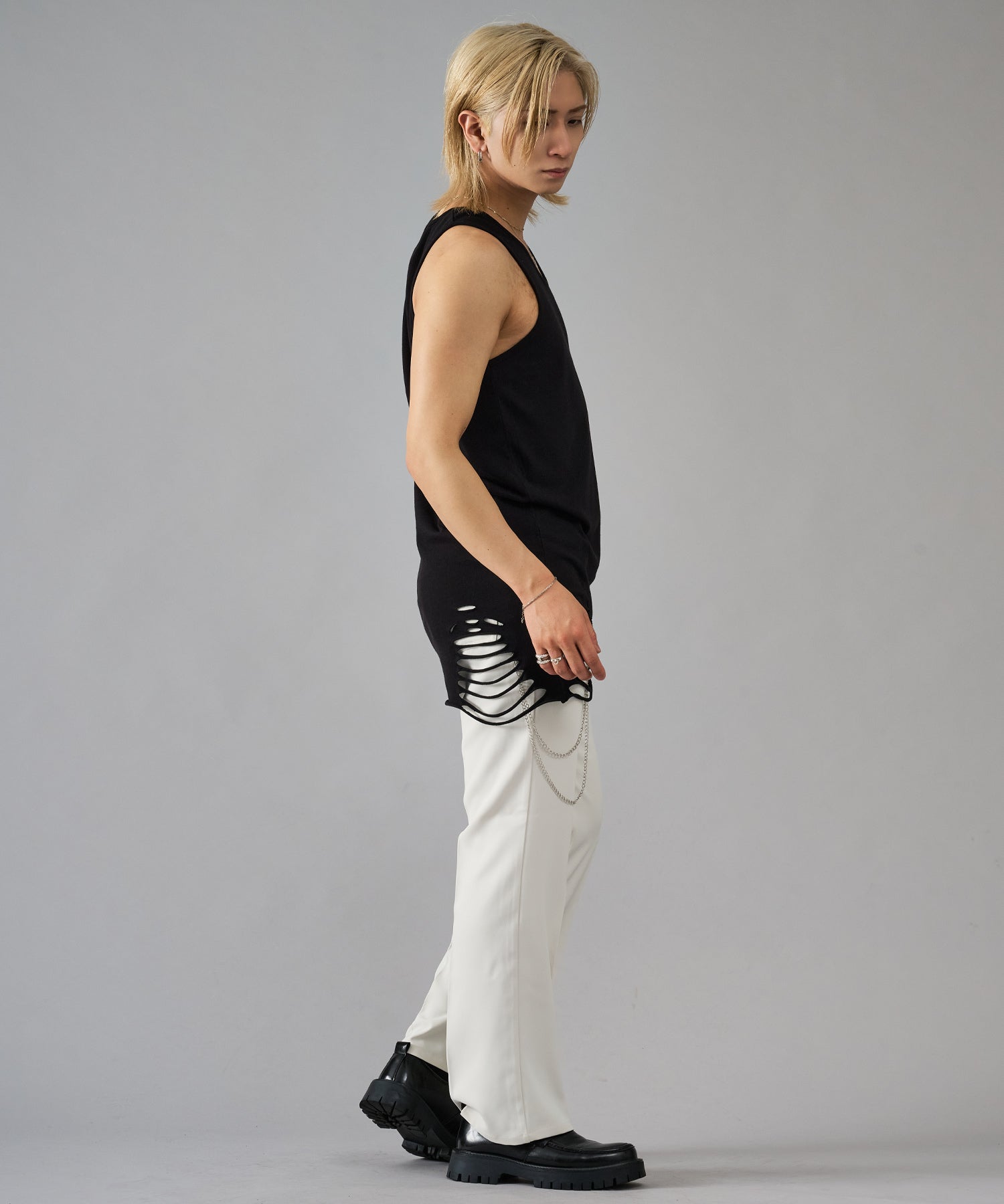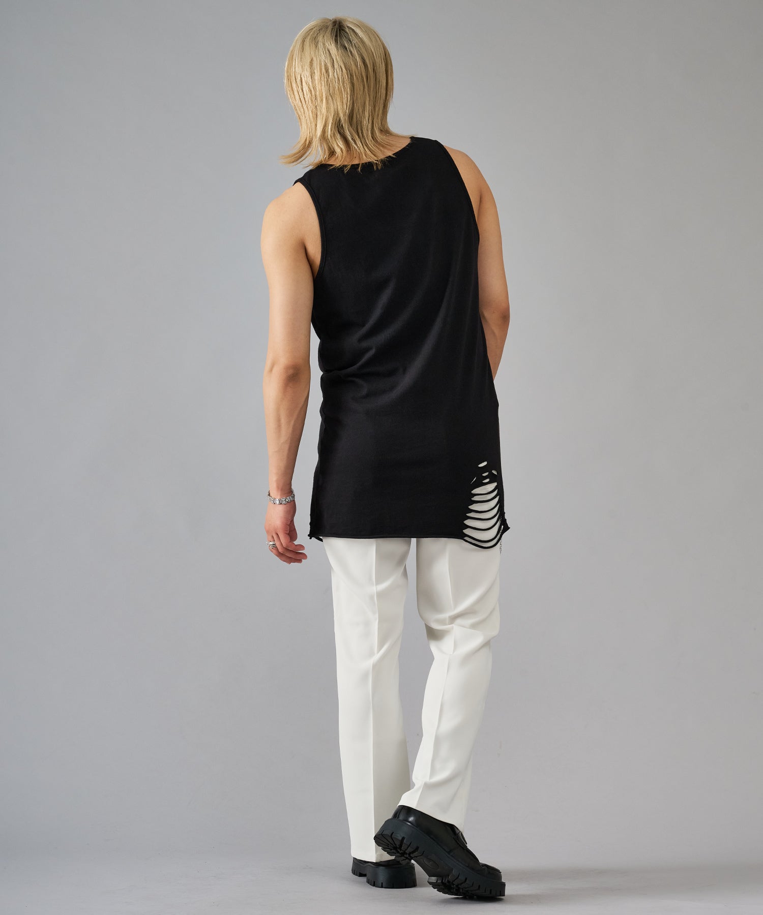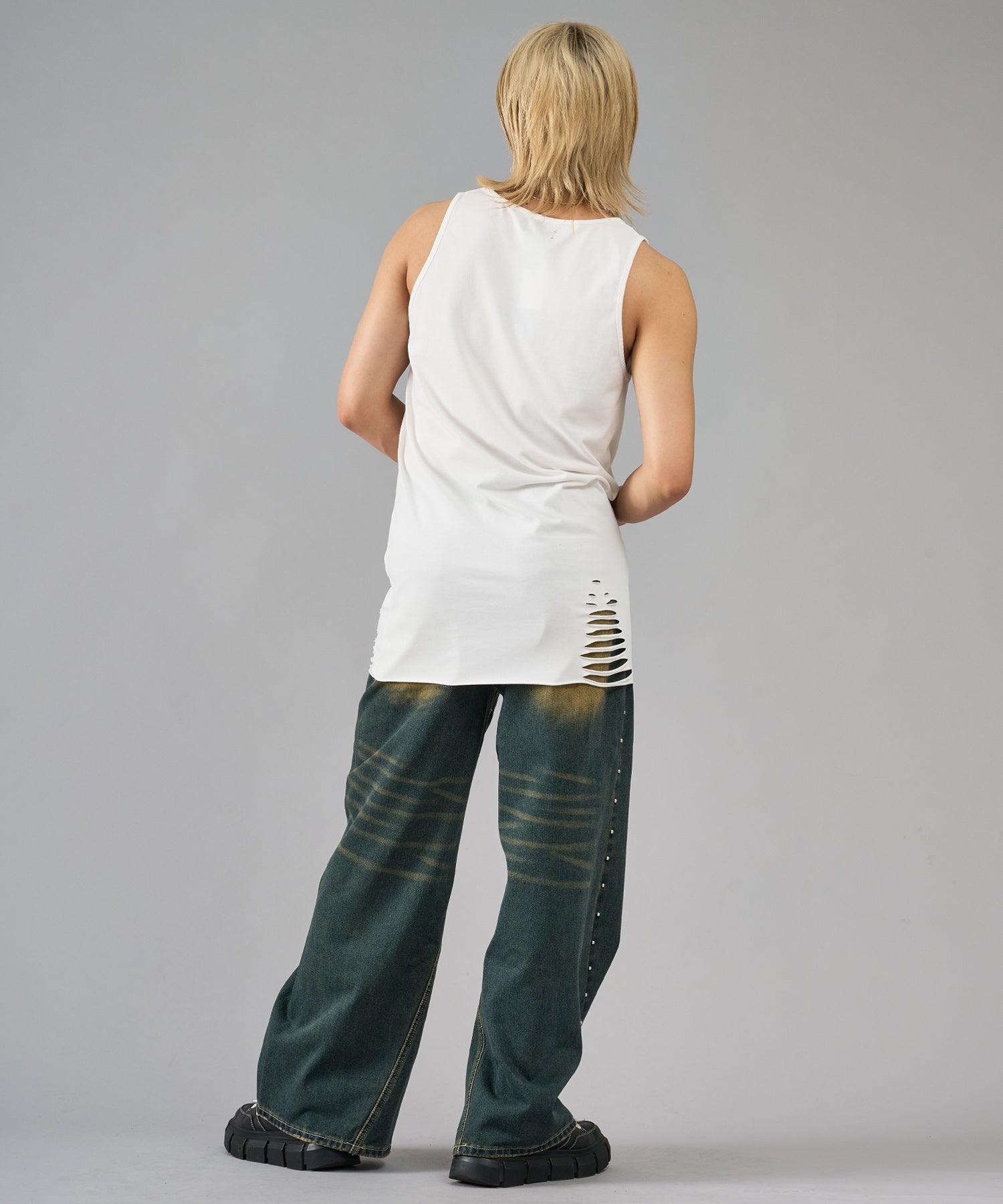 夏に最適のグランジタンクトップ ■detail少し長めのシルエットで、裾にダメージを効かせたグランジ調のタンクトップ ■fabricコットン100%の天竺で着心地も良くイージーケアです ■stylingトレンドのシースルー素材のインナーとして最適です |