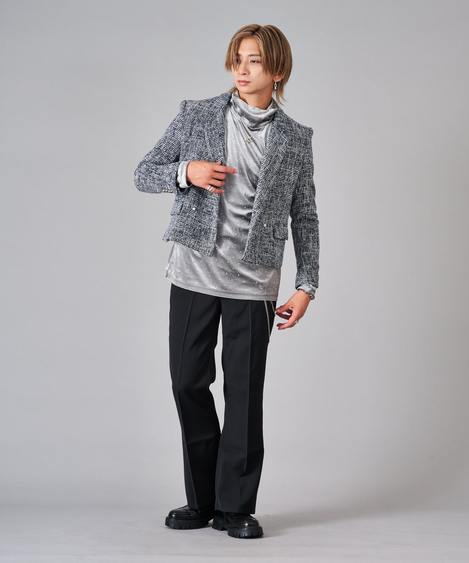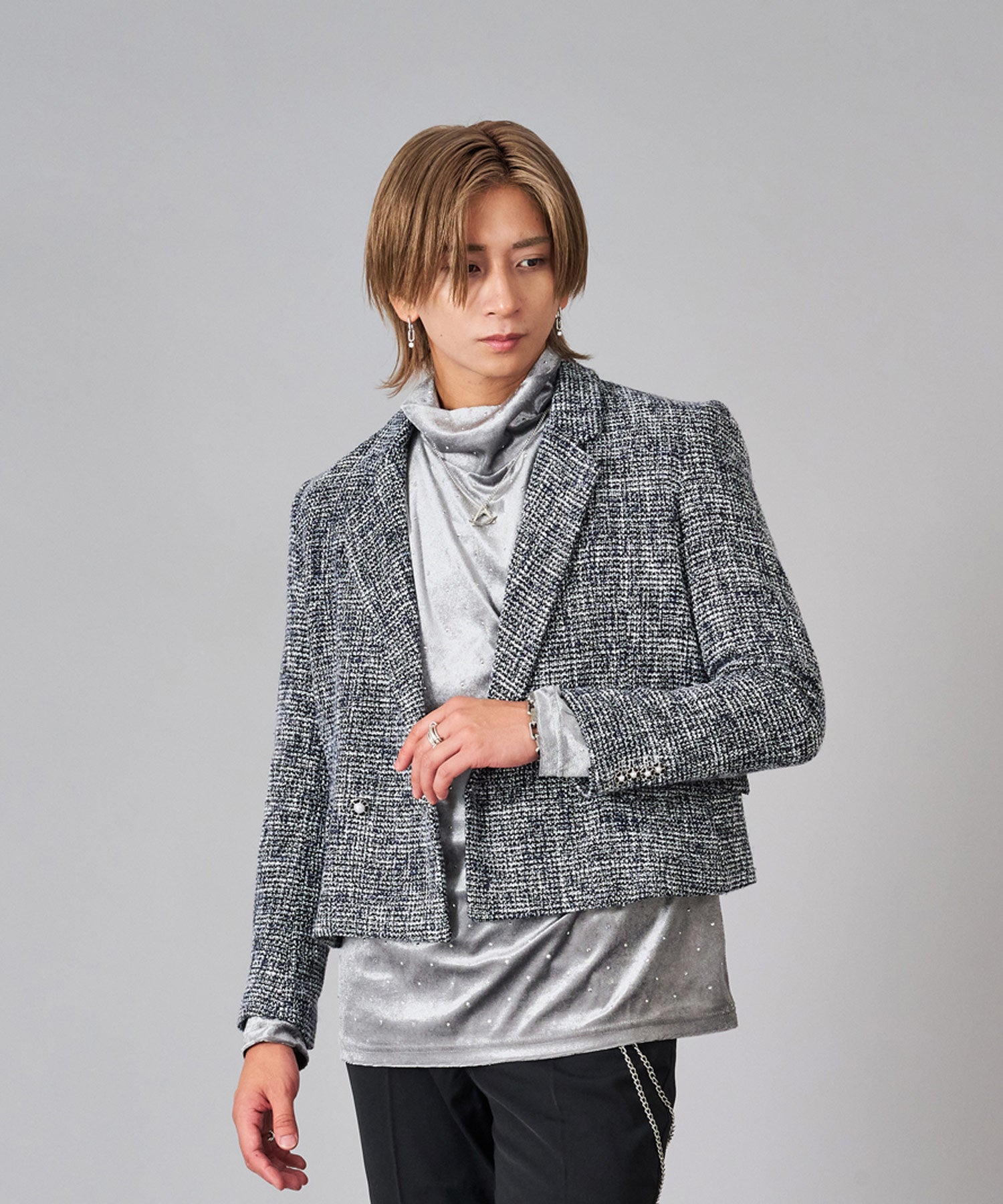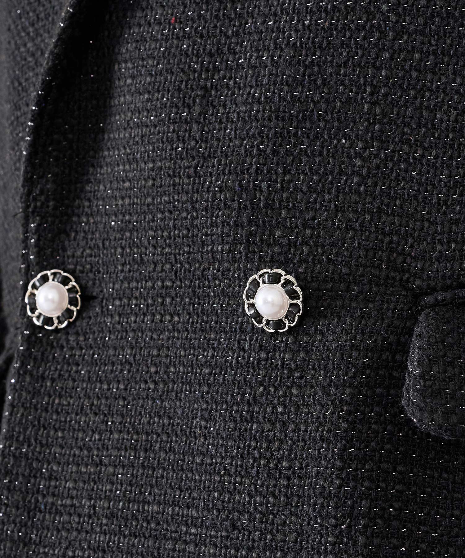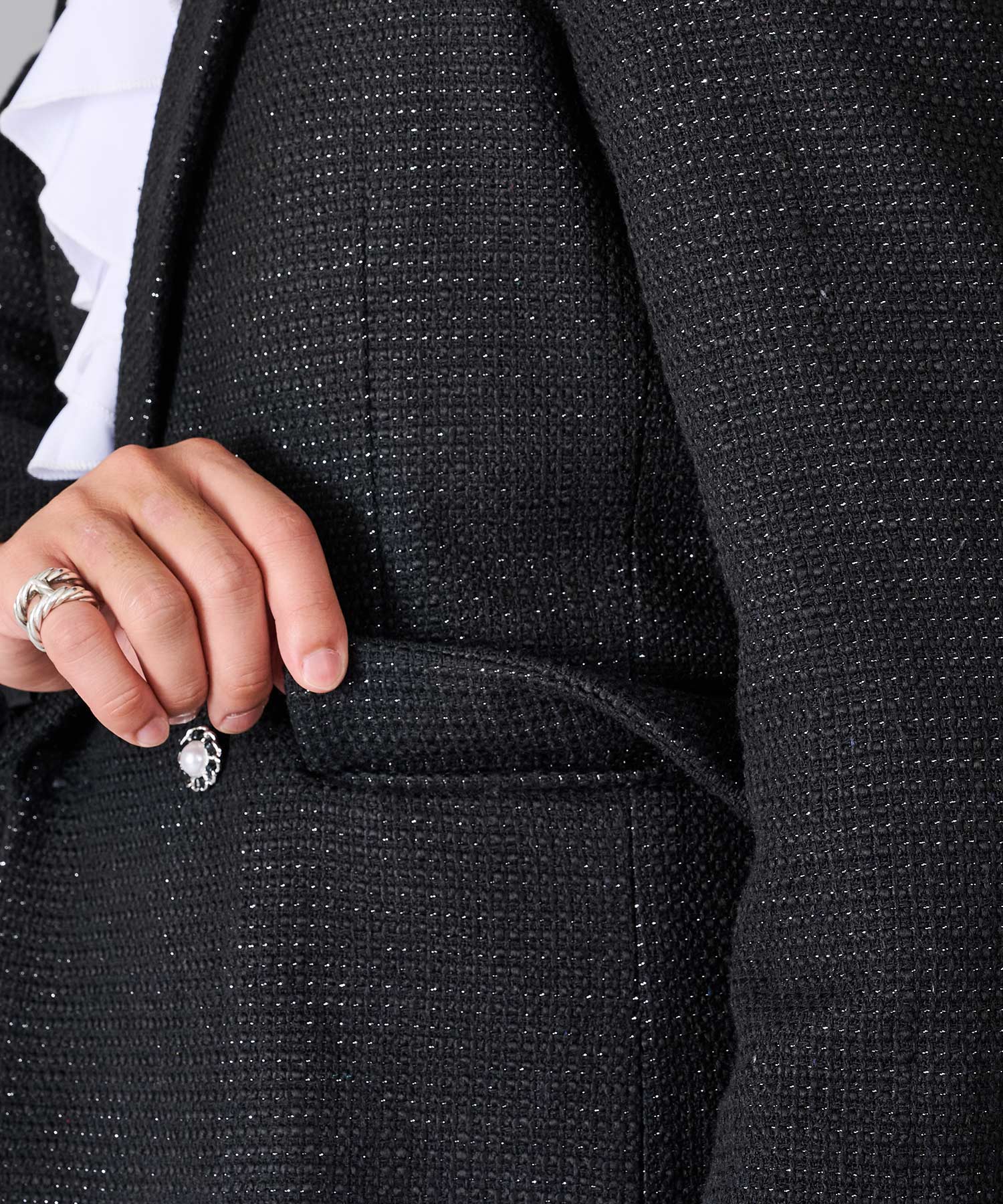 トレンドなツイード素材はクラシカルな雰囲気を持ちつつ、ラメの輝きが艶やかでクールです。