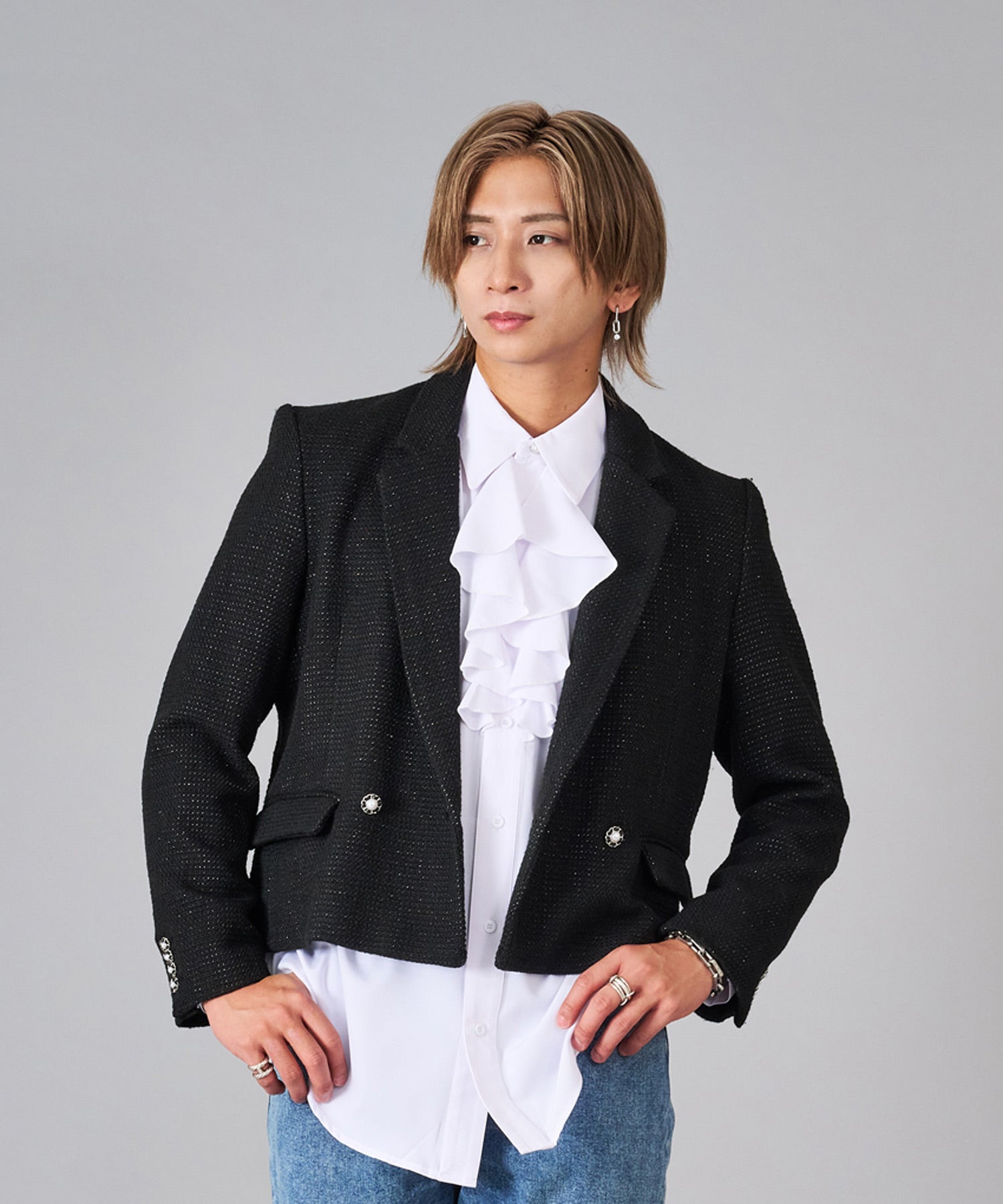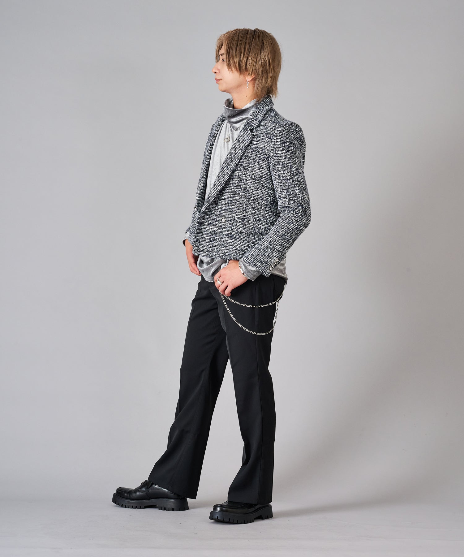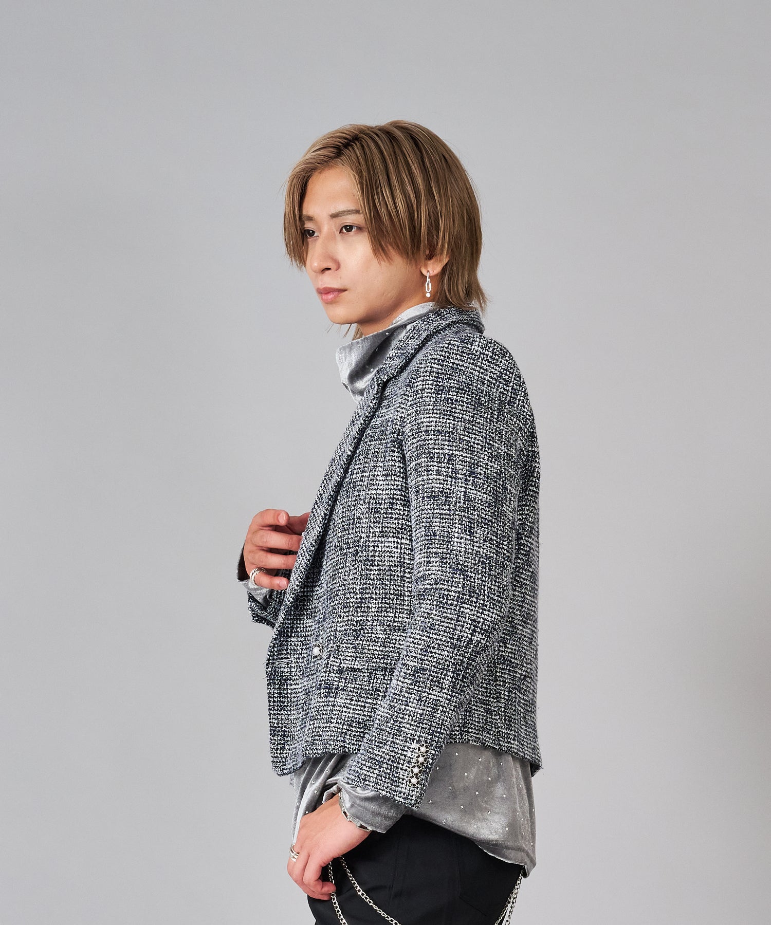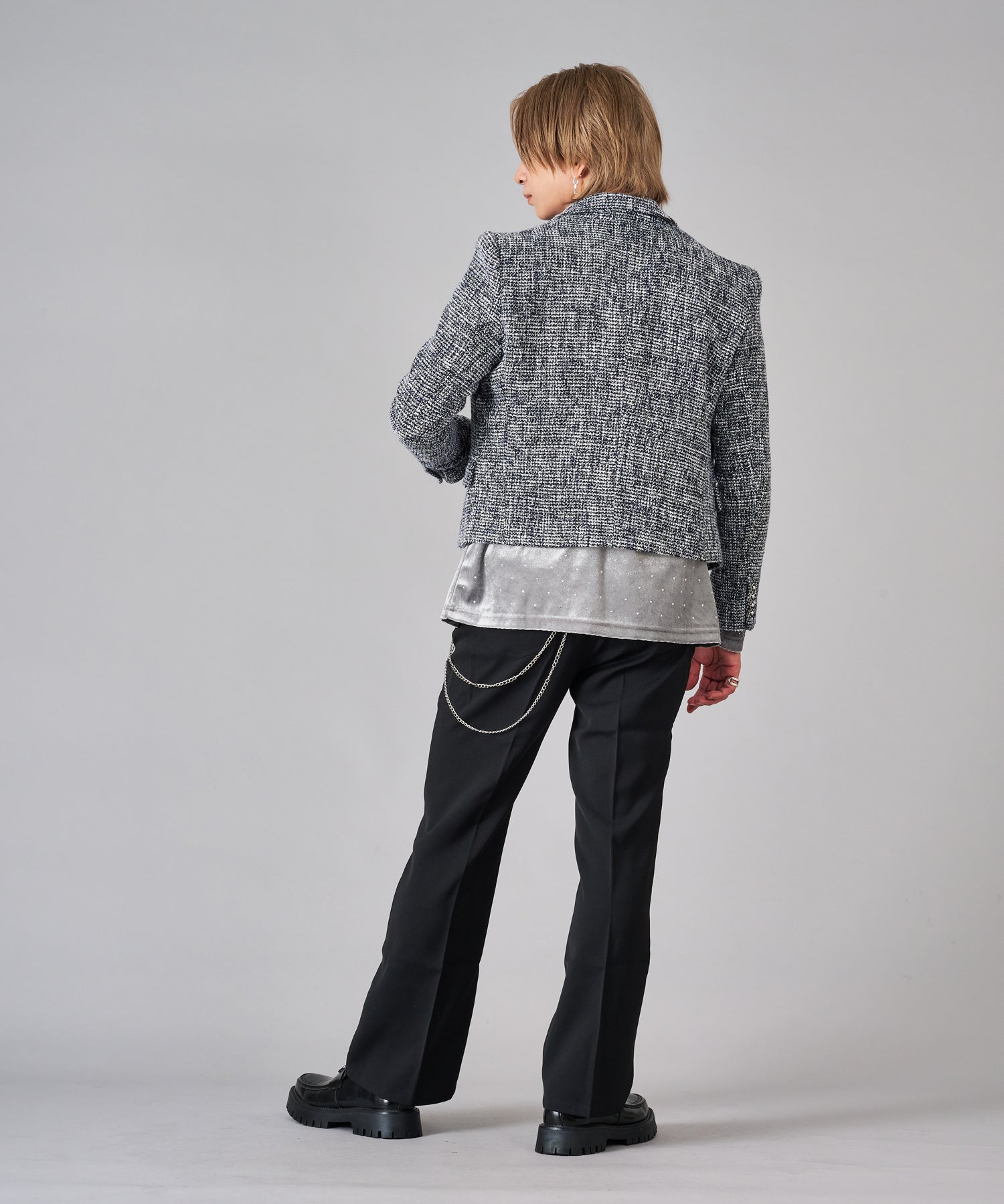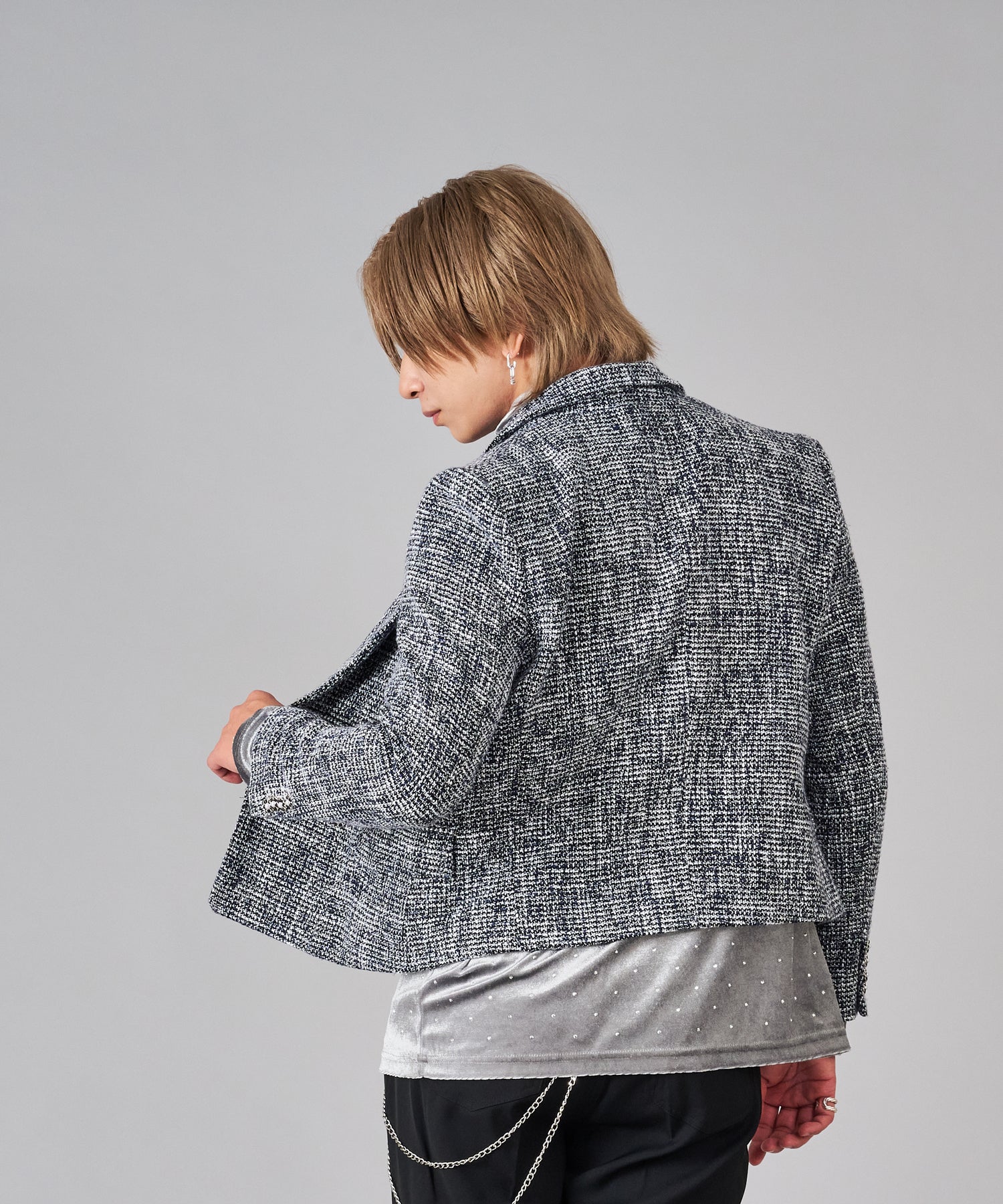 トレンドなツイード素材はクラシカルな雰囲気を持ちつつ、ラメの輝きが艶やかでクールです。