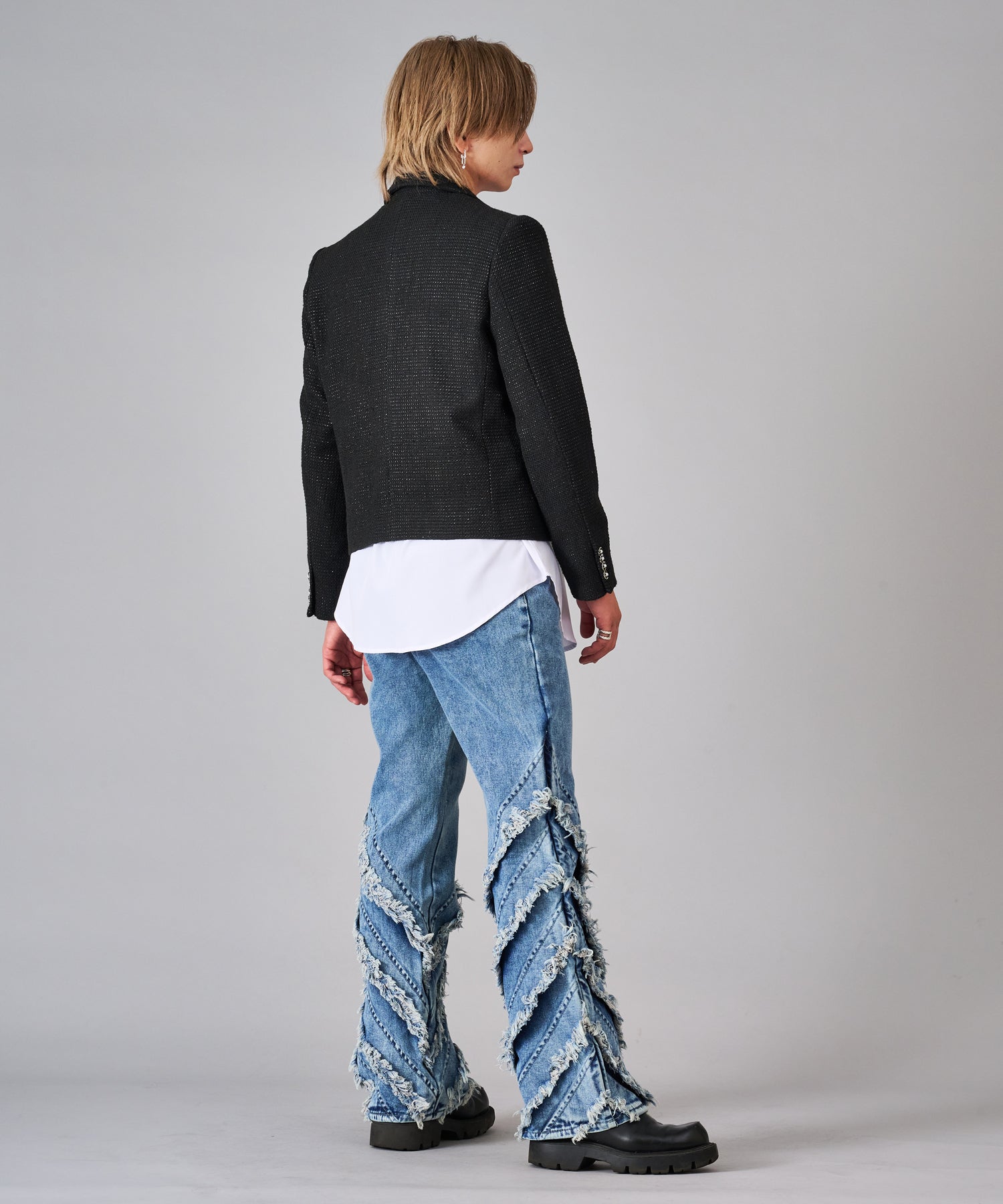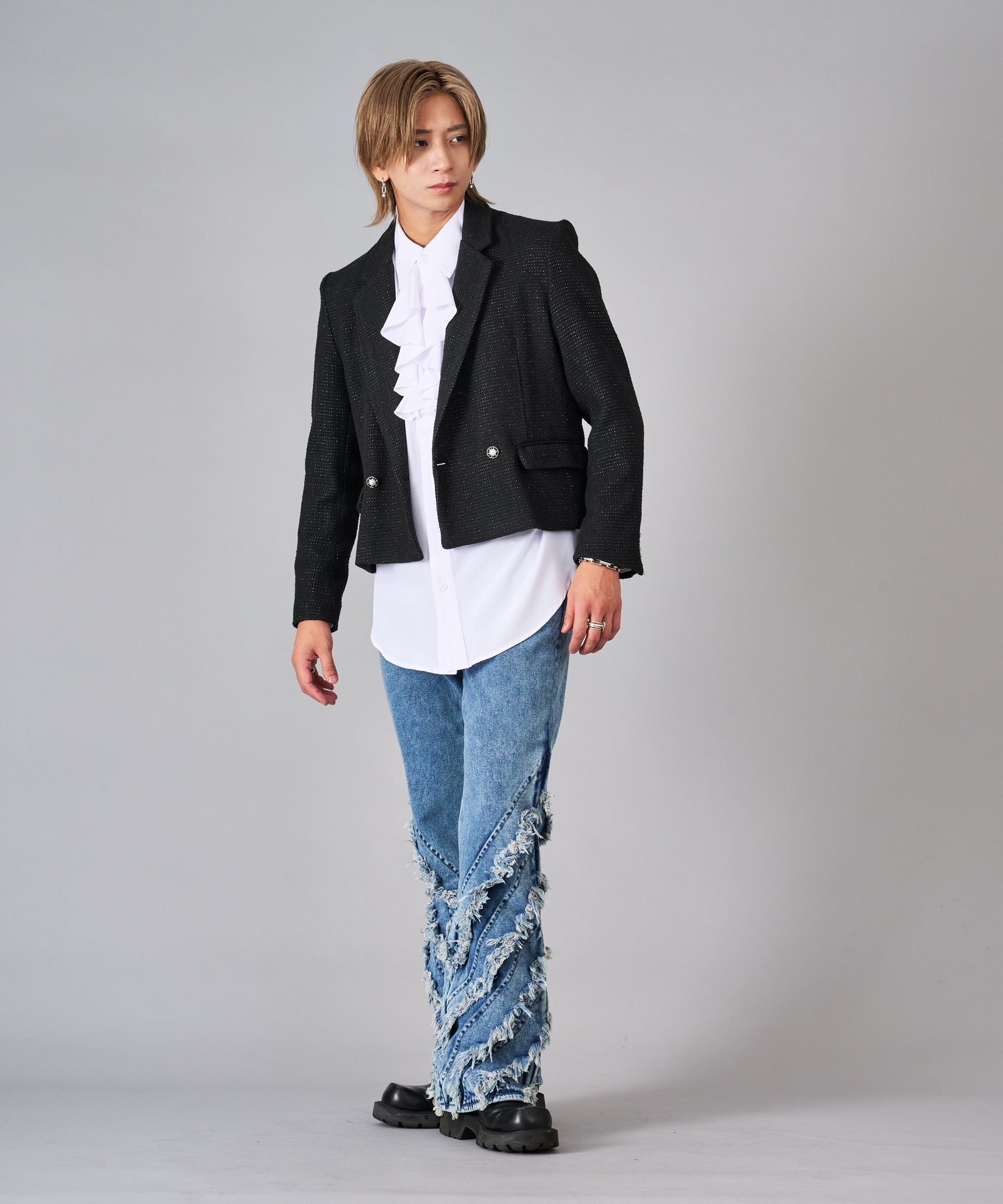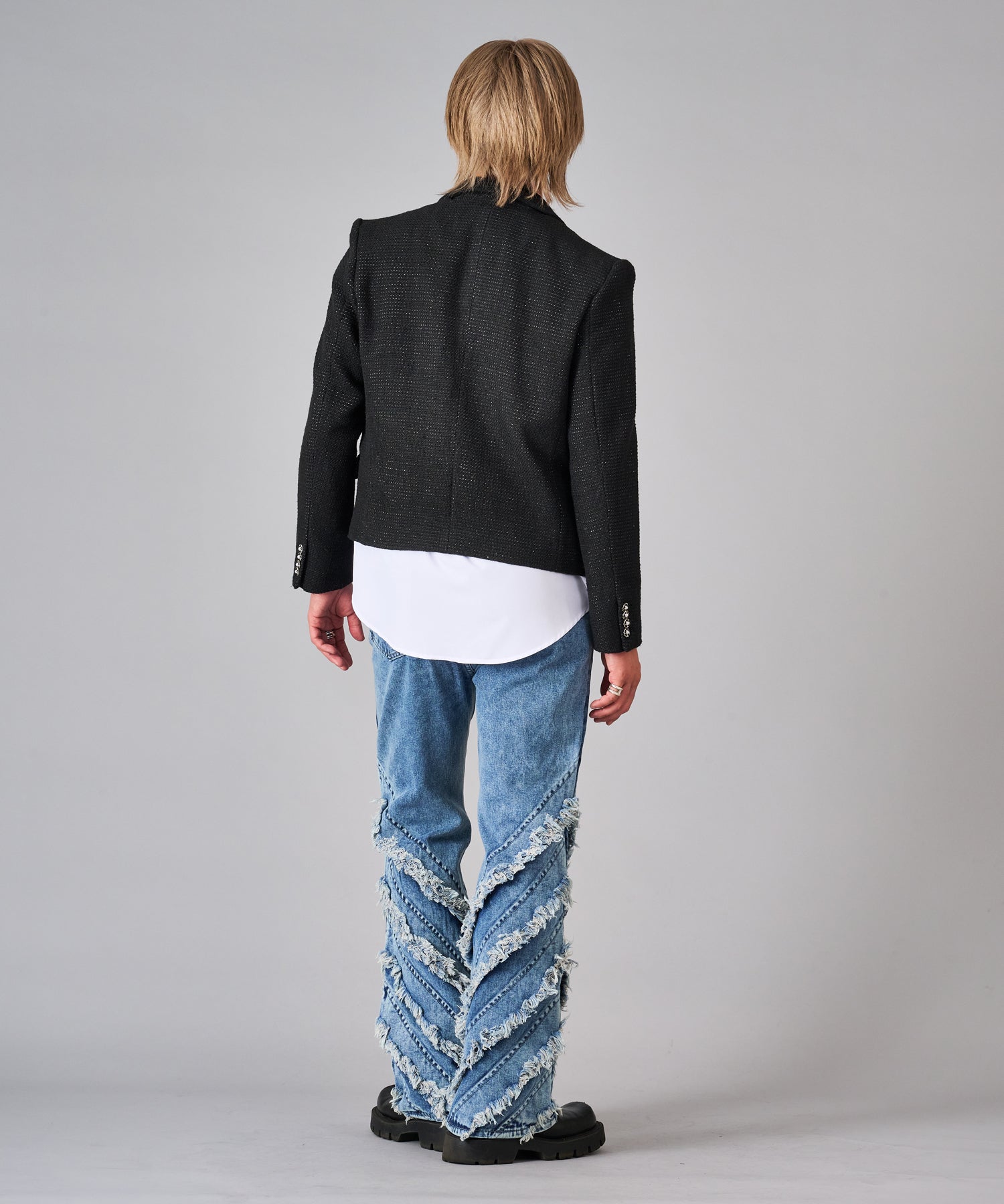 ウエスト付近までの短い着丈がハイセンスな注目のアイテム。メタル調の飾りボタンを仕様したダブルブレストもトレンド。フラップをつけた腰ポケットはショート丈を引き立たせるアクセント。肩パットのないアンコン仕立てはカジュアルに着回せる。