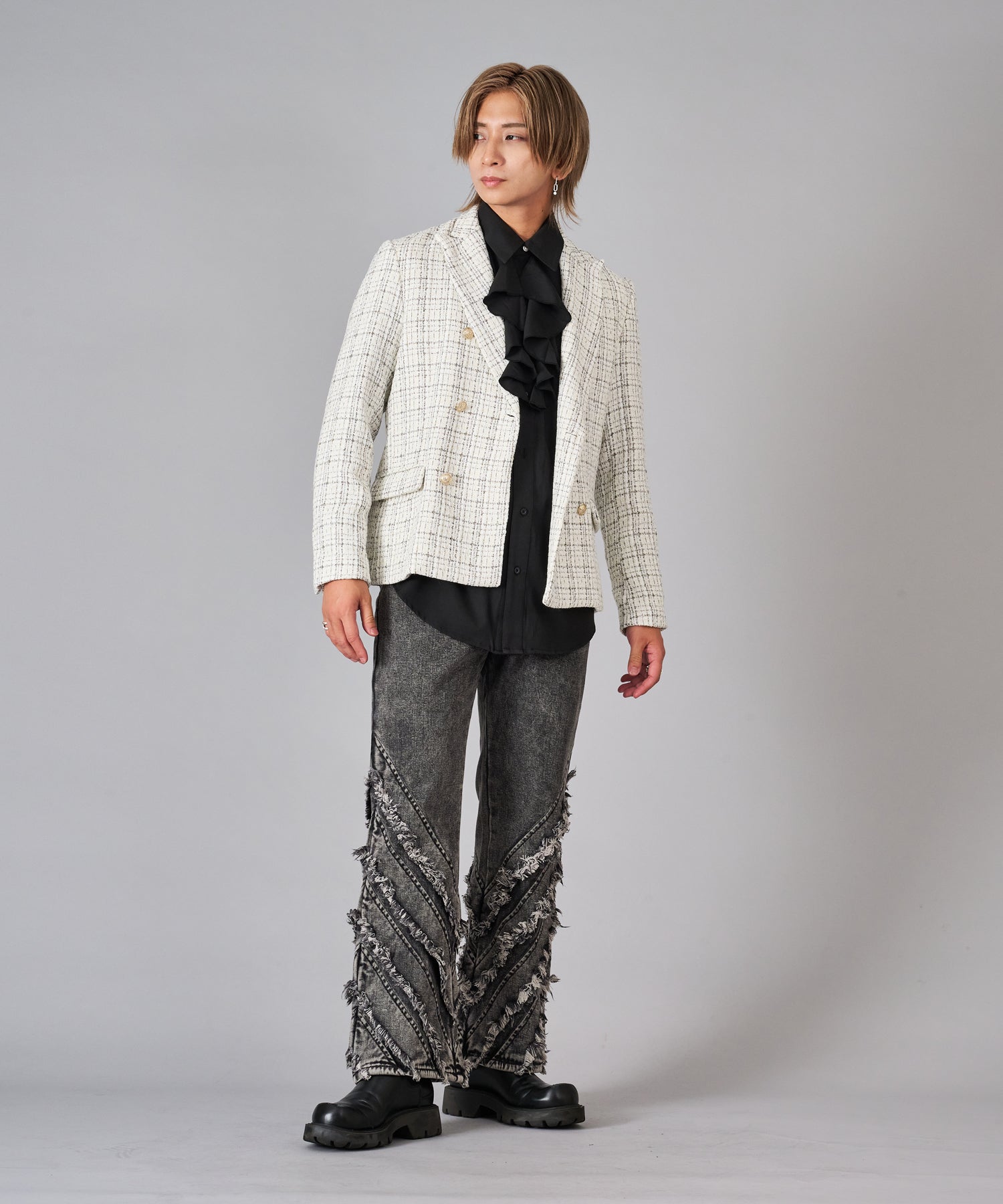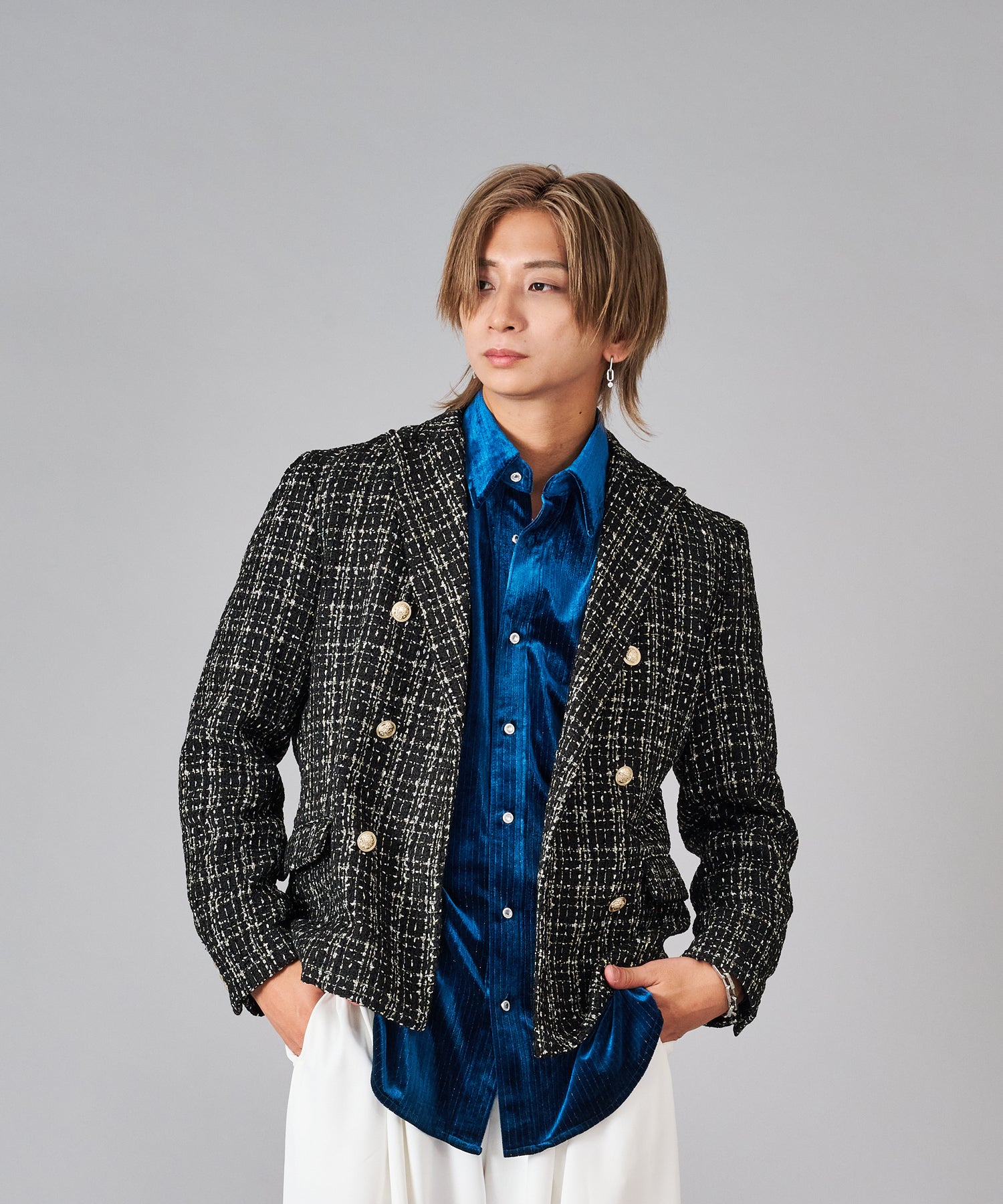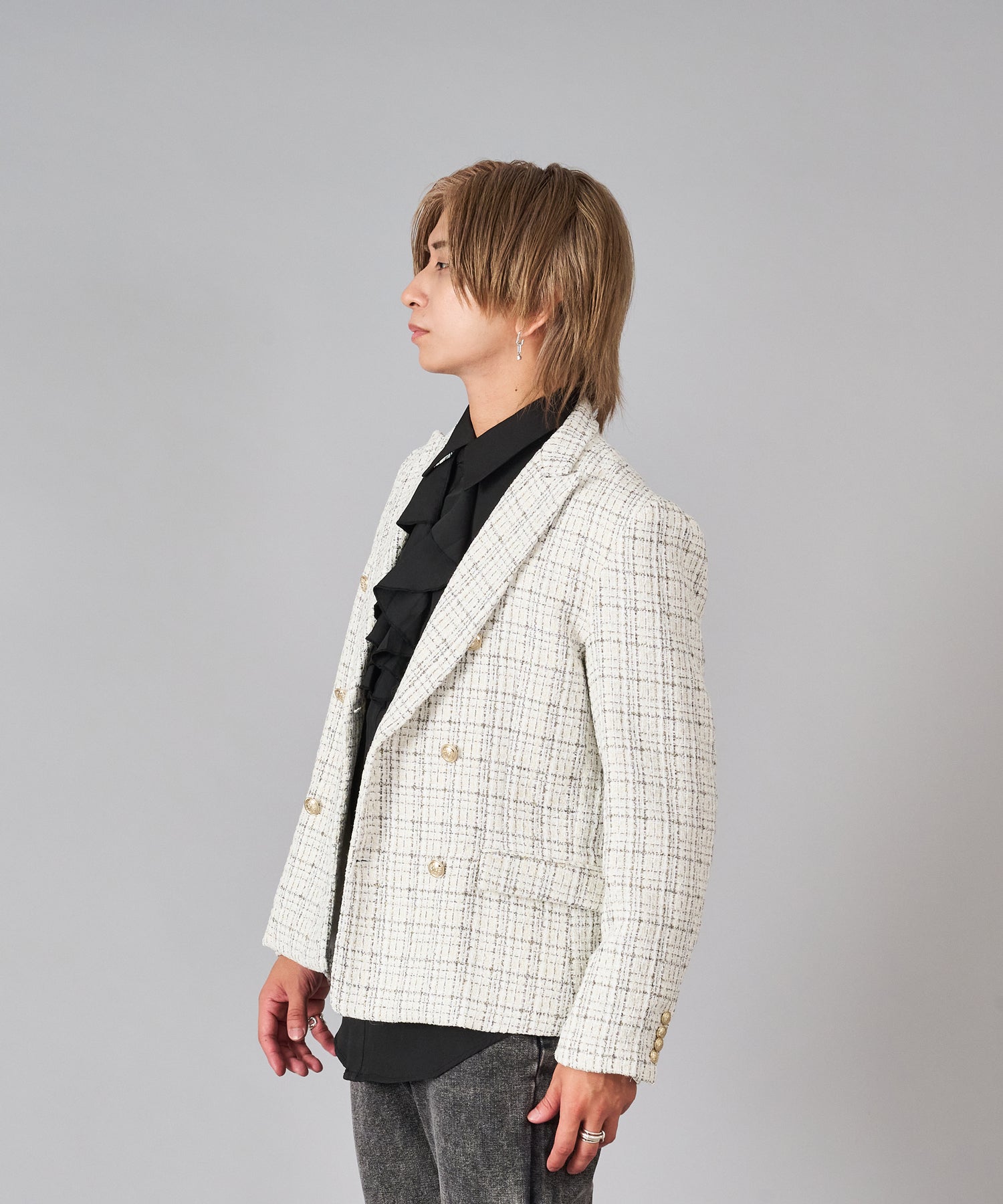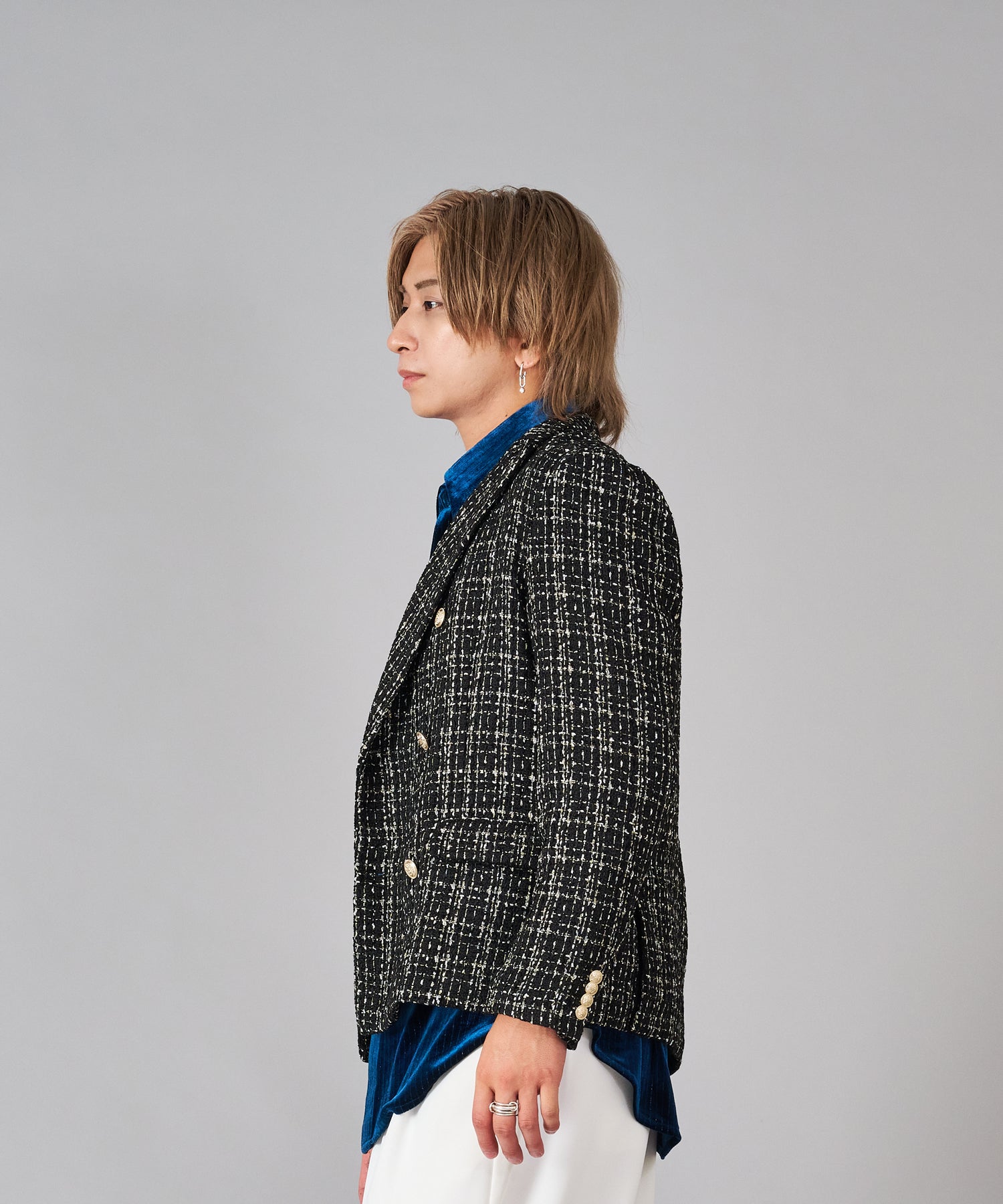 トラディショナルなダブルブレストは最近のトレンドスタイルで、6釦ダブルはより重厚感もあってクール。着丈は長すぎず、ウェストがスマートなイタリアンタイプのシルエット。ピークドラペルでサイドベンツは、ダブルジャケットの王道仕様、釦はゴールド調で華やかです。