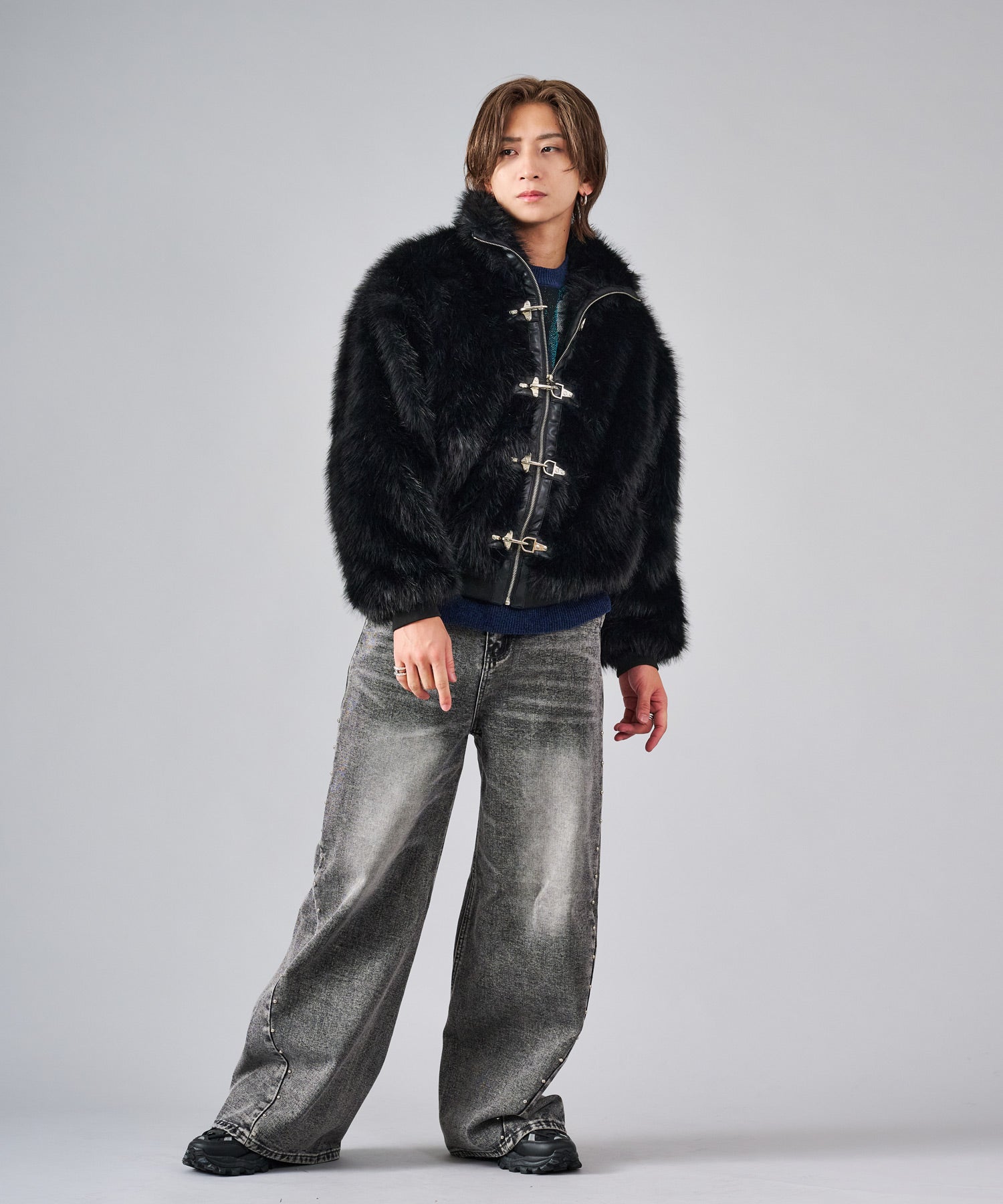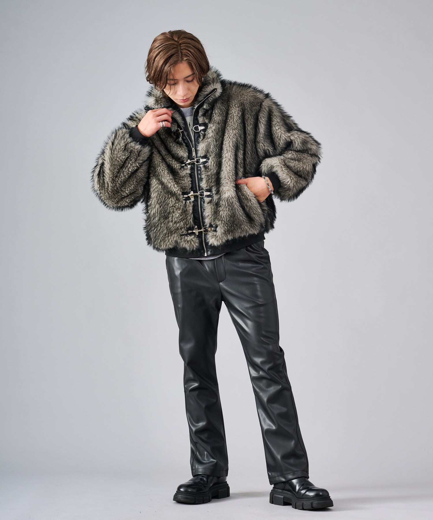 アクセントになっているバックルにはファイヤーマンフックを採用。ゆとりのあるフォルムで長すぎない着丈がバランスの良いシルエットを実現