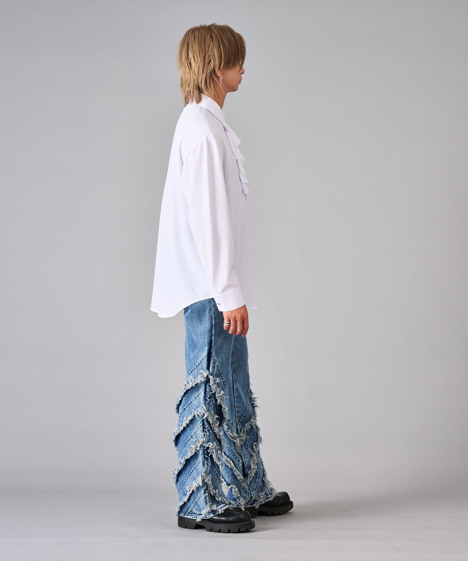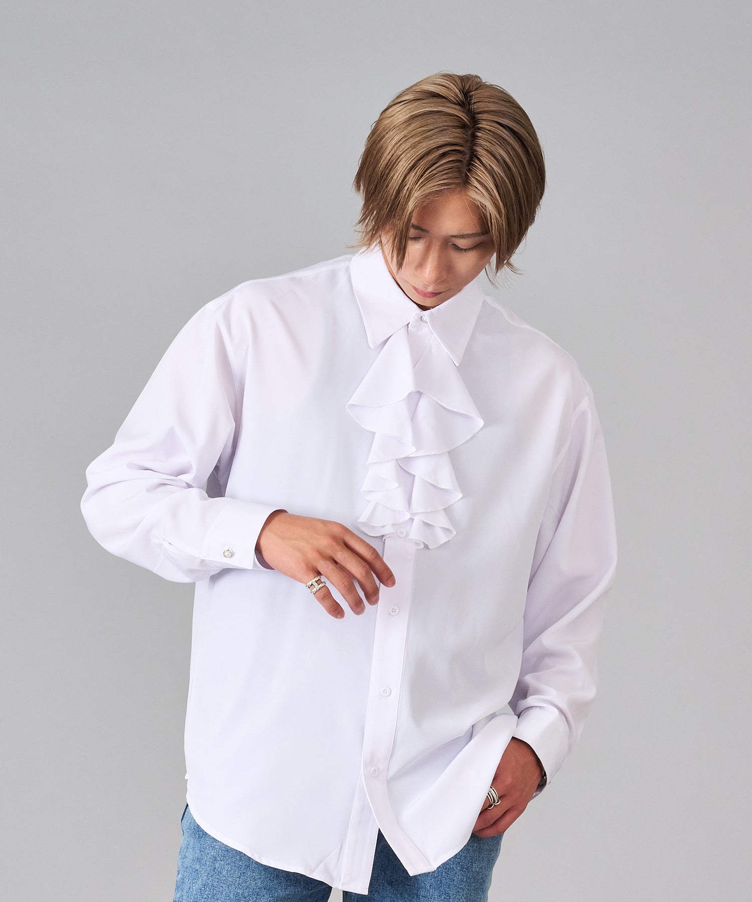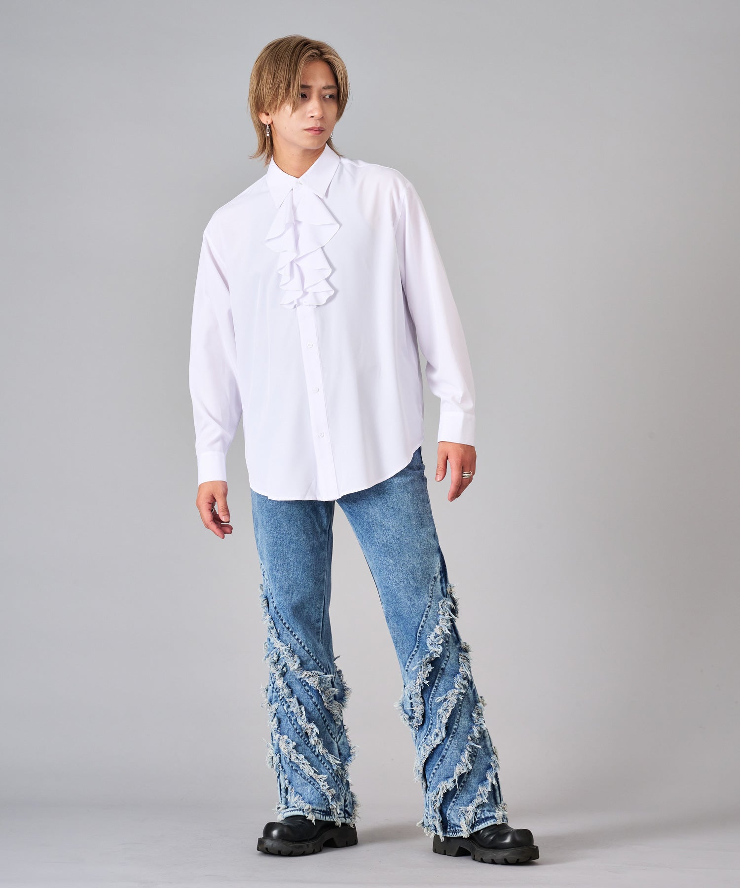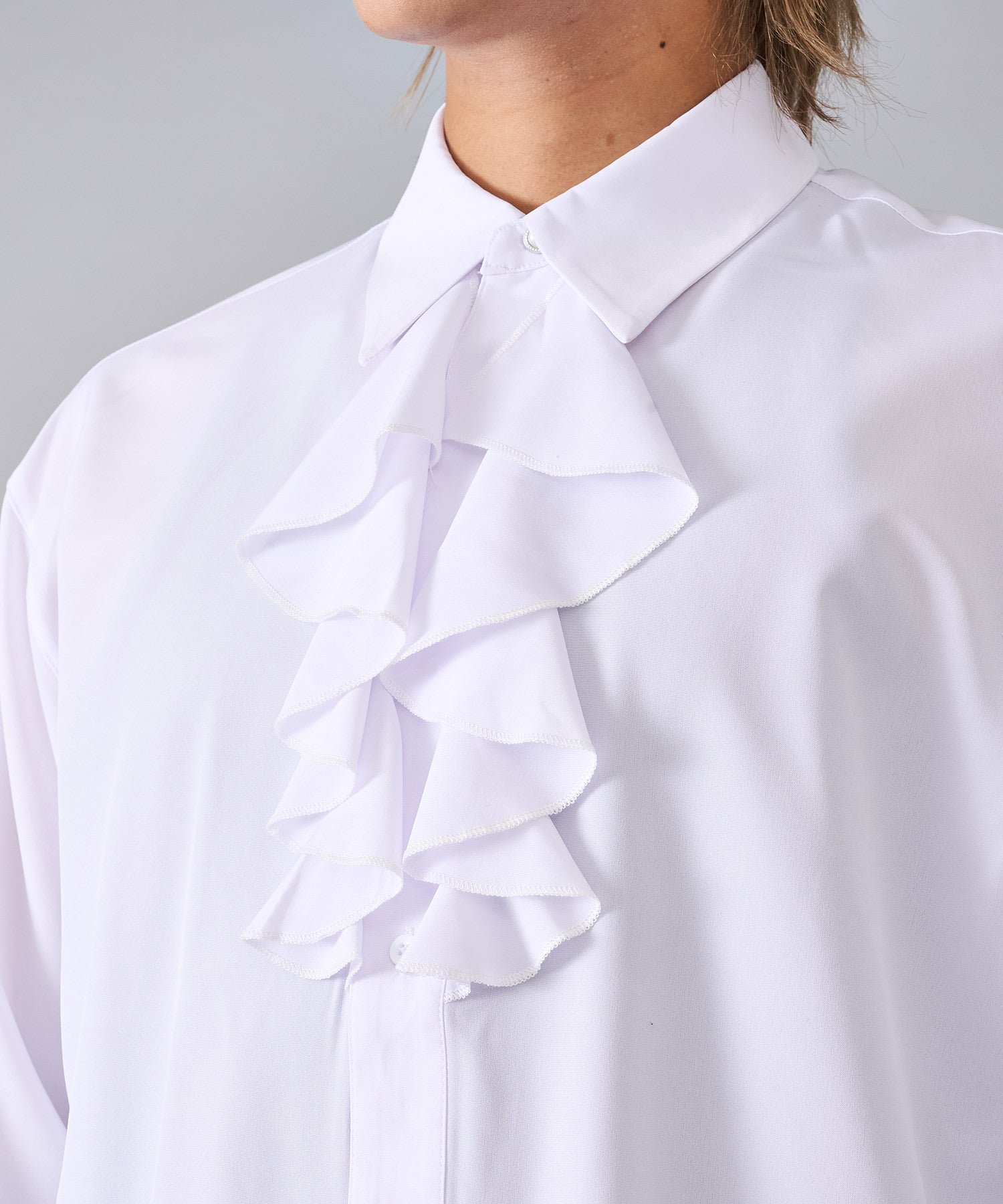 襟のフリルが際立つシャツ