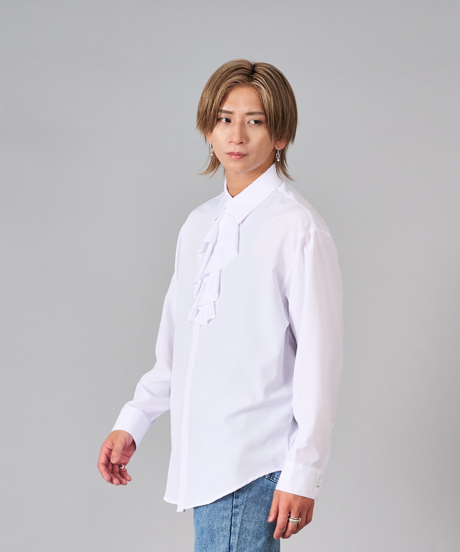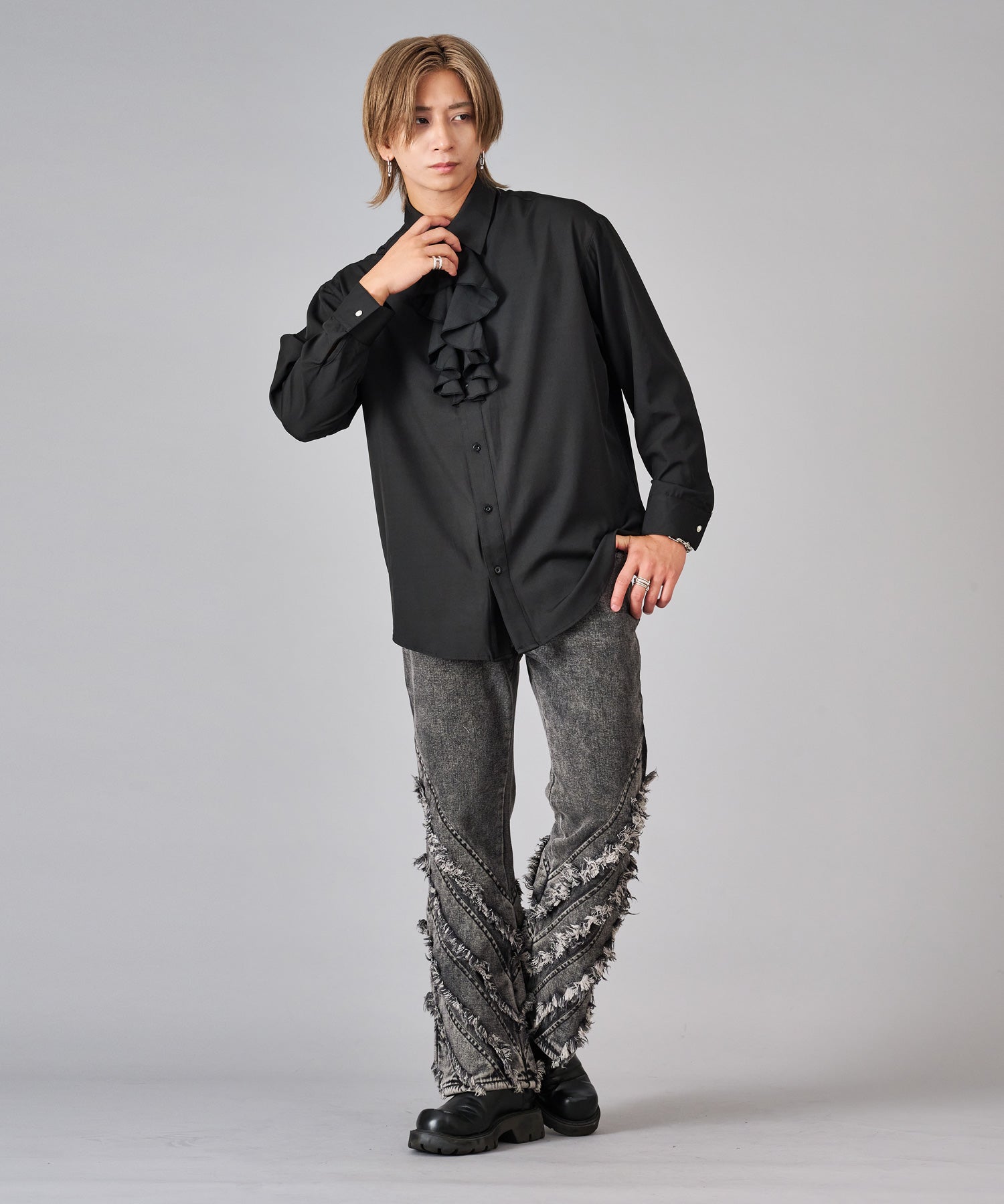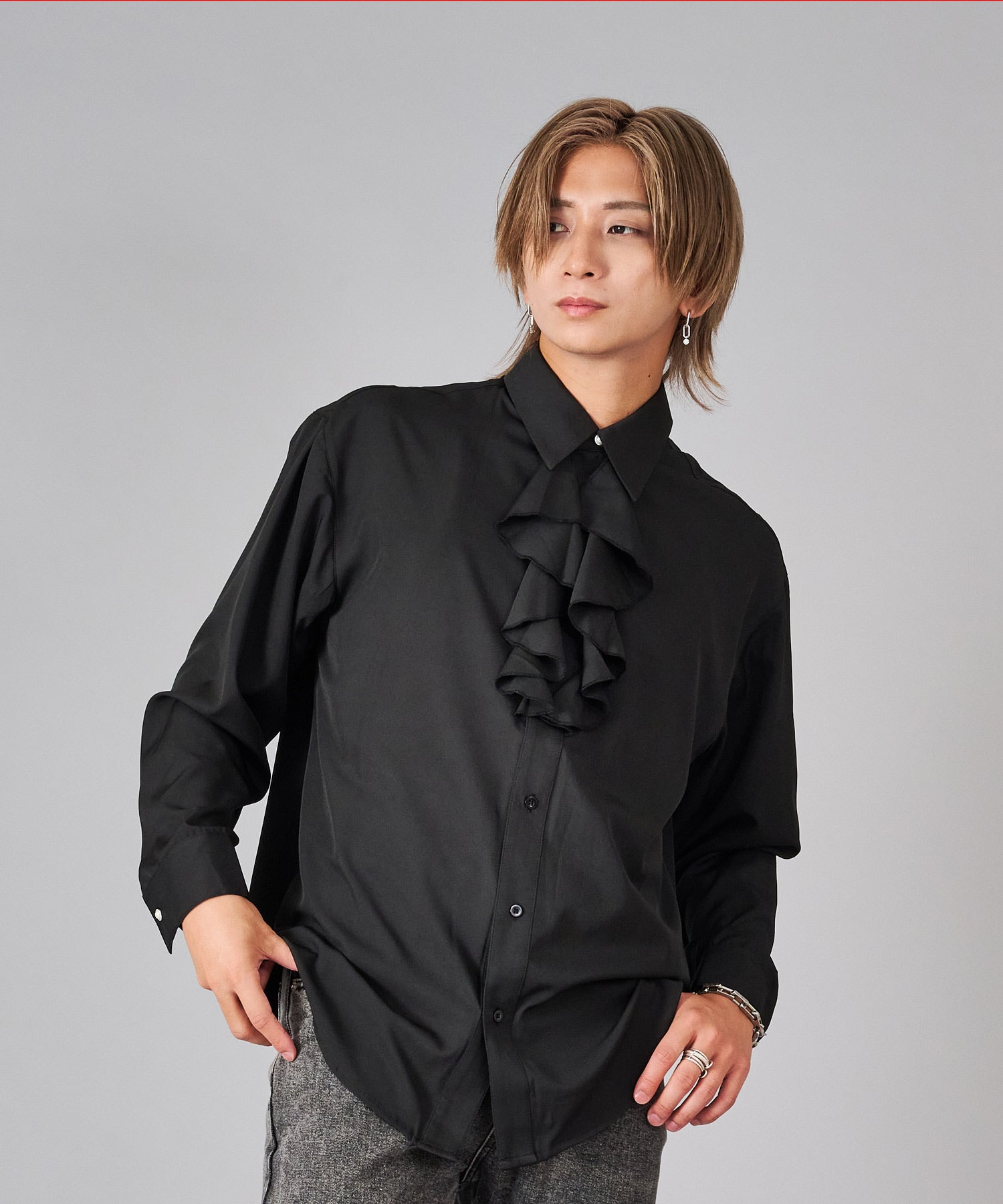 襟のフリルが際立つシャツ